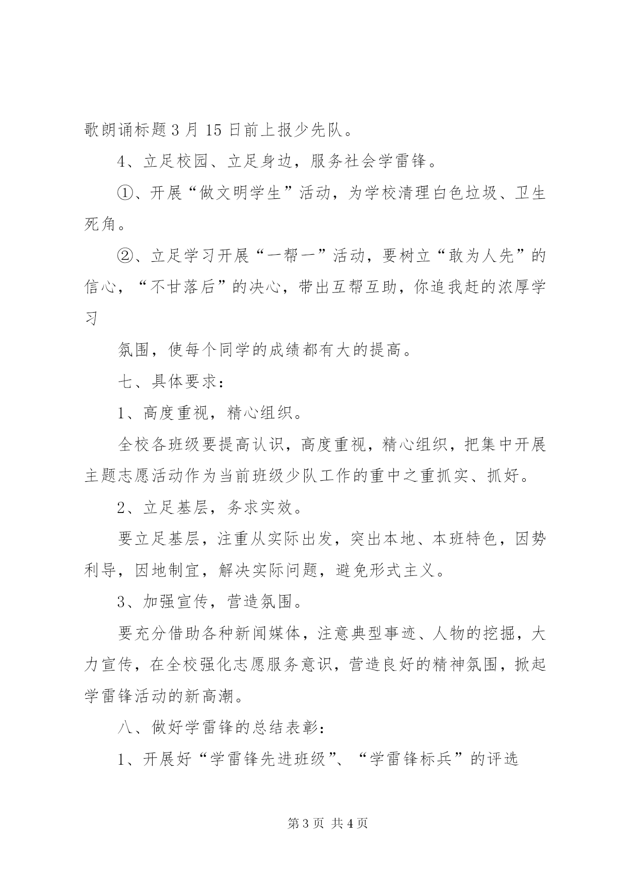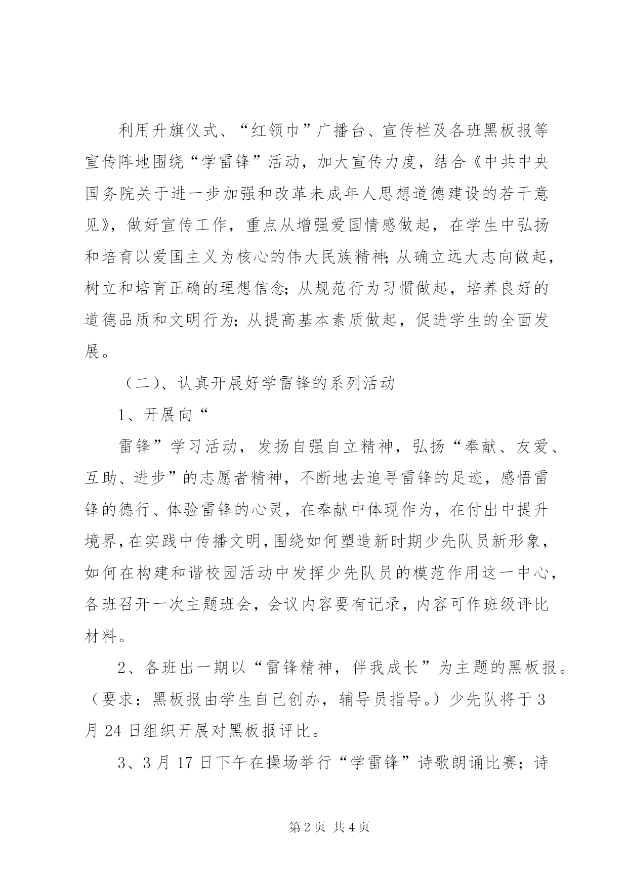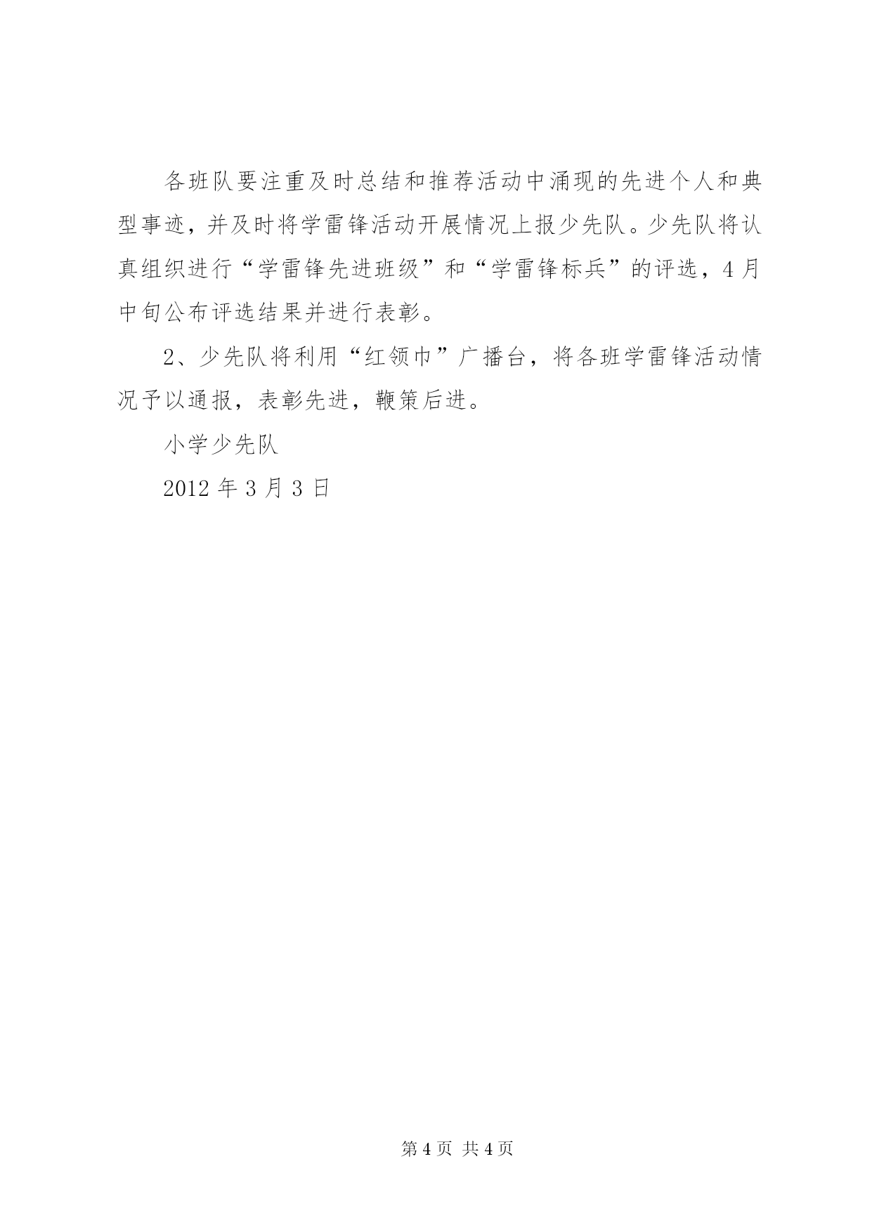 第PAGE\*Arabic\*MERGEFORMAT4页共NUMPAGES\*MERGEFORMAT4页小学“学雷锋”活动方案雷锋精神是我们中华民族宝贵的精神财富。四十多年来,它激励着一代又一代的青少年健康成长,促进了社会文明的进步,社会风气的好转。校园是少年儿童健康成长的摇篮,提倡“以德育人”,雷锋精神就是最重要的组成部分。为进一步推动我校“学雷锋”活动的深入持续开展,弘扬中华民族传统美德,引导广大少先队员积极投身于学校的文明建设中,少先队大队部决定于2012年3月集中开展纪念学习雷锋活动,特制订如下方案:一、指导思想:在全校进一步弘扬“奉献、友爱、互助、进步”的志愿精神,引导少先队员们在奉献中体现作为,在付出中提升境界,在实践中传播文明、促进和谐,从而带动全校学生积极参与志愿服务,促进公民道德素质和社会文明程度的不断提高。二、活动主题:弘扬雷锋精神传递爱心火炬参与志愿服务构建和谐校园三、活动口号:雷锋就是你、我、他四、活动时间:2012年3月五、活动地点:我校校园内或校外六、活动内容:(一)、切实做好学雷锋的宣传发动工作利用升旗仪式、“红领巾”广播台、宣传栏及各班黑板报等宣传阵地围绕“学雷锋”活动,加大宣传力度,结合《中共中央国务院关于进一步加强和改革未成年人思想道德建设的若干意见》,做好宣传工作,重点从增强爱国情感做起,在学生中弘扬和培育以爱国主义为核心的伟大民族精神;从确立远大志向做起,树立和培育正确的理想信念;从规范行为习惯做起,培养良好的道德品质和文明行为;从提高基本素质做起,促进学生的全面发展。(二)、认真开展好学雷锋的系列活动1、开展向“雷锋”学习活动,发扬自强自立精神,弘扬“奉献、友爱、互助、进步”的志愿者精神,不断地去追寻雷锋的足迹,感悟雷锋的德行、体验雷锋的心灵,在奉献中体现作为,在付出中提升境界,在实践中传播文明,围绕如何塑造新时期少先队员新形象,如何在构建和谐校园活动中发挥少先队员的模范作用这一中心,各班召开一次主题班会,会议内容要有记录,内容可作班级评比材料。2、各班出一期以“雷锋精神,伴我成长”为主题的黑板报。(要求:黑板报由学生自己创办,辅导员指导。)少先队将于3月24日组织开展对黑板报评比。3、3月17日下午在操场举行“学雷锋”诗歌朗诵比赛;诗歌朗诵标题3月15日前上报少先队。4、立足校园、立足身边,服务社会学雷锋。①、开展“做文明学生”活动,为学校清理白色垃圾、卫生死角。②、立足学习开展“一帮一”活动,要树立“敢为人先”的信心,“不甘落后”的决心,带出互帮互助,你追我赶的浓厚学习氛围,使每个同学的成绩都有大的提高。七、具体要求:1、高度重视,精心组织。全校各班级要提高认识,高度重视,精心组织,把集中开展主题志愿活动作为当前班级少队工作的重中之重抓实、抓好。2、立足基层,务求实效。要立足基层,注重从实际出发,突出本地、本班特色,因势利导,因地制宜,解决实际问题,避免形式主义。3、加强宣传,营造氛围。要充分借助各种新闻媒体,注意典型事迹、人物的挖掘,大力宣传,在全校强化志愿服务意识,营造良好的精神氛围,掀起学雷锋活动的新高潮。八、做好学雷锋的总结表彰:1、开展好“学雷锋先进班级”、“学雷锋标兵”的评选各班队要注重及时总结和推荐活动中涌现的先进个人和典型事迹,并及时将学雷锋活动开展情况上报少先队。少先队将认真组织进行“学雷锋先进班级”和“学雷锋标兵”的评选,4月中旬公布评选结果并进行表彰。2、少先队将利用“红领巾”广播台,将各班学雷锋活动情况予以通报,表彰先进,鞭策后进。小学少先队2012年3月3日