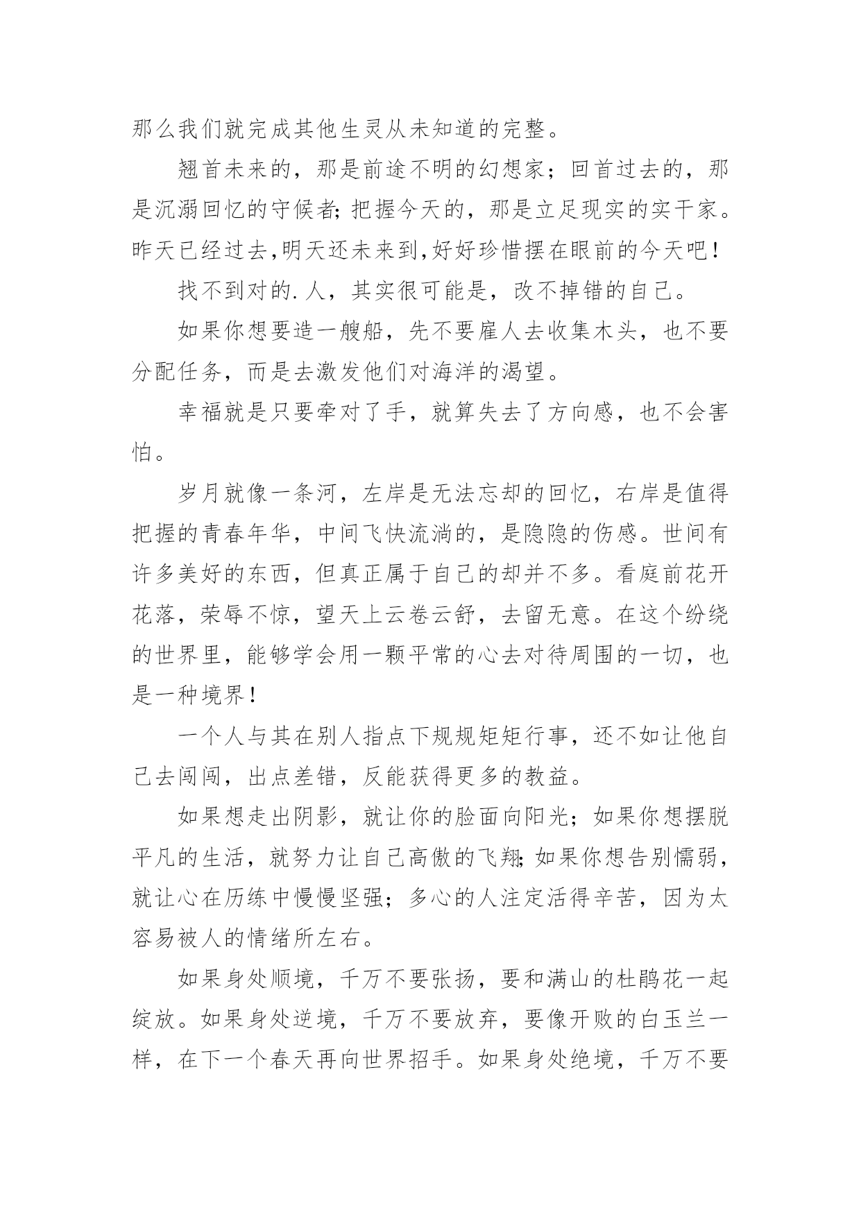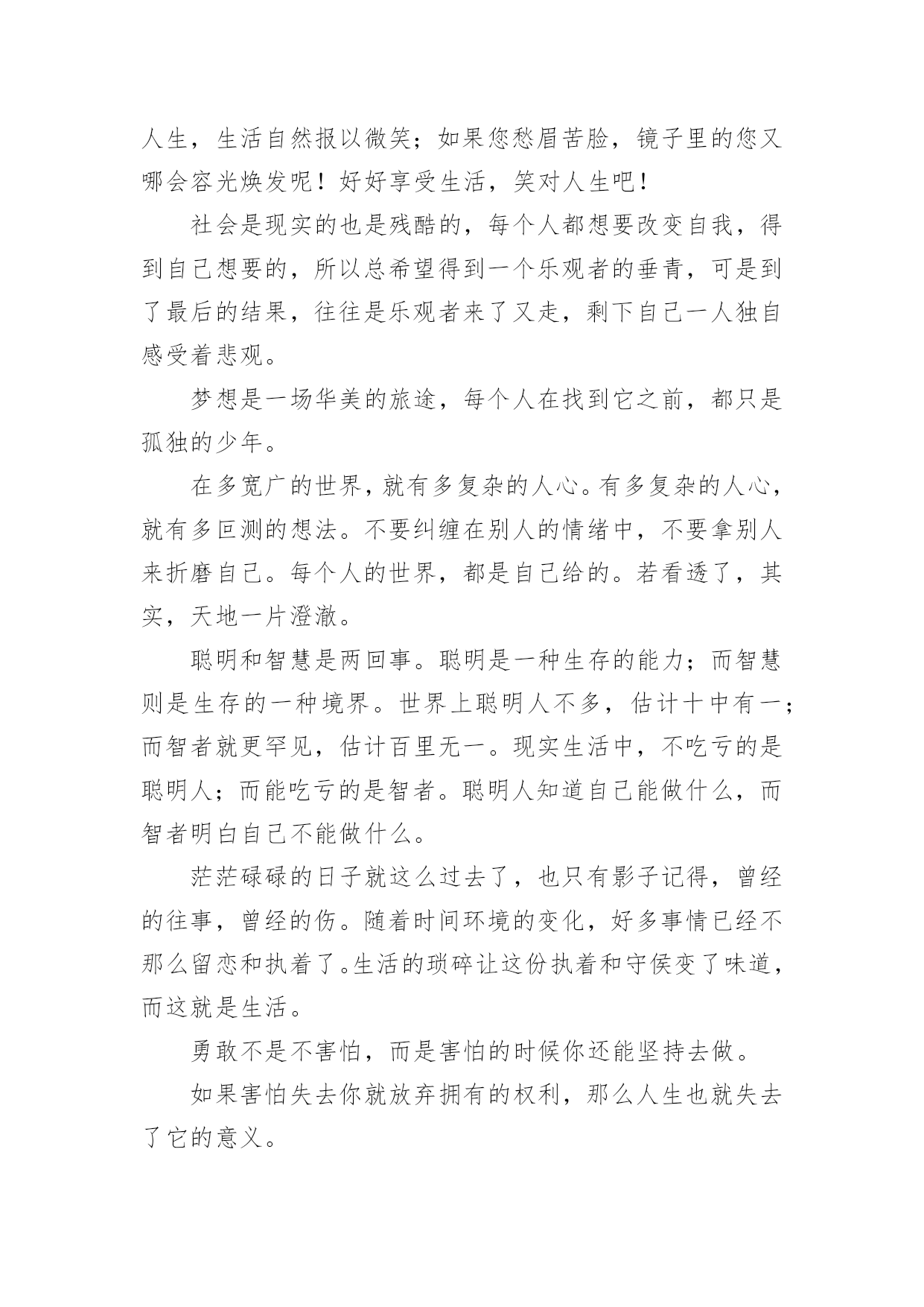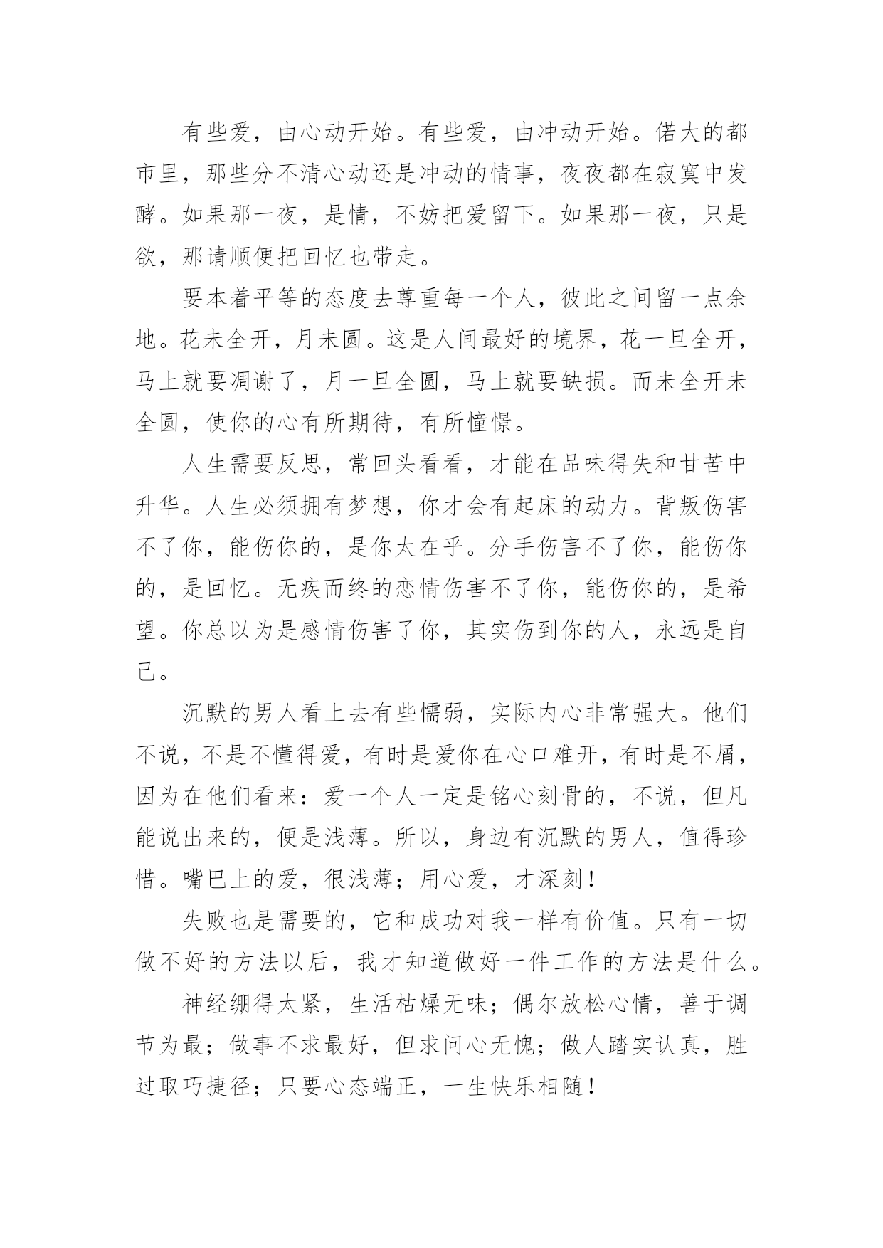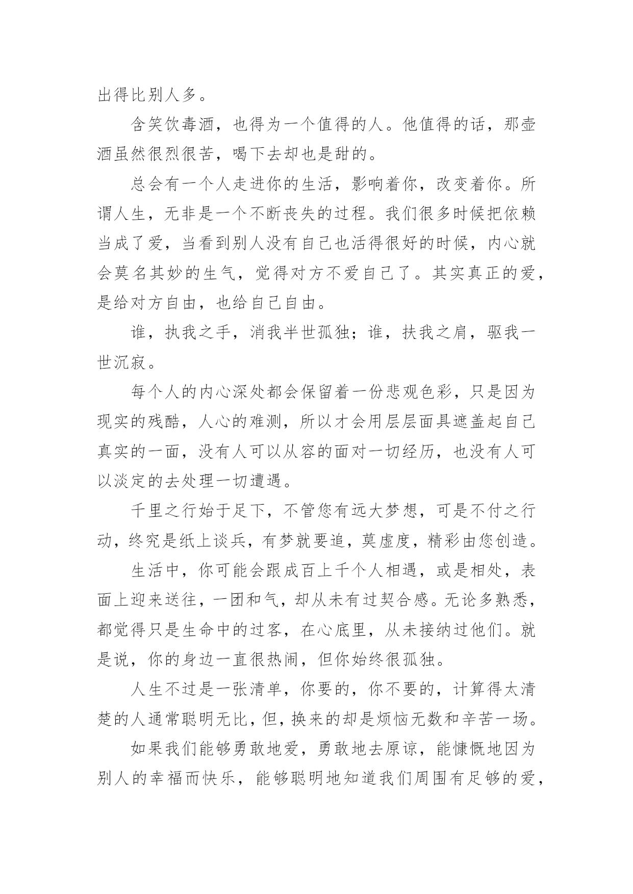 感悟生活的句子感悟生活的句子在平平淡淡的日常中,大家对句子都再熟悉不过了吧,根据语气的不同句子可以分为陈述句、疑问句、祈使句和感叹句。你所见过的句子是什么样的呢?下面是小编精心整理的感悟生活的句子,希望能够帮助到大家。在有生的瞬间能遇到你,竟花光所有力气。在这日才发现,曾呼吸过空气。当你仍想继续,永远不要说再见;当你还能承受,永远不要说放弃;当你舍不得一个人,永远永远不要说你不再爱他。这一世,你是我,遗忘千年的红颜知己,你是我,染尽了红尘,散尽了伤感的思念。缘起缘灭,擦肩而过,谁倾了我的城,我负了谁的心,从此,那一抹容颜遗忘天涯,了无相望。与你,错过一季,那是落花的时节。你生命的前半辈子或许属于别人,活在别人的认为里。那把后半辈子还给你自己,去追随你内在的声音。郑钧《溺爱》:只有你的未来,才能挥霍我的现在;只有我的最爱,给我最致命的伤害。约翰列侬:老师问我长大想做什么,我说“快乐的人”。老师说我不懂问题。我告诉老师,是他不懂人生。勇敢做自己,永远不会太迟。过去只是经历,现在是尝试,未来才是期待。向前看是梦想和目标;向后看是检验和修正。有多少事,如果当初回头看看,就会做得更好;有多少人,如果能回头一看,可以免去多少错误和遗憾。回头其实身后也写着前方的路。你自己选择的路跪着也要把它走完。别把人生想的太难。大凡人世间的痛苦,多是因放不下。有时候我常想,痛苦,该是时光刮给生命的一场飓风吧。生活,本就是以这样一种特别的方式,掀起遮盖的一切,让你看到人生的真相。没有人会活得一无是处,也没有人能活得了无遗憾。不必在乎自己的平凡,因为平凡使生命更加真实;不必在乎未来会如何,因为只要肯努力,未来就一定不会让我们失望;不必在乎别人如何看待自己,因为只要自己堂堂正正,就一定能赢得别人的尊重;不必在乎得失,因为人生本来就在得失之间徘徊往复。一生中,总有一个人,老是跟你过不去,说你不够勤快,比不上别人温柔,批评你乱花钱,嫌你不会打扮,你简直一无是处。可就是这个人,用他的勤劳滋养着你的惰性,用他的坚强呵护着你的浪漫,用他的所有填补着你的欲望,用他的忠贞护卫着你的美丽。于是,你慢慢不在意他说什么,而是坚定地跟他过下去。如果用你的一生去等待,你总能找出最适合自己的那个人。但是你能用一生去等待吗?既然不能,就珍惜手里的麦穗吧。人一生中会遇到不顺心的事,会碰到不顺眼的人,如果你不学会原谅,就会活得痛苦,活得累。原谅是一种风度,是一种情怀,它像一把伞,帮助你在雨季里行路。学会原谅,快乐至上。有的路,是用脚去走。有的路,要用心去走。绊住脚的,往往不是荆棘石头,而是心。所以,看起来是路铺展在我们眼前,实际上,是心扑腾在路上。深一脚,浅一脚,欢喜在路上,悲伤在路上。但只要心不走在绝路上,生活也终不会给你绝路走。人的烦恼就个字:放不下,想不开,看不透,忘不了。带着简单的心情,看复杂的人生,走坎坷的路。人生,简单就快乐,生活,开心就好!人生长途漫漫,我们不可能每一步都走得那么完美,摔上几跤,走几段弯路,这并非坏事,至少让我们品尝了挫败,增添的阅历,让我们的人生多姿多彩。或许走过终点时我们才明白,一路平坦却少了风景,没有转折也多了平淡。只要经历了,尝试了,走过了,我们赢得的,就是一个全新的自己!我们在做一件事之前要先想后果,我们做事要先往远处想想,谨慎再谨慎,以求去避免对他人的伤害,减少自己以后的悔恨。说话要用脑子,做事要考虑后果,这是为人处事很重要的一点。只有在离不开她时,我才会跟她闹着要分手。青春,是让人日渐消瘦的心事,是举起酒杯前莫名的伤悲,青春那轻轻的风轻轻的梦轻轻的晨晨昏昏,淡淡的云淡淡的泪淡淡的年年岁岁,青春是一首美丽而寂寞的歌。计较的太多就成了一种羁绊,迷失的太久便成了一种痛苦。过多的在乎会减少人生的乐趣,看淡了一切也就多了生命的释然。智慧,是长在伤口处。人人都会经历伤痛,却未必人人都会拥有智慧。这是一场灵魂的博弈,只有最终没被伤痛压垮的人,才配得到它。让你痛不欲生的,就是能让你脱胎换骨的。每一个繁花似锦,都是经历了暗涛汹涌;每一个鲜艳夺目,都是经历了风雨无阻;每一个风光无限,都是经历了黯然伤神。所有的一切,只有经历过的人,才更懂得背后的力量。生活是一件艺术品,每个人都有自己认为最美的一笔,每个人也都有认为不尽如人意的一笔,关键在于您怎样看待。与其整日被庸人自扰的愁闷所困扰,不如以一种顺其自然的态度淡看一切。接受已经发生的事实,是克服随之而来的任何困难的第一步。我们需要的只是一点豁达,让一切都顺其自然吧!每个人都会有乐观的心态,每个人也会有悲观的现状,可事实往往我们只能看到乐观的一面,却又无视于悲观的真实。从来没有人喜欢过悲观,也没有人能够忍受悲观,这就是人生。只有一条路不能选择——那就是放弃的路;只有一条路不能拒绝——那就是成长的路。你要的比别人多,就必须