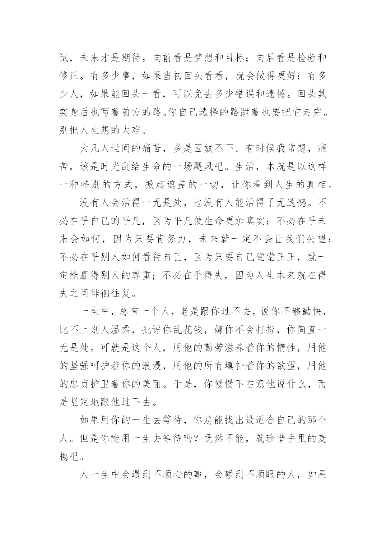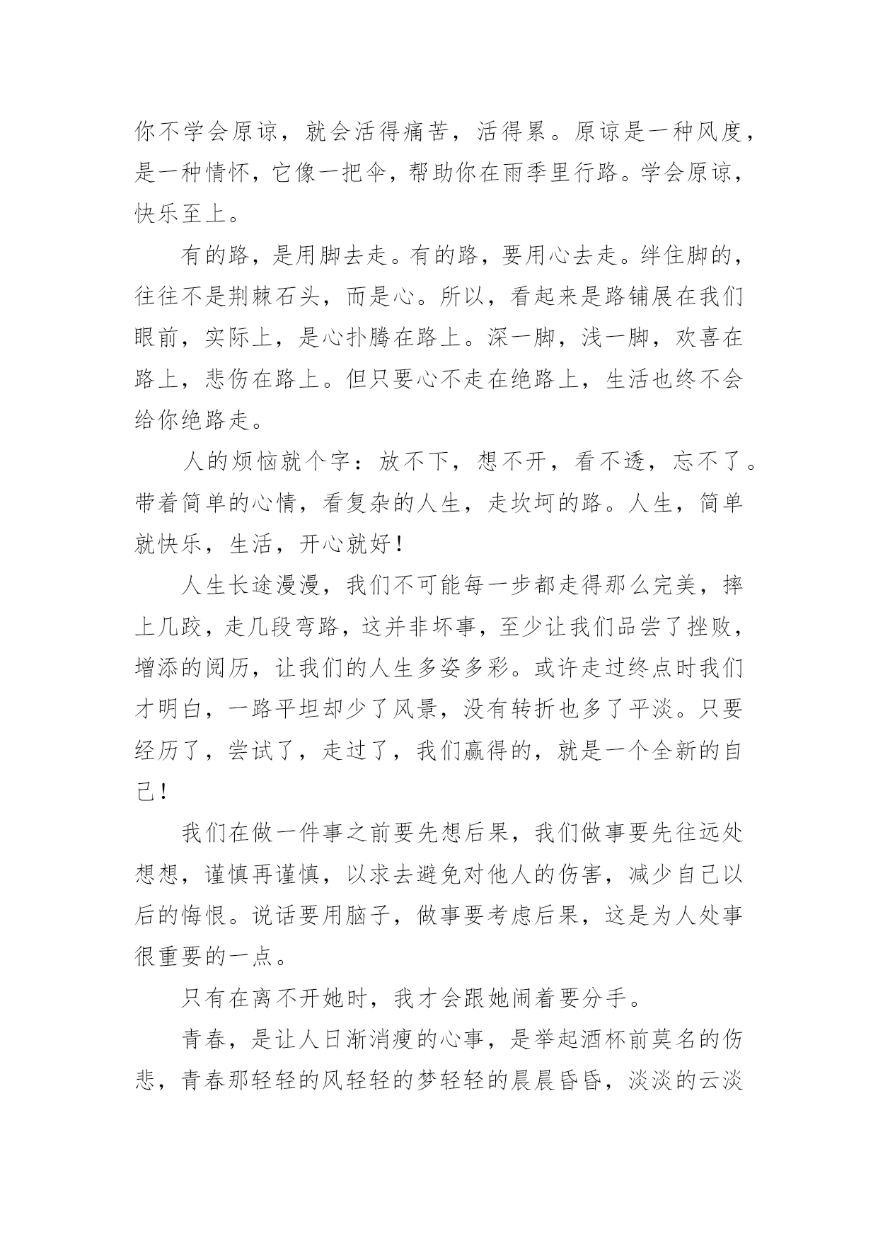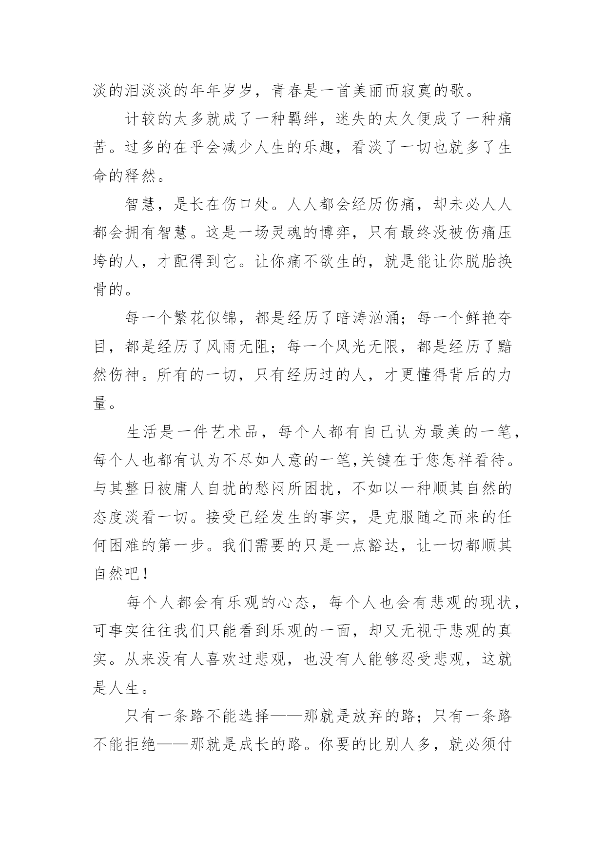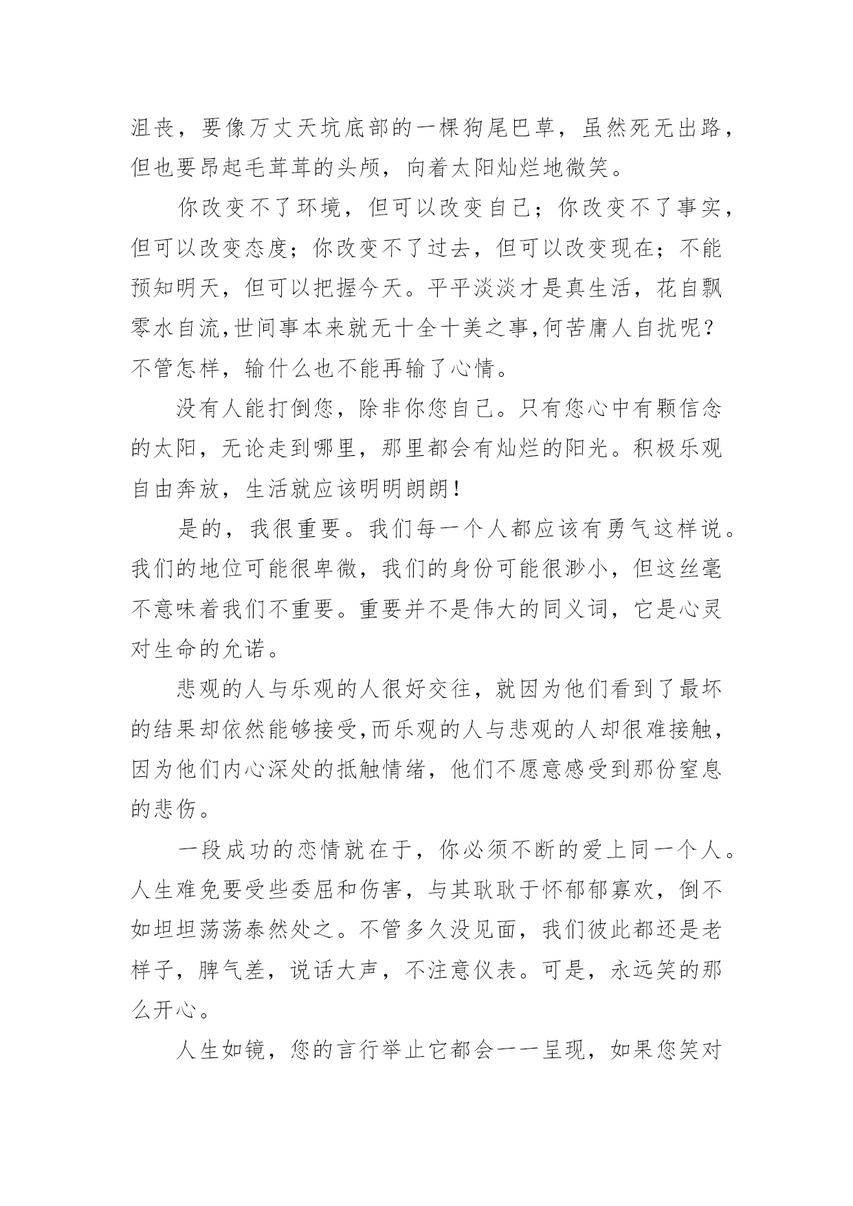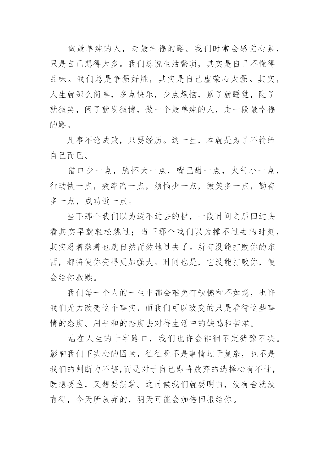 感悟生活的句子感悟生活的句子在平平淡淡的日常中,大家对句子都再熟悉不过了吧,根据语气的不同句子可以分为陈述句、疑问句、祈使句和感叹句。你所见过的句子是什么样的呢?下面是小编精心整理的感悟生活的句子,希望能够帮助到大家。在有生的瞬间能遇到你,竟花光所有力气。在这日才发现,曾呼吸过空气。当你仍想继续,永远不要说再见;当你还能承受,永远不要说放弃;当你舍不得一个人,永远永远不要说你不再爱他。这一世,你是我,遗忘千年的红颜知己,你是我,染尽了红尘,散尽了伤感的思念。缘起缘灭,擦肩而过,谁倾了我的城,我负了谁的心,从此,那一抹容颜遗忘天涯,了无相望。与你,错过一季,那是落花的时节。你生命的前半辈子或许属于别人,活在别人的认为里。那把后半辈子还给你自己,去追随你内在的声音。郑钧《溺爱》:只有你的未来,才能挥霍我的现在;只有我的最爱,给我最致命的伤害。约翰列侬:老师问我长大想做什么,我说“快乐的人”。老师说我不懂问题。我告诉老师,是他不懂人生。勇敢做自己,永远不会太迟。过去只是经历,现在是尝试,未来才是期待。向前看是梦想和目标;向后看是检验和修正。有多少事,如果当初回头看看,就会做得更好;有多少人,如果能回头一看,可以免去多少错误和遗憾。回头其实身后也写着前方的路。你自己选择的路跪着也要把它走完。别把人生想的太难。大凡人世间的痛苦,多是因放不下。有时候我常想,痛苦,该是时光刮给生命的一场飓风吧。生活,本就是以这样一种特别的方式,掀起遮盖的一切,让你看到人生的真相。没有人会活得一无是处,也没有人能活得了无遗憾。不必在乎自己的平凡,因为平凡使生命更加真实;不必在乎未来会如何,因为只要肯努力,未来就一定不会让我们失望;不必在乎别人如何看待自己,因为只要自己堂堂正正,就一定能赢得别人的尊重;不必在乎得失,因为人生本来就在得失之间徘徊往复。一生中,总有一个人,老是跟你过不去,说你不够勤快,比不上别人温柔,批评你乱花钱,嫌你不会打扮,你简直一无是处。可就是这个人,用他的勤劳滋养着你的惰性,用他的坚强呵护着你的浪漫,用他的所有填补着你的欲望,用他的忠贞护卫着你的美丽。于是,你慢慢不在意他说什么,而是坚定地跟他过下去。如果用你的一生去等待,你总能找出最适合自己的那个人。但是你能用一生去等待吗?既然不能,就珍惜手里的麦穗吧。人一生中会遇到不顺心的事,会碰到不顺眼的人,如果你不学会原谅,就会活得痛苦,活得累。原谅是一种风度,是一种情怀,它像一把伞,帮助你在雨季里行路。学会原谅,快乐至上。有的路,是用脚去走。有的路,要用心去走。绊住脚的,往往不是荆棘石头,而是心。所以,看起来是路铺展在我们眼前,实际上,是心扑腾在路上。深一脚,浅一脚,欢喜在路上,悲伤在路上。但只要心不走在绝路上,生活也终不会给你绝路走。人的烦恼就个字:放不下,想不开,看不透,忘不了。带着简单的心情,看复杂的人生,走坎坷的路。人生,简单就快乐,生活,开心就好!人生长途漫漫,我们不可能每一步都走得那么完美,摔上几跤,走几段弯路,这并非坏事,至少让我们品尝了挫败,增添的阅历,让我们的人生多姿多彩。或许走过终点时我们才明白,一路平坦却少了风景,没有转折也多了平淡。只要经历了,尝试了,走过了,我们赢得的,就是一个全新的自己!我们在做一件事之前要先想后果,我们做事要先往远处想想,谨慎再谨慎,以求去避免对他人的伤害,减少自己以后的悔恨。说话要用脑子,做事要考虑后果,这是为人处事很重要的一点。只有在离不开她时,我才会跟她闹着要分手。青春,是让人日渐消瘦的心事,是举起酒杯前莫名的伤悲,青春那轻轻的风轻轻的梦轻轻的晨晨昏昏,淡淡的云淡淡的泪淡淡的年年岁岁,青春是一首美丽而寂寞的歌。计较的太多就成了一种羁绊,迷失的太久便成了一种痛苦。过多的在乎会减少人生的乐趣,看淡了一切也就多了生命的释然。智慧,是长在伤口处。人人都会经历伤痛,却未必人人都会拥有智慧。这是一场灵魂的博弈,只有最终没被伤痛压垮的人,才配得到它。让你痛不欲生的,就是能让你脱胎换骨的。每一个繁花似锦,都是经历了暗涛汹涌;每一个鲜艳夺目,都是经历了风雨无阻;每一个风光无限,都是经历了黯然伤神。所有的一切,只有经历过的人,才更懂得背后的力量。生活是一件艺术品,每个人都有自己认为最美的一笔,每个人也都有认为不尽如人意的一笔,关键在于您怎样看待。与其整日被庸人自扰的愁闷所困扰,不如以一种顺其自然的态度淡看一切。接受已经发生的事实,是克服随之而来的任何困难的第一步。我们需要的只是一点豁达,让一切都顺其自然吧!每个人都会有乐观的心态,每个人也会有悲观的现状,可事实往往我们只能看到乐观的一面,却又无视于悲观的真实。从来没有人喜欢过悲观,也没有人能够忍受悲观,这就是人生。只有一条路不能选择——那就是放弃的路;只有一条路不能拒绝——那就是成长的路。你要的比别人多,就必须