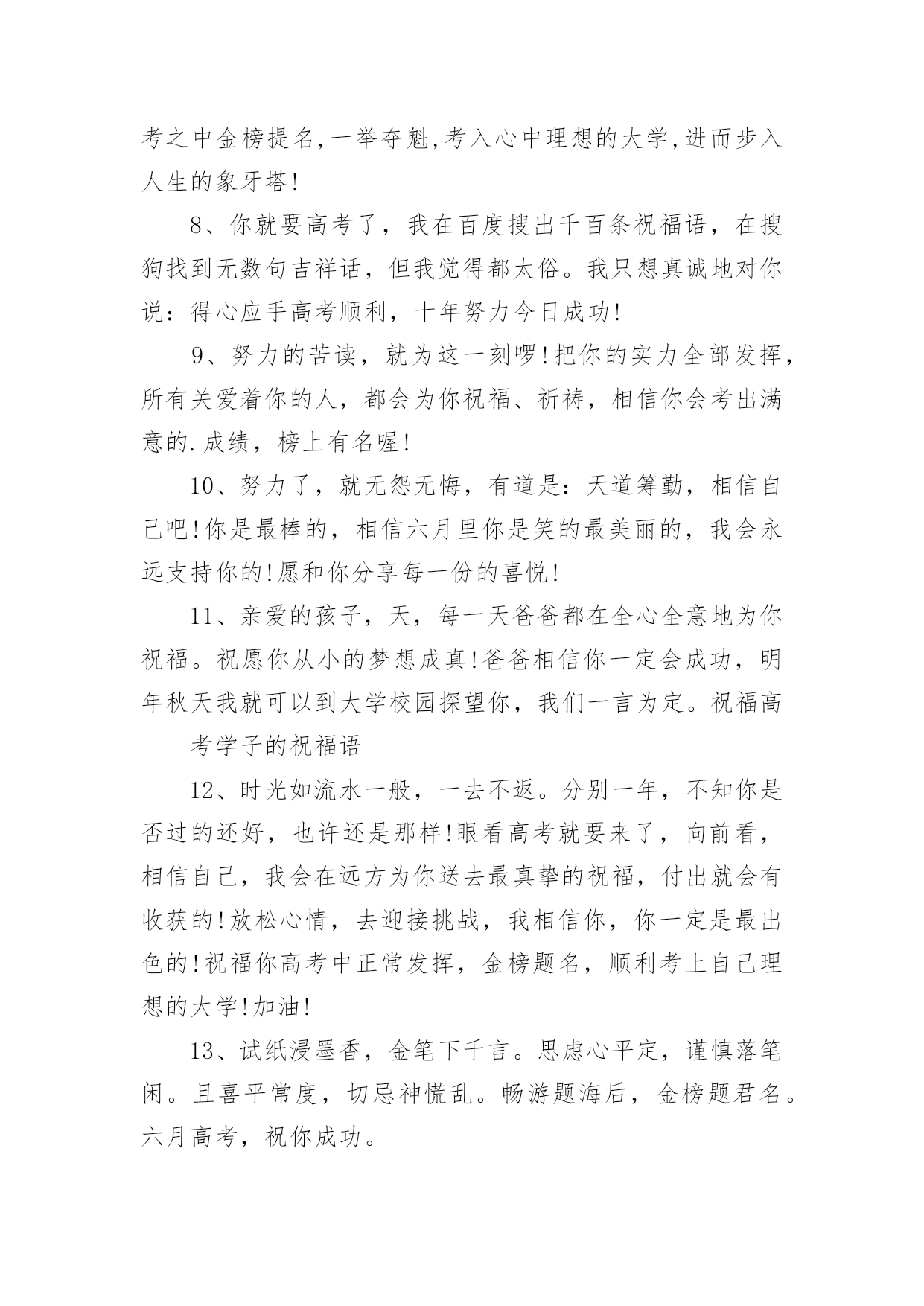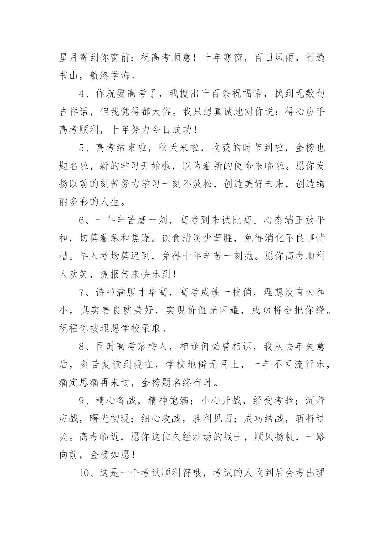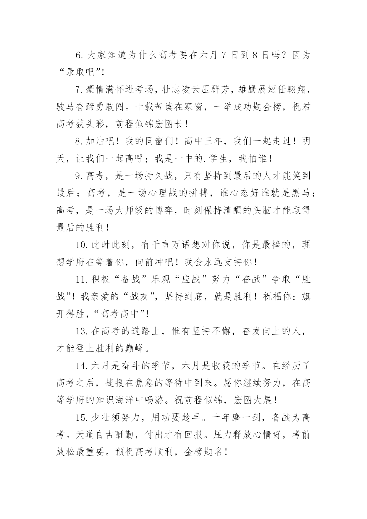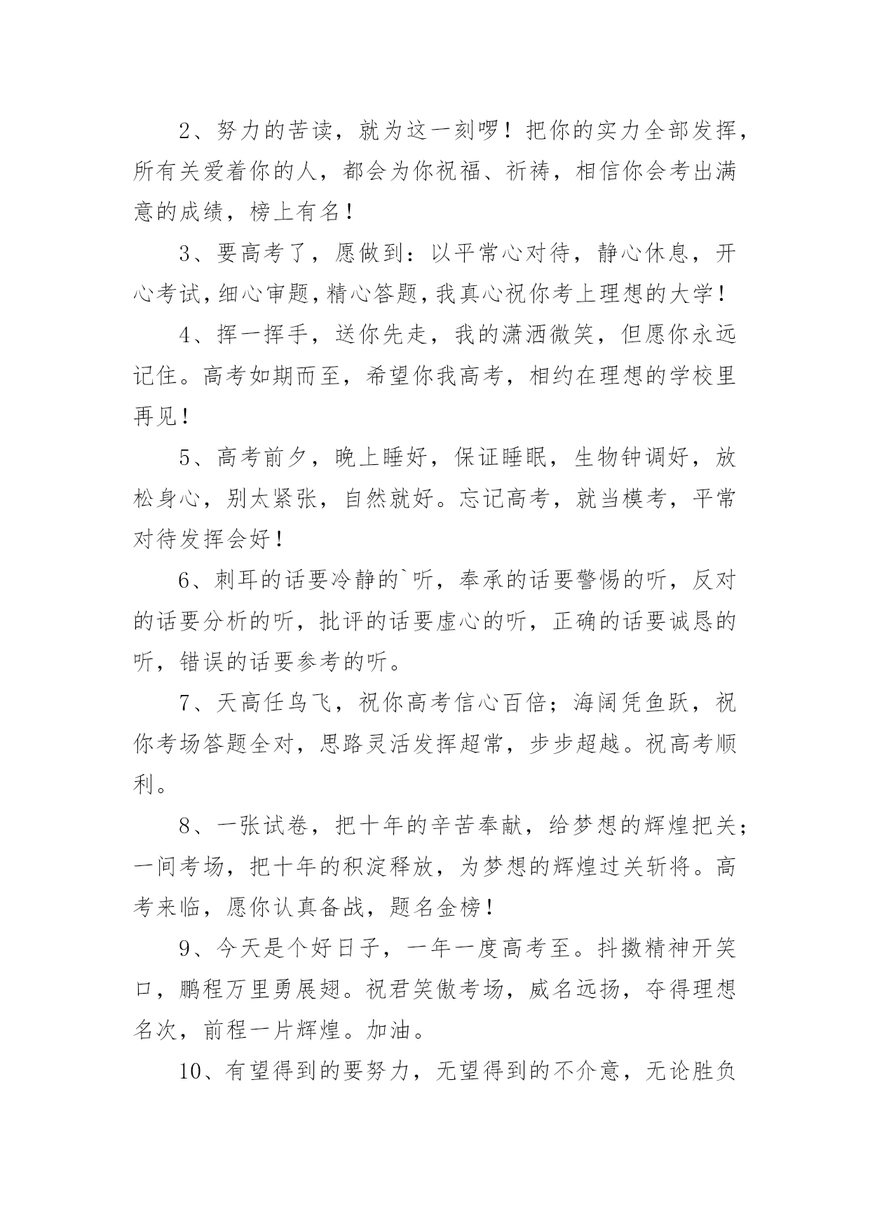 最新的高考祝福语最新的高考祝福语(精选120句)在日常学习、工作或生活中,大家都不可避免地会接触到祝福语吧,祝福语可以增进我们和他人的情感交流。你所知道的祝福语是都是什么样子的?下面是小编为大家收集的最新的高考祝福语(精选120句),欢迎阅读,希望大家能够喜欢。最新的高考祝福语11.决战高考巅峰时,信心百倍增能量。真才实学浑不怕,文思隽永倍潇洒。十年磨剑试锋芒,百花丛中显芬芳。纵横考场斩关将,马到成功幸福尝!祝高考顺利2.长风破浪会有时,直挂云帆济沧海,高考是人生的一个起点,相信自己,明天又是一和个艳阳天!3.校园里寂静无声,教室里聚精会神。老师的脚步轻轻,学生的笔儿不停。十年辛苦此时博,只愿金榜题名慰双亲。全国高考日到了,愿你超常发挥创佳绩,成绩傲人开心笑!4.踏踏实实,努力备战;自信满满,迎接挑战;平心静气,对待高考;妙笔生花,金榜题名。相信自己,一定能行!祝福的话5.全国高考日到了,愿你执才高八斗生辉笔,饮才思万千智慧水,带气定神闲满面笑,拥胸中成竹满怀志,书锦绣嫣然好答卷,定折取桂冠来题名。6.大家知道为什么高考要在六月7日到8日吗?因为“录取吧”!7.豪情满怀进考场,壮志凌云压群芳,雄鹰展翅任翱翔,骏马奋蹄勇敢闯。十载苦读在寒窗,一举成功题金榜,祝君高考获头彩,前程似锦宏图长!8.加油吧!我的同窗们!高中三年,我们一起走过!明天,让我们一起高呼;我是一中的.学生,我怕谁!9.高考,是一场持久战,只有坚持到最后的人才能笑到最后;高考,是一场心理战的拼搏,谁心态好谁就是黑马;高考,是一场大师级的博弈,时刻保持清醒的头脑才能取得最后的胜利!10.此时此刻,有千言万语想对你说,你是最棒的,理想学府在等着你,向前冲吧!我会永远支持你!11.积极“备战”乐观“应战”努力“奋战”争取“胜战”!我亲爱的“战友”,坚持到底,就是胜利!祝福你:旗开得胜,“高考高中”!13.在高考的道路上,惟有坚持不懈,奋发向上的人,才能登上胜利的巅峰。14.六月是奋斗的季节,六月是收获的季节。在经历了高考之后,捷报在焦急的等待中到来。愿你继续努力,在高等学府的知识海洋中畅游。祝前程似锦,宏图大展!15.少壮须努力,用功要趁早。十年磨一剑,备战为高考。天道自古酬勤,付出才有回报。压力释放心情好,考前放松最重要。预祝高考顺利,金榜题名!最新的高考祝福语21、面对高考,保持你心灵的善良与纯洁;保持你情感的热情与丰富;保持你精神的进取与激昂!2、成败在此最后一刻,身后的希望和前方的梦想都是我们年轻的战场,愿的高考的考生都能创造奇迹,考上理想的大学啊!3、你始终要相信,你做过的每一张试卷,你流下的每一滴汗水,都有不同的意义,都是在成就自己!孩子们,别紧张,高考并不是唯一的路,也不是全为了考试,而是让你的青春更有意义。4、高考那天出租车都是免费的,校门口会有免费的矿泉水,学校附近的工地都会为你停工,全世界都在为你的前途让路。5、除了自己,任何人都无法给你力量。没有口水与汗水,就没有成功的'泪水。祝你高考取得好成绩!6、高考没有什么大不了的,我能做得出的标题题目别人不一定能做出来,我做不出的标题题目别人同样做不出,我所做的就是对的,我就是最棒的!7、缘相遇,情相知,心相惜。我永远的好朋友,你一定是最棒的,高考你会赢。8、复读生请走出高考失败的阴影。复读不可耻,你只是想给自己一个重新选择的机会。9、愿灿烂的阳光,青春的活力,秀美的容貌,舒心的微笑永远属于你!祝你高考顺利!10、轻松愉快,睡个好觉。明天高考,出门趁早。沉着迎战,不可骄傲。分数高低,发挥就好。祝福你考出佳绩,成功圆满!11、付出终有回报,信心绝对重要。高考了,别忘面带微笑。有空睡个好觉,不必紧张煎熬。敞开鲲鹏怀抱,直上青云九霄。祝高考顺利,金榜题名!12、高考测验成就不幻想的考生中将有一局部取舍复读,为心目中理想的高校持续尽力一年。13、明天就要高考,出门还得趁早。付出就有回报,赶紧睡个好觉。毕竟熬过十年,参加就可骄傲。别想分数高低,放松最为重要。老妈最近很累,别忘对她笑笑,老爸场场接送,给他一个拥抱。穿得漂漂亮亮,誓把监考迷倒。最后提醒一遍,检查铅笔小刀!14、欣喜你考上了心目中理想的大学,我很高兴,并衷心的希望你在以后的求学之路上奋发图强以优异的成绩来回报报社会!15、你理想中的那所大学给你发了录取通知书,真诚地祝贺你!最终实现了你的奋斗目标。在接下来这段日子里,让自己彻底放开心、轻松一下吧!最新的高考祝福语31、学习也要放轻松,熬夜只会有损自己身体,复读不能急功近利,好成绩来源于聪明方法,聪明头脑和勤奋。2、努力的苦读,就为这一刻啰!把你的实力全部发挥,所有关爱着你的人,都会为你祝福、祈祷,相信你会考出满意的成绩,榜上有名!3、要高考了,愿做到:以平常心对待,静心休息,开心考试,细心审题,精心答