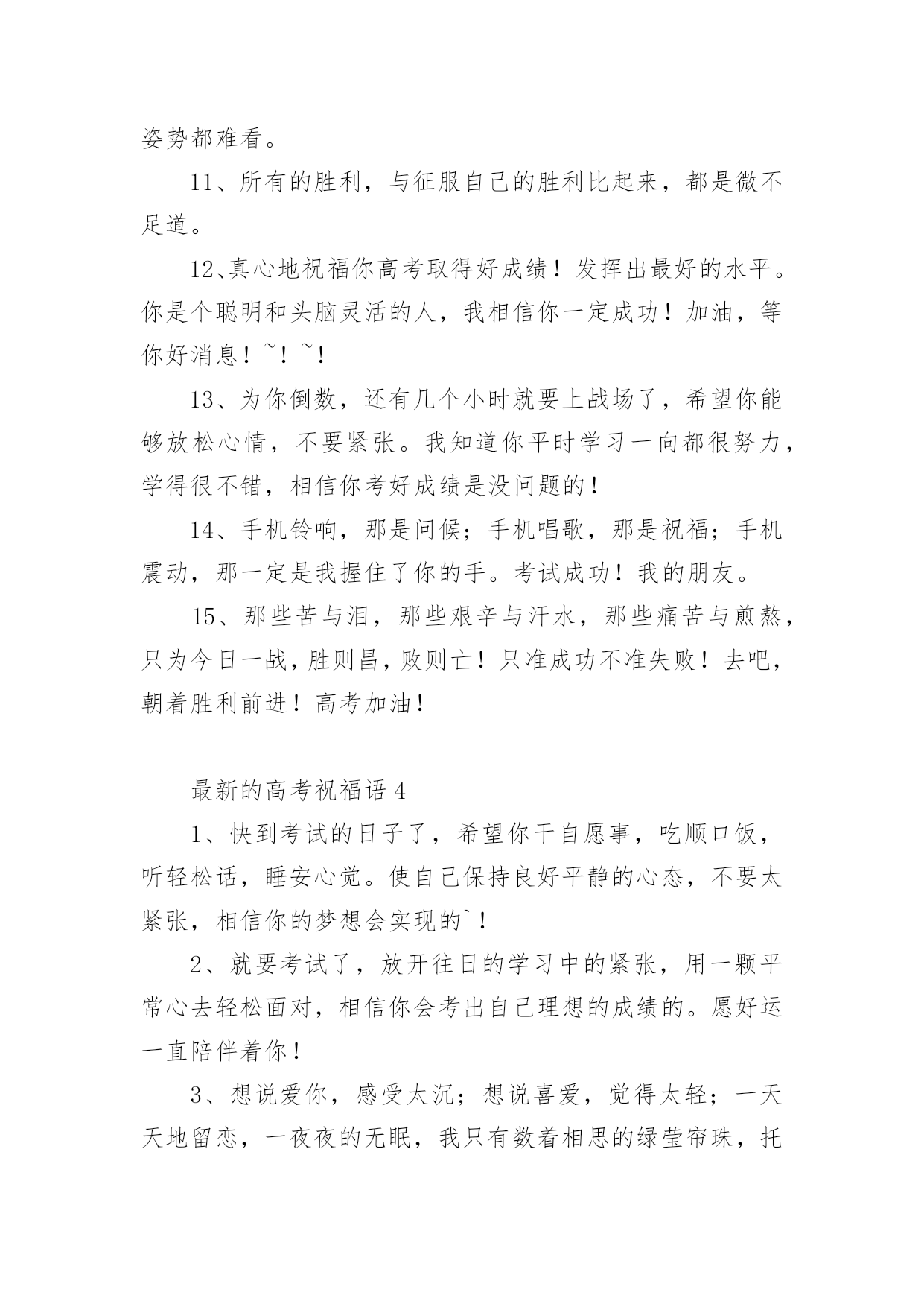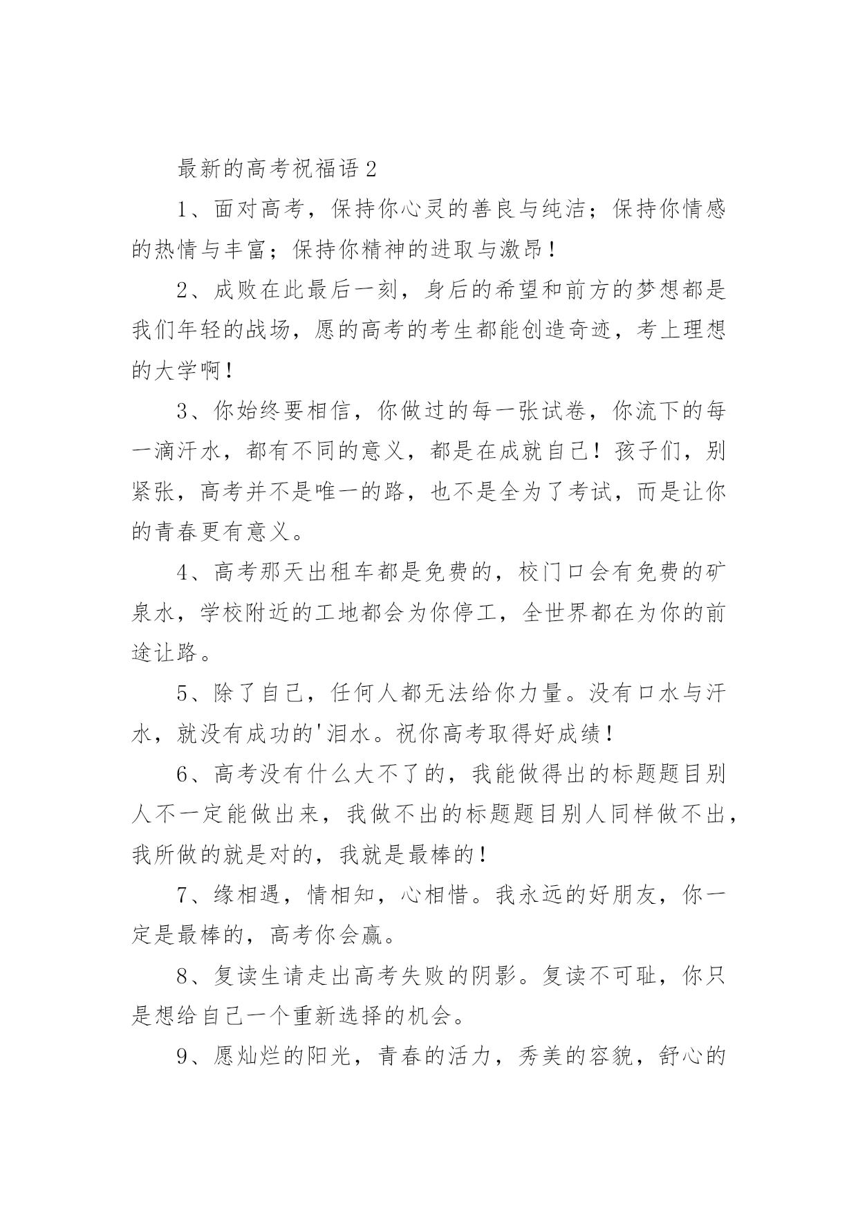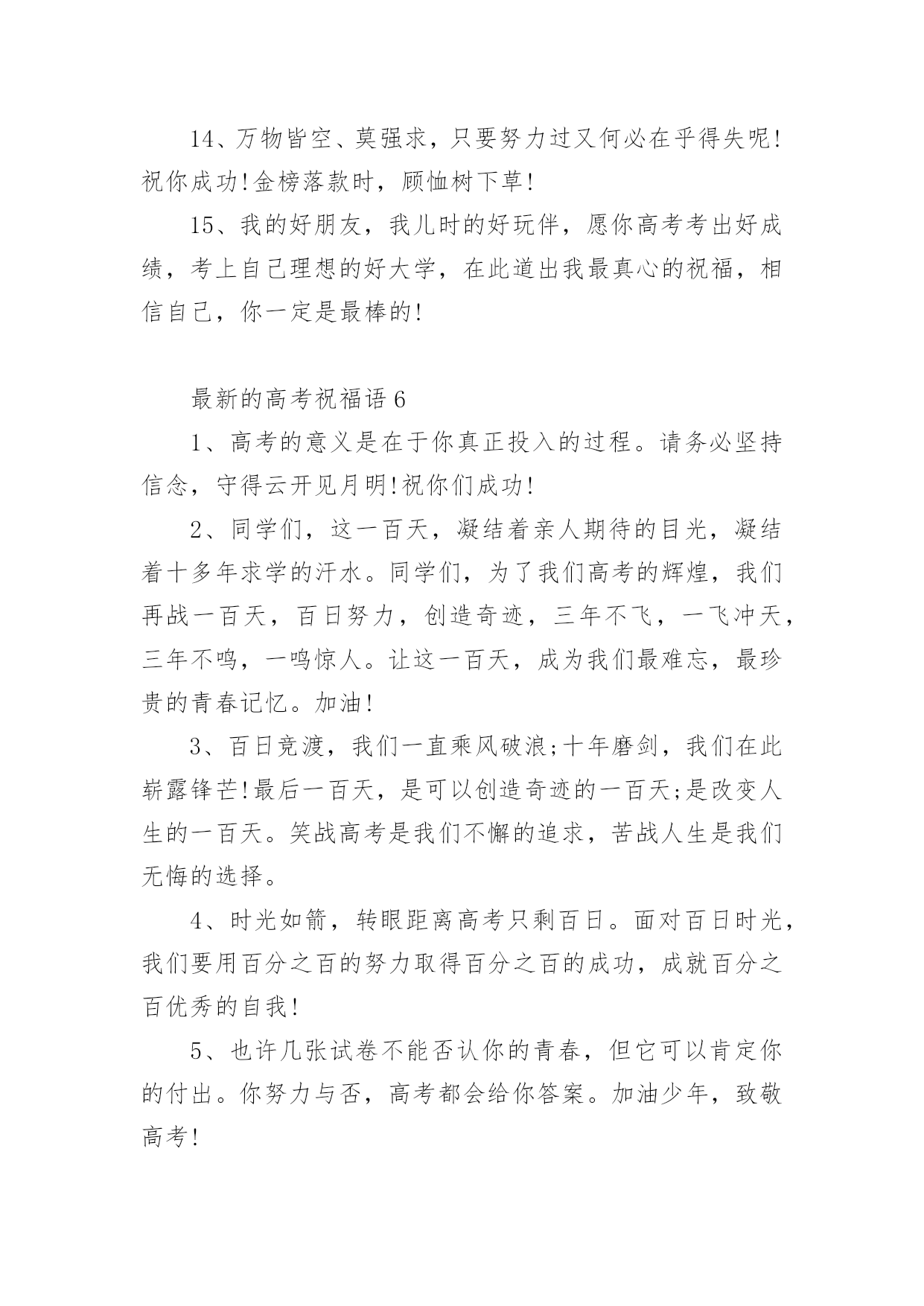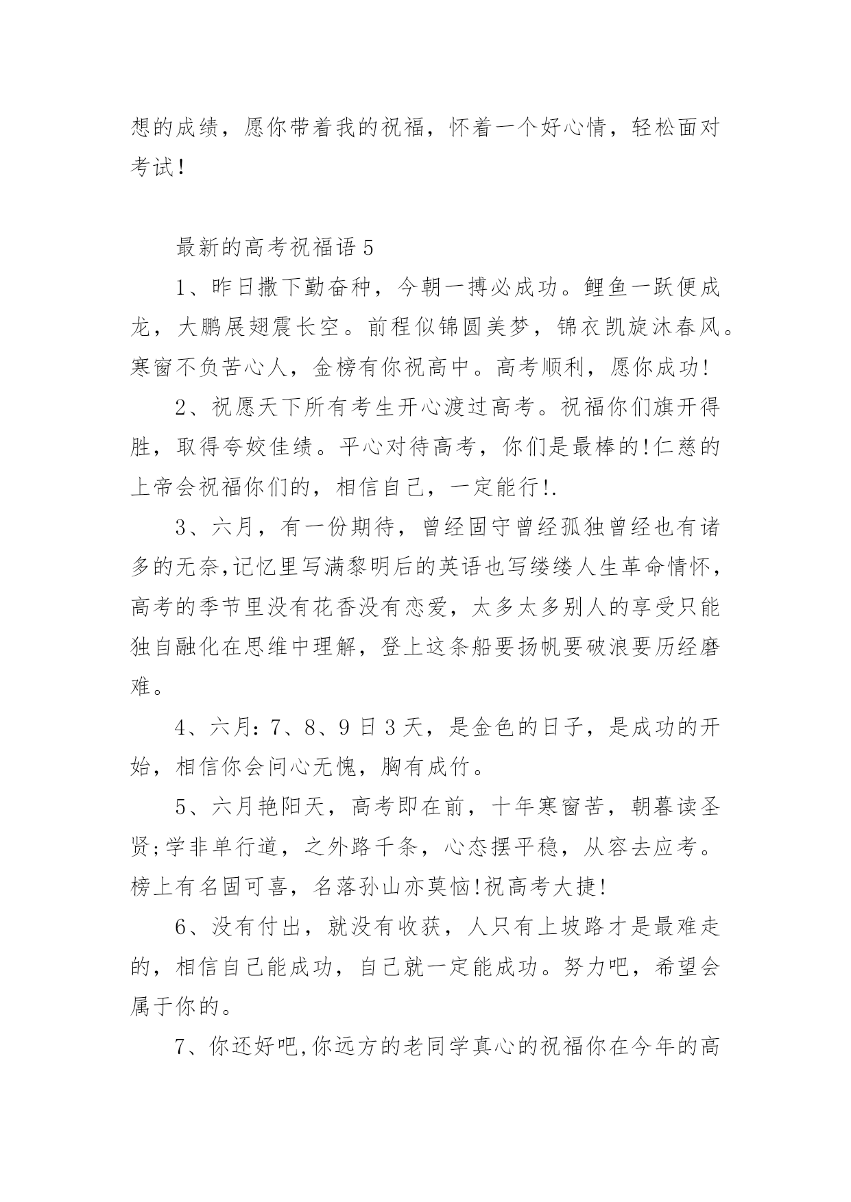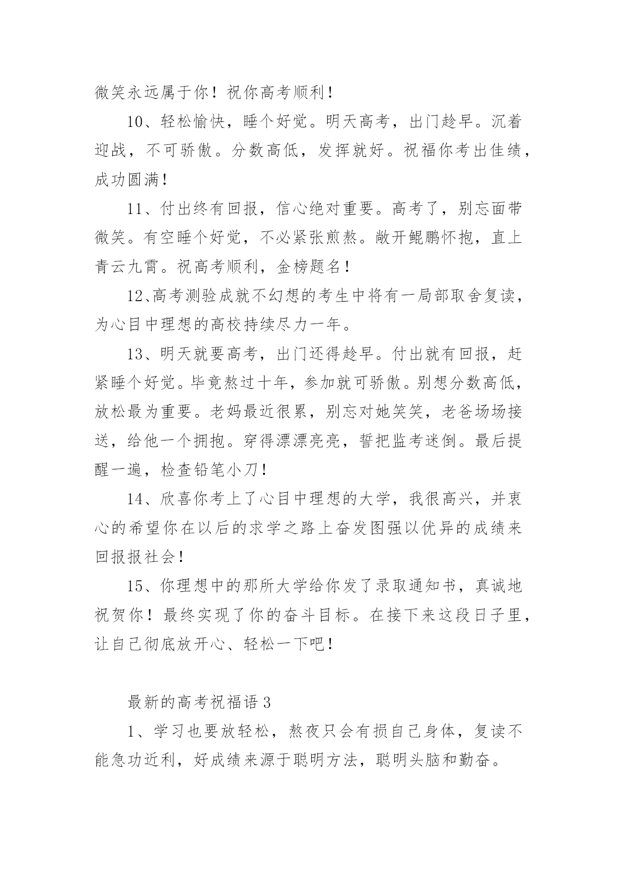 最新的高考祝福语最新的高考祝福语(精选120句)在日常学习、工作或生活中,大家都不可避免地会接触到祝福语吧,祝福语可以增进我们和他人的情感交流。你所知道的祝福语是都是什么样子的?下面是小编为大家收集的最新的高考祝福语(精选120句),欢迎阅读,希望大家能够喜欢。最新的高考祝福语11.决战高考巅峰时,信心百倍增能量。真才实学浑不怕,文思隽永倍潇洒。十年磨剑试锋芒,百花丛中显芬芳。纵横考场斩关将,马到成功幸福尝!祝高考顺利2.长风破浪会有时,直挂云帆济沧海,高考是人生的一个起点,相信自己,明天又是一和个艳阳天!3.校园里寂静无声,教室里聚精会神。老师的脚步轻轻,学生的笔儿不停。十年辛苦此时博,只愿金榜题名慰双亲。全国高考日到了,愿你超常发挥创佳绩,成绩傲人开心笑!4.踏踏实实,努力备战;自信满满,迎接挑战;平心静气,对待高考;妙笔生花,金榜题名。相信自己,一定能行!祝福的话5.全国高考日到了,愿你执才高八斗生辉笔,饮才思万千智慧水,带气定神闲满面笑,拥胸中成竹满怀志,书锦绣嫣然好答卷,定折取桂冠来题名。6.大家知道为什么高考要在六月7日到8日吗?因为“录取吧”!7.豪情满怀进考场,壮志凌云压群芳,雄鹰展翅任翱翔,骏马奋蹄勇敢闯。十载苦读在寒窗,一举成功题金榜,祝君高考获头彩,前程似锦宏图长!8.加油吧!我的同窗们!高中三年,我们一起走过!明天,让我们一起高呼;我是一中的.学生,我怕谁!9.高考,是一场持久战,只有坚持到最后的人才能笑到最后;高考,是一场心理战的拼搏,谁心态好谁就是黑马;高考,是一场大师级的博弈,时刻保持清醒的头脑才能取得最后的胜利!10.此时此刻,有千言万语想对你说,你是最棒的,理想学府在等着你,向前冲吧!我会永远支持你!11.积极“备战”乐观“应战”努力“奋战”争取“胜战”!我亲爱的“战友”,坚持到底,就是胜利!祝福你:旗开得胜,“高考高中”!13.在高考的道路上,惟有坚持不懈,奋发向上的人,才能登上胜利的巅峰。14.六月是奋斗的季节,六月是收获的季节。在经历了高考之后,捷报在焦急的等待中到来。愿你继续努力,在高等学府的知识海洋中畅游。祝前程似锦,宏图大展!15.少壮须努力,用功要趁早。十年磨一剑,备战为高考。天道自古酬勤,付出才有回报。压力释放心情好,考前放松最重要。预祝高考顺利,金榜题名!最新的高考祝福语21、面对高考,保持你心灵的善良与纯洁;保持你情感的热情与丰富;保持你精神的进取与激昂!2、成败在此最后一刻,身后的希望和前方的梦想都是我们年轻的战场,愿的高考的考生都能创造奇迹,考上理想的大学啊!3、你始终要相信,你做过的每一张试卷,你流下的每一滴汗水,都有不同的意义,都是在成就自己!孩子们,别紧张,高考并不是唯一的路,也不是全为了考试,而是让你的青春更有意义。4、高考那天出租车都是免费的,校门口会有免费的矿泉水,学校附近的工地都会为你停工,全世界都在为你的前途让路。5、除了自己,任何人都无法给你力量。没有口水与汗水,就没有成功的'泪水。祝你高考取得好成绩!6、高考没有什么大不了的,我能做得出的标题题目别人不一定能做出来,我做不出的标题题目别人同样做不出,我所做的就是对的,我就是最棒的!7、缘相遇,情相知,心相惜。我永远的好朋友,你一定是最棒的,高考你会赢。8、复读生请走出高考失败的阴影。复读不可耻,你只是想给自己一个重新选择的机会。9、愿灿烂的阳光,青春的活力,秀美的容貌,舒心的微笑永远属于你!祝你高考顺利!10、轻松愉快,睡个好觉。明天高考,出门趁早。沉着迎战,不可骄傲。分数高低,发挥就好。祝福你考出佳绩,成功圆满!11、付出终有回报,信心绝对重要。高考了,别忘面带微笑。有空睡个好觉,不必紧张煎熬。敞开鲲鹏怀抱,直上青云九霄。祝高考顺利,金榜题名!12、高考测验成就不幻想的考生中将有一局部取舍复读,为心目中理想的高校持续尽力一年。13、明天就要高考,出门还得趁早。付出就有回报,赶紧睡个好觉。毕竟熬过十年,参加就可骄傲。别想分数高低,放松最为重要。老妈最近很累,别忘对她笑笑,老爸场场接送,给他一个拥抱。穿得漂漂亮亮,誓把监考迷倒。最后提醒一遍,检查铅笔小刀!14、欣喜你考上了心目中理想的大学,我很高兴,并衷心的希望你在以后的求学之路上奋发图强以优异的成绩来回报报社会!15、你理想中的那所大学给你发了录取通知书,真诚地祝贺你!最终实现了你的奋斗目标。在接下来这段日子里,让自己彻底放开心、轻松一下吧!最新的高考祝福语31、学习也要放轻松,熬夜只会有损自己身体,复读不能急功近利,好成绩来源于聪明方法,聪明头脑和勤奋。2、努力的苦读,就为这一刻啰!把你的实力全部发挥,所有关爱着你的人,都会为你祝福、祈祷,相信你会考出满意的成绩,榜上有名!3、要高考了,愿做到:以平常心对待,静心休息,开心考试,细心审题,精心答