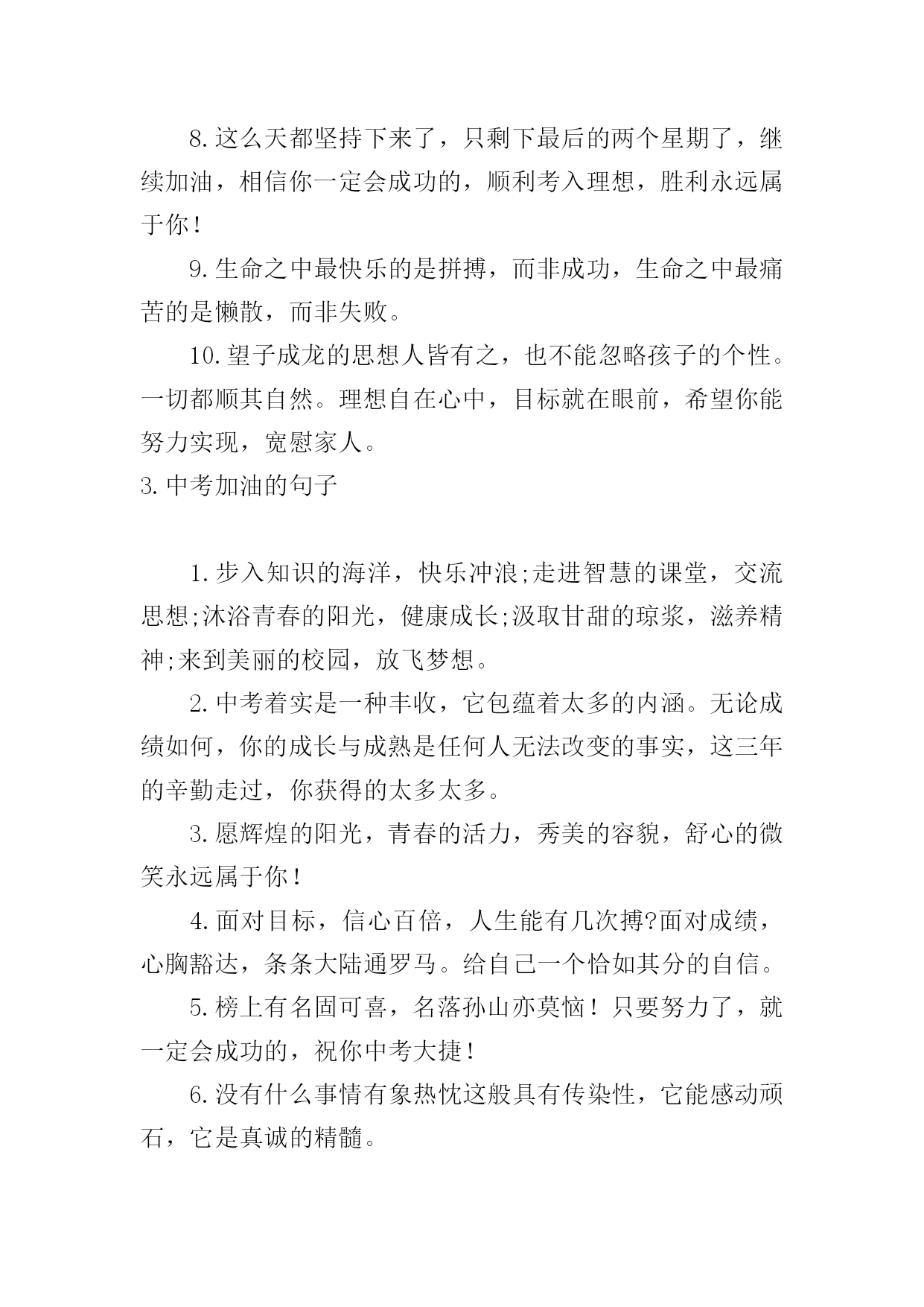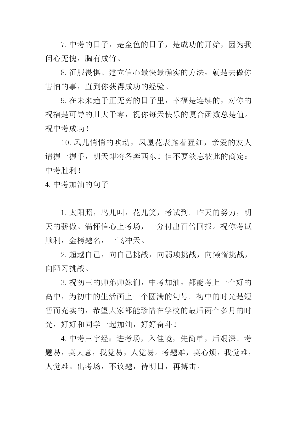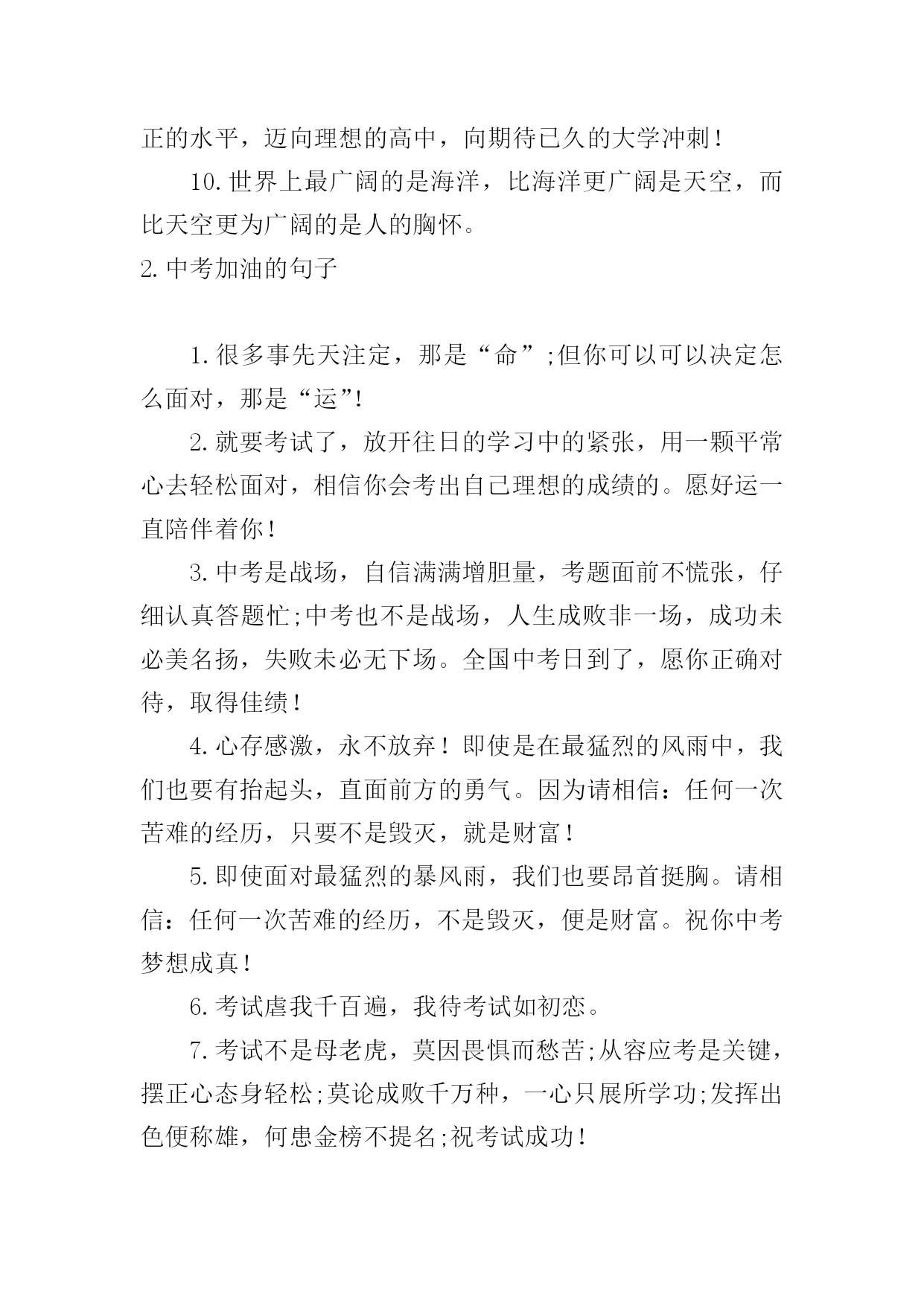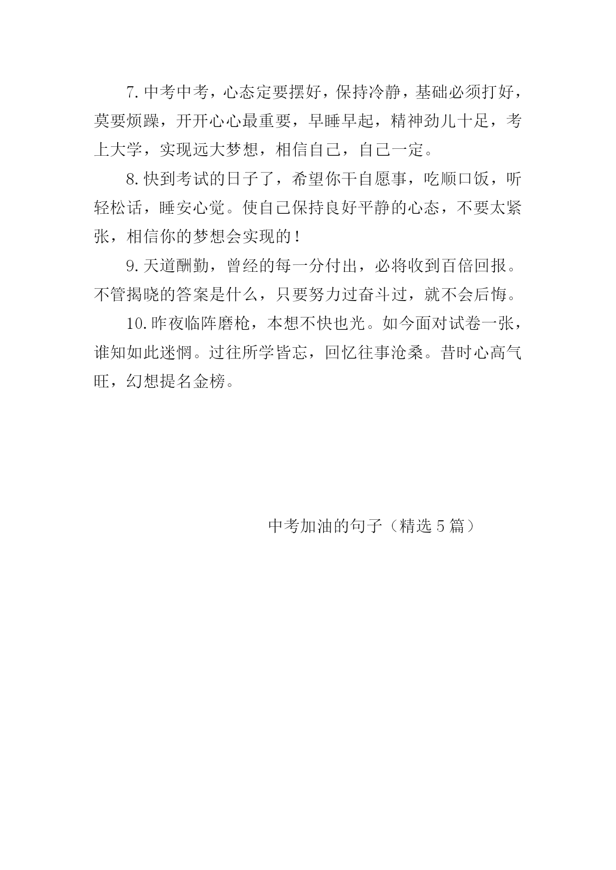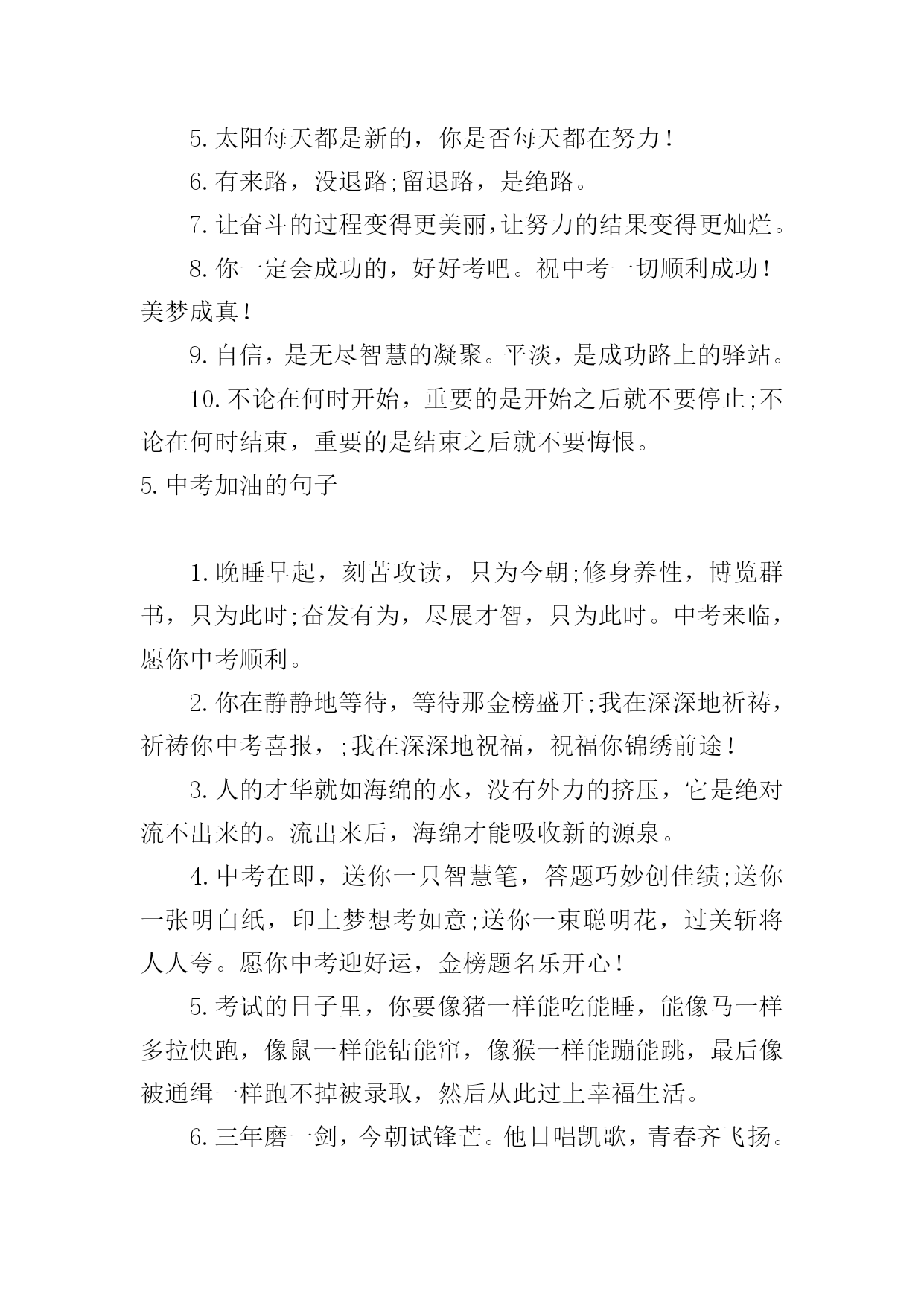 中考加油的句子(精选5篇)1.中考加油的句子1.这一天,迈着坚定的步伐,考场一起厮杀;这一天,解答命运的密码,横扫千军万马;这一天,提着紧张的神经,细心做着检查;中考日到,祝朋友一切安好!2.再长的路,一步步也能走完,再短的路,不迈开双脚也无法到达。3.觉得自己做的到和不做的到,其实只在一念之间。4.自己要先看得起自己,别人才会看得起你。5.就要考试了,希望我的问候信息会为你送去一份简单清爽的情绪,不要太紧张哦!不然可会把答案忘掉的!我在那里支持着你,鼓励着你,为你祝福!6.总想赢者必输,不怕输者必赢!7.仰望天空时,什么都比你高,你会自卑;俯视大地时,什么都比你低,你会自负;只有放宽视野,把天空和大地尽收眼底,才能在苍穹泛土之间找到你真正的位置。无须自卑,不要自负,坚持自信。8.风儿静静的吹动,凤凰花吐露着嫣红,亲爱的朋友请握一握手,明天就要各奔西东!但不要忘记彼此的约定:中考成功!9.祝中考一切顺利成功!美梦成真!理想学校就在不远的前方,先不要想一切可能的结果,认真答卷,答出你真正的水平,迈向理想的高中,向期待已久的大学冲刺!10.世界上最广阔的是海洋,比海洋更广阔是天空,而比天空更为广阔的是人的胸怀。2.中考加油的句子1.很多事先天注定,那是“命”;但你可以可以决定怎么面对,那是“运”!2.就要考试了,放开往日的学习中的紧张,用一颗平常心去轻松面对,相信你会考出自己理想的成绩的。愿好运一直陪伴着你!3.中考是战场,自信满满增胆量,考题面前不慌张,仔细认真答题忙;中考也不是战场,人生成败非一场,成功未必美名扬,失败未必无下场。全国中考日到了,愿你正确对待,取得佳绩!4.心存感激,永不放弃!即使是在最猛烈的风雨中,我们也要有抬起头,直面前方的勇气。因为请相信:任何一次苦难的经历,只要不是毁灭,就是财富!5.即使面对最猛烈的暴风雨,我们也要昂首挺胸。请相信:任何一次苦难的经历,不是毁灭,便是财富。祝你中考梦想成真!6.考试虐我千百遍,我待考试如初恋。7.考试不是母老虎,莫因畏惧而愁苦;从容应考是关键,摆正心态身轻松;莫论成败千万种,一心只展所学功;发挥出色便称雄,何患金榜不提名;祝考试成功!8.这么天都坚持下来了,只剩下最后的两个星期了,继续加油,相信你一定会成功的,顺利考入理想,胜利永远属于你!9.生命之中最快乐的是拼搏,而非成功,生命之中最痛苦的是懒散,而非失败。10.望子成龙的思想人皆有之,也不能忽略孩子的个性。一切都顺其自然。理想自在心中,目标就在眼前,希望你能努力实现,宽慰家人。3.中考加油的句子1.步入知识的海洋,快乐冲浪;走进智慧的课堂,交流思想;沐浴青春的阳光,健康成长;汲取甘甜的琼浆,滋养精神;来到美丽的校园,放飞梦想。2.中考着实是一种丰收,它包蕴着太多的内涵。无论成绩如何,你的成长与成熟是任何人无法改变的事实,这三年的辛勤走过,你获得的太多太多。3.愿辉煌的阳光,青春的活力,秀美的容貌,舒心的微笑永远属于你!4.面对目标,信心百倍,人生能有几次搏?面对成绩,心胸豁达,条条大陆通罗马。给自己一个恰如其分的自信。5.榜上有名固可喜,名落孙山亦莫恼!只要努力了,就一定会成功的,祝你中考大捷!6.没有什么事情有象热忱这般具有传染性,它能感动顽石,它是真诚的精髓。7.中考的日子,是金色的日子,是成功的开始,因为我问心无愧,胸有成竹。8.征服畏惧、建立信心最快最确实的方法,就是去做你害怕的事,直到你获得成功的经验。9.在未来趋于正无穷的日子里,幸福是连续的,对你的祝福是可导的且大于零,祝你每天快乐的复合函数总是值。祝中考成功!10.风儿悄悄的吹动,凤凰花表露着猩红,亲爱的友人请握一握手,明天即将各奔西东!但不要淡忘彼此的商定:中考胜利!4.中考加油的句子1.太阳照,鸟儿叫,花儿笑,考试到。昨天的努力,明天的骄傲。满怀信心上考场,一分付出百倍回报。祝你考试顺利,金榜题名,一飞冲天。2.超越自己,向自己挑战,向弱项挑战,向懒惰挑战,向陋习挑战。3.祝初三的师弟师妹们,中考加油,都能考上一个好的高中,为初中的生活画上一个圆满的句号。初中的时光是短暂而充实的,希望大家都能珍惜在学校的最后两个多月的时光,好好和同学一起加油,好好奋斗!4.中考三字经:进考场,入佳境,先简单,后艰深。考题易,莫大意,我觉易,人觉易。考题难,莫心烦,我觉难,人觉难。出考场,不议题,待明日,再搏击。5.太阳每天都是新的,你是否每天都在努力!6.有来路,没退路;留退路,是绝路。7.让奋斗的过程变得更美丽,让努力的结果变得更灿烂。8.你一定会成功的,好好考吧。祝中考一切顺利成功!美梦成真!9.自信,是无尽智慧的凝聚。平淡,是成功路上的驿站。10.不论在何时开