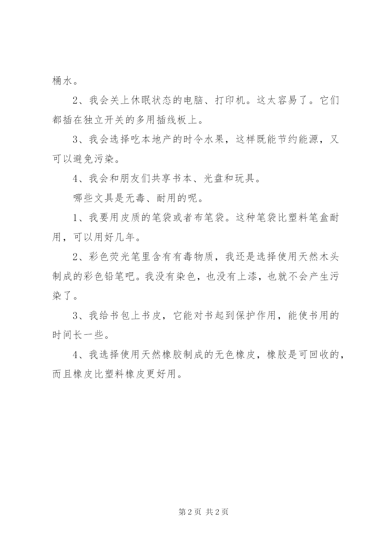 第PAGE\*Arabic\*MERGEFORMAT2页共NUMPAGES\*MERGEFORMAT2页学校更环保倡议书在学校里,是谁浪费了资源,又是谁污染了环境呢。在学校里,向浪费和污染喊停。1、在决定购买最新的游戏或流行玩具前,请问问自己,能不能通过方式来娱乐。我们购买的这些产品需要消耗自然资源,它们被丢弃后还会变成垃圾。2、洗完手后,如果还让水继续流着,5分钟就会浪费60升水。3、我会节约用纸。每一页纸的正反面都书写到满了,这样就不会浪费了。我还在打草稿时使用回收纸呢。4、我有一个结实的书包,可以使用好几年,也不会被压坏。我会选择使用耐用型的文具。5、休眠状态的电脑和打印机还会继续消耗电能。一台休眠的电脑和打印机一天消耗的电能居然跟一台冰箱的耗电量是一样的。6、在学校的树上刻画图案,会让昆虫、细菌很容易进入到树木里面,从而摧毁整棵树。要知道,动植物是应该受到保护的。7、广告会鼓动我们购买一些并不需要的东西,我们要根据自己的实际需要在家长的指导下购买。怎样才能拥有环境优美的学校呢。1、用完水后,我会及时关上水龙头。拖地时,我只接小半桶水。2、我会关上休眠状态的电脑、打印机。这太容易了。它们都插在独立开关的多用插线板上。3、我会选择吃本地产的时令水果,这样既能节约能源,又可以避免污染。4、我会和朋友们共享书本、光盘和玩具。哪些文具是无毒、耐用的呢。1、我要用皮质的笔袋或者布笔袋。这种笔袋比塑料笔盒耐用,可以用好几年。2、彩色荧光笔里含有有毒物质,我还是选择使用天然木头制成的彩色铅笔吧。我没有染色,也没有上漆,也就不会产生污染了。3、我给书包上书皮,它能对书起到保护作用,能使书用的时间长一些。4、我选择使用天然橡胶制成的无色橡皮,橡胶是可回收的,而且橡皮比塑料橡皮更好用。
