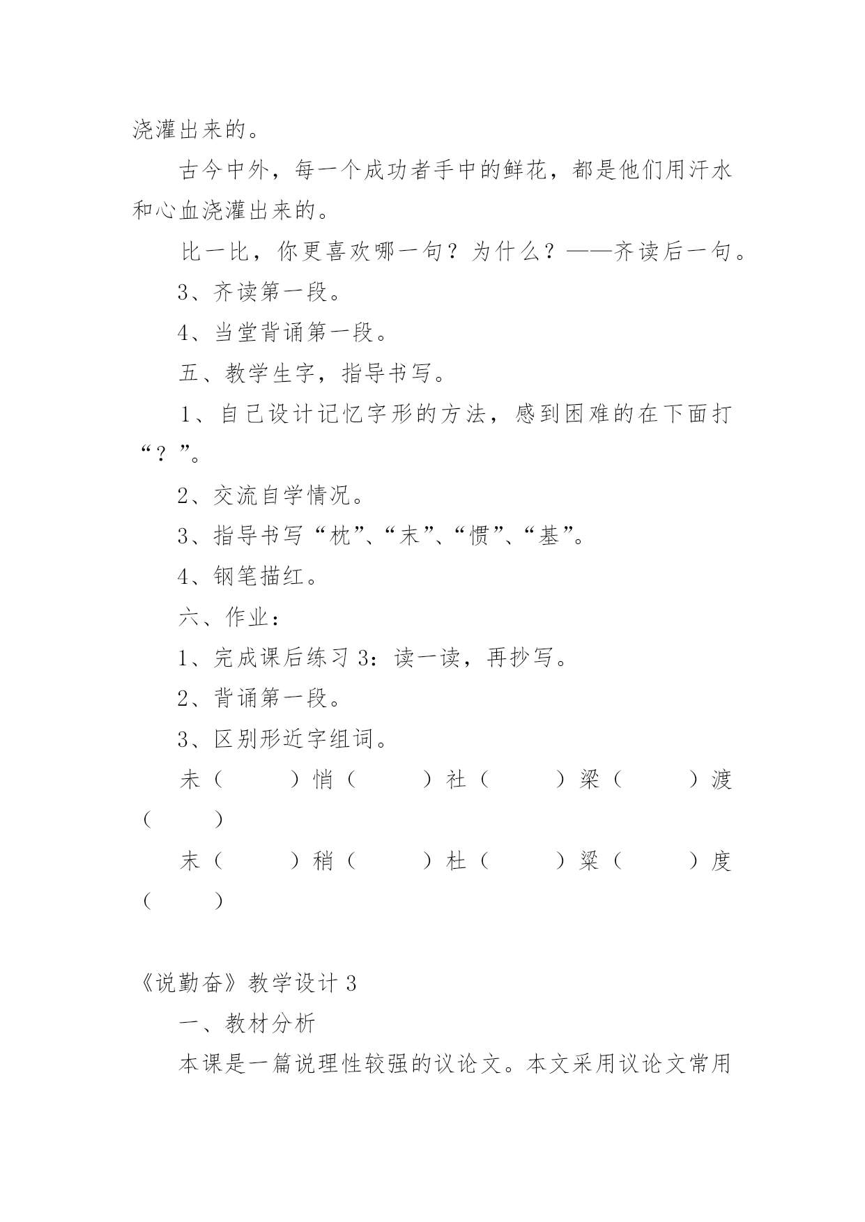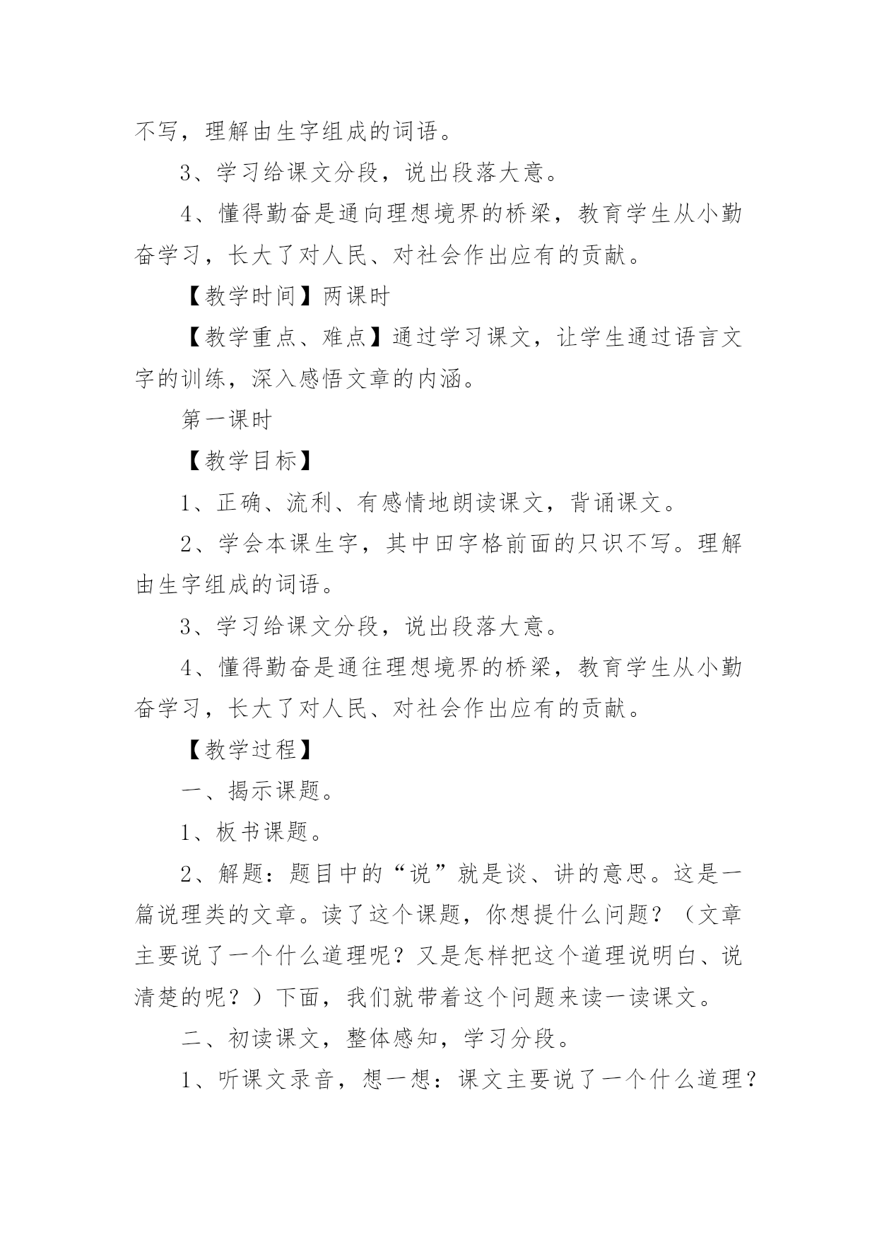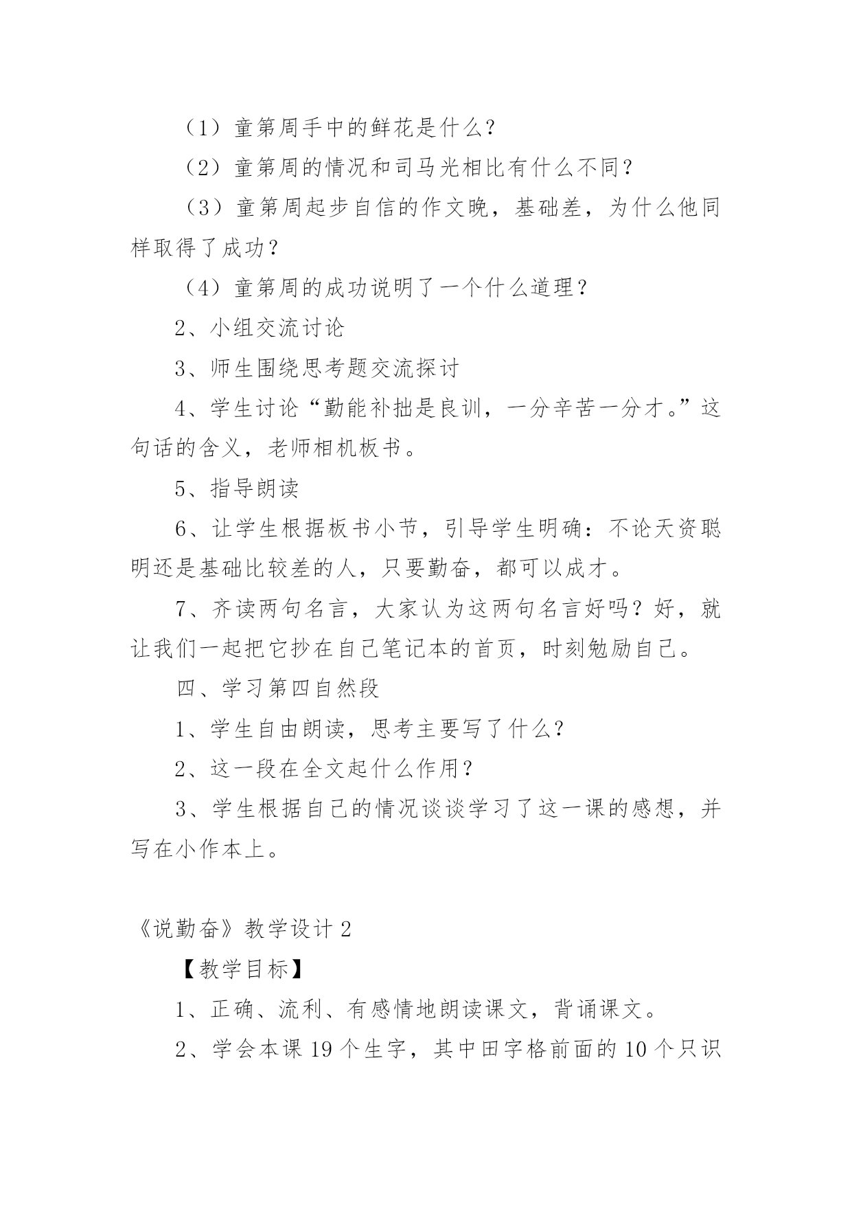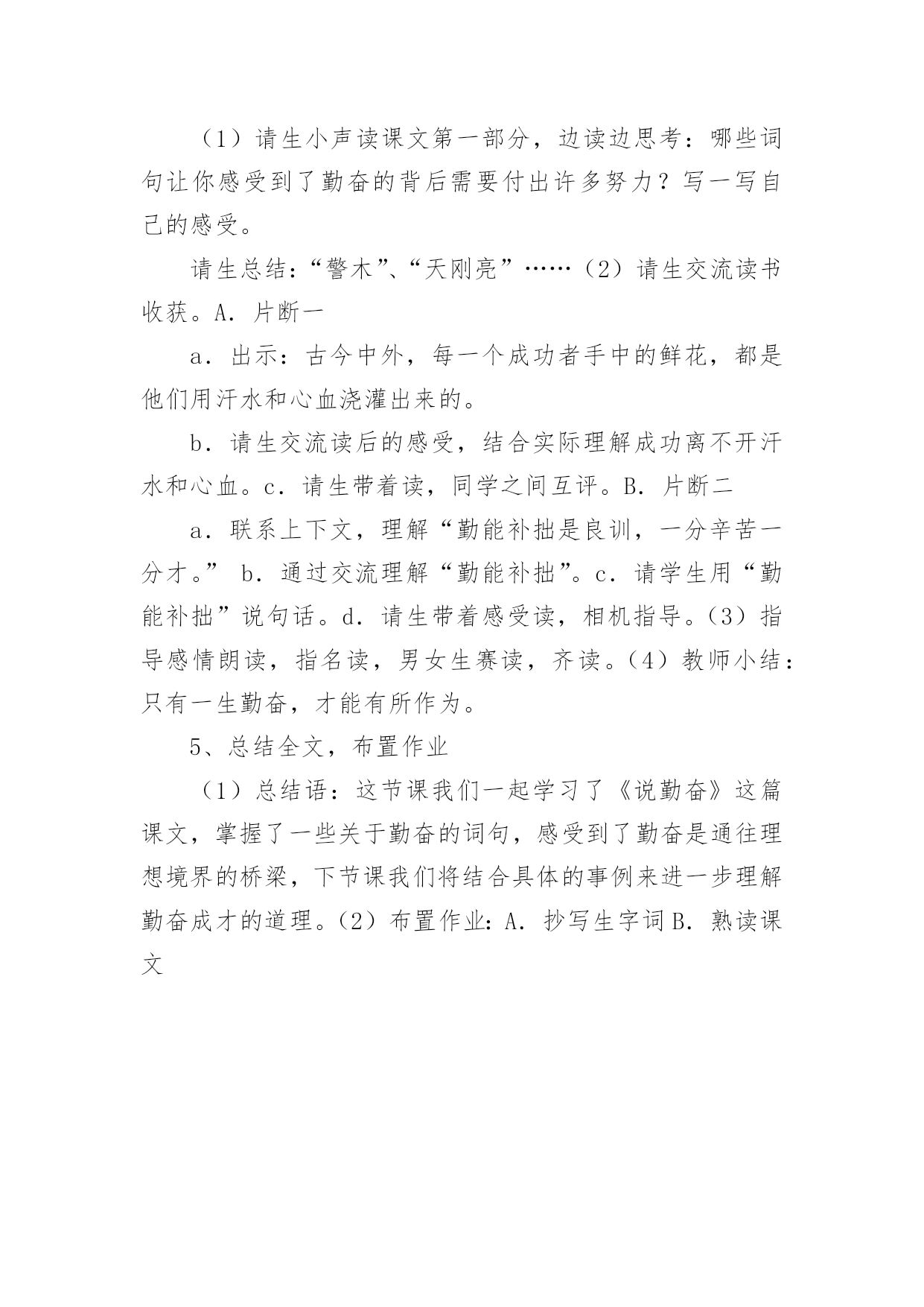 《说勤奋》教学设计作为一名辛苦耕耘的教育工作者,时常需要准备好教学设计,教学设计是对学业业绩问题的解决措施进行策划的过程。优秀的教学设计都具备一些什么特点呢?下面是小编整理的《说勤奋》教学设计,仅供参考,大家一起来看看吧。《说勤奋》教学设计1学习目标:1、学习司马光和童第周勤奋成才的故事,懂得勤奋是实现理想的桥梁的道理。2、教育学生从小勤奋学习,长大了对人民、对社会作出应有的贡献。3、略知说理文的篇章结构,摆事实,讲道理。重点难点:懂得勤奋能使天资聪明的人成才,反之也会流于平庸;勤奋也能使基础较差的人成为可用之才,不应自暴自弃。懂得成功=一份天才+九十九份汗水,勤能补拙的道理。教学过程:一、复习导入:上节课学习了第一段,你从中懂得了什么?二、细读第二自然段1、课文围绕“勤奋是实现理想的桥梁。”这一中心,作者主要写了哪两个人勤奋成才的故事?(相机板书:司马光、童第周)2、大家一定还记得一年级学过的司马光砸缸救人的故事,从这个故事可以看出司马光小时候是个怎样的孩子?板书(天资聪明)3、天资聪明的司马光长大后诚信的作文取得了什么成就呢?指名读第二自然段。讨论:(1)司马光手中的鲜花是什么?“终于”这个词说明了什么?“警枕”的警在这里是什么意思?(2)司马光怎样用汗水和心血去浇灌的?(引导学生边读边找出书上有关词语和句子。理解“滚瓜烂熟”“一遍又一遍”)(3)司马光的事例告诉我们(板书):“成功=一份天才+九十九份汗水”(4)自由练读第二自然段(5)指名读,师与生一起评点,是否读出了司马光的刻苦、勤奋?4、小结:砸缸救人的司马光从小就天资聪明,但是他依然始终如一地勤奋学习,最后写成了名留千古的史学巨著《资治通鉴》,这就充分说明了“成功=一份天才+九十九份汗水”。三、细读第三自然段1、学生自学,完成下列思考题,并用自己喜欢的`符号把有关的词句画出来:(1)童第周手中的鲜花是什么?(2)童第周的情况和司马光相比有什么不同?(3)童第周起步自信的作文晚,基础差,为什么他同样取得了成功?(4)童第周的成功说明了一个什么道理?2、小组交流讨论3、师生围绕思考题交流探讨4、学生讨论“勤能补拙是良训,一分辛苦一分才。”这句话的含义,老师相机板书。5、指导朗读6、让学生根据板书小节,引导学生明确:不论天资聪明还是基础比较差的人,只要勤奋,都可以成才。7、齐读两句名言,大家认为这两句名言好吗?好,就让我们一起把它抄在自己笔记本的首页,时刻勉励自己。四、学习第四自然段1、学生自由朗读,思考主要写了什么?2、这一段在全文起什么作用?3、学生根据自己的情况谈谈学习了这一课的感想,并写在小作本上。《说勤奋》教学设计2【教学目标】1、正确、流利、有感情地朗读课文,背诵课文。2、学会本课19个生字,其中田字格前面的10个只识不写,理解由生字组成的词语。3、学习给课文分段,说出段落大意。4、懂得勤奋是通向理想境界的桥梁,教育学生从小勤奋学习,长大了对人民、对社会作出应有的贡献。【教学时间】两课时【教学重点、难点】通过学习课文,让学生通过语言文字的训练,深入感悟文章的内涵。第一课时【教学目标】1、正确、流利、有感情地朗读课文,背诵课文。2、学会本课生字,其中田字格前面的只识不写。理解由生字组成的词语。3、学习给课文分段,说出段落大意。4、懂得勤奋是通往理想境界的桥梁,教育学生从小勤奋学习,长大了对人民、对社会作出应有的贡献。【教学过程】一、揭示课题。1、板书课题。2、解题:题目中的“说”就是谈、讲的意思。这是一篇说理类的文章。读了这个课题,你想提什么问题?(文章主要说了一个什么道理呢?又是怎样把这个道理说明白、说清楚的呢?)下面,我们就带着这个问题来读一读课文。二、初读课文,整体感知,学习分段。1、听课文录音,想一想:课文主要说了一个什么道理?2、交流(只要求说出大概意思就可以了)3、引导分段。(1)学生轻声读课文,看看课文在哪里提出了观点?又是怎样证明这个观点的?课文最后又是讲了什么?(2)交流。(3)根据以上问题给课文分段,并在文中作好记号。三、分段读通课文。1、先拼读生字,读熟新词。2、分段读通课文。自己练读——指名读——纠正读音,指导读通长句——齐读。四、学习课文第一段。1、自由轻声读课文第一段,画出中心句。2、出示:通往理想境界的桥梁是什么?是勤奋。(1)这里的“桥梁”是什么?(2)把那句自问自答的句子换一个说法。(3)过渡:是的,勤奋是实现通往理想境界的桥梁,成功者手中的鲜花,是他们用汗水和心血浇灌出来的。相机出示:成功者手中的鲜花,是他们用汗水和心血浇灌出来的。讨论:“鲜花”在这里是什么意思?“汗水和心血”又是指什么?(4)说说这句话的'意思。(5)出示:成功者手中的鲜花,是他们用汗水和心血浇灌出来的。古今中外,每一个成功者手中的鲜花,都是他们用汗水