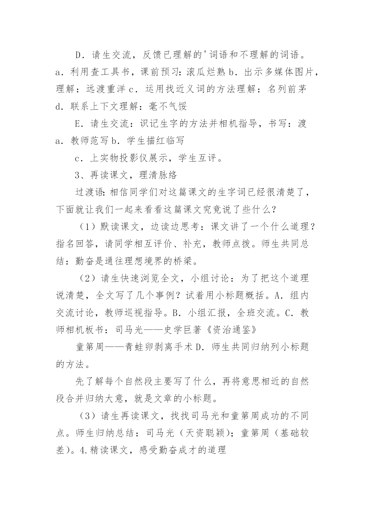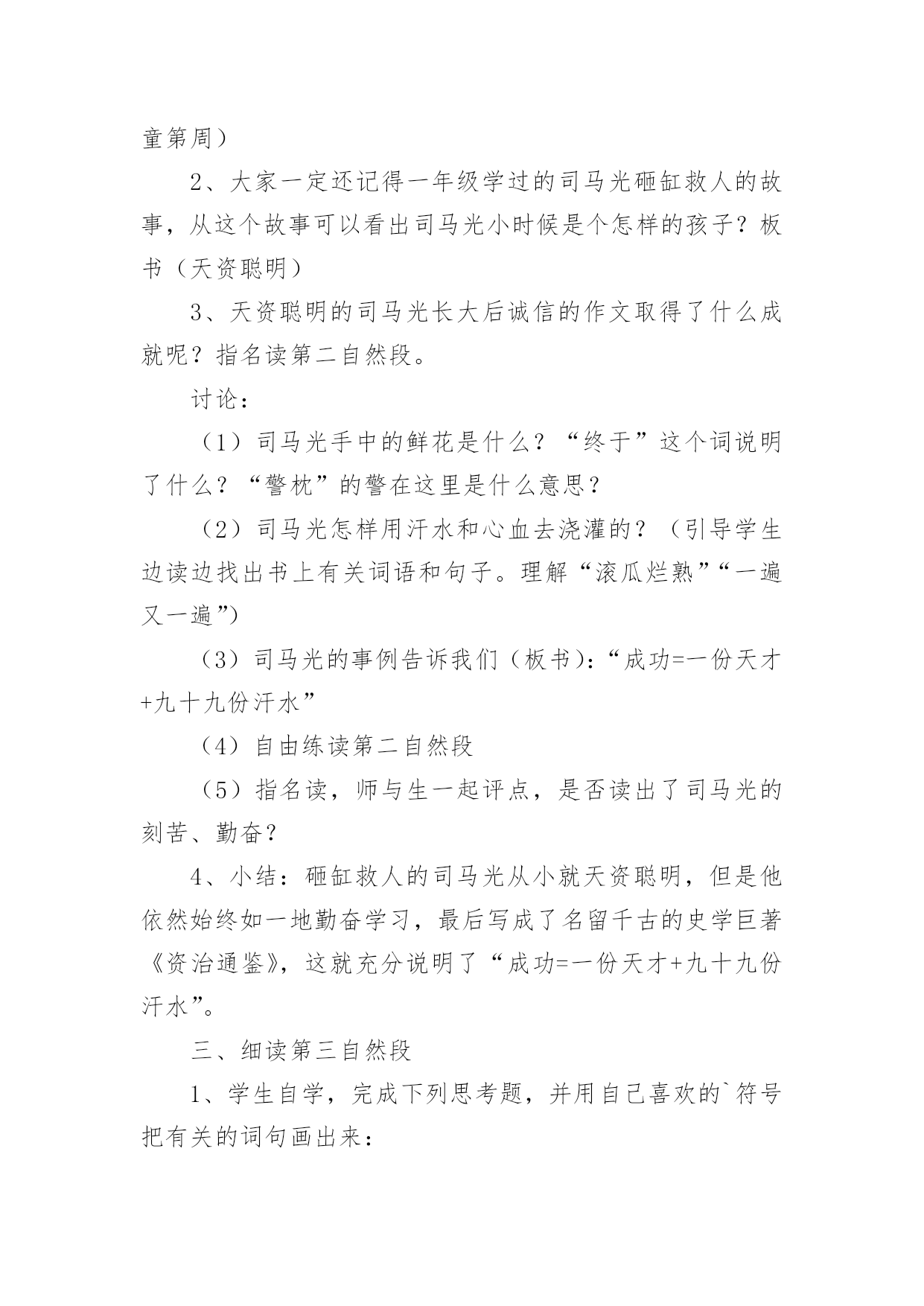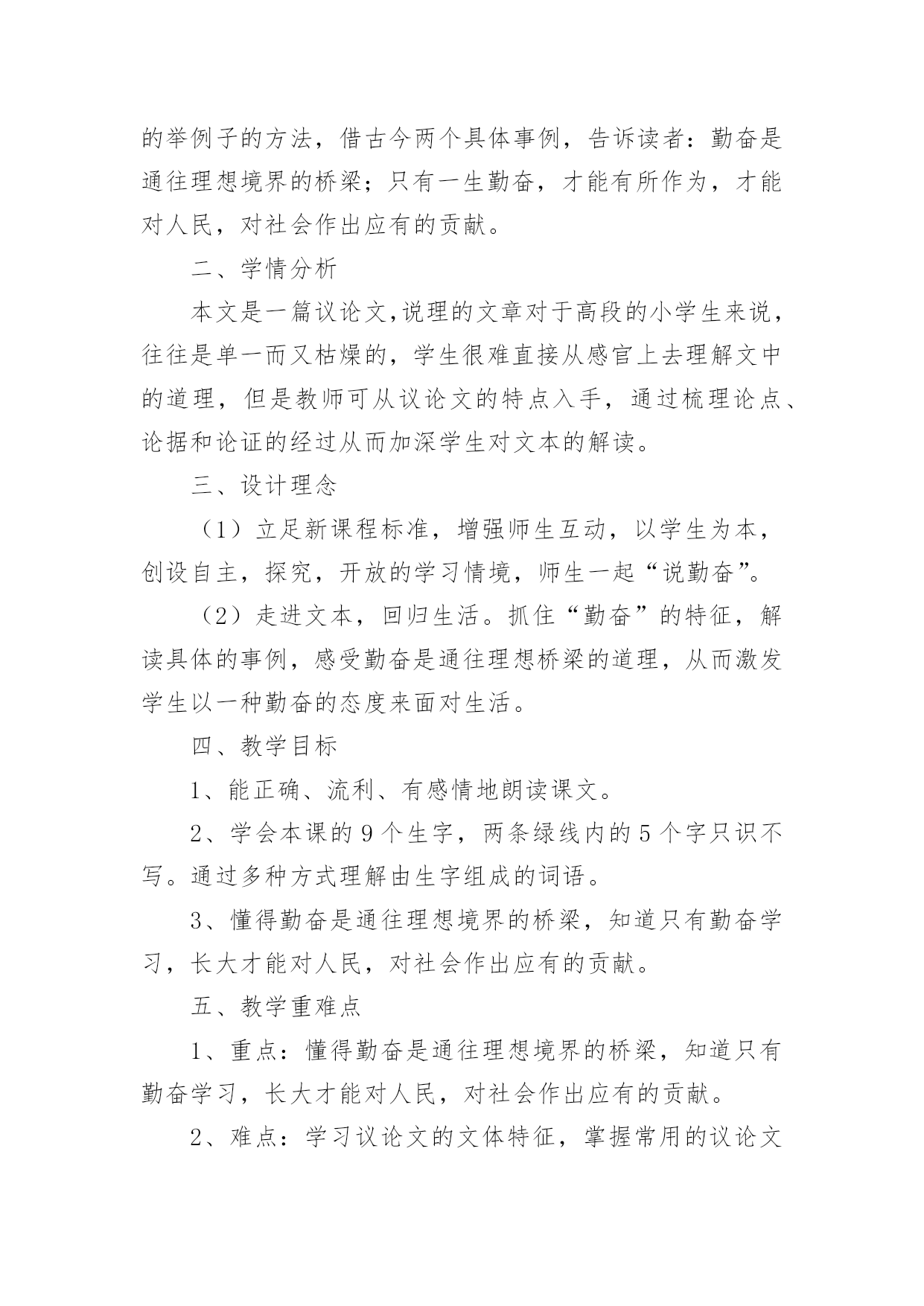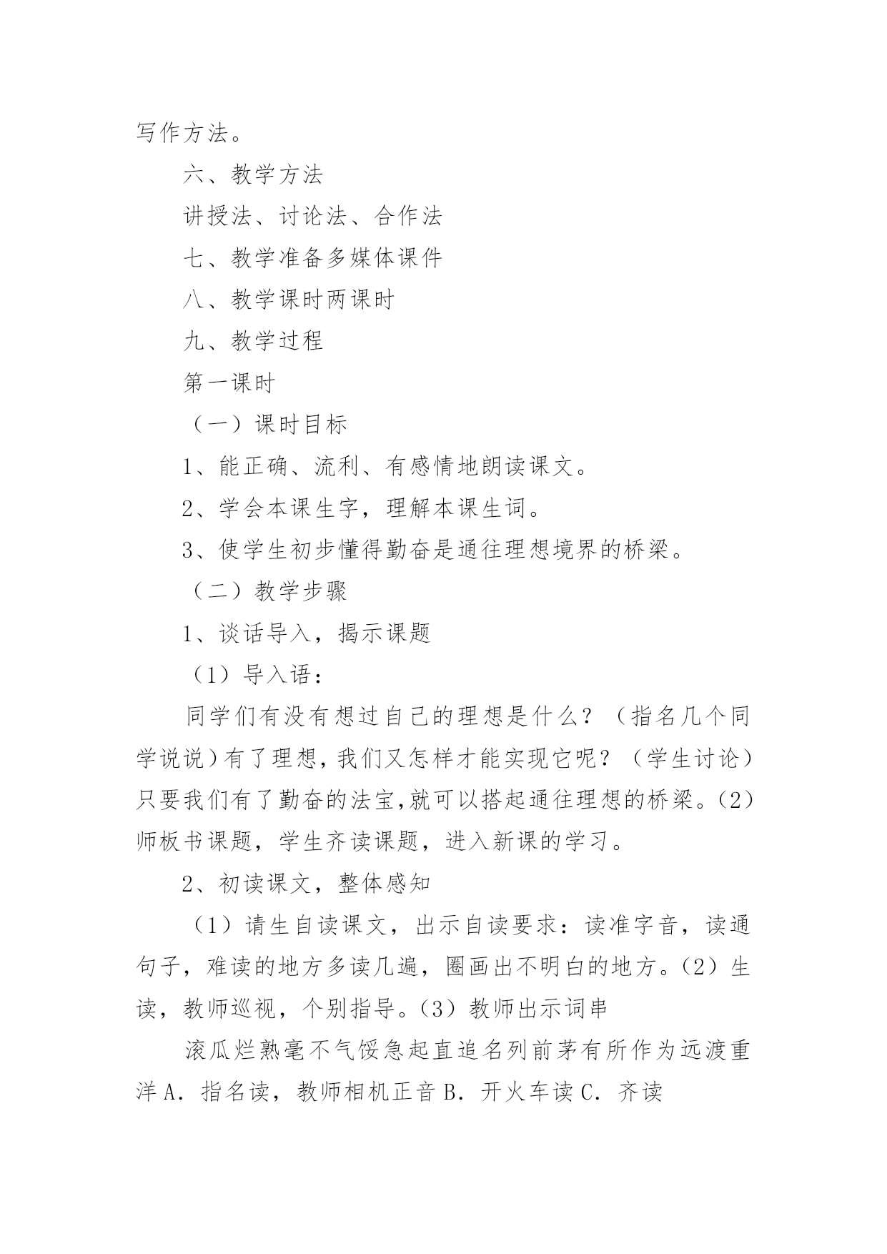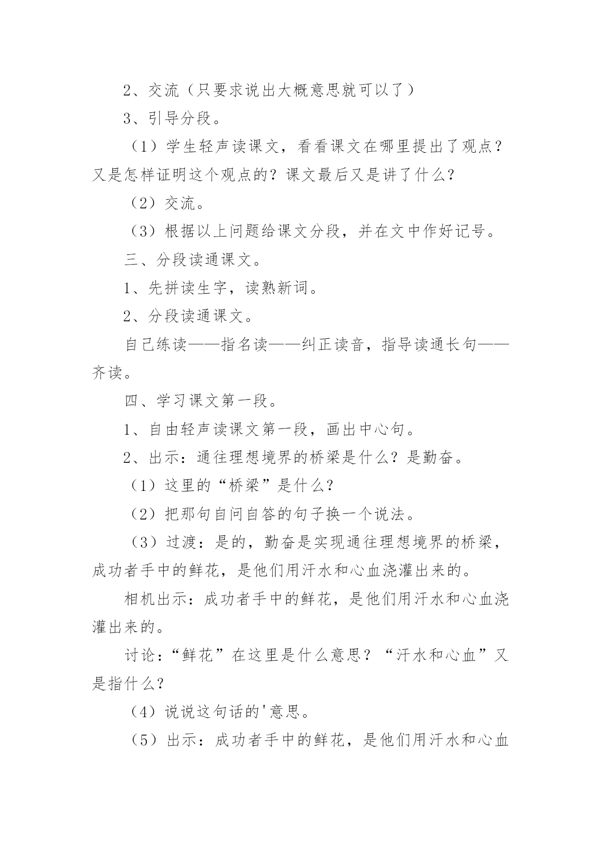 《说勤奋》教学设计作为一名辛苦耕耘的教育工作者,时常需要准备好教学设计,教学设计是对学业业绩问题的解决措施进行策划的过程。优秀的教学设计都具备一些什么特点呢?下面是小编整理的《说勤奋》教学设计,仅供参考,大家一起来看看吧。《说勤奋》教学设计1学习目标:1、学习司马光和童第周勤奋成才的故事,懂得勤奋是实现理想的桥梁的道理。2、教育学生从小勤奋学习,长大了对人民、对社会作出应有的贡献。3、略知说理文的篇章结构,摆事实,讲道理。重点难点:懂得勤奋能使天资聪明的人成才,反之也会流于平庸;勤奋也能使基础较差的人成为可用之才,不应自暴自弃。懂得成功=一份天才+九十九份汗水,勤能补拙的道理。教学过程:一、复习导入:上节课学习了第一段,你从中懂得了什么?二、细读第二自然段1、课文围绕“勤奋是实现理想的桥梁。”这一中心,作者主要写了哪两个人勤奋成才的故事?(相机板书:司马光、童第周)2、大家一定还记得一年级学过的司马光砸缸救人的故事,从这个故事可以看出司马光小时候是个怎样的孩子?板书(天资聪明)3、天资聪明的司马光长大后诚信的作文取得了什么成就呢?指名读第二自然段。讨论:(1)司马光手中的鲜花是什么?“终于”这个词说明了什么?“警枕”的警在这里是什么意思?(2)司马光怎样用汗水和心血去浇灌的?(引导学生边读边找出书上有关词语和句子。理解“滚瓜烂熟”“一遍又一遍”)(3)司马光的事例告诉我们(板书):“成功=一份天才+九十九份汗水”(4)自由练读第二自然段(5)指名读,师与生一起评点,是否读出了司马光的刻苦、勤奋?4、小结:砸缸救人的司马光从小就天资聪明,但是他依然始终如一地勤奋学习,最后写成了名留千古的史学巨著《资治通鉴》,这就充分说明了“成功=一份天才+九十九份汗水”。三、细读第三自然段1、学生自学,完成下列思考题,并用自己喜欢的`符号把有关的词句画出来:(1)童第周手中的鲜花是什么?(2)童第周的情况和司马光相比有什么不同?(3)童第周起步自信的作文晚,基础差,为什么他同样取得了成功?(4)童第周的成功说明了一个什么道理?2、小组交流讨论3、师生围绕思考题交流探讨4、学生讨论“勤能补拙是良训,一分辛苦一分才。”这句话的含义,老师相机板书。5、指导朗读6、让学生根据板书小节,引导学生明确:不论天资聪明还是基础比较差的人,只要勤奋,都可以成才。7、齐读两句名言,大家认为这两句名言好吗?好,就让我们一起把它抄在自己笔记本的首页,时刻勉励自己。四、学习第四自然段1、学生自由朗读,思考主要写了什么?2、这一段在全文起什么作用?3、学生根据自己的情况谈谈学习了这一课的感想,并写在小作本上。《说勤奋》教学设计2【教学目标】1、正确、流利、有感情地朗读课文,背诵课文。2、学会本课19个生字,其中田字格前面的10个只识不写,理解由生字组成的词语。3、学习给课文分段,说出段落大意。4、懂得勤奋是通向理想境界的桥梁,教育学生从小勤奋学习,长大了对人民、对社会作出应有的贡献。【教学时间】两课时【教学重点、难点】通过学习课文,让学生通过语言文字的训练,深入感悟文章的内涵。第一课时【教学目标】1、正确、流利、有感情地朗读课文,背诵课文。2、学会本课生字,其中田字格前面的只识不写。理解由生字组成的词语。3、学习给课文分段,说出段落大意。4、懂得勤奋是通往理想境界的桥梁,教育学生从小勤奋学习,长大了对人民、对社会作出应有的贡献。【教学过程】一、揭示课题。1、板书课题。2、解题:题目中的“说”就是谈、讲的意思。这是一篇说理类的文章。读了这个课题,你想提什么问题?(文章主要说了一个什么道理呢?又是怎样把这个道理说明白、说清楚的呢?)下面,我们就带着这个问题来读一读课文。二、初读课文,整体感知,学习分段。1、听课文录音,想一想:课文主要说了一个什么道理?2、交流(只要求说出大概意思就可以了)3、引导分段。(1)学生轻声读课文,看看课文在哪里提出了观点?又是怎样证明这个观点的?课文最后又是讲了什么?(2)交流。(3)根据以上问题给课文分段,并在文中作好记号。三、分段读通课文。1、先拼读生字,读熟新词。2、分段读通课文。自己练读——指名读——纠正读音,指导读通长句——齐读。四、学习课文第一段。1、自由轻声读课文第一段,画出中心句。2、出示:通往理想境界的桥梁是什么?是勤奋。(1)这里的“桥梁”是什么?(2)把那句自问自答的句子换一个说法。(3)过渡:是的,勤奋是实现通往理想境界的桥梁,成功者手中的鲜花,是他们用汗水和心血浇灌出来的。相机出示:成功者手中的鲜花,是他们用汗水和心血浇灌出来的。讨论:“鲜花”在这里是什么意思?“汗水和心血”又是指什么?(4)说说这句话的'意思。(5)出示:成功者手中的鲜花,是他们用汗水和心血浇灌出来的。古今中外,每一个成功者手中的鲜花,都是他们用汗水