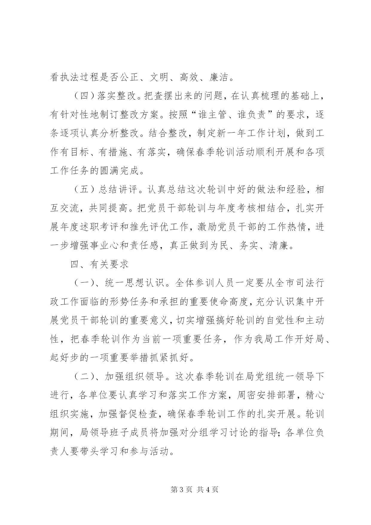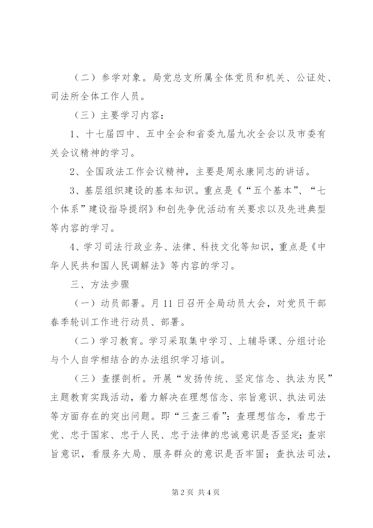 第PAGE\*Arabic\*MERGEFORMAT4页共NUMPAGES\*MERGEFORMAT4页司法局党干部春季轮训工作方案为了认真学习贯彻党的十七届四中、五中全会和省委九届九次全会及全国政法工作会议精神,切实做好年度全市司法行政工作,着力夯实党员干部队伍建设这一基础工程,不断提高广大党员干部思想政治素质,推动创先争优活动深入开展。根据枝组文82号文件通知要求,结合我局实际,现就全系统党员干部春季轮训工作制定如下方案:一、指导思想以学习贯彻党的十七届四中、五中全会和省委九届九次全会及市委有关会议精神为主题,以学习党的基层组织“五个基本”、“七个体系”建设有关要求、全国全省政法工作会议精神和创先争优活动典型案例等为重点,坚持学以致用、以用促学,着力提高广大党员干部思想政治素质和干事创业的能力;坚持突出实践特色,加强分类指导,着力提高培训质量,增强学习效果;坚持贴近工作实际,加强调查研究,着力解决当前司法行政工作和队伍建设中存在的突出问题。通过轮训,推动创先争优活动深入开展,进一步提高基层党建科学化水平和业务工作能力,努力创造和谐稳定的社会环境、公平正义的法治环境、优质高效的服务环境。二、轮训时间、参学对象及主要学习内容(一)轮训时间。集中学习时间为年月11日至15日。(二)参学对象。局党总支所属全体党员和机关、公证处、司法所全体工作人员。(三)主要学习内容:1、十七届四中、五中全会和省委九届九次全会以及市委有关会议精神的学习。2、全国政法工作会议精神,主要是周永康同志的讲话。3、基层组织建设的基本知识。重点是《“五个基本”、“七个体系”建设指导提纲》和创先争优活动有关要求以及先进典型等内容的学习。4、学习司法行政业务、法律、科技文化等知识,重点是《中华人民共和国人民调解法》等内容的学习。三、方法步骤(一)动员部署。月11日召开全局动员大会,对党员干部春季轮训工作进行动员、部署。(二)学习教育。学习采取集中学习、上辅导课、分组讨论与个人自学相结合的办法组织学习培训。(三)查摆剖析。开展“发扬传统、坚定信念、执法为民”主题教育实践活动,着力解决在理想信念、宗旨意识、执法司法等方面存在的突出问题。即“三查三看”:查理想信念,看忠于党、忠于国家、忠于人民、忠于法律的忠诚意识是否坚定;查宗旨意识,看服务大局、服务群众的意识是否牢固;查执法司法,看执法过程是否公正、文明、高效、廉洁。(四)落实整改。把查摆出来的问题,在认真梳理的基础上,有针对性地制订整改方案。按照“谁主管、谁负责”的要求,逐条逐项认真分析整改。结合整改,制定新一年工作计划,做到工作有目标、有措施、有落实,确保春季轮训活动顺利开展和各项工作任务的圆满完成。(五)总结讲评。认真总结这次轮训中好的做法和经验,相互交流,共同提高。把党员干部轮训与年度考核相结合,扎实开展年度述职考评和推先评优工作,激励党员干部的工作热情,进一步增强事业心和责任感,真正做到为民、务实、清廉。四、有关要求(一)、统一思想认识。全体参训人员一定要从全市司法行政工作面临的形势任务和承担的重要使命高度,充分认识集中开展党员干部轮训的重要意义,切实增强搞好轮训的自觉性和主动性,把春季轮训作为当前一项重要任务,作为我局工作开好局、起好步的一项重要举措抓紧抓好。(二)、加强组织领导。这次春季轮训在局党组统一领导下进行,各单位要认真学习和落实工作方案,周密安排部署,精心组织实施,加强督促检查,确保春季轮训工作的扎实开展。轮训期间,局领导班子成员将加强对分组学习讨论的指导;各单位负责人要带头学习和参与活动。(三)、注重方法效果。要做到集中学习和个人自学相结合,系统学习与交流讨论相结合,研读原文与专题辅导相结合。重点把握三个环节:一是教育环节,二是查找环节,三是整改环节。要坚持正面教育和自我教育,主动搞好自查自纠,积极开展批评和自我批评,广泛征求机关内部和基层的意见,征求工作服务对象和人民群众的意见。对查找出来的问题,要按照“谁主管、谁负责”的要求逐一整改,对严重违法违纪案件要严肃查处。(四)、严格轮训纪律。集中学习时无特殊情况一律不准请假,不得迟到早退,确保参学率100%。各单位、支部要有学习计划、考勤、笔记和讨论记录。每名党员干部必须学完规定篇目,学习笔记不得少于3000字,撰写体会文章两篇以上,其中一篇必须是自查整改报告。各单位、支部要将党员干部轮训情况及个人体会文章于2月15日前报局办公室。