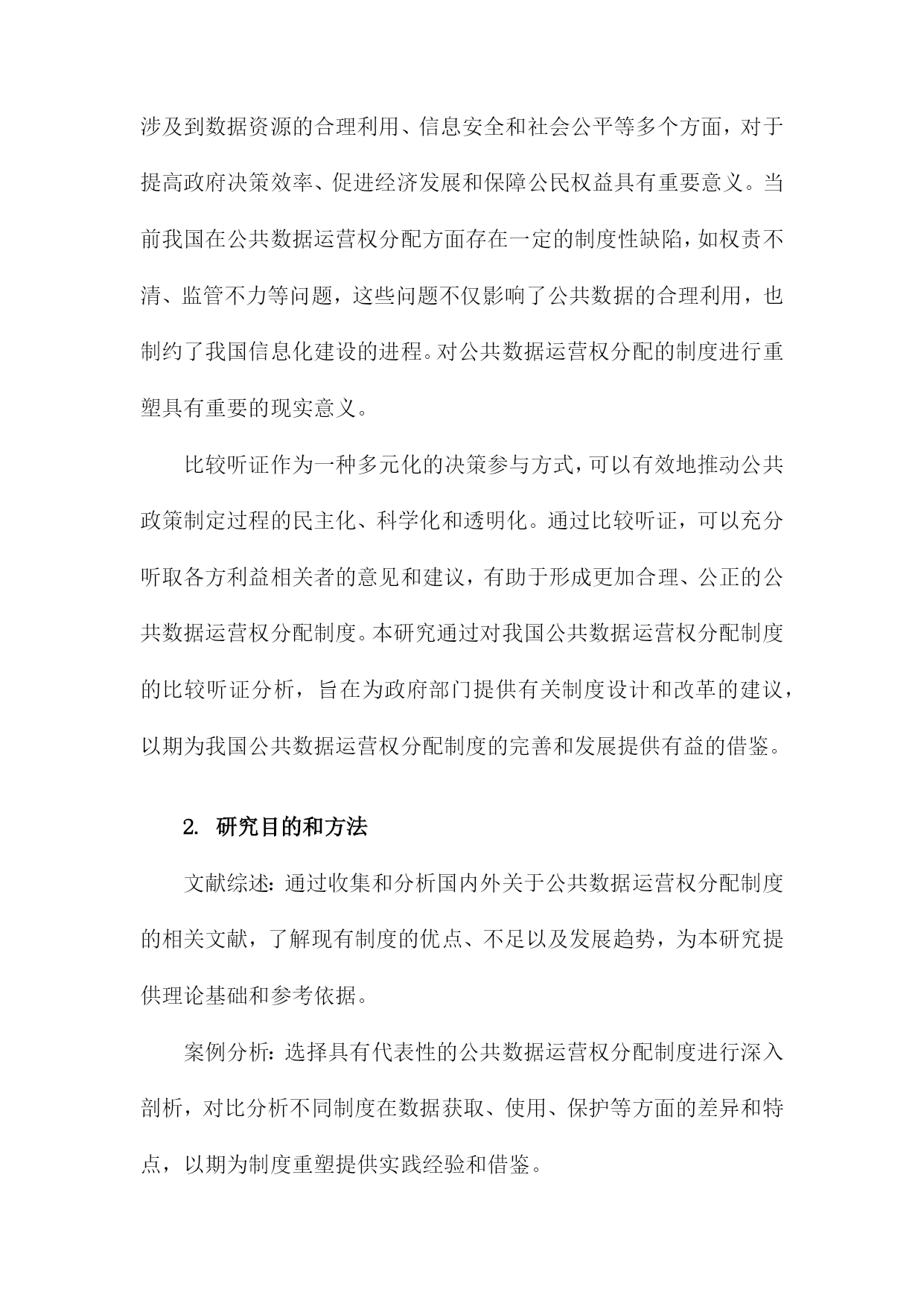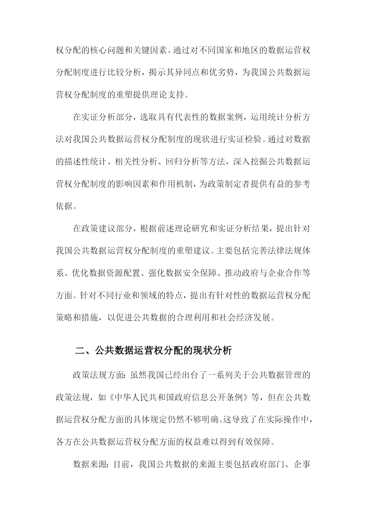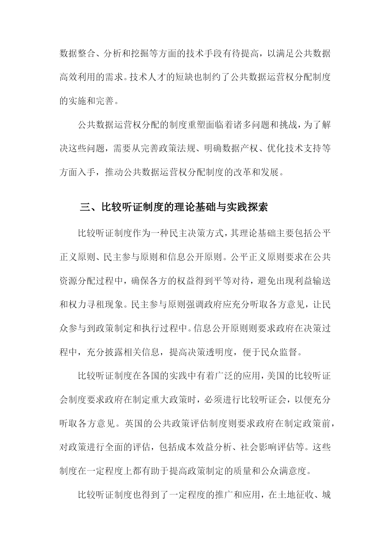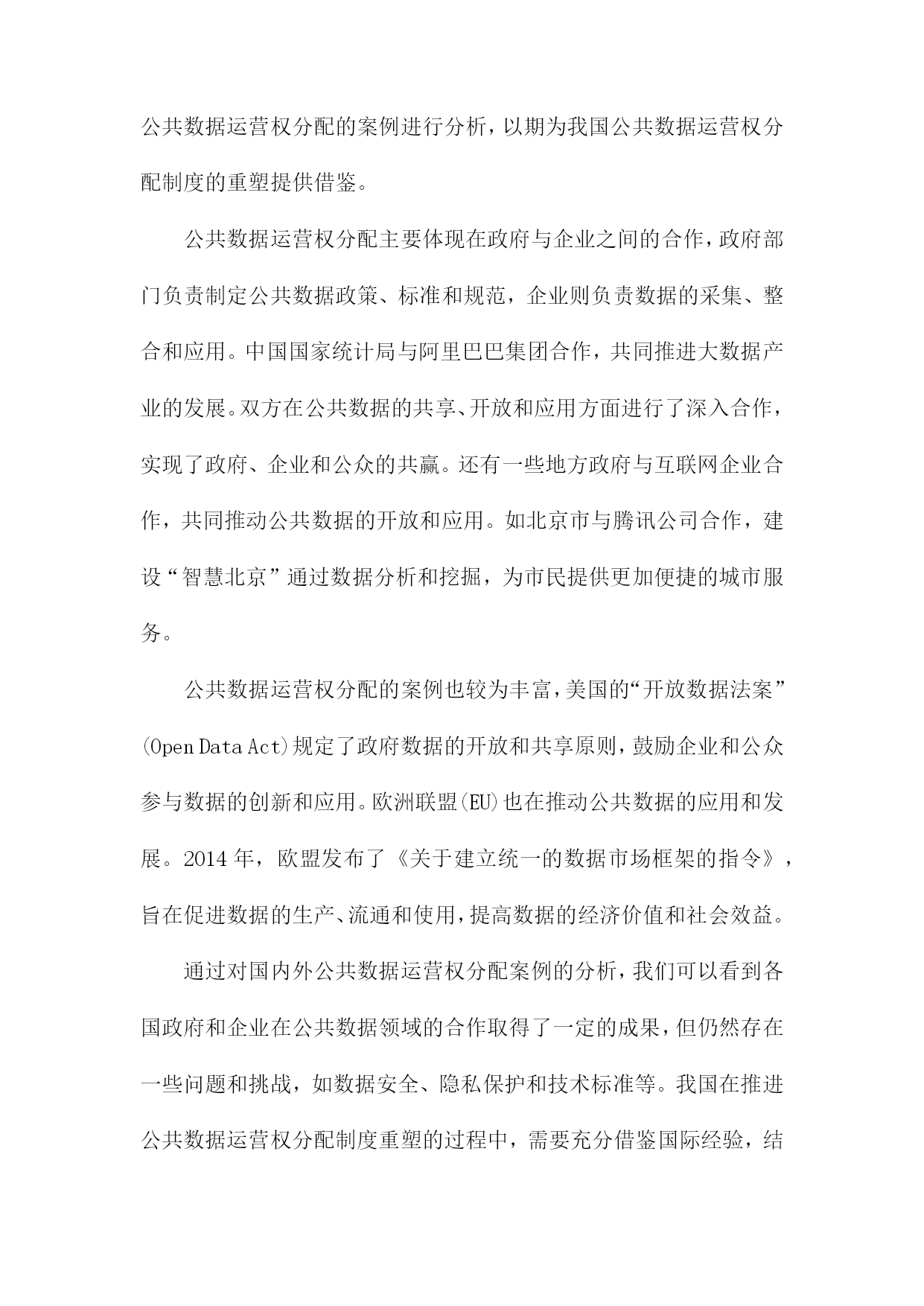比较听证:公共数据运营权分配的制度重塑一、简述随着信息技术的飞速发展和互联网的普及,公共数据已经成为了一种重要的社会资源。公共数据的运营权分配问题涉及到政府、企业和公众等多方利益,对于提高公共数据的利用效率和保障公共利益具有重要意义。当前我国在公共数据运营权分配方面存在一定的制度不完善和运行不规范的问题,这不仅影响了公共数据的合理利用,也可能导致公共利益受损。有必要对现行的公共数据运营权分配制度进行重塑,以实现公共数据的合理配置和有效利用。比较听证作为一种多元参与的决策机制,可以为公共数据运营权分配的制度重塑提供有益的借鉴。通过比较听证,可以充分听取各方的意见和建议,有助于形成更加科学、合理的公共数据运营权分配方案。本文档将通过对比分析不同国家和地区在公共数据运营权分配方面的立法、政策和实践经验,探讨如何在我国实施比较听证制度,以促进公共数据运营权分配制度的改革和完善。1.研究背景和意义随着信息技术的飞速发展和互联网的普及,公共数据已经成为了政府、企业和社会各界关注的重要资源。公共数据的运营权分配问题涉及到数据资源的合理利用、信息安全和社会公平等多个方面,对于提高政府决策效率、促进经济发展和保障公民权益具有重要意义。当前我国在公共数据运营权分配方面存在一定的制度性缺陷,如权责不清、监管不力等问题,这些问题不仅影响了公共数据的合理利用,也制约了我国信息化建设的进程。对公共数据运营权分配的制度进行重塑具有重要的现实意义。比较听证作为一种多元化的决策参与方式,可以有效地推动公共政策制定过程的民主化、科学化和透明化。通过比较听证,可以充分听取各方利益相关者的意见和建议,有助于形成更加合理、公正的公共数据运营权分配制度。本研究通过对我国公共数据运营权分配制度的比较听证分析,旨在为政府部门提供有关制度设计和改革的建议,以期为我国公共数据运营权分配制度的完善和发展提供有益的借鉴。2.研究目的和方法文献综述:通过收集和分析国内外关于公共数据运营权分配制度的相关文献,了解现有制度的优点、不足以及发展趋势,为本研究提供理论基础和参考依据。案例分析:选择具有代表性的公共数据运营权分配制度进行深入剖析,对比分析不同制度在数据获取、使用、保护等方面的差异和特点,以期为制度重塑提供实践经验和借鉴。专家访谈:邀请公共数据领域的专家学者参与讨论,就公共数据运营权分配制度的现状、问题及改进措施等方面提出建议和意见,为制度重塑提供专业指导。比较听证:组织多方面的参与者(包括政府部门、企业、社会组织等)就公共数据运营权分配制度进行公开、透明的听证会,充分听取各方意见和建议,为制度重塑提供民意基础。数据分析:对收集到的文献资料、案例数据和听证会记录进行整理和分析,揭示公共数据运营权分配制度的特点和问题,为制度重塑提供实证支持。3.论文结构安排在引言部分,首先介绍公共数据运营权分配问题的背景和意义,分析当前国内外关于公共数据运营权分配的研究现状和发展趋势。对本研究的目的、意义和研究方法进行阐述,明确本文的研究目标和研究框架。对全文进行梳理和总结,为后续章节的展开奠定基础。在文献综述部分,通过对国内外相关领域的研究成果进行梳理和总结,分析公共数据运营权分配的理论基础、实践经验和政策效果。对现有研究成果中存在的问题和不足进行指出,为本研究提供理论依据和借鉴经验。在理论框架部分,构建比较听证的理论模型,分析公共数据运营权分配的核心问题和关键因素。通过对不同国家和地区的数据运营权分配制度进行比较分析,揭示其异同点和优劣势,为我国公共数据运营权分配制度的重塑提供理论支持。在实证分析部分,选取具有代表性的数据案例,运用统计分析方法对我国公共数据运营权分配制度的现状进行实证检验。通过对数据的描述性统计、相关性分析、回归分析等方法,深入挖掘公共数据运营权分配制度的影响因素和作用机制,为政策制定者提供有益的参考依据。在政策建议部分,根据前述理论研究和实证分析结果,提出针对我国公共数据运营权分配制度的重塑建议。主要包括完善法律法规体系、优化数据资源配置、强化数据安全保障、推动政府与企业合作等方面。针对不同行业和领域的特点,提出有针对性的数据运营权分配策略和措施,以促进公共数据的合理利用和社会经济发展。二、公共数据运营权分配的现状分析政策法规方面:虽然我国已经出台了一系列关于公共数据管理的政策法规,如《中华人民共和国政府信息公开条例》等,但在公共数据运营权分配方面的具体规定仍然不够明确。这导致了在实际操作中,各方在公共数据运营权分配方面的权益难以得到有效保障。数据来源:目前,我国公共数据的来源主要包括政府部门、企事业单位、社会组织等。这些数据来源的多样性使得公共数据运营权分配的难度加大,同时也为公共数据的质量和安全性带来了一定的风险。数据利用:公