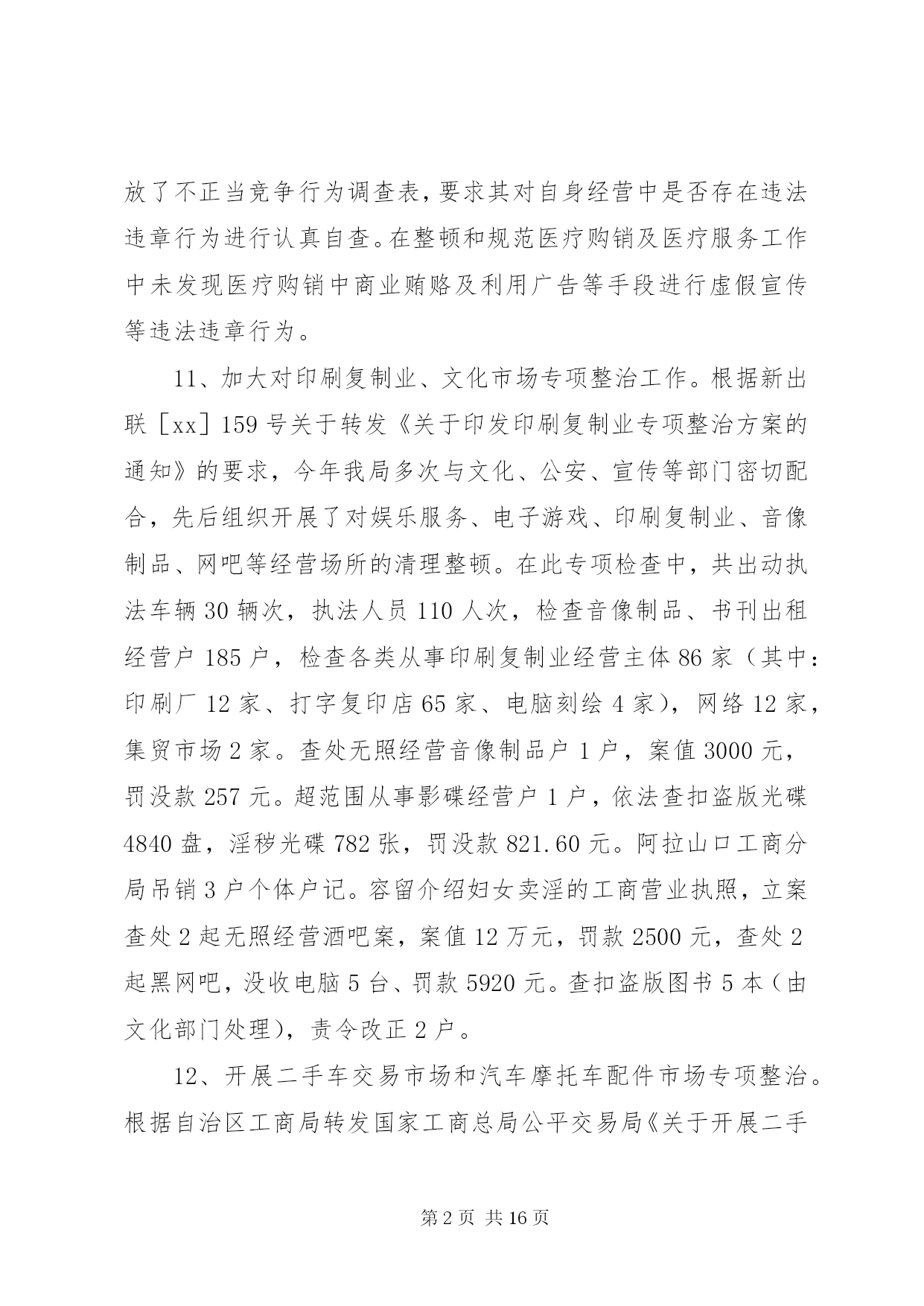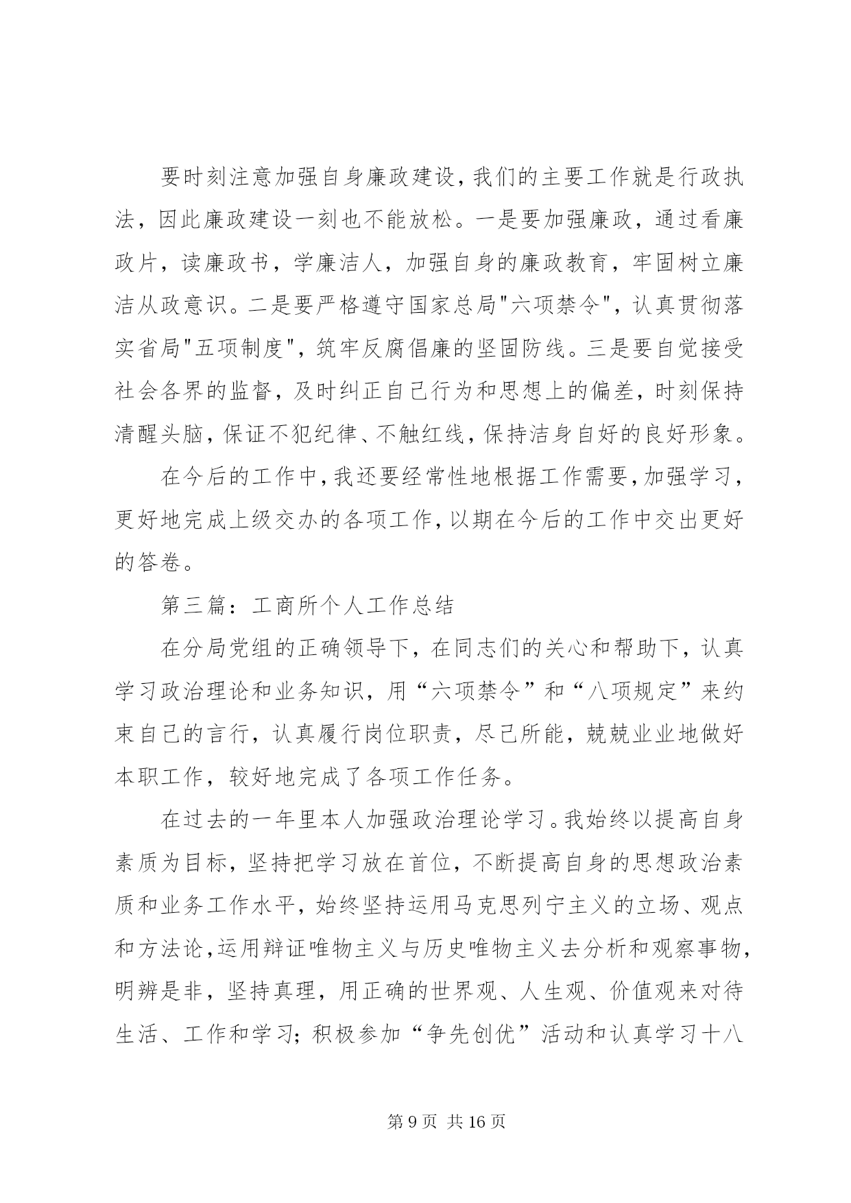 第PAGE\*Arabic\*MERGEFORMAT16页共NUMPAGES\*MERGEFORMAT16页工商所个人工作总结第一篇。4号《关于开展走私贩私综合治理调研工作的通知》精神,博州工商系统对全州从事经销进口商品企业和个人进行逐一检查,认真核查经营单位的经营主体资格,特别是对大型商场内从事经销进口商品(照相机)经营户进行登记造册,同时对手机市场进行了专门的清理检查。此次专项整治共出板报3期,张贴标语30条,散发宣传材料300余份,利用3期个私协例会宣传教育会员210余人。出动执法人员261人次,出动车辆88辆次,检查各类企业和个体工商户739户,查处无合法进口手续照相机案件1起,没收走私照相机13部。价值350元,没收无合法进口手续刀片26盒价值28.6元,通过此次检查进一步提高了全民对反走私贩私意识,规范了经营者的经营行为。10、开展整治医疗购销及医疗服务不正之风专项检查为认真贯彻落实自治区工商公字[xx]第64号《关于进一步做好纠正医疗购销及医疗服务中不正之风专项治理工作有关问题的通知》的通知精神,博州工商局结合我州实际情况,对全州医疗购销及医疗服务工作进行了专项检查,此次专项检查出动检查人员98人次,出动检查车次数29辆次,共检查药品经营单位110家,其中:检查各类药品经营户56户,医院14家,对1户美容院使用绝对化用语发布美容广告行为给予限期改正违章行为及当场拆出广告处理,XX县区工商局对2家重点医疗单位发放了不正当竞争行为调查表,要求其对自身经营中是否存在违法违章行为进行认真自查。在整顿和规范医疗购销及医疗服务工作中未发现医疗购销中商业贿赂及利用广告等手段进行虚假宣传等违法违章行为。11、加大对印刷复制业、文化市场专项整治工作。根据新出联[xx]159号关于转发《关于印发印刷复制业专项整治方案的通知》的要求,今年我局多次与文化、公安、宣传等部门密切配合,先后组织开展了对娱乐服务、电子游戏、印刷复制业、音像制品、网吧等经营场所的清理整顿。在此专项检查中,共出动执法车辆30辆次,执法人员110人次,检查音像制品、书刊出租经营户185户,检查各类从事印刷复制业经营主体86家(其中:印刷厂12家、打字复印店65家、电脑刻绘4家),网络12家,集贸市场2家。查处无照经营音像制品户1户,案值3000元,罚没款257元。超范围从事影碟经营户1户,依法查扣盗版光碟4840盘,淫秽光碟782张,罚没款821.60元。阿拉山口工商分局吊销3户个体户记。容留介绍妇女卖淫的工商营业执照,立案查处2起无照经营酒吧案,案值12万元,罚款2500元,查处2起黑网吧,没收电脑5台、罚款5920元。查扣盗版图书5本(由文化部门处理),责令改正2户。12、开展二手车交易市场和汽车摩托车配件市场专项整治。根据自治区工商局转发国家工商总局公平交易局《关于开展二手车交易市场和汽车摩托车配件市场专项整治工作的通知》的通知(新工商〔xx〕58号)精神,结合我州实际,积极行动,认真部署,全面开展工作,此次专项整治工作,文秘114版权所有共出动检查人员83人次,出动执法车辆24辆次,检查二手车交易市场2家,旧机动车鉴定评估中介机构3家;汽车(摩托车)零配件经营户94户。对5户超范围(无照)从事汽车(摩托车)零配件经营户发放了《预警警示通知书》。博州工商局经检大队根据线索,在XX县区健康路北二区查处一销售假冒摩托车经窝点。暂扣其库房内放置的大量散装摩托车整车零部件(发动机、后压包、钢圈等零部件)248件,双庆摩托车合格证18份,空白摩托车合格证6份,价值5万余元。没收假冒双庆摩托车6辆,罚没款15350元。xx年7月26日,XX县区工商局查处一起超范围经营摩托车案件,案值22650元,罚没款6084.6元。13、认真做好液化气市场专项整治工作。为强化我州液化气市场监督管理,根据州政府的统一安排和《自治州液化气市场管理协调领导小组会议纪要》精神,制定下发了博州工商[xx]125号《关于加强对液化气市场监管工作的通知》,在全州范围开展了加强对液化气市场监管工作专项整治工作。一是检查液化气经营企业证照是否齐全,是否有效,是否有超范围经营的行为;二是各基层所定期或不定期检查每月不少于4次。每周派专人到燃气储备、经营企业蹲点值班,会同质量技术监督局对企业液化气瓶充装环节的倒残、检量和运出严格把关,并建立详细的液化气进出场登记台帐和库存台帐,杜绝缺斤少两的液化气气瓶流入市场。三是杜绝流通领域液化气的缺斤少两问题。各县市局采取多种措施加强对液化气的缺斤少两和防盗瓶塞使用问题的管理。XX县区工商局要求液化气经营企业与送气车辆签订责任书。XX县区工商局专门设计制作了100份《XX县区工商局液化气质量监测表》,对瓶装液化气从来源到保管、销售、服务、用户情