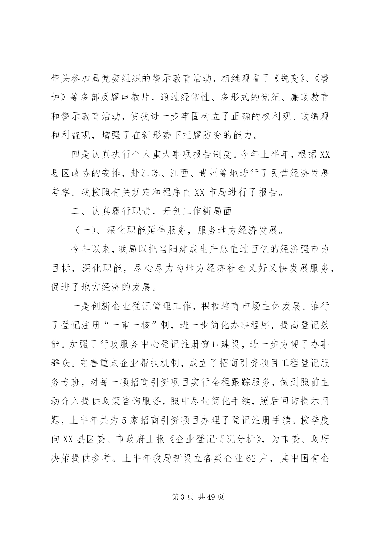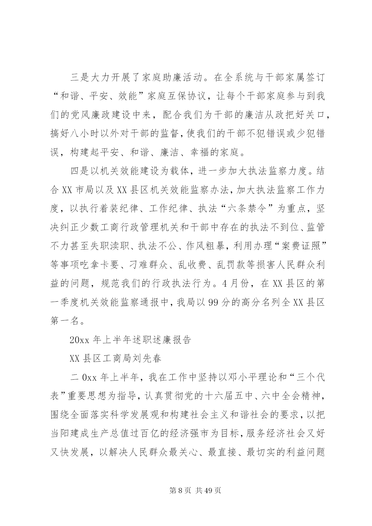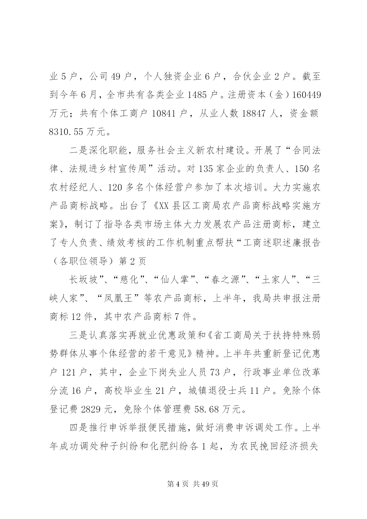 第PAGE\*Arabic\*MERGEFORMAT49页共NUMPAGES\*MERGEFORMAT49页工商述职述廉报告(各职位领导)工商述职述廉报告(各职位领导)文章标题:20xx年工商述职述廉报告(各职位领导)20xx年上半年,我在XX市工商局和XX县区委、市政府的领导下,以邓小平理论和“三个代表”重要思想为指导,认真贯彻党的十六届五中、六中全会精神,围绕全面落实科学发展观和构建社会主义和谐社会的要求,在工作的指导思想上树立“四个理念”,在服务经济发展上做到“四个坚持”,在创和谐监管环境上推出“四情工作法”,全面开展“亲民工商”建设,各项工作取得了新成效,现将半年来的本人思想、工作及党风廉政建设情况报告如下:一、认真学习和落实徐局长在全市工商行政管理工作暨县市区局领导班子作风建设培训会议上的讲话精神,切实加强领导干部作风建设一是坚持勤奋学习,努力提高自身的工作水平和能力。学习是领导干部增长才干、提高素质的重要途径,是做好各项工作的重要基础。因此,我认真落实党委中心学习小组制度,除参加每周四的机关学习外,还专门每个月抽出一天时间组织班子成员进行集中学习。通过学习,不断丰富了新形势下做好领导工作的知识,进一步提高领导水平和领导能力。与此同时,我还深入实际、深入群众、深入基层开展调查研究,寻求好的措施、好的良策,促进工作的全面落实。今年上半年,我结合徐局长在全市工商行政管理工作暨县市区局领导班子作风建设培训会议上的讲话精神,认真调查走访了7个基层分局和部分人大代表、政协委员,在全系统全面推行了“四情工作法”,进一步改进工作作风,树立了良好的“亲民工商”形象,受到了广大人民群众的欢迎。二是按照XX市局的要求开好专题民主生活会,认真查找和纠正领导干部作风方面存在的突出问题。我们以严肃认真的态度做好会前准备,在春训期间,我们就以实事求是的态度向基层征求意见和建议,共收集意见和建议126条,经过归纳整理共涉及5个方面。在专题民主生活会上,我们班子成员针对这些意见和建议认真对照检查、开展批评与自我批评,以求真务实的精神制定整改方案、落实整改措施,确保领导干部作风建设取得实效。针对这些意见和建议,今年3月份,我代表局党委就加强干部作风建设向社会作出了“八项承诺”。三是自觉接受廉政和警示教育,构筑思想防线,增强拒腐防变能力。坚持把廉政教育和理论学习有机结合起来,先后重点学习了《江泽民同志论党风廉政建设和反腐败斗争》、胡锦涛同志“七一”讲话和中纪委三次全会上的讲话,《中国共产党党员领导干部廉洁从政准则(试行)》、《中国共产党党内监督条例(试行)》、《中国共产党纪律处分条例》及中纪委三次全会提出的“四大纪律、八项要求”、市局制定的《“一把手”考核监督办法》。带头参加局党委组织的警示教育活动,相继观看了《蜕变》、《警钟》等多部反腐电教片,通过经常性、多形式的党纪、廉政教育和警示教育活动,使我进一步牢固树立了正确的权利观、政绩观和利益观,增强了在新形势下拒腐防变的能力。四是认真执行个人重大事项报告制度。今年上半年,根据XX县区政协的安排,赴江苏、江西、贵州等地进行了民营经济发展考察。我按照有关规定和程序向XX市局进行了报告。二、认真履行职责,开创工作新局面(一)、深化职能延伸服务,服务地方经济发展。今年以来,我局以把当阳建成生产总值过百亿的经济强市为目标,深化职能,尽心尽力为地方经济社会又好又快发展服务,促进了地方经济的发展。一是创新企业登记管理工作,积极培育市场主体发展。推行了登记注册“一审一核”制,进一步简化办事程序,提高登记效能。加强了行政服务中心登记注册窗口建设,进一步方便了办事群众。完善重点企业帮扶机制,成立了招商引资项目工程登记服务专班,对每一项招商引资项目实行全程跟踪服务,做到照前主动介入提供政策咨询服务,照中尽量简化手续,照后回访提示问题,上半年共为5家招商引资项目办理了登记注册手续。按季度向XX县区委、市政府上报《企业登记情况分析》,为市委、政府决策提供参考。上半年我局新设立各类企业62户,其中国有企业5户,公司49户,个人独资企业6户,合伙企业2户。截至到今年6月,全市共有各类企业1485户。注册资本(金)160449万元;共有个体工商户10841户,从业人数18847人,资金额8310.55万元。二是深化职能,服务社会主义新农村建设。开展了“合同法律、法规进乡村宣传周”活动。对135家企业的负责人、150名农村经纪人、120多名个体经营户参加了本次培训。大力实施农产品商标战略。出台了《XX县区工商局农产品商标战略实施方案》,制订了指导各类市场主体大力发展农产品注册商标,建立了专人负责、绩效考核的工作机制重点帮扶“工商述职述廉报告(各职位领导)长坂坡”、“慈化”、“仙人掌”、“春之源”、“土家人”、“
