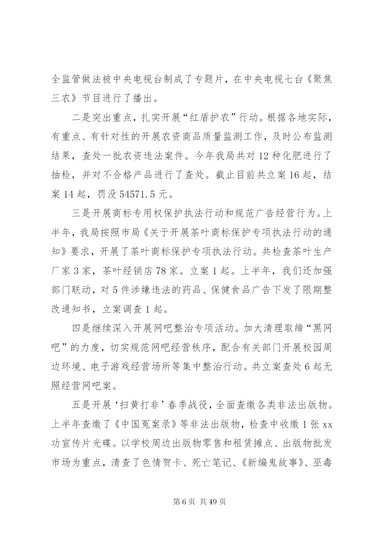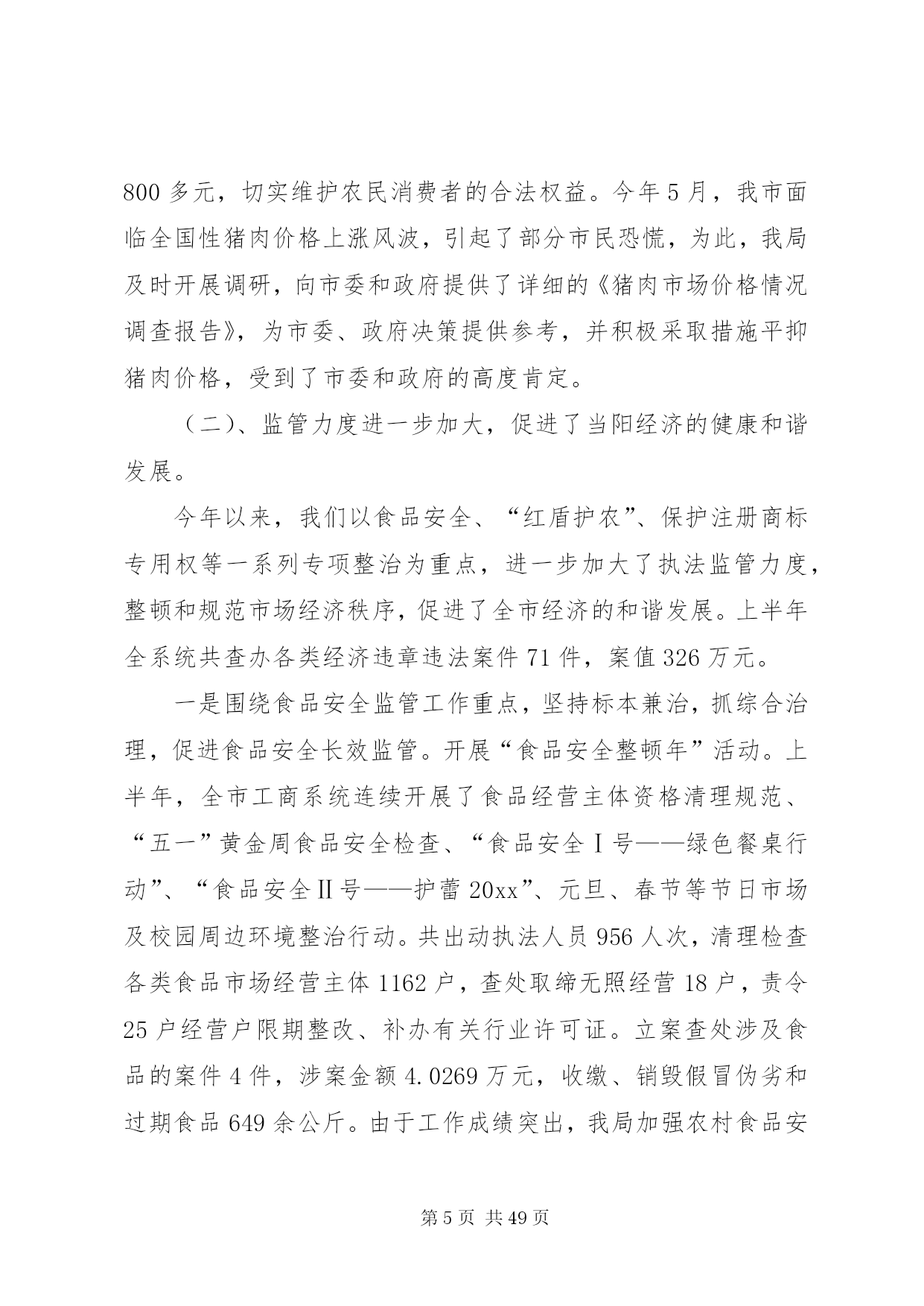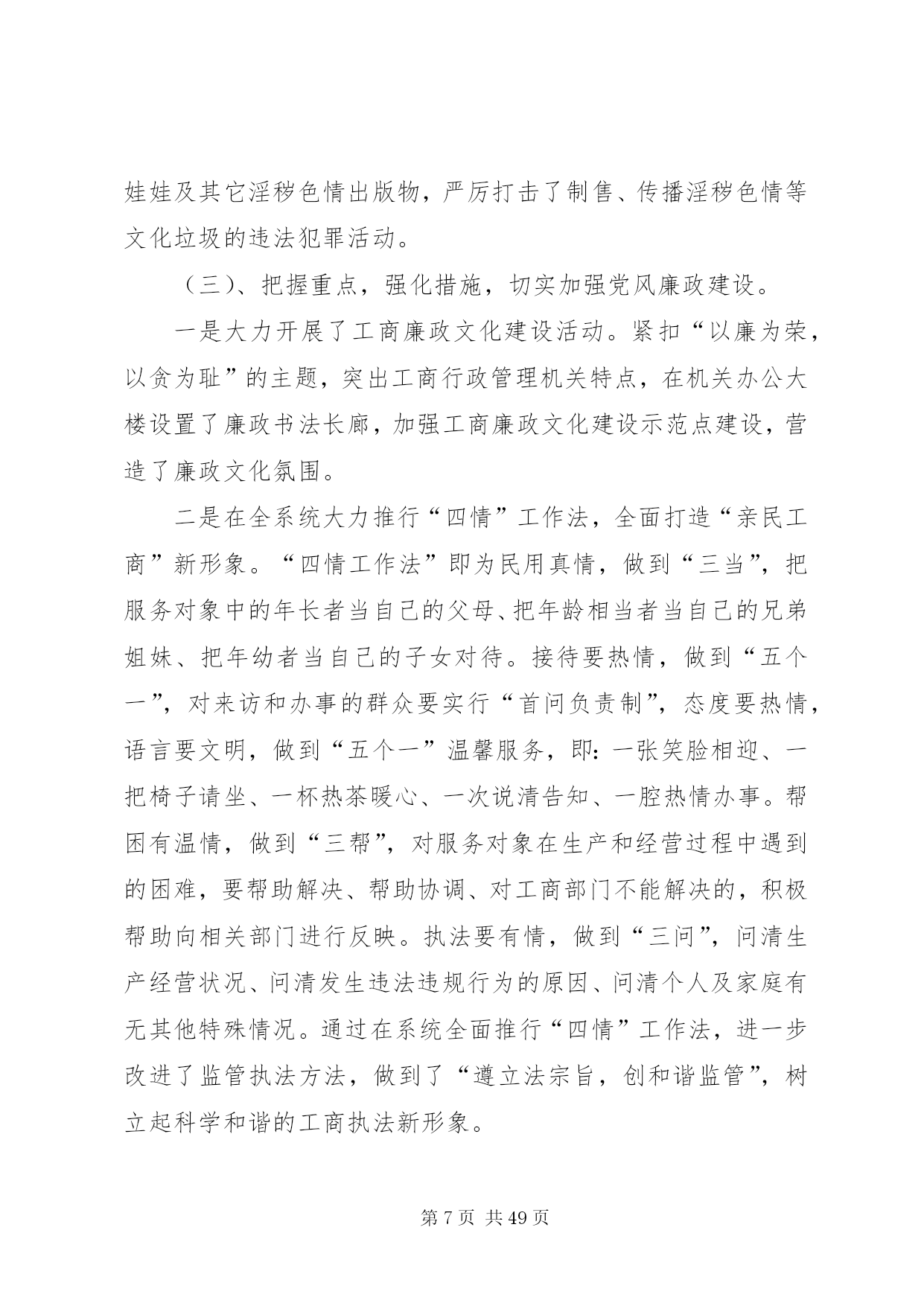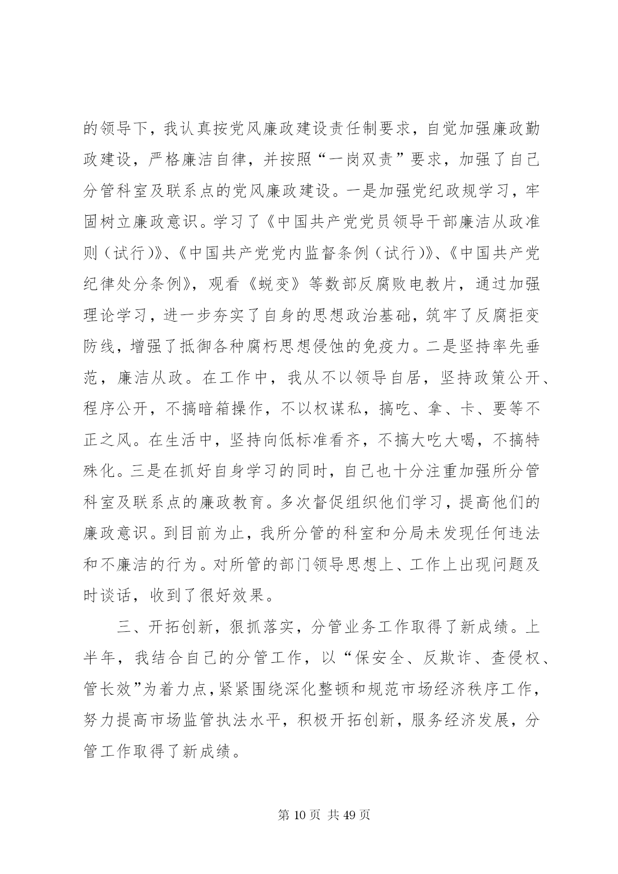 第PAGE\*Arabic\*MERGEFORMAT49页共NUMPAGES\*MERGEFORMAT49页工商述职述廉报告(各职位领导)工商述职述廉报告(各职位领导)文章标题:20xx年工商述职述廉报告(各职位领导)20xx年上半年,我在XX市工商局和XX县区委、市政府的领导下,以邓小平理论和“三个代表”重要思想为指导,认真贯彻党的十六届五中、六中全会精神,围绕全面落实科学发展观和构建社会主义和谐社会的要求,在工作的指导思想上树立“四个理念”,在服务经济发展上做到“四个坚持”,在创和谐监管环境上推出“四情工作法”,全面开展“亲民工商”建设,各项工作取得了新成效,现将半年来的本人思想、工作及党风廉政建设情况报告如下:一、认真学习和落实徐局长在全市工商行政管理工作暨县市区局领导班子作风建设培训会议上的讲话精神,切实加强领导干部作风建设一是坚持勤奋学习,努力提高自身的工作水平和能力。学习是领导干部增长才干、提高素质的重要途径,是做好各项工作的重要基础。因此,我认真落实党委中心学习小组制度,除参加每周四的机关学习外,还专门每个月抽出一天时间组织班子成员进行集中学习。通过学习,不断丰富了新形势下做好领导工作的知识,进一步提高领导水平和领导能力。与此同时,我还深入实际、深入群众、深入基层开展调查研究,寻求好的措施、好的良策,促进工作的全面落实。今年上半年,我结合徐局长在全市工商行政管理工作暨县市区局领导班子作风建设培训会议上的讲话精神,认真调查走访了7个基层分局和部分人大代表、政协委员,在全系统全面推行了“四情工作法”,进一步改进工作作风,树立了良好的“亲民工商”形象,受到了广大人民群众的欢迎。二是按照XX市局的要求开好专题民主生活会,认真查找和纠正领导干部作风方面存在的突出问题。我们以严肃认真的态度做好会前准备,在春训期间,我们就以实事求是的态度向基层征求意见和建议,共收集意见和建议126条,经过归纳整理共涉及5个方面。在专题民主生活会上,我们班子成员针对这些意见和建议认真对照检查、开展批评与自我批评,以求真务实的精神制定整改方案、落实整改措施,确保领导干部作风建设取得实效。针对这些意见和建议,今年3月份,我代表局党委就加强干部作风建设向社会作出了“八项承诺”。三是自觉接受廉政和警示教育,构筑思想防线,增强拒腐防变能力。坚持把廉政教育和理论学习有机结合起来,先后重点学习了《江泽民同志论党风廉政建设和反腐败斗争》、胡锦涛同志“七一”讲话和中纪委三次全会上的讲话,《中国共产党党员领导干部廉洁从政准则(试行)》、《中国共产党党内监督条例(试行)》、《中国共产党纪律处分条例》及中纪委三次全会提出的“四大纪律、八项要求”、市局制定的《“一把手”考核监督办法》。带头参加局党委组织的警示教育活动,相继观看了《蜕变》、《警钟》等多部反腐电教片,通过经常性、多形式的党纪、廉政教育和警示教育活动,使我进一步牢固树立了正确的权利观、政绩观和利益观,增强了在新形势下拒腐防变的能力。四是认真执行个人重大事项报告制度。今年上半年,根据XX县区政协的安排,赴江苏、江西、贵州等地进行了民营经济发展考察。我按照有关规定和程序向XX市局进行了报告。二、认真履行职责,开创工作新局面(一)、深化职能延伸服务,服务地方经济发展。今年以来,我局以把当阳建成生产总值过百亿的经济强市为目标,深化职能,尽心尽力为地方经济社会又好又快发展服务,促进了地方经济的发展。一是创新企业登记管理工作,积极培育市场主体发展。推行了登记注册“一审一核”制,进一步简化办事程序,提高登记效能。加强了行政服务中心登记注册窗口建设,进一步方便了办事群众。完善重点企业帮扶机制,成立了招商引资项目工程登记服务专班,对每一项招商引资项目实行全程跟踪服务,做到照前主动介入提供政策咨询服务,照中尽量简化手续,照后回访提示问题,上半年共为5家招商引资项目办理了登记注册手续。按季度向XX县区委、市政府上报《企业登记情况分析》,为市委、政府决策提供参考。上半年我局新设立各类企业62户,其中国有企业5户,公司49户,个人独资企业6户,合伙企业2户。截至到今年6月,全市共有各类企业1485户。注册资本(金)160449万元;共有个体工商户10841户,从业人数18847人,资金额8310.55万元。二是深化职能,服务社会主义新农村建设。开展了“合同法律、法规进乡村宣传周”活动。对135家企业的负责人、150名农村经纪人、120多名个体经营户参加了本次培训。大力实施农产品商标战略。出台了《XX县区工商局农产品商标战略实施方案》,制订了指导各类市场主体大力发展农产品注册商标,建立了专人负责、绩效考核的工作机制重点帮扶“工商述职述廉报告(各职位领导)长坂坡”、“慈化”、“仙人掌”、“春之源”、“土家人”、“