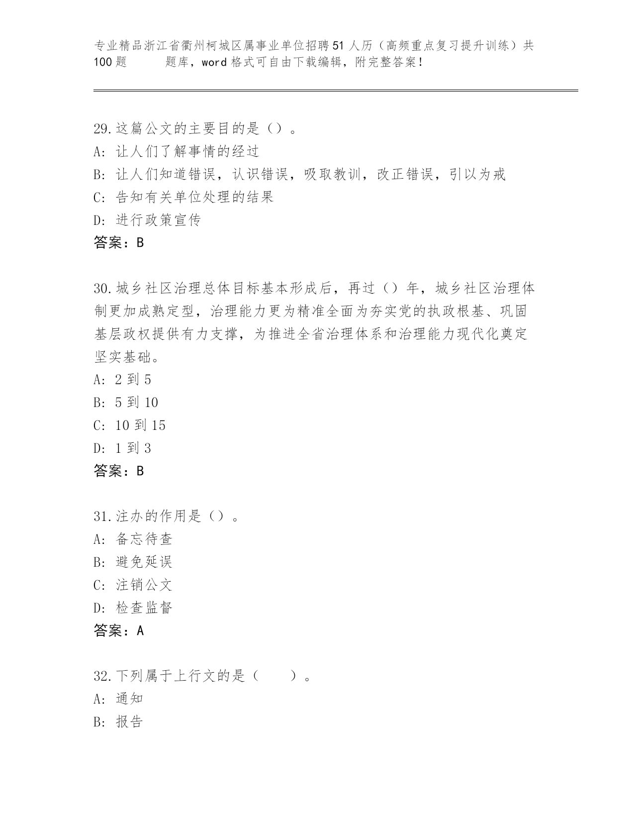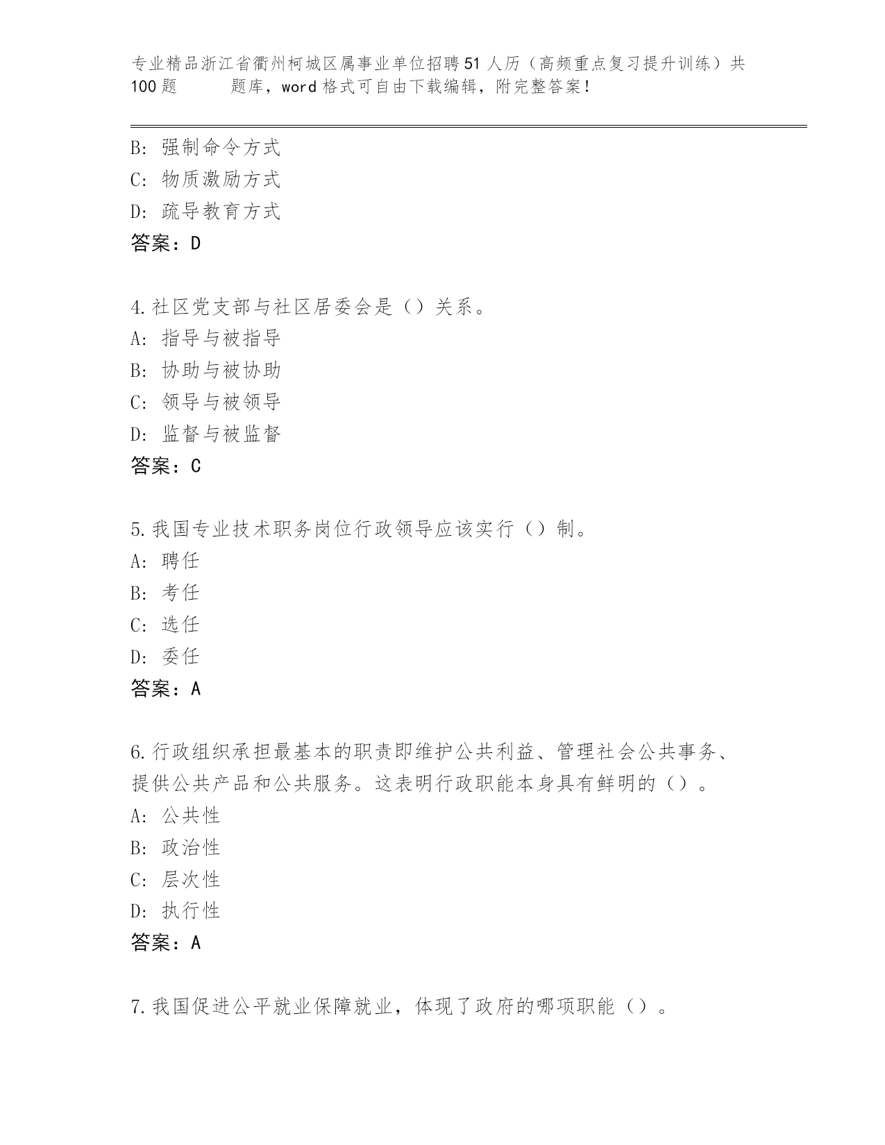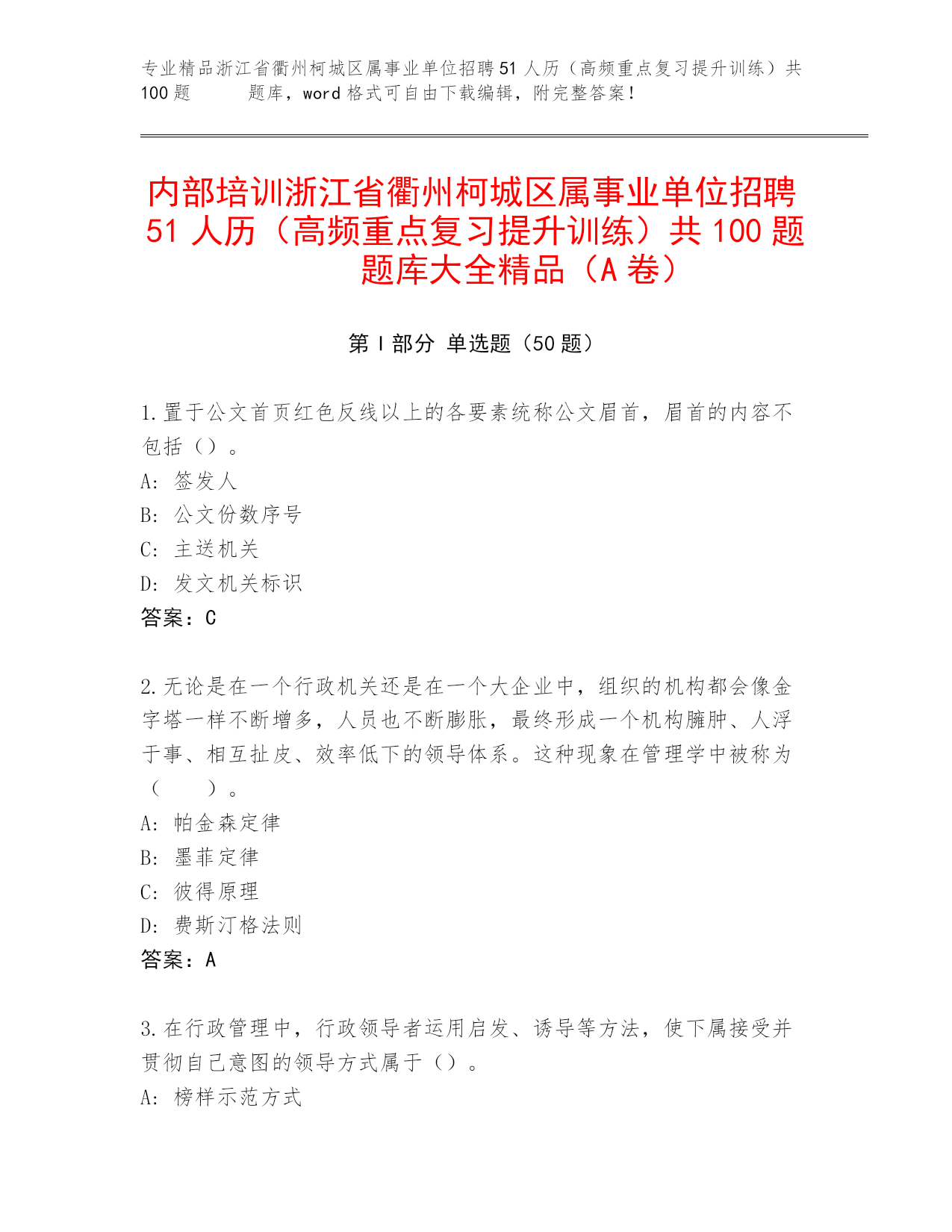 内部培训浙江省衢州柯城区属事业单位招聘51人历(高频重点复习提升训练)共100题 题库大全精品(A卷)