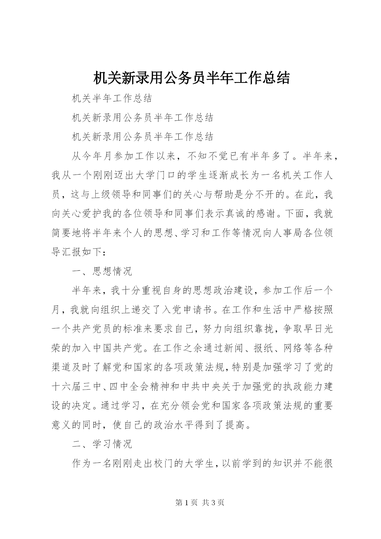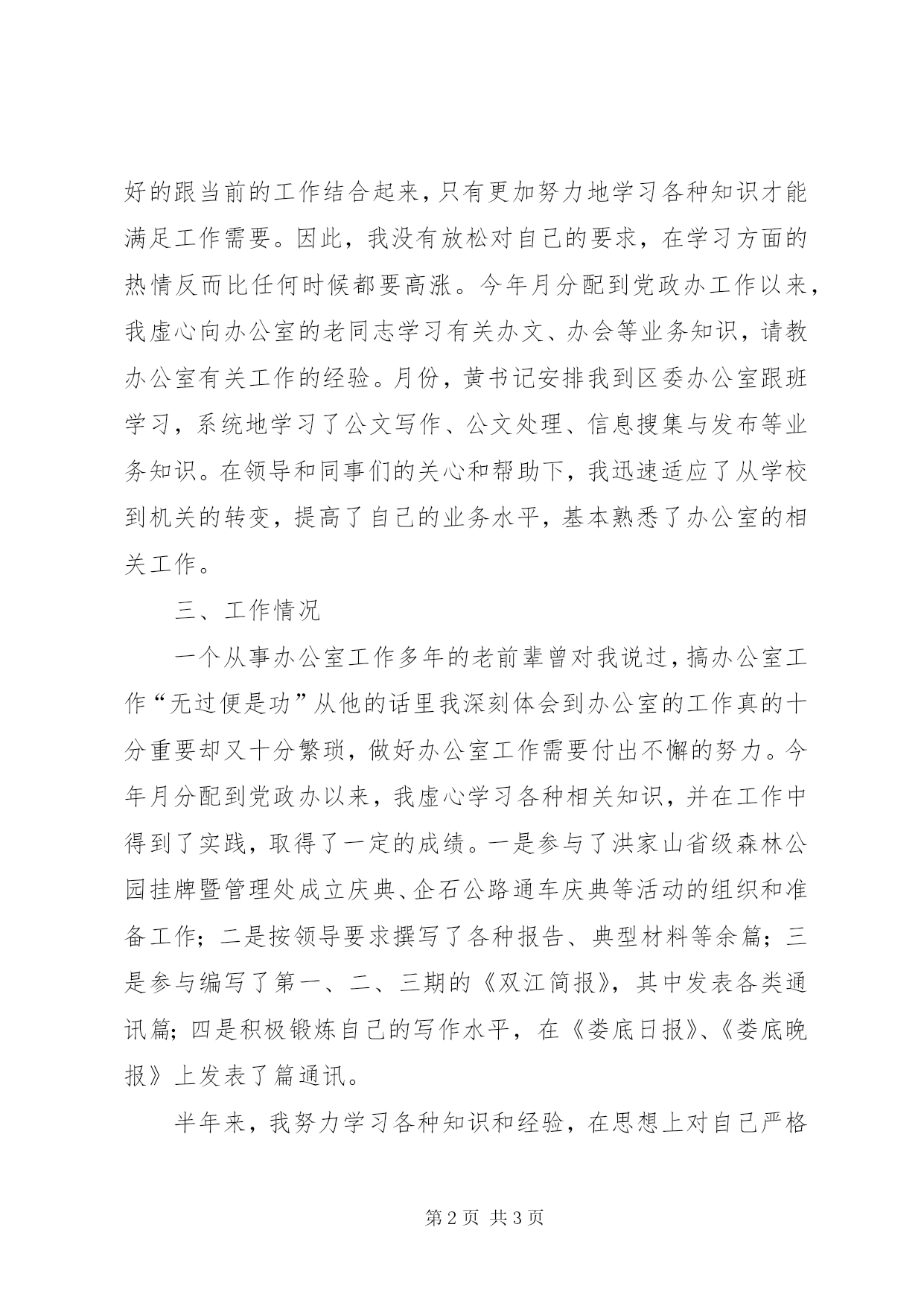 第PAGE\*Arabic\*MERGEFORMAT3页共NUMPAGES\*MERGEFORMAT3页机关新录用公务员半年工作总结机关半年工作总结机关新录用公务员半年工作总结机关新录用公务员半年工作总结从今年月参加工作以来,不知不觉已有半年多了。半年来,我从一个刚刚迈出大学门口的学生逐渐成长为一名机关工作人员,这与上级领导和同事们的关心与帮助是分不开的。在此,我向关心爱护我的各位领导和同事们表示真诚的感谢。下面,我就简要地将半年来个人的思想、学习和工作等情况向人事局各位领导汇报如下:一、思想情况半年来,我十分重视自身的思想政治建设,参加工作后一个月,我就向组织上递交了入党申请书。在工作和生活中严格按照一个共产党员的标准来要求自己,努力向组织靠拢,争取早日光荣的加入中国共产党。在工作之余通过新闻、报纸、网络等各种渠道及时了解党和国家的各项政策法规,特别是加强学习了党的十六届三中、四中全会精神和中共中央关于加强党的执政能力建设的决定。通过学习,在充分领会党和国家各项政策法规的重要意义的同时,使自己的政治水平得到了提高。二、学习情况作为一名刚刚走出校门的大学生,以前学到的知识并不能很好的跟当前的工作结合起来,只有更加努力地学习各种知识才能满足工作需要。因此,我没有放松对自己的要求,在学习方面的热情反而比任何时候都要高涨。今年月分配到党政办工作以来,我虚心向办公室的老同志学习有关办文、办会等业务知识,请教办公室有关工作的经验。月份,黄书记安排我到区委办公室跟班学习,系统地学习了公文写作、公文处理、信息搜集与发布等业务知识。在领导和同事们的关心和帮助下,我迅速适应了从学校到机关的转变,提高了自己的业务水平,基本熟悉了办公室的相关工作。三、工作情况一个从事办公室工作多年的老前辈曾对我说过,搞办公室工作“无过便是功”从他的话里我深刻体会到办公室的工作真的十分重要却又十分繁琐,做好办公室工作需要付出不懈的努力。今年月分配到党政办以来,我虚心学习各种相关知识,并在工作中得到了实践,取得了一定的成绩。一是参与了洪家山省级森林公园挂牌暨管理处成立庆典、企石公路通车庆典等活动的组织和准备工作;二是按领导要求撰写了各种报告、典型材料等余篇;三是参与编写了第一、二、三期的《双江简报》,其中发表各类通讯篇;四是积极锻炼自己的写作水平,在《娄底日报》、《娄底晚报》上发表了篇通讯。半年来,我努力学习各种知识和经验,在思想上对自己严格要求,在工作中积极肯干,取得了一定的成绩,得到了领导和同事们的充分肯定。同时,我也清醒的认识到自己还存在不少的缺点和不足,离一个优秀的办公室工作者还有很大的距离。在以后的工作、学习和生活中,我一定会更加发奋努力,让自己在基层得到更多的锻炼。