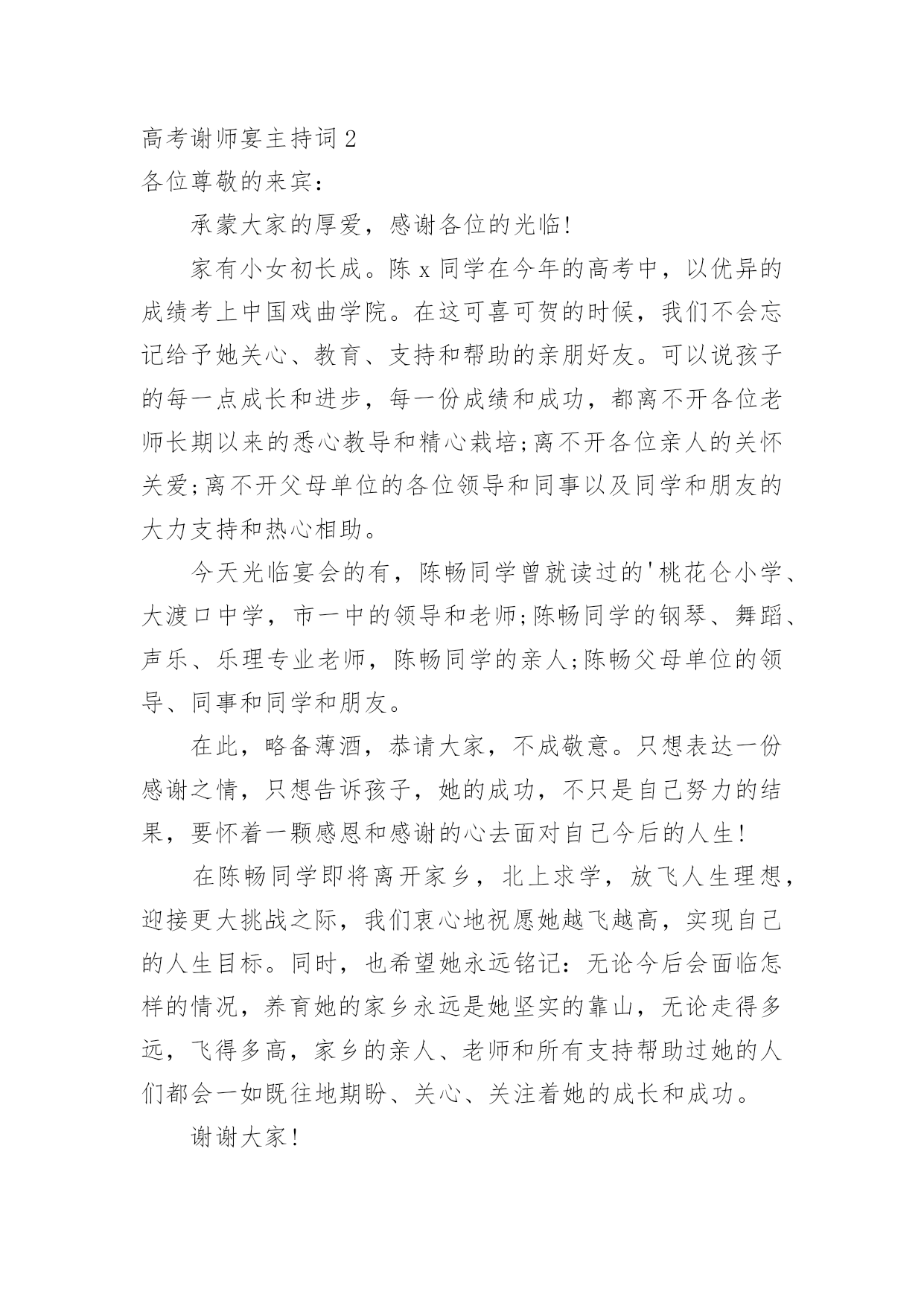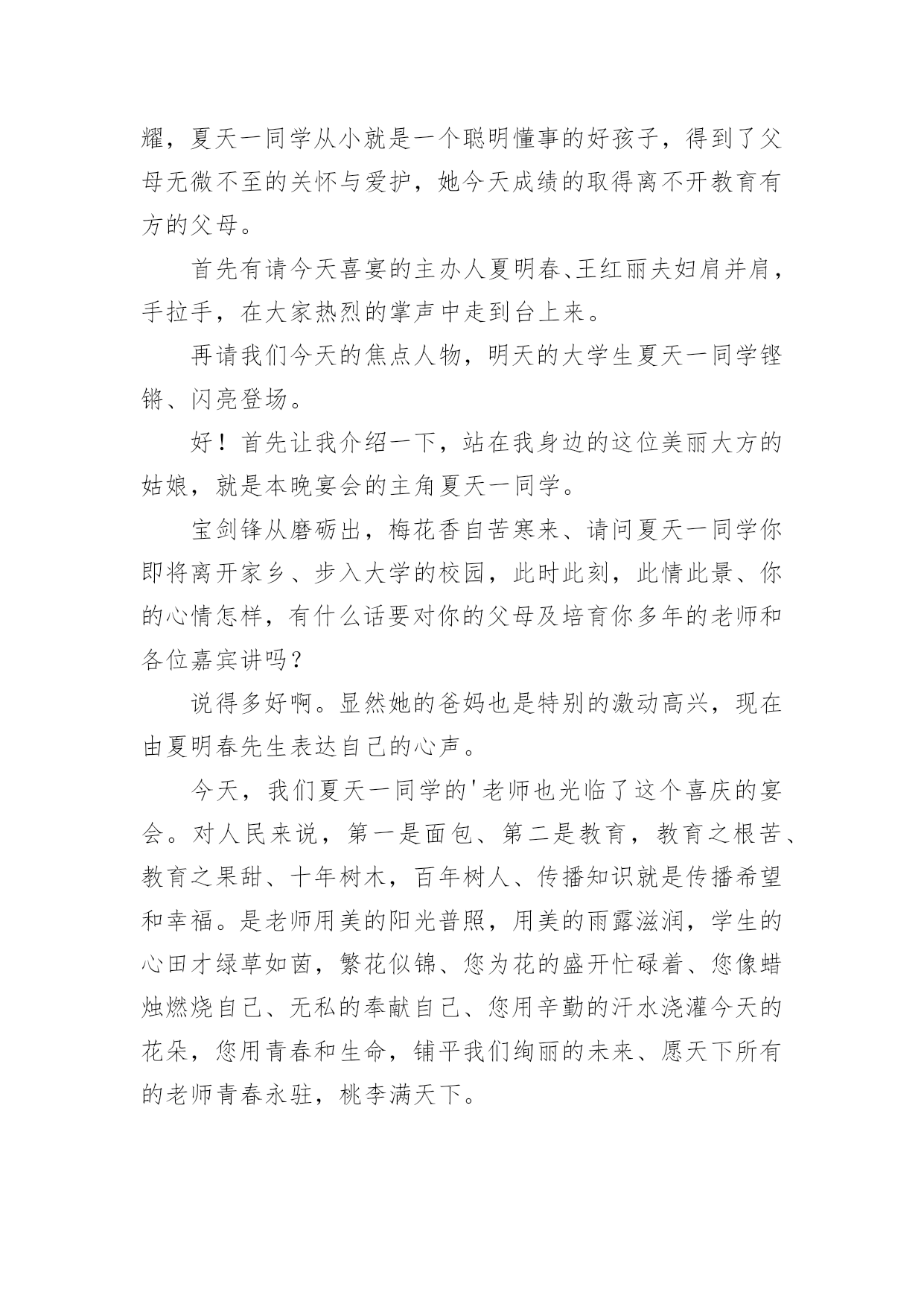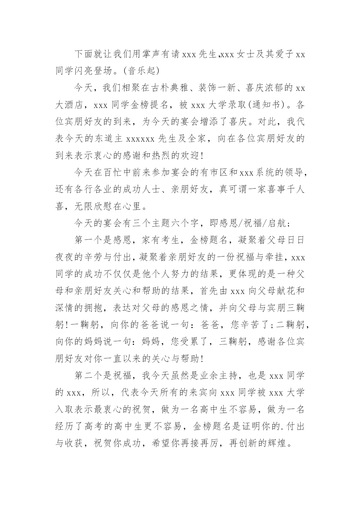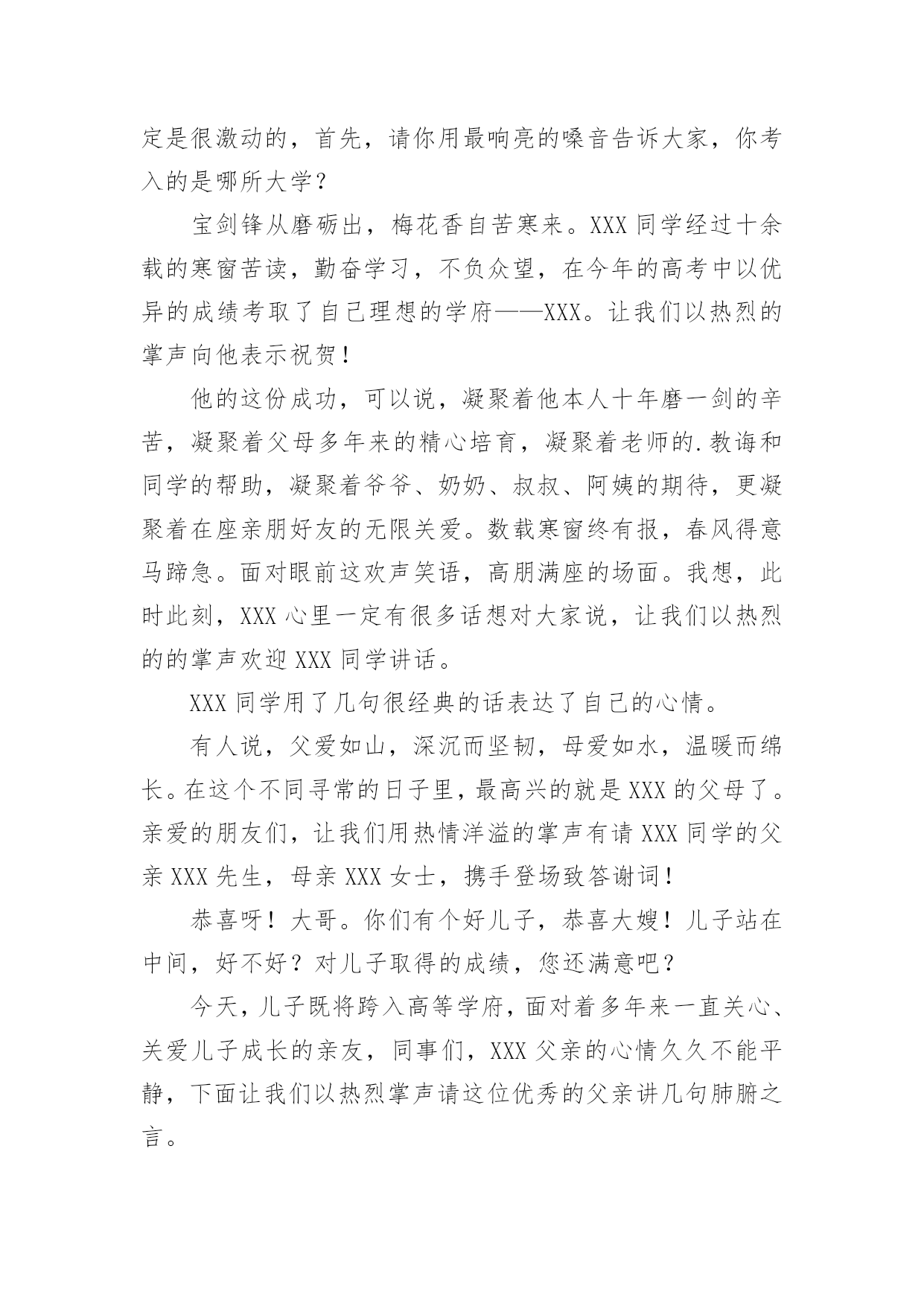 高考谢师宴主持词主持词的写作需要将主题贯穿于所有节目之中。在当今不断发展的世界,我们对主持词已经不再陌生,好的主持词是什么样的呢?下面是小编整理的高考谢师宴主持词,希望对大家有所帮助。高考谢师宴主持词1尊敬的各位嘉宾、各位朋友、女士们、先生们:大家晚上好!在这天降吉祥,喜庆来临,凉风送爽,欢声笑语的美好时刻,正值绿草如茵,鲜花怒放,五谷飘香,硕果累累的金秋时节,我们大家欢聚一堂,共同相约相聚在建工宾馆,为夏明春先生、王红丽女士之爱女夏天一同学,以优异的成绩金榜提名,前来到喜祝贺在这欢庆的宴会上高朋满座,丽影并肩,张张笑脸,喜气洋洋,我们一起感受着他们一家的这份喜悦与快乐,我叫谢晓莉,今天,我十分荣幸地接受重托,步入这神圣而又庄重的庆典殿堂,为夏天一同学担纲祝贺仪式,荣任金榜题名宴司仪。首先,我代表夏天一同学及其父母,向参加金榜题名宴的老师、领导和同学们、来宾和亲朋好友们,表示真诚的欢迎和衷心的谢意,希望大家相聚得愉快,并留下一个特别美好的回忆。夏天一同学以全省458名的成绩考入南京大学经济学类,圆了她的大学梦,这是他们一家的喜事,也是我们大家的荣耀,夏天一同学从小就是一个聪明懂事的好孩子,得到了父母无微不至的关怀与爱护,她今天成绩的取得离不开教育有方的父母。首先有请今天喜宴的主办人夏明春、王红丽夫妇肩并肩,手拉手,在大家热烈的掌声中走到台上来。再请我们今天的焦点人物,明天的大学生夏天一同学铿锵、闪亮登场。好!首先让我介绍一下,站在我身边的这位美丽大方的姑娘,就是本晚宴会的主角夏天一同学。宝剑锋从磨砺出,梅花香自苦寒来、请问夏天一同学你即将离开家乡、步入大学的校园,此时此刻,此情此景、你的心情怎样,有什么话要对你的父母及培育你多年的老师和各位嘉宾讲吗?说得多好啊。显然她的爸妈也是特别的激动高兴,现在由夏明春先生表达自己的心声。今天,我们夏天一同学的'老师也光临了这个喜庆的宴会。对人民来说,第一是面包、第二是教育,教育之根苦、教育之果甜、十年树木,百年树人、传播知识就是传播希望和幸福。是老师用美的阳光普照,用美的雨露滋润,学生的心田才绿草如茵,繁花似锦、您为花的盛开忙碌着、您像蜡烛燃烧自己、无私的奉献自己、您用辛勤的汗水浇灌今天的花朵,您用青春和生命,铺平我们绚丽的未来、愿天下所有的老师青春永驻,桃李满天下。高考谢师宴主持词2各位尊敬的来宾:承蒙大家的厚爱,感谢各位的光临!家有小女初长成。陈x同学在今年的高考中,以优异的成绩考上中国戏曲学院。在这可喜可贺的时候,我们不会忘记给予她关心、教育、支持和帮助的亲朋好友。可以说孩子的每一点成长和进步,每一份成绩和成功,都离不开各位老师长期以来的悉心教导和精心栽培;离不开各位亲人的关怀关爱;离不开父母单位的各位领导和同事以及同学和朋友的大力支持和热心相助。今天光临宴会的有,陈畅同学曾就读过的'桃花仑小学、大渡口中学,市一中的领导和老师;陈畅同学的钢琴、舞蹈、声乐、乐理专业老师,陈畅同学的亲人;陈畅父母单位的领导、同事和同学和朋友。在此,略备薄酒,恭请大家,不成敬意。只想表达一份感谢之情,只想告诉孩子,她的成功,不只是自己努力的结果,要怀着一颗感恩和感谢的心去面对自己今后的人生!在陈畅同学即将离开家乡,北上求学,放飞人生理想,迎接更大挑战之际,我们衷心地祝愿她越飞越高,实现自己的人生目标。同时,也希望她永远铭记:无论今后会面临怎样的情况,养育她的家乡永远是她坚实的靠山,无论走得多远,飞得多高,家乡的亲人、老师和所有支持帮助过她的人们都会一如既往地期盼、关心、关注着她的成长和成功。谢谢大家!高考谢师宴主持词3尊敬的各位来宾、各位朋友,潇洒的先生、漂亮的女士,以及今天在场即将迈进大学校门的天之骄子:大家上午好!这是一个阳光灿烂的季节,这是一个满怀喜悦收获成功的季节,这更是一个播种希望,描绘锦绣的季节。20xx年的八月是捷报频传的八月,这喜事连连的八月里,一个激动人心的喜讯传到了X氏家族,XXX同学经过自己不懈的努力,终于以优异的成绩考入了XXX大学,为了让大家共同分享甜蜜和喜悦,特此在今天举办盛大的金榜题名答谢宴,在这里我也谨代表XXX同学及他的父母对您百忙之中的光临和祝贺表示衷心的感谢和千倍的热烈欢迎,欢迎大家。主持人XX将以个人的名义祝愿朋友们在大吉大利的20xx年都能够好运常在。朋友们,今天我们是带着一样的心情,怀着相同的祝愿,共同欢聚在XXX大酒店,为的是分享一份金榜题名的喜悦,品尝一份收获成功的甘甜,保存一份难忘而温馨的回忆。大家知道我们中国有传统的四大喜事,久旱逢甘霖,他乡遇故知,洞房花烛夜,金榜题名时,我想现场所有的同学们都像XXX同学一样,心情格外的激动。下面,就让我们以热烈的掌声,欢迎今天的主人公XXX同学闪亮登场。小伙子带着青春的气息,带着华丽的脚步,向我们走来。问:XXX