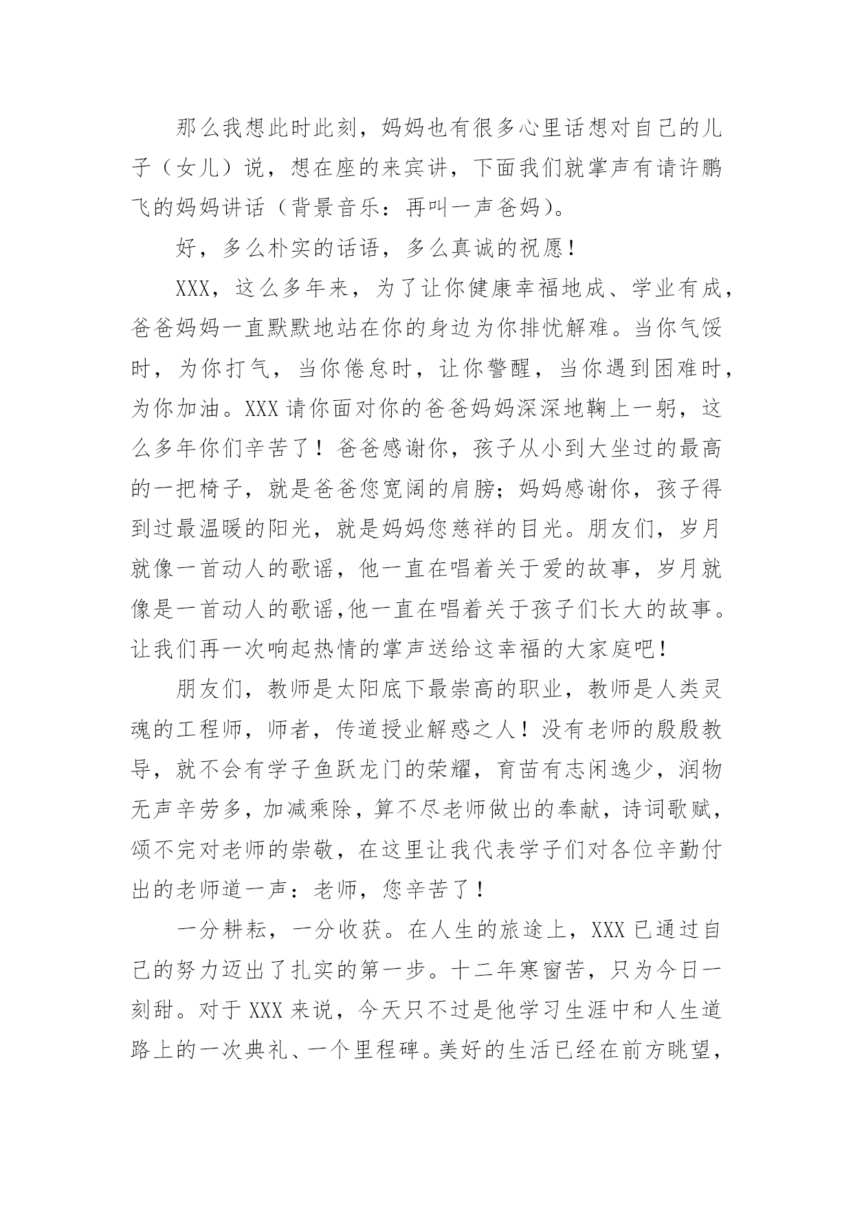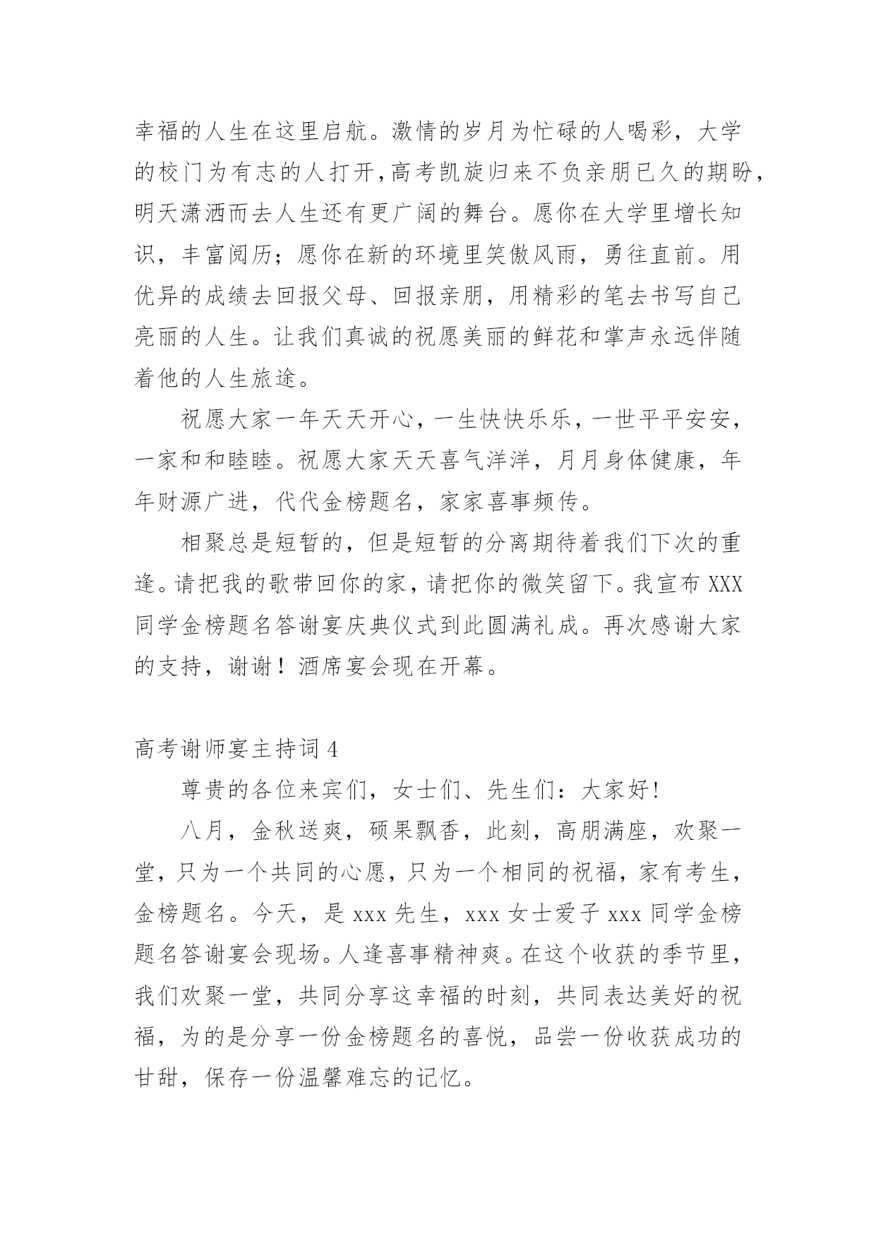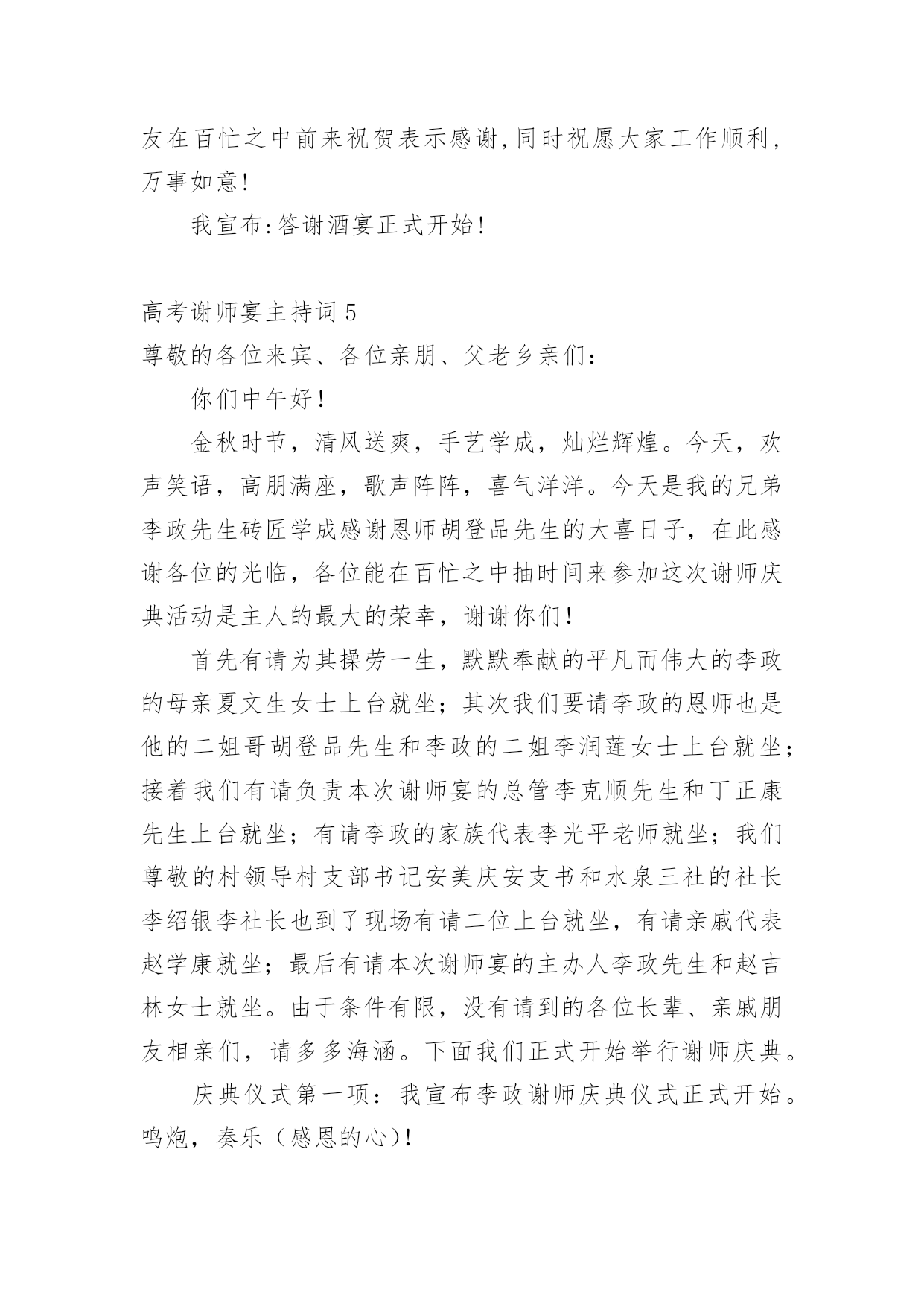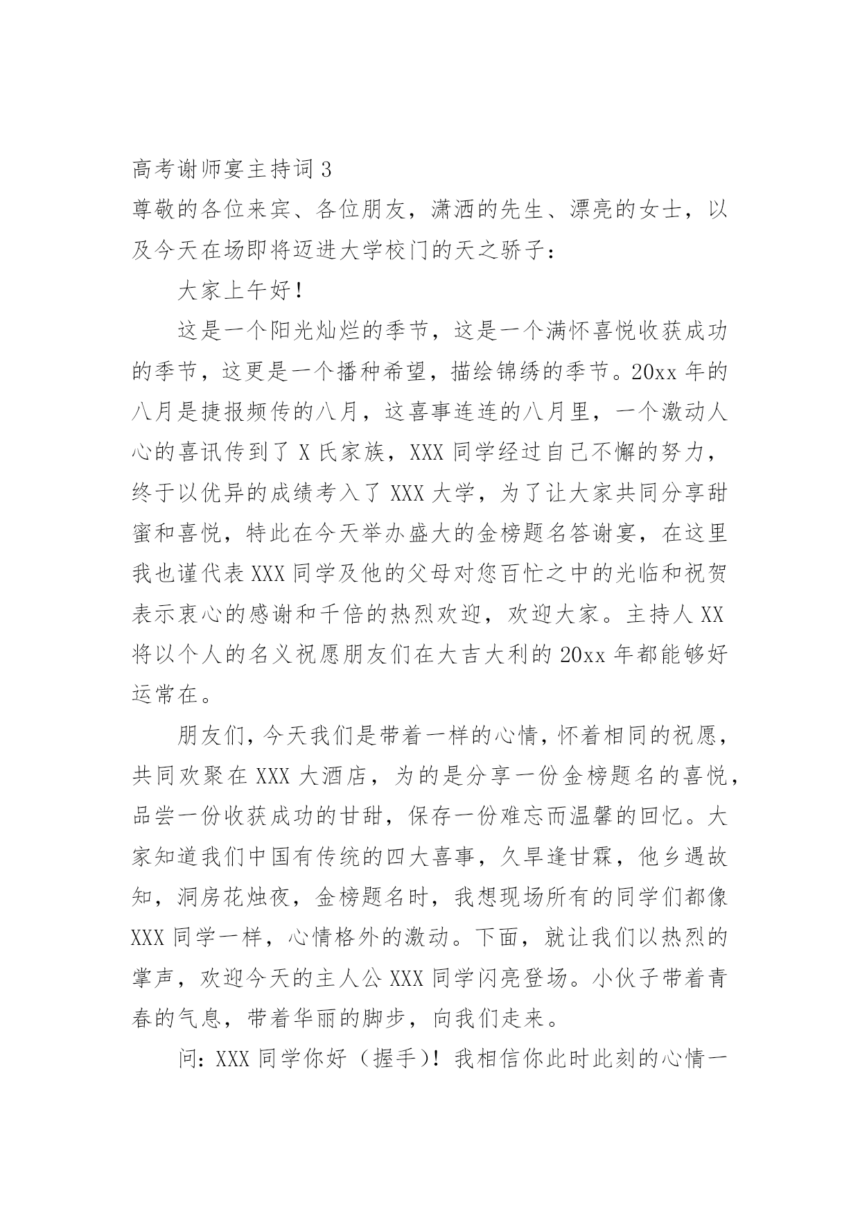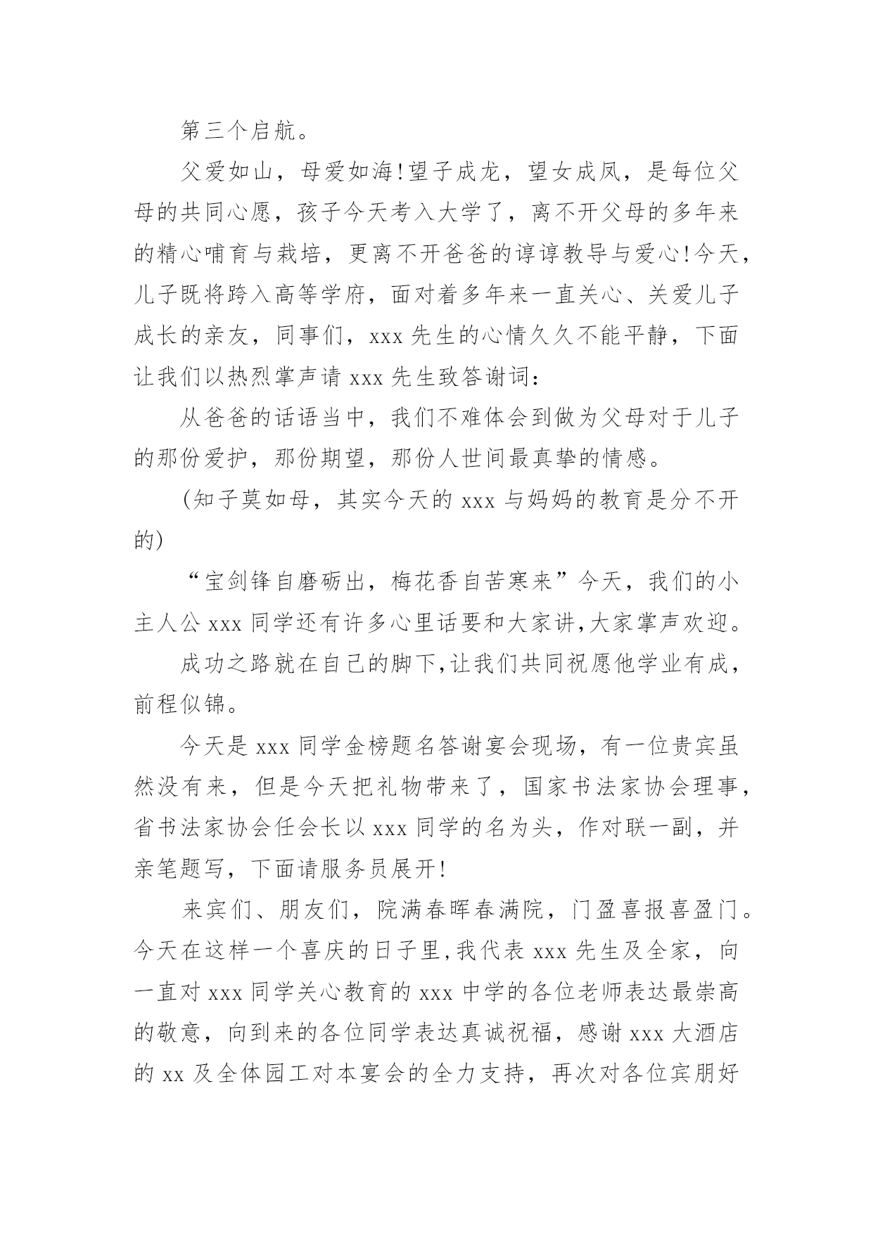 高考谢师宴主持词主持词的写作需要将主题贯穿于所有节目之中。在当今不断发展的世界,我们对主持词已经不再陌生,好的主持词是什么样的呢?下面是小编整理的高考谢师宴主持词,希望对大家有所帮助。高考谢师宴主持词1尊敬的各位嘉宾、各位朋友、女士们、先生们:大家晚上好!在这天降吉祥,喜庆来临,凉风送爽,欢声笑语的美好时刻,正值绿草如茵,鲜花怒放,五谷飘香,硕果累累的金秋时节,我们大家欢聚一堂,共同相约相聚在建工宾馆,为夏明春先生、王红丽女士之爱女夏天一同学,以优异的成绩金榜提名,前来到喜祝贺在这欢庆的宴会上高朋满座,丽影并肩,张张笑脸,喜气洋洋,我们一起感受着他们一家的这份喜悦与快乐,我叫谢晓莉,今天,我十分荣幸地接受重托,步入这神圣而又庄重的庆典殿堂,为夏天一同学担纲祝贺仪式,荣任金榜题名宴司仪。首先,我代表夏天一同学及其父母,向参加金榜题名宴的老师、领导和同学们、来宾和亲朋好友们,表示真诚的欢迎和衷心的谢意,希望大家相聚得愉快,并留下一个特别美好的回忆。夏天一同学以全省458名的成绩考入南京大学经济学类,圆了她的大学梦,这是他们一家的喜事,也是我们大家的荣耀,夏天一同学从小就是一个聪明懂事的好孩子,得到了父母无微不至的关怀与爱护,她今天成绩的取得离不开教育有方的父母。首先有请今天喜宴的主办人夏明春、王红丽夫妇肩并肩,手拉手,在大家热烈的掌声中走到台上来。再请我们今天的焦点人物,明天的大学生夏天一同学铿锵、闪亮登场。好!首先让我介绍一下,站在我身边的这位美丽大方的姑娘,就是本晚宴会的主角夏天一同学。宝剑锋从磨砺出,梅花香自苦寒来、请问夏天一同学你即将离开家乡、步入大学的校园,此时此刻,此情此景、你的心情怎样,有什么话要对你的父母及培育你多年的老师和各位嘉宾讲吗?说得多好啊。显然她的爸妈也是特别的激动高兴,现在由夏明春先生表达自己的心声。今天,我们夏天一同学的'老师也光临了这个喜庆的宴会。对人民来说,第一是面包、第二是教育,教育之根苦、教育之果甜、十年树木,百年树人、传播知识就是传播希望和幸福。是老师用美的阳光普照,用美的雨露滋润,学生的心田才绿草如茵,繁花似锦、您为花的盛开忙碌着、您像蜡烛燃烧自己、无私的奉献自己、您用辛勤的汗水浇灌今天的花朵,您用青春和生命,铺平我们绚丽的未来、愿天下所有的老师青春永驻,桃李满天下。高考谢师宴主持词2各位尊敬的来宾:承蒙大家的厚爱,感谢各位的光临!家有小女初长成。陈x同学在今年的高考中,以优异的成绩考上中国戏曲学院。在这可喜可贺的时候,我们不会忘记给予她关心、教育、支持和帮助的亲朋好友。可以说孩子的每一点成长和进步,每一份成绩和成功,都离不开各位老师长期以来的悉心教导和精心栽培;离不开各位亲人的关怀关爱;离不开父母单位的各位领导和同事以及同学和朋友的大力支持和热心相助。今天光临宴会的有,陈畅同学曾就读过的'桃花仑小学、大渡口中学,市一中的领导和老师;陈畅同学的钢琴、舞蹈、声乐、乐理专业老师,陈畅同学的亲人;陈畅父母单位的领导、同事和同学和朋友。在此,略备薄酒,恭请大家,不成敬意。只想表达一份感谢之情,只想告诉孩子,她的成功,不只是自己努力的结果,要怀着一颗感恩和感谢的心去面对自己今后的人生!在陈畅同学即将离开家乡,北上求学,放飞人生理想,迎接更大挑战之际,我们衷心地祝愿她越飞越高,实现自己的人生目标。同时,也希望她永远铭记:无论今后会面临怎样的情况,养育她的家乡永远是她坚实的靠山,无论走得多远,飞得多高,家乡的亲人、老师和所有支持帮助过她的人们都会一如既往地期盼、关心、关注着她的成长和成功。谢谢大家!高考谢师宴主持词3尊敬的各位来宾、各位朋友,潇洒的先生、漂亮的女士,以及今天在场即将迈进大学校门的天之骄子:大家上午好!这是一个阳光灿烂的季节,这是一个满怀喜悦收获成功的季节,这更是一个播种希望,描绘锦绣的季节。20xx年的八月是捷报频传的八月,这喜事连连的八月里,一个激动人心的喜讯传到了X氏家族,XXX同学经过自己不懈的努力,终于以优异的成绩考入了XXX大学,为了让大家共同分享甜蜜和喜悦,特此在今天举办盛大的金榜题名答谢宴,在这里我也谨代表XXX同学及他的父母对您百忙之中的光临和祝贺表示衷心的感谢和千倍的热烈欢迎,欢迎大家。主持人XX将以个人的名义祝愿朋友们在大吉大利的20xx年都能够好运常在。朋友们,今天我们是带着一样的心情,怀着相同的祝愿,共同欢聚在XXX大酒店,为的是分享一份金榜题名的喜悦,品尝一份收获成功的甘甜,保存一份难忘而温馨的回忆。大家知道我们中国有传统的四大喜事,久旱逢甘霖,他乡遇故知,洞房花烛夜,金榜题名时,我想现场所有的同学们都像XXX同学一样,心情格外的激动。下面,就让我们以热烈的掌声,欢迎今天的主人公XXX同学闪亮登场。小伙子带着青春的气息,带着华丽的脚步,向我们走来。问:XXX