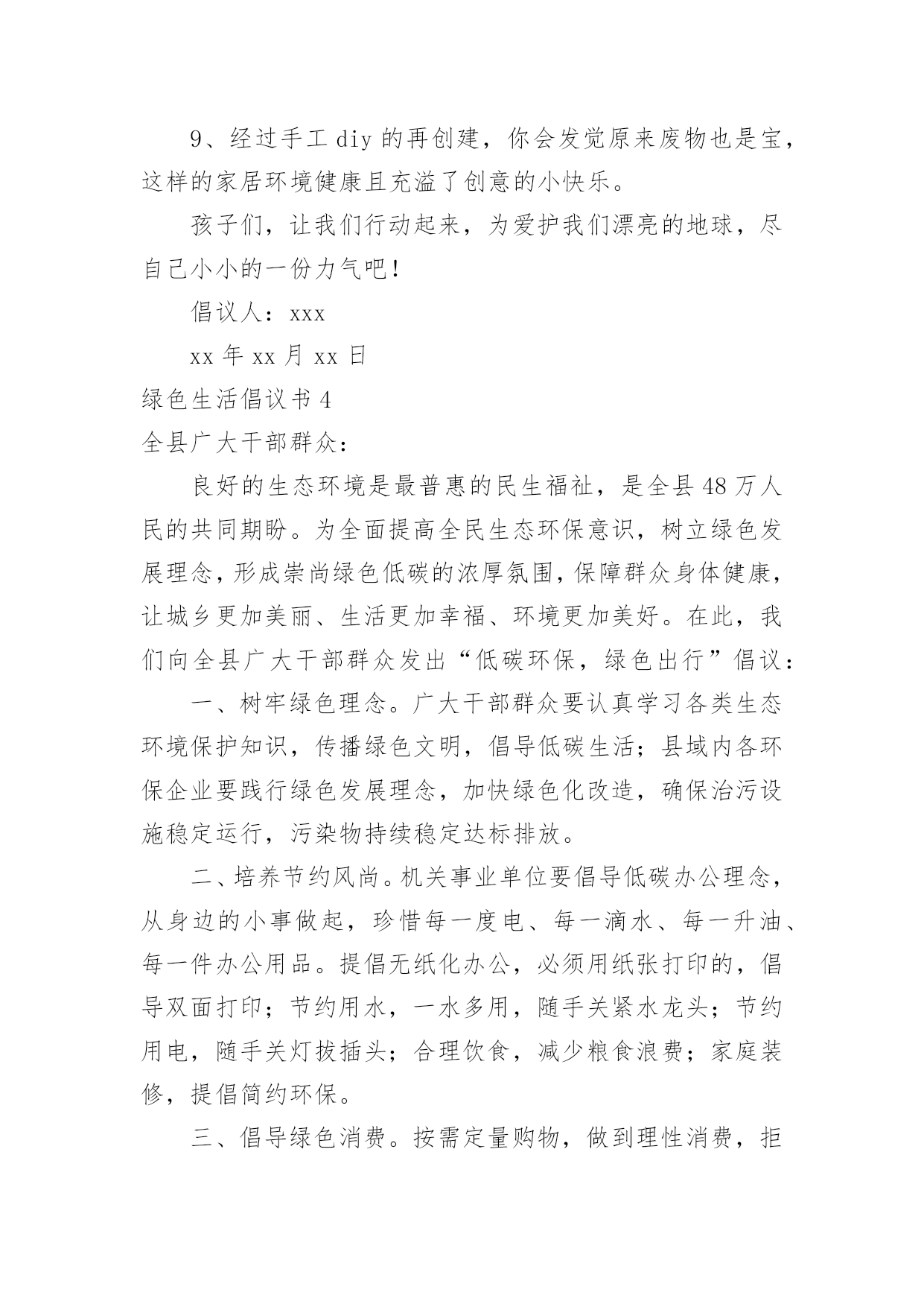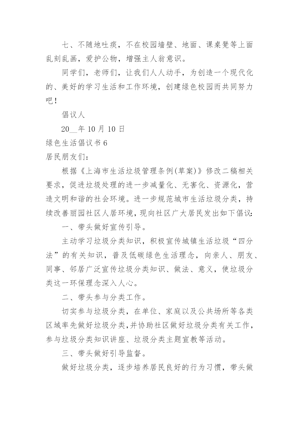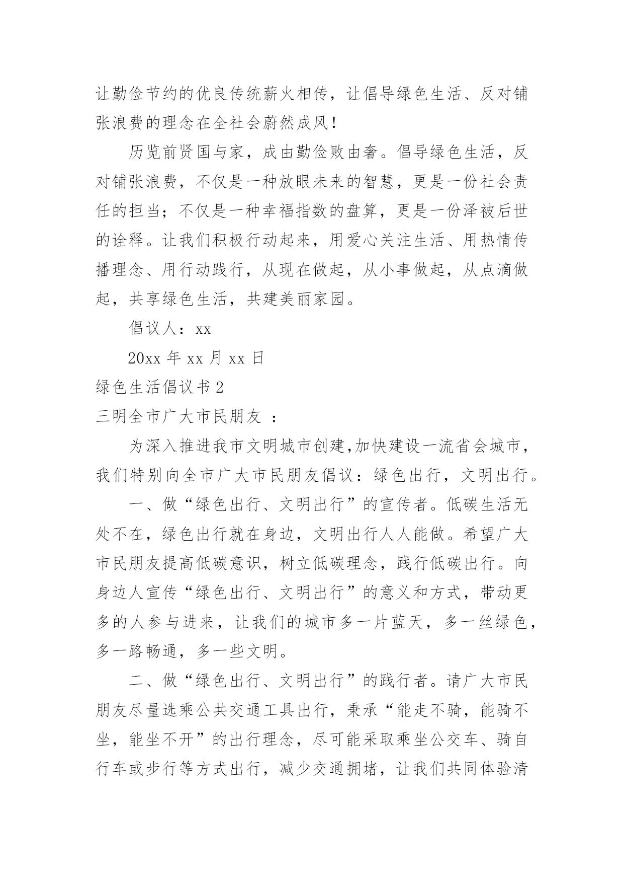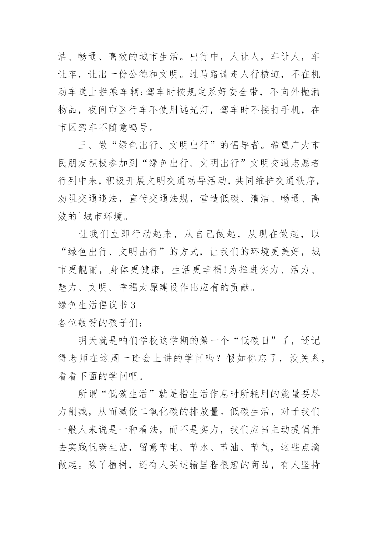 绿色生活倡议书绿色生活倡议书在发展不断提速的社会中,需要使用倡议书的场合越来越多,在写作上,倡议书有一定的书写规范。相信许多人会觉得倡议书很难写吧,以下是小编收集整理的绿色生活倡议书,欢迎阅读,希望大家能够喜欢。绿色生活倡议书1广大居民朋友:“倡导简约适度、绿色低碳的生活方式,反对奢侈浪费和不合理消费,开展创建节约型机关、绿色家庭、绿色学校、绿色社区和绿色出行等行动”,是党的关于建设美丽中国的重要部署,也是创建全国县级文明城市的重要内容。为推动形成自然简约、绿色低碳、文明健康的生活方式,助力全国县级文明城市创建,县文明办、县市场监督管理局决定于7月22日至8月22日,开展为期一个月的“倡导绿色生活、反对铺张浪费”“五个一”主题实践活动,即:向全社会发出一份倡议、刊播一批公益广告、推出一批典型、发放一批温馨提示牌、统一提供免费的打包餐盒。现发出如下倡议:一、争当“倡导绿色生活反对铺张浪费”的倡导者倡导绿色生活、反对铺张浪费,不仅是城市文明的重要标志,也是推动社会主义核心价值观落地生根的必然要求,更是“千年古县如画沁水”城市品牌的应有之义。绿色发展人人有责、人人共享,是理念、更是实践,需要坐而谋、更需起而行,推动“绿色生活”,实现“绿色生活”,需要我们每个人的参与。全县广大干部群众要认真领会关于坚持人与自然和谐共生、推进绿色发展的重要指示精神,努力践行社会主义核心价值观,积极投身“倡导绿色生活、反对铺张浪费”行动,从我做起,自觉节约能源,向家人、邻里、同事、朋友倡导绿色生活方式,向社会传递正能量。二、争当“倡导绿色生活反对铺张浪费”的引领者“一粥一饭,当思来之不易;半丝半缕,恒念物力维艰”。简约适度、绿色低碳的生活方式与我国优秀传统美德相统一,是新时代大力倡导的生活方式。全县广大干部群众要传承绿色文化基因,自觉成为创建节约型机关、绿色家庭、绿色出行行动的“领头雁”“排头兵”“护航员”,把“倡导绿色生活、反对铺张浪费”行动不断引向深入,让传统美德展现出永久魅力和时代风采。三、争当“倡导绿色生活反对铺张浪费”的.践行者牢固树立节约光荣、浪费可耻的思想观念。在日常工作中,做到节约每一滴水、每一度电、每一张纸;在日常生活中,树立以俭持家的理念,践行“文明餐桌”、加入“光盘行动”,杜绝“餐桌上的铺张”、“舌尖上的浪费”,始终坚持“吃够就好、剩余打包”的好习惯,采取健步走、骑行或乘坐公共交通工具等出行方式,减少使用一次性生活用品,杜绝冲动式购物,实施垃圾分类,同时做好对子女的言传身教,让勤俭节约的优良传统薪火相传,让倡导绿色生活、反对铺张浪费的理念在全社会蔚然成风!历览前贤国与家,成由勤俭败由奢。倡导绿色生活,反对铺张浪费,不仅是一种放眼未来的智慧,更是一份社会责任的担当;不仅是一种幸福指数的盘算,更是一份泽被后世的诠释。让我们积极行动起来,用爱心关注生活、用热情传播理念、用行动践行,从现在做起,从小事做起,从点滴做起,共享绿色生活,共建美丽家园。倡议人:xx20xx年xx月xx日绿色生活倡议书2三明全市广大市民朋友:为深入推进我市文明城市创建,加快建设一流省会城市,我们特别向全市广大市民朋友倡议:绿色出行,文明出行。一、做“绿色出行、文明出行”的宣传者。低碳生活无处不在,绿色出行就在身边,文明出行人人能做。希望广大市民朋友提高低碳意识,树立低碳理念,践行低碳出行。向身边人宣传“绿色出行、文明出行”的意义和方式,带动更多的人参与进来,让我们的城市多一片蓝天,多一丝绿色,多一路畅通,多一些文明。二、做“绿色出行、文明出行”的践行者。请广大市民朋友尽量选乘公共交通工具出行,秉承“能走不骑,能骑不坐,能坐不开”的出行理念,尽可能采取乘坐公交车、骑自行车或步行等方式出行,减少交通拥堵,让我们共同体验清洁、畅通、高效的城市生活。出行中,人让人,车让人,车让车,让出一份公德和文明。过马路请走人行横道,不在机动车道上拦乘车辆;驾车时按规定系好安全带,不向外抛洒物品,夜间市区行车不使用远光灯,驾车时不接打手机,在市区驾车不随意鸣号。三、做“绿色出行、文明出行”的倡导者。希望广大市民朋友积极参加到“绿色出行、文明出行”文明交通志愿者行列中来,积极开展文明交通劝导活动,共同维护交通秩序,劝阻交通违法,宣传交通法规,营造低碳、清洁、畅通、高效的`城市环境。让我们立即行动起来,从自己做起,从现在做起,以“绿色出行、文明出行”的方式,让我们的环境更美好,城市更靓丽,身体更健康,生活更幸福!为推进实力、活力、魅力、文明、幸福太原建设作出应有的贡献。绿色生活倡议书3各位敬爱的孩子们:明天就是咱们学校这学期的第一个“低碳日”了,还记得老师在这周一班会上讲的学问吗?假如你忘了,没关系,看看下面的学问吧。所谓“低碳生活”就是指生活作息时所耗用的能量要尽力削减,从而减低二氧化