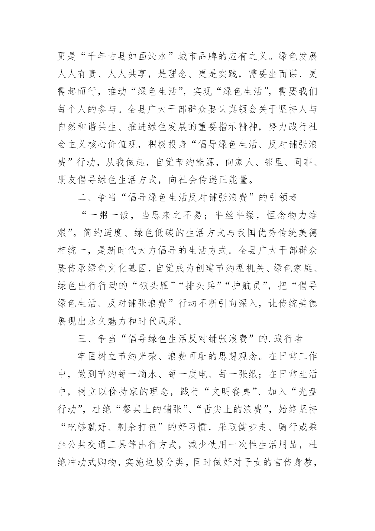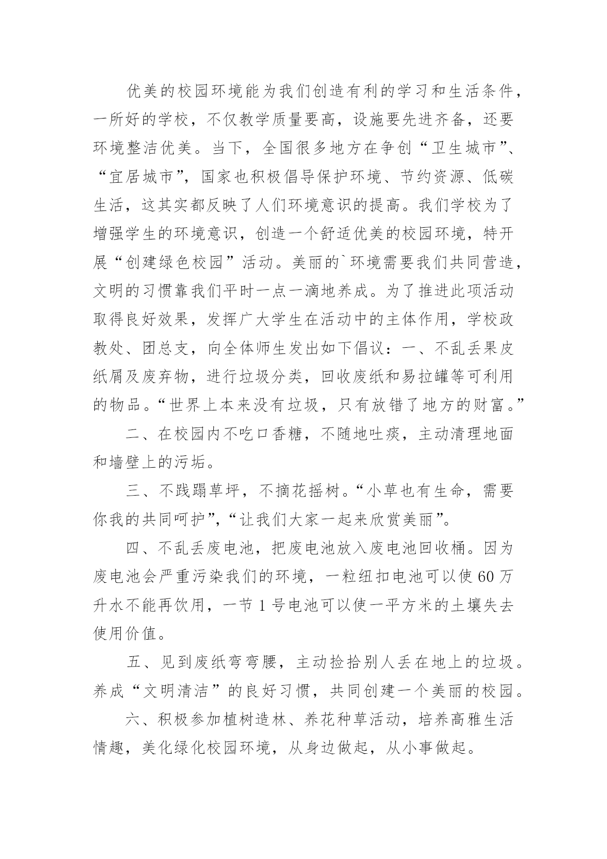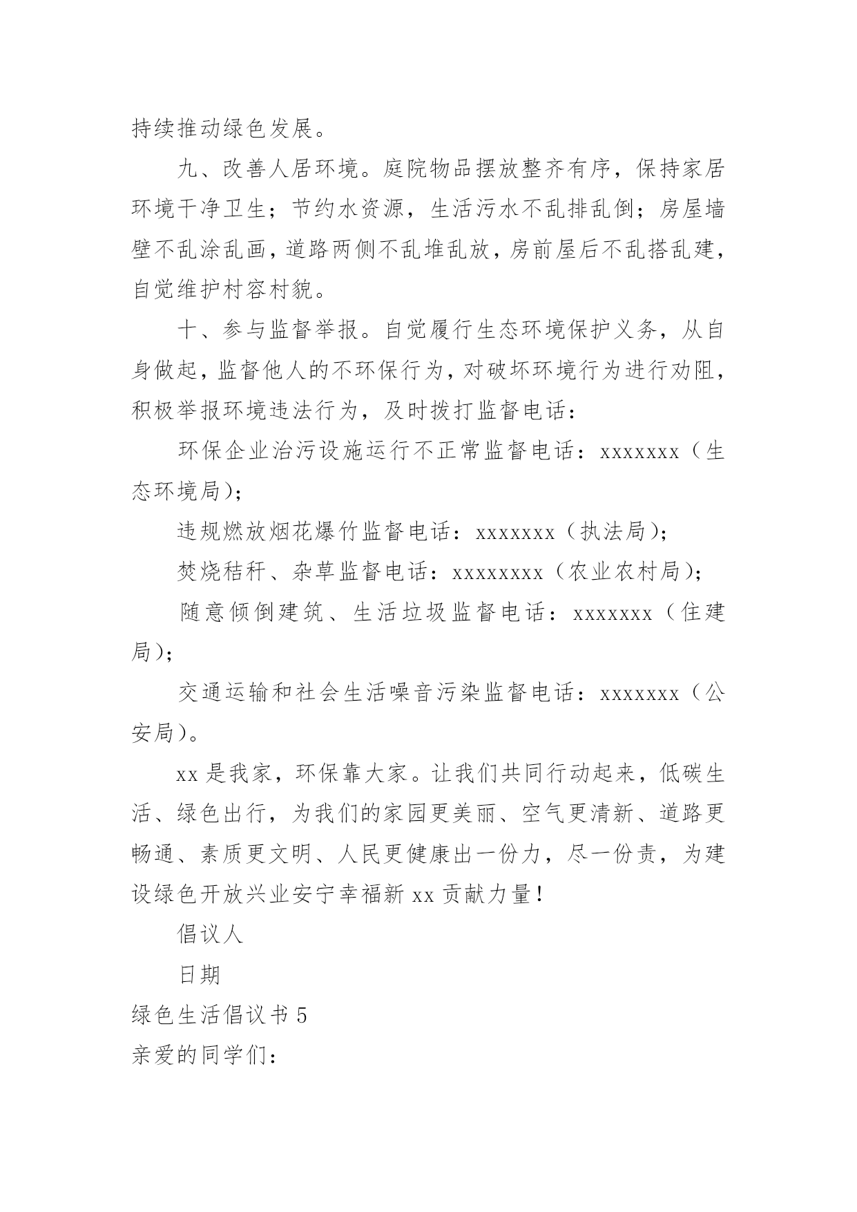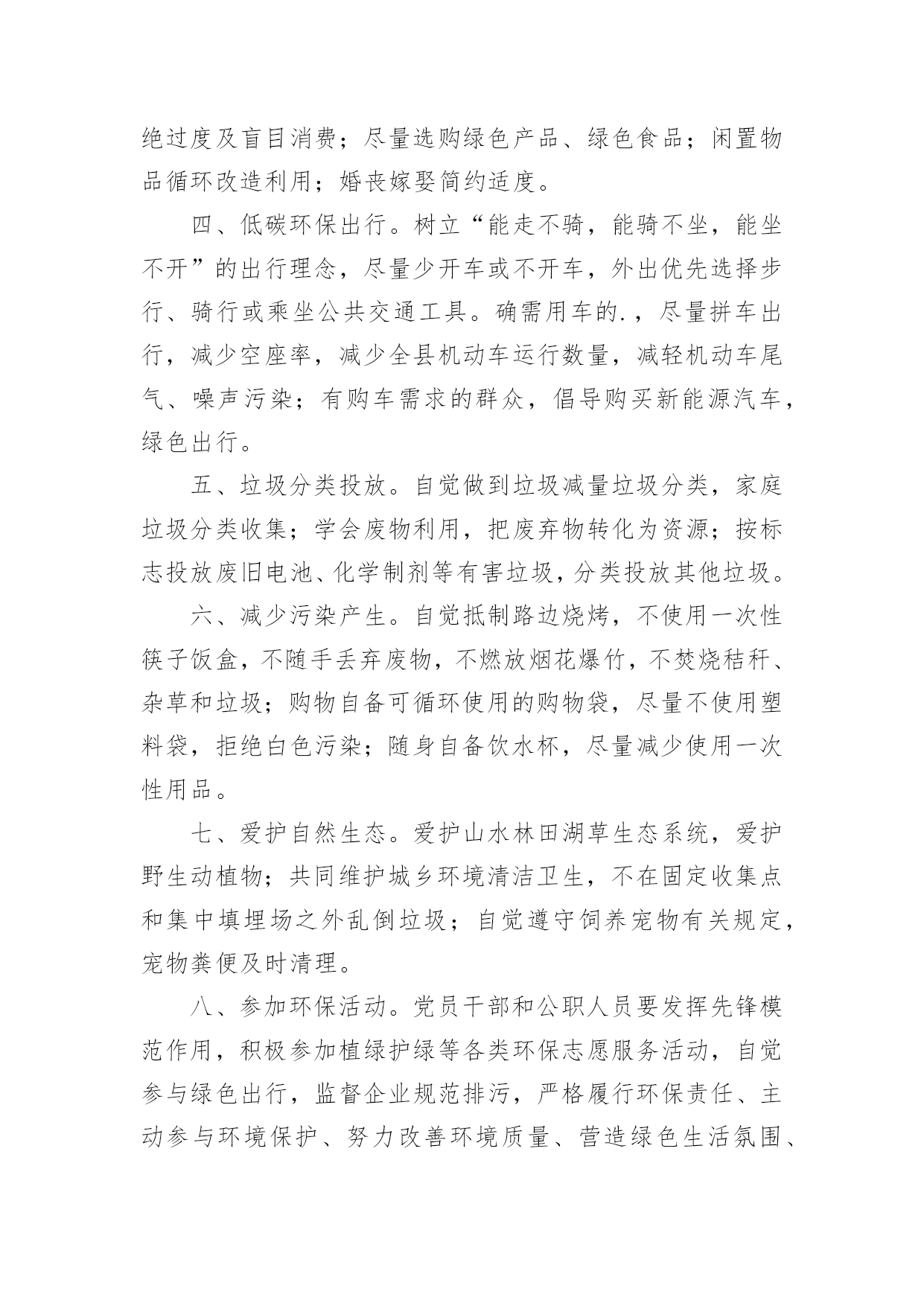绿色生活倡议书绿色生活倡议书在发展不断提速的社会中,需要使用倡议书的场合越来越多,在写作上,倡议书有一定的书写规范。相信许多人会觉得倡议书很难写吧,以下是小编收集整理的绿色生活倡议书,欢迎阅读,希望大家能够喜欢。绿色生活倡议书1广大居民朋友:“倡导简约适度、绿色低碳的生活方式,反对奢侈浪费和不合理消费,开展创建节约型机关、绿色家庭、绿色学校、绿色社区和绿色出行等行动”,是党的关于建设美丽中国的重要部署,也是创建全国县级文明城市的重要内容。为推动形成自然简约、绿色低碳、文明健康的生活方式,助力全国县级文明城市创建,县文明办、县市场监督管理局决定于7月22日至8月22日,开展为期一个月的“倡导绿色生活、反对铺张浪费”“五个一”主题实践活动,即:向全社会发出一份倡议、刊播一批公益广告、推出一批典型、发放一批温馨提示牌、统一提供免费的打包餐盒。现发出如下倡议:一、争当“倡导绿色生活反对铺张浪费”的倡导者倡导绿色生活、反对铺张浪费,不仅是城市文明的重要标志,也是推动社会主义核心价值观落地生根的必然要求,更是“千年古县如画沁水”城市品牌的应有之义。绿色发展人人有责、人人共享,是理念、更是实践,需要坐而谋、更需起而行,推动“绿色生活”,实现“绿色生活”,需要我们每个人的参与。全县广大干部群众要认真领会关于坚持人与自然和谐共生、推进绿色发展的重要指示精神,努力践行社会主义核心价值观,积极投身“倡导绿色生活、反对铺张浪费”行动,从我做起,自觉节约能源,向家人、邻里、同事、朋友倡导绿色生活方式,向社会传递正能量。二、争当“倡导绿色生活反对铺张浪费”的引领者“一粥一饭,当思来之不易;半丝半缕,恒念物力维艰”。简约适度、绿色低碳的生活方式与我国优秀传统美德相统一,是新时代大力倡导的生活方式。全县广大干部群众要传承绿色文化基因,自觉成为创建节约型机关、绿色家庭、绿色出行行动的“领头雁”“排头兵”“护航员”,把“倡导绿色生活、反对铺张浪费”行动不断引向深入,让传统美德展现出永久魅力和时代风采。三、争当“倡导绿色生活反对铺张浪费”的.践行者牢固树立节约光荣、浪费可耻的思想观念。在日常工作中,做到节约每一滴水、每一度电、每一张纸;在日常生活中,树立以俭持家的理念,践行“文明餐桌”、加入“光盘行动”,杜绝“餐桌上的铺张”、“舌尖上的浪费”,始终坚持“吃够就好、剩余打包”的好习惯,采取健步走、骑行或乘坐公共交通工具等出行方式,减少使用一次性生活用品,杜绝冲动式购物,实施垃圾分类,同时做好对子女的言传身教,让勤俭节约的优良传统薪火相传,让倡导绿色生活、反对铺张浪费的理念在全社会蔚然成风!历览前贤国与家,成由勤俭败由奢。倡导绿色生活,反对铺张浪费,不仅是一种放眼未来的智慧,更是一份社会责任的担当;不仅是一种幸福指数的盘算,更是一份泽被后世的诠释。让我们积极行动起来,用爱心关注生活、用热情传播理念、用行动践行,从现在做起,从小事做起,从点滴做起,共享绿色生活,共建美丽家园。倡议人:xx20xx年xx月xx日绿色生活倡议书2三明全市广大市民朋友:为深入推进我市文明城市创建,加快建设一流省会城市,我们特别向全市广大市民朋友倡议:绿色出行,文明出行。一、做“绿色出行、文明出行”的宣传者。低碳生活无处不在,绿色出行就在身边,文明出行人人能做。希望广大市民朋友提高低碳意识,树立低碳理念,践行低碳出行。向身边人宣传“绿色出行、文明出行”的意义和方式,带动更多的人参与进来,让我们的城市多一片蓝天,多一丝绿色,多一路畅通,多一些文明。二、做“绿色出行、文明出行”的践行者。请广大市民朋友尽量选乘公共交通工具出行,秉承“能走不骑,能骑不坐,能坐不开”的出行理念,尽可能采取乘坐公交车、骑自行车或步行等方式出行,减少交通拥堵,让我们共同体验清洁、畅通、高效的城市生活。出行中,人让人,车让人,车让车,让出一份公德和文明。过马路请走人行横道,不在机动车道上拦乘车辆;驾车时按规定系好安全带,不向外抛洒物品,夜间市区行车不使用远光灯,驾车时不接打手机,在市区驾车不随意鸣号。三、做“绿色出行、文明出行”的倡导者。希望广大市民朋友积极参加到“绿色出行、文明出行”文明交通志愿者行列中来,积极开展文明交通劝导活动,共同维护交通秩序,劝阻交通违法,宣传交通法规,营造低碳、清洁、畅通、高效的`城市环境。让我们立即行动起来,从自己做起,从现在做起,以“绿色出行、文明出行”的方式,让我们的环境更美好,城市更靓丽,身体更健康,生活更幸福!为推进实力、活力、魅力、文明、幸福太原建设作出应有的贡献。绿色生活倡议书3各位敬爱的孩子们:明天就是咱们学校这学期的第一个“低碳日”了,还记得老师在这周一班会上讲的学问吗?假如你忘了,没关系,看看下面的学问吧。所谓“低碳生活”就是指生活作息时所耗用的能量要尽力削减,从而减低二氧化
