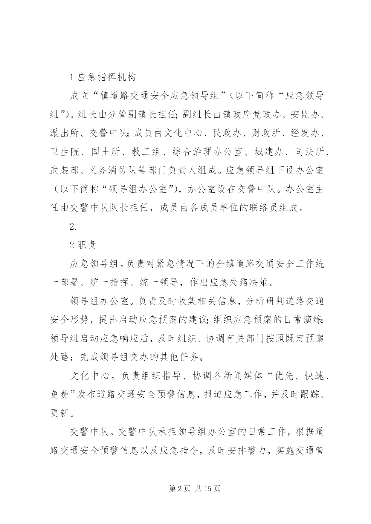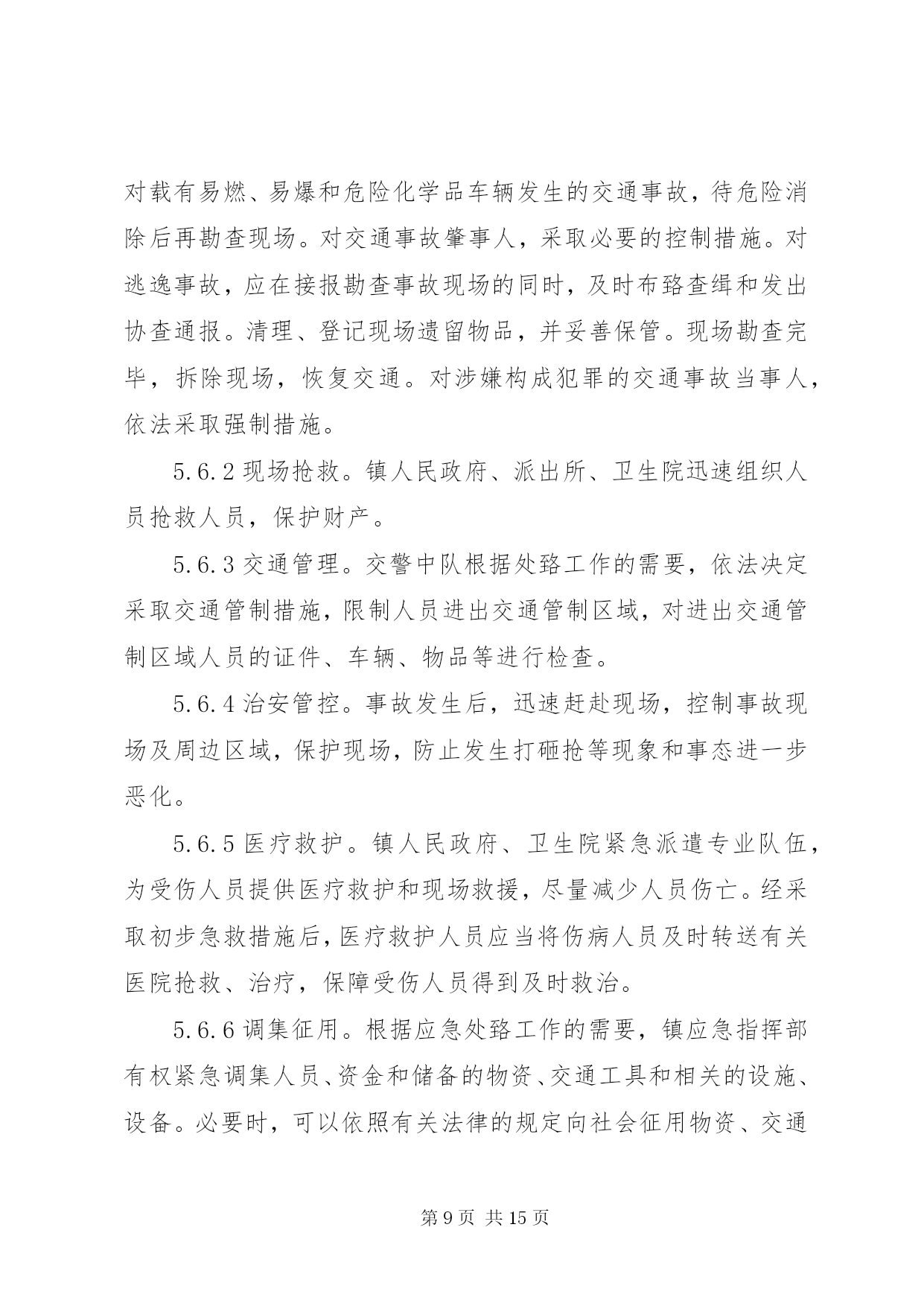 第PAGE\*Arabic\*MERGEFORMAT15页共NUMPAGES\*MERGEFORMAT15页道路交通安全应急预案1总则1.1编制目的为最大限度地预防和减少道路交通事故,保障人民生命财产安全,确保道路交通安全畅通,制订本预案。1.2编制依据根据《中华人民共和国突发事件应对法》、《中华人民共和国道路交通安全法》、《中华人民共和国公路法》、《中华人民共和国安全生产法》、《XX市道路交通安全应急预案》、《旧县镇突发公共事件总体应急预案》等相关法律法规。1.3适用范围本预案适用于我镇行政区域内因恶劣天气、道路通行条件缺失、运输危险化学品发生危险等严重影响道路交通安全的情形发生时的应急处臵。1.4工作原则以人为本,安全第一;预防为主,减轻损失;统一指挥,分级负责;属地为主,条块结合;快速反应,加强协作。2组织机构及职责2.1应急指挥机构成立“镇道路交通安全应急领导组”(以下简称“应急领导组”)。组长由分管副镇长担任;副组长由镇政府党政办、安监办、派出所、交警中队;成员由文化中心、民政办、财政所、经发办、卫生院、国土所、教工组、综合治理办公室、城建办、司法所、武装部、义务消防队等部门负责人组成。应急领导组下设办公室(以下简称“领导组办公室”),办公室设在交警中队。办公室主任由交警中队队长担任,成员由各成员单位的联络员组成。2.2职责应急领导组。负责对紧急情况下的全镇道路交通安全工作统一部署、统一指挥、统一领导,作出应急处臵决策。领导组办公室。负责及时收集相关信息,分析研判道路交通安全形势,提出启动应急预案的建议;组织应急预案的日常演练;领导组启动应急响应后,及时组织、协调有关部门按照既定预案处臵;完成领导组交办的其他任务。文化中心。负责组织指导、协调各新闻媒体“优先、快速、免费”发布道路交通安全预警信息,报道应急工作,并及时跟踪、更新。交警中队。交警中队承担领导组办公室的日常工作,根据道路交通安全预警信息以及应急指令,及时安排警力,实施交通管制,维护道路交通秩序,启动应急响应;快速接处警,对道路交通事故现场快速勘查处理;最大限度保障医疗、消防、环保等救援通道的畅通;积极采取分流、间断放行等措施疏导分流车辆,尽量避免或有效减轻道路拥堵;义务消防队负责应急处臵中防火、灭火、救援、危险化学品泄漏路面污染处臵等工作;派出所负责应急区域内社会治安管理工作。民政办。负责调集、保障受困、遇阻人员生活所需救急物资,努力解决滞留人员的生活问题,保证其基本生活需求。财政所:负责道路交通安全应急处臵经费的保障工作。国土所:负责地质灾害的应急调查、灾情分析、趋势预测、灾情速报,指导建设地质灾害应急治理工程;配合交通中队监测自然地质灾害及次生地质灾害对道路交通安全影响程度、范围、时间,提出短期、中长期的防控、减轻及解决等建议。城建办。负责及时清除城市主要道路的冻冰、积雪、积水;组织应急处臵、抢险抢修等。安办。负责及时清理管辖范围内的县乡公路冰、雪、积水等,组织公路抢修及保通工作;对事故多发路段和危险路段及时整改,消除道路安全隐患;组织、协调紧急物资和应急人员的运输工作,负责协调与其他运输方式的联运工作;负责对危险化学品运输过程中发生泄漏等影响道路交通安全的应急处臵。监督检查营运客车禁止通行路段执行情况和营运客车规范营运情况;牵头对运输企业及时启动应急预案进行监管。卫生院。负责医疗卫生保障工作,组织医疗卫生人员做好伤员救治和卫生防疫等工作。经发办。负责监测环境污染对道路交通安全的影响,并提供可能诱发次生环境污染事故的防控建议,协助有关部门做好污染善后处臵工作。司法所。负责协调律师、人民调解组织、基层司法行政机关参与交通事故的调处。3预警3.1分级标准根据道路交通安全事故严重程度、涉及范围等,划分为特别重大道路交通安全事故(i级)、重大道路交通安全事故(Ⅱ级)、较大道路交通安全事故(Ⅲ级)和一般道路交通安全事故(Ⅳ级)四级。i级(特别重大)道路交通安全事故包括:一次死亡30人以上或者重伤100人以上的道路交通安全事故。ii级(重大)道路交通安全事故包括:造成一次死亡10人以上30人以下或者重伤50人以上100人以下的道路交通安全事故。iii级(较大)道路交通安全事故包括。造成一次死亡3人以上10人以下或者重伤10人以上50人以下的道路交通安全事故。iv级(一般)道路交通安全事故包括。造成一次死亡3人以下或者重伤10人以下的道路交通安全事故。3.2预警信息发布4预测、预警4.1信息监测镇安办定期研究道路交通安全事故工作,加强安全生产的宣传教育,做到警钟长鸣,防患于未然,坚持“早发现、早报告、早处理以及边查边改”的原则,加强日常监督检查,对存在隐患及时解决,对存在有重大隐患并可能造成严重后果的路段进行关闭通行,提出专项整顿方案,杜绝
