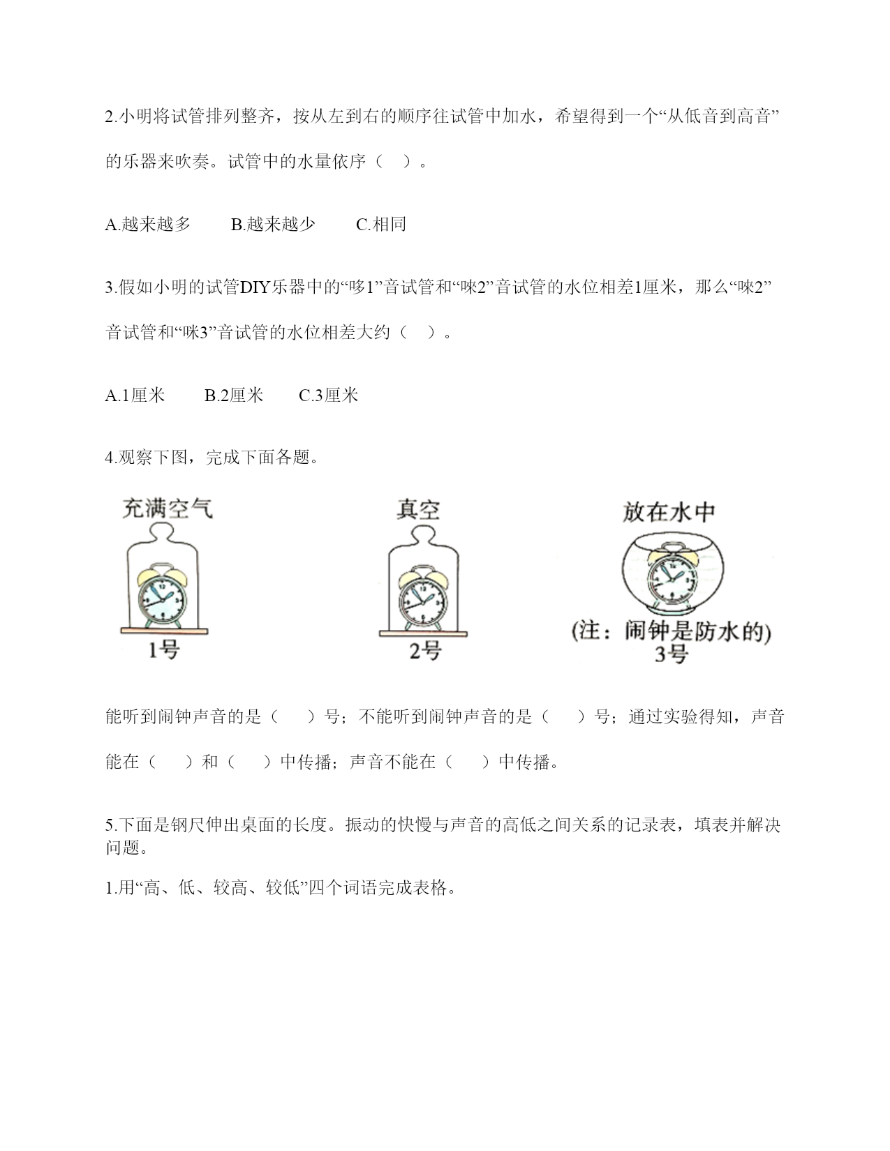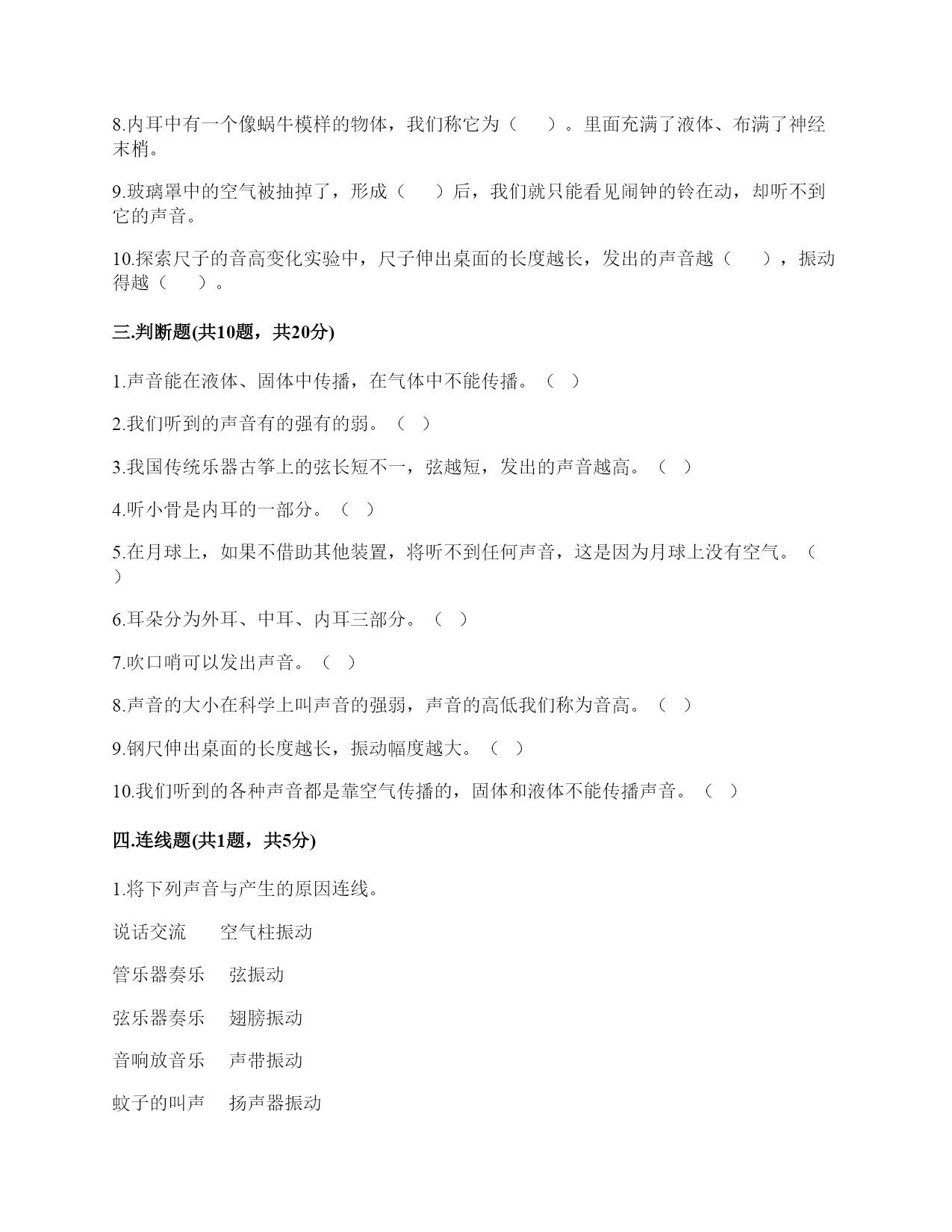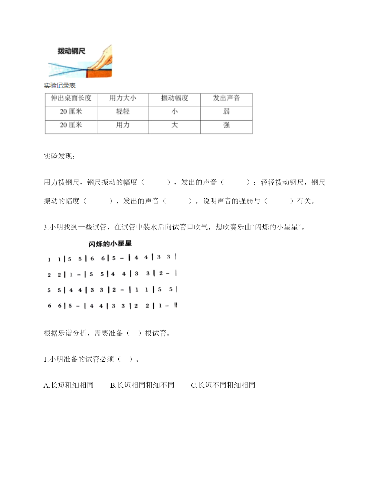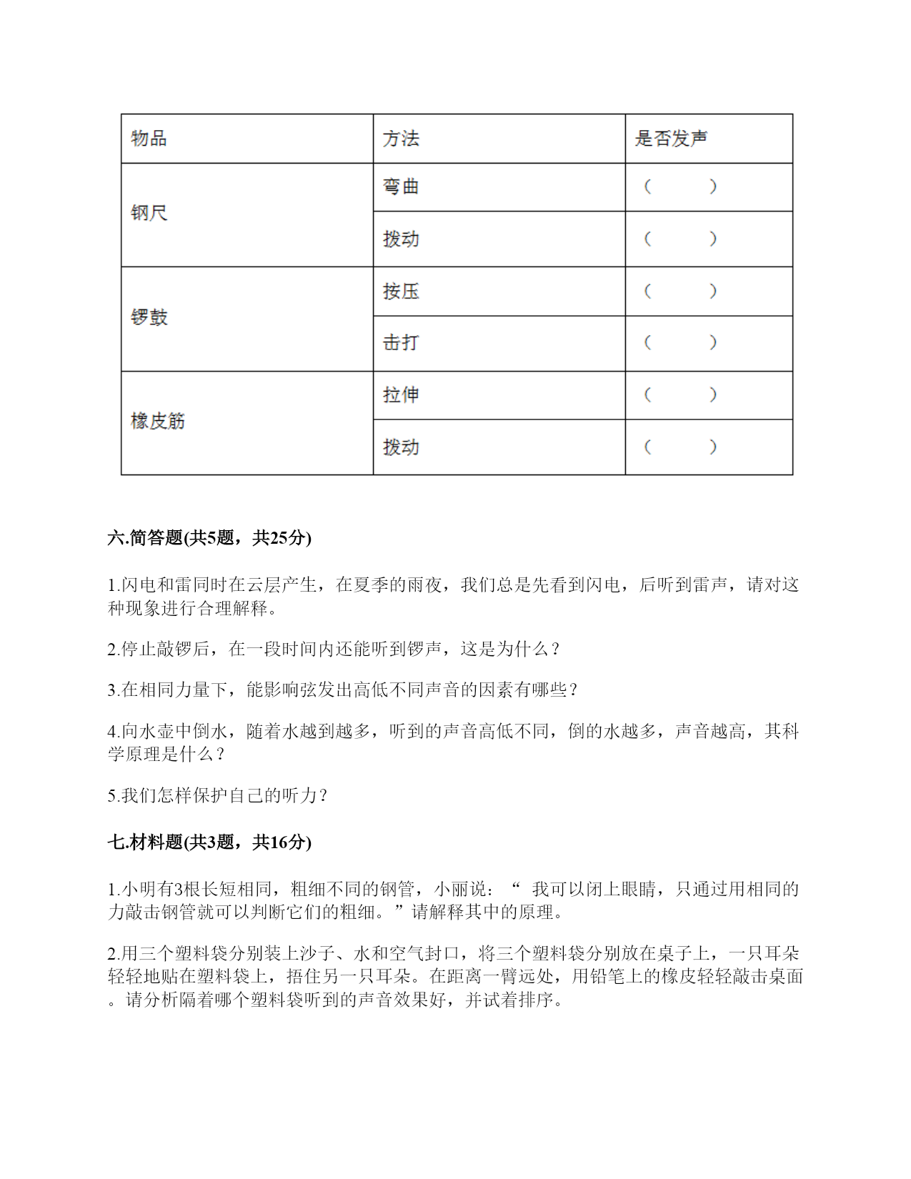 小学科学《声音》练习题一.选择题(共10题,共20分)1.敲击下面的杯子,能发出高音的是()。2.外耳由耳郭和()组成。A.鼓膜B.外耳道C.听小骨3.在弹吉他时,若想要使它发出的声音强一些,可以()。A.换新吉他B.用的力气大一些C.调节弦的松紧度4.当你在打哈欠的时候,会听不清或听不到别人对你说话,重要原因是打哈欠影响了()。A.鼓膜的振动B.听小骨的振动C.耳廓的振动D.听觉神经的振动5.下面方法不能使下图中的钢尺发出声音的是()。A.拉伸钢尺B.拍打钢尺C.敲击钢尺6.下列物体中,声音在()中传播的速度最快。A.钢铁B.水C.空气7.当我们把玻璃钟罩里的空气逐渐抽掉时,钟罩里的闹钟铃声会()。A.越来越轻,甚至听不见B.越来越响C.没有什么变化8.制作“土电话”时,线绳要()。A.松B.紧C.拐弯D.随便9.调节电视遥控器上的“音量按钮”改变的是声音的()。A.强弱B.高低C.以上都是10.如图所示,通过左右滑动圆点可以调节手机的音量,这是在调节手机声音的()。A.强弱B.高低C.好坏二.填空题(共10题,共38分)1.在自然界中,声音有()有弱,有()有低……。2.尺子伸出桌面(),发出的声音()﹔尺子伸出桌面(),发出的声音()。3.声音的高低和物体振动的()有关。4.音高是由物体振动的快慢决定的。振动越(),发出的声音就越(),振动越慢,发出的声音就越()。5.像二胡、小提琴、吉他等乐器,是靠()的振动发出高低()的声音的。6.上课时,老师的声音是通过()(填“固体”或“空气”)传入同学们的耳中的。7.我们常见的乐器二胡、小提琴、吉他、古筝等,是靠()发出()的声音。8.内耳中有一个像蜗牛模样的物体,我们称它为()。里面充满了液体、布满了神经末梢。9.玻璃罩中的空气被抽掉了,形成()后,我们就只能看见闹钟的铃在动,却听不到它的声音。10.探索尺子的音高变化实验中,尺子伸出桌面的长度越长,发出的声音越(),振动得越()。三.判断题(共10题,共20分)1.声音能在液体、固体中传播,在气体中不能传播。()2.我们听到的声音有的强有的弱。()3.我国传统乐器古筝上的弦长短不一,弦越短,发出的声音越高。()4.听小骨是内耳的一部分。()5.在月球上,如果不借助其他装置,将听不到任何声音,这是因为月球上没有空气。()6.耳朵分为外耳、中耳、内耳三部分。()7.吹口哨可以发出声音。()8.声音的大小在科学上叫声音的强弱,声音的高低我们称为音高。()9.钢尺伸出桌面的长度越长,振动幅度越大。()10.我们听到的各种声音都是靠空气传播的,固体和液体不能传播声音。()四.连线题(共1题,共5分)1.将下列声音与产生的原因连线。说话交流空气柱振动管乐器奏乐弦振动弦乐器奏乐翅膀振动音响放音乐声带振动蚊子的叫声扬声器振动五.填表题(共2题,共18分)1.猜想:声音强弱与物体振动幅度有关,振幅越大,声音越();物体振幅越小,声音越()。实验器材:钢尺,桌子改变的条件:()不改变的条件:()填写表格。实验结论是什么?2.观察物体是否发声。六.简答题(共5题,共25分)1.闪电和雷同时在云层产生,在夏季的雨夜,我们总是先看到闪电,后听到雷声,请对这种现象进行合理解释。2.停止敲锣后,在一段时间内还能听到锣声,这是为什么?3.在相同力量下,能影响弦发出高低不同声音的因素有哪些?4.向水壶中倒水,随着水越到越多,听到的声音高低不同,倒的水越多,声音越高,其科学原理是什么?5.我们怎样保护自己的听力?七.材料题(共3题,共16分)1.小明有3根长短相同,粗细不同的钢管,小丽说:“我可以闭上眼睛,只通过用相同的力敲击钢管就可以判断它们的粗细。”请解释其中的原理。2.用三个塑料袋分别装上沙子、水和空气封口,将三个塑料袋分别放在桌子上,一只耳朵轻轻地贴在塑料袋上,捂住另一只耳朵。在距离一臂远处,用铅笔上的橡皮轻轻敲击桌面。请分析隔着哪个塑料袋听到的声音效果好,并试着排序。3.夏天的夜晚,我们经常能听到蟋蟀的叫声,可是,你知道吗?只有雄性蟋蟀会叫,雌性是不会叫的。而且,蟋蟀的叫声不是从口中发出的,而是靠翅膀的摩擦来发声的。在雄性蟋蟀的前翅上,有旋涡纹状的翅膜,一边翅膀长着锉刀状的翅膜——弦器,另一边翅膀长着较硬的翅膜——弹器。当这两种发音器相互摩擦时,就能发出声音。蟋蟀称得上是昆虫界里一名优秀的小提琴师。你还听见过哪些动物的叫声?试写出5种。八.综合题(共5题,共36分)1.观察下面这张图,同学丙在写字,同学甲和同学乙都能听到同学丙写字的声音。①同学甲和同学乙听到的声音相比,()。A.同学甲听到的声音会更清