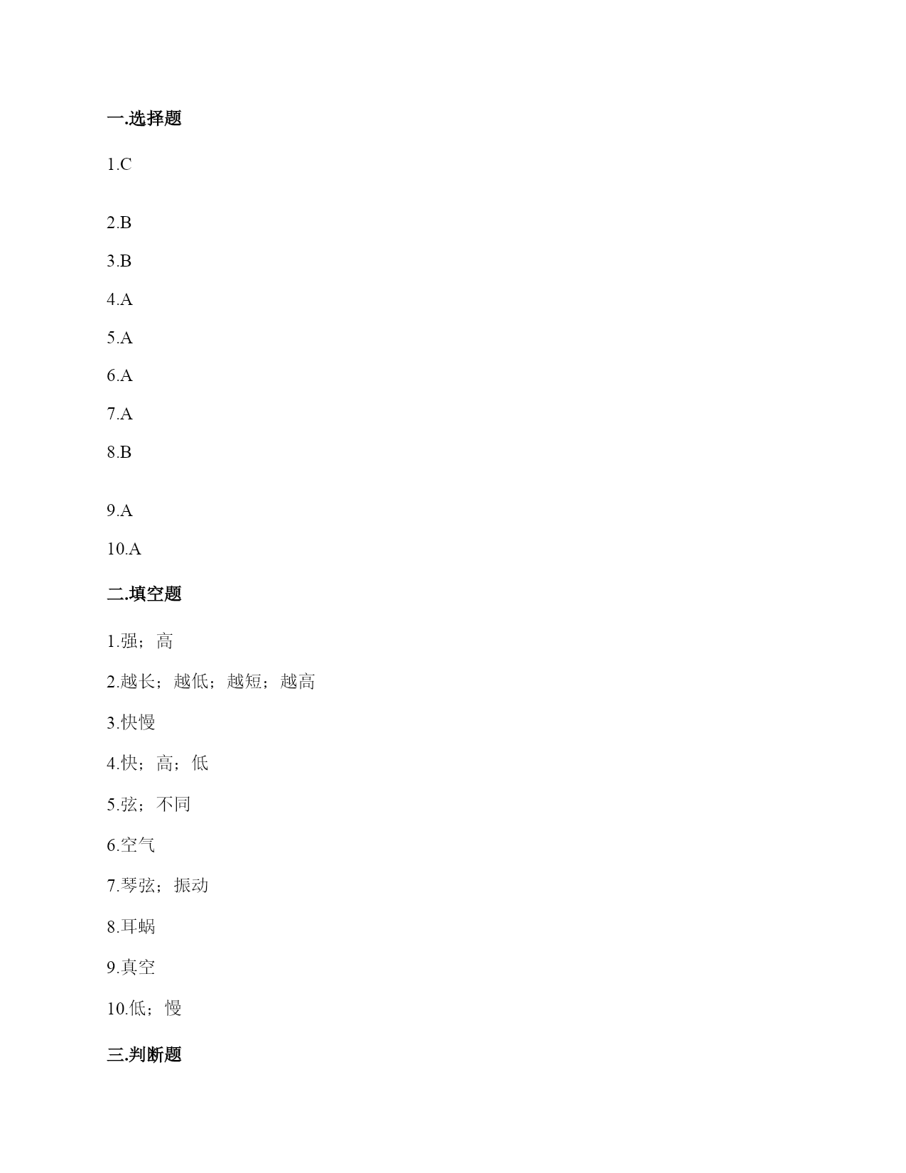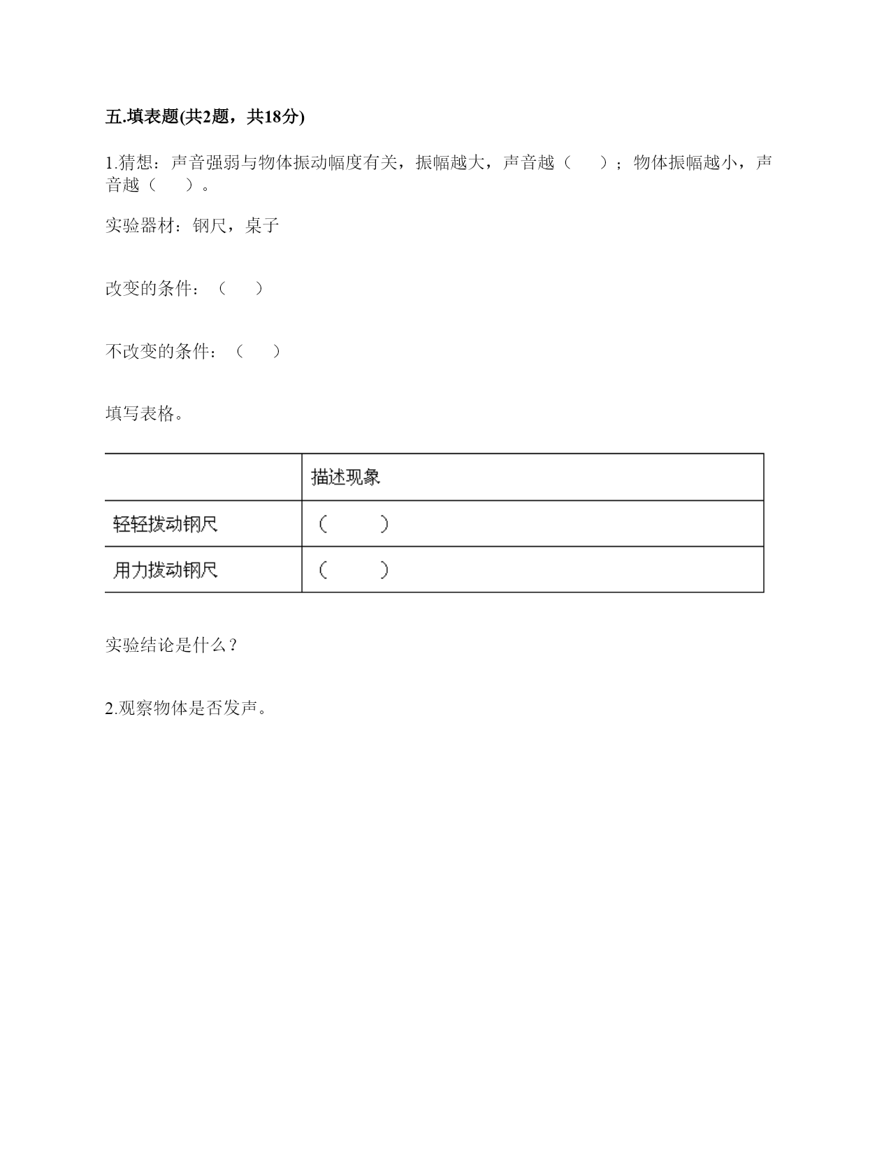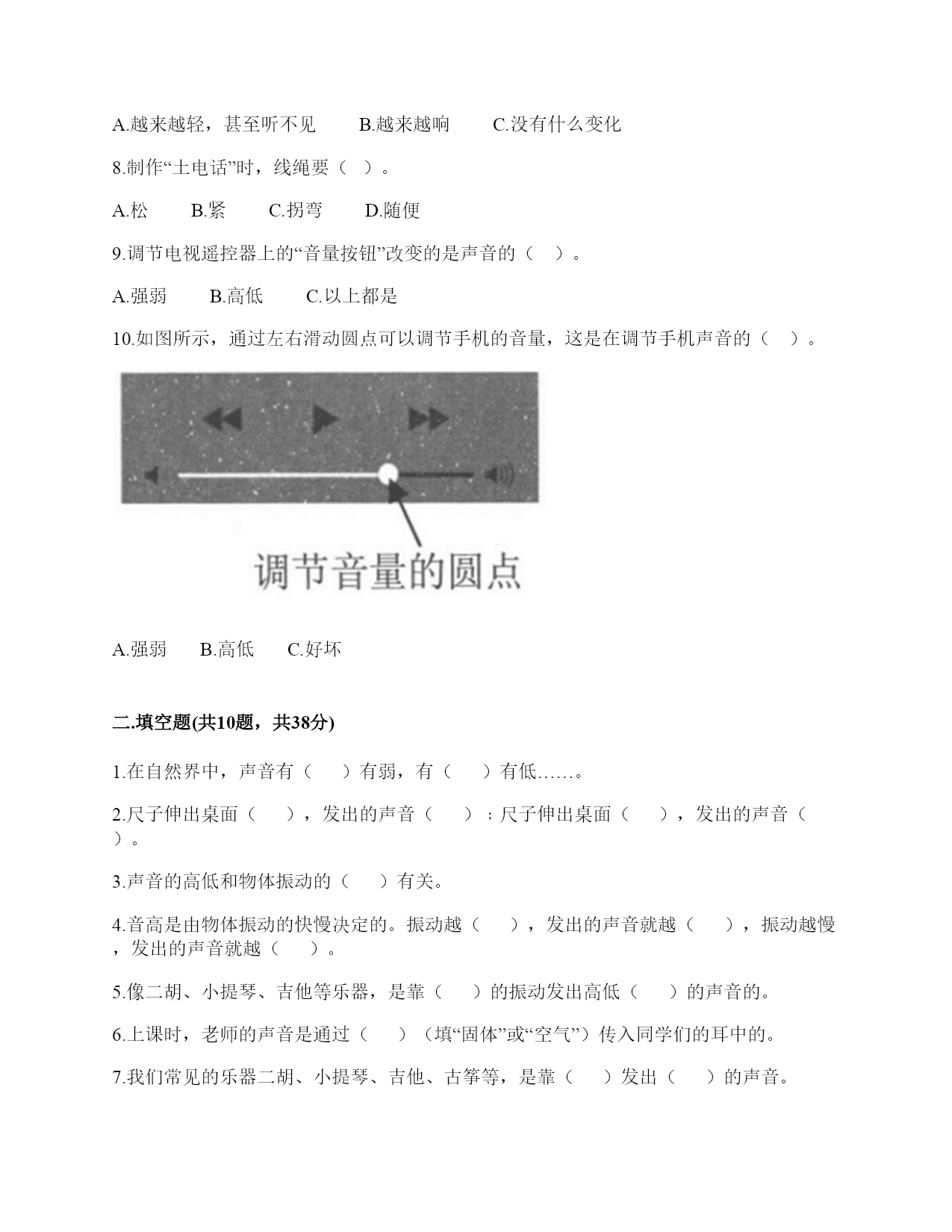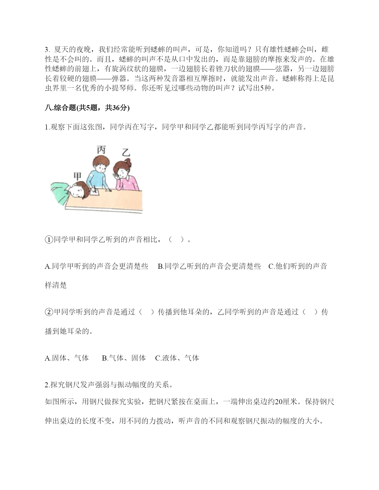 小学科学《声音》练习题一.选择题(共10题,共20分)1.敲击下面的杯子,能发出高音的是()。2.外耳由耳郭和()组成。A.鼓膜B.外耳道C.听小骨3.在弹吉他时,若想要使它发出的声音强一些,可以()。A.换新吉他B.用的力气大一些C.调节弦的松紧度4.当你在打哈欠的时候,会听不清或听不到别人对你说话,重要原因是打哈欠影响了()。A.鼓膜的振动B.听小骨的振动C.耳廓的振动D.听觉神经的振动5.下面方法不能使下图中的钢尺发出声音的是()。A.拉伸钢尺B.拍打钢尺C.敲击钢尺6.下列物体中,声音在()中传播的速度最快。A.钢铁B.水C.空气7.当我们把玻璃钟罩里的空气逐渐抽掉时,钟罩里的闹钟铃声会()。A.越来越轻,甚至听不见B.越来越响C.没有什么变化8.制作“土电话”时,线绳要()。A.松B.紧C.拐弯D.随便9.调节电视遥控器上的“音量按钮”改变的是声音的()。A.强弱B.高低C.以上都是10.如图所示,通过左右滑动圆点可以调节手机的音量,这是在调节手机声音的()。A.强弱B.高低C.好坏二.填空题(共10题,共38分)1.在自然界中,声音有()有弱,有()有低……。2.尺子伸出桌面(),发出的声音()﹔尺子伸出桌面(),发出的声音()。3.声音的高低和物体振动的()有关。4.音高是由物体振动的快慢决定的。振动越(),发出的声音就越(),振动越慢,发出的声音就越()。5.像二胡、小提琴、吉他等乐器,是靠()的振动发出高低()的声音的。6.上课时,老师的声音是通过()(填“固体”或“空气”)传入同学们的耳中的。7.我们常见的乐器二胡、小提琴、吉他、古筝等,是靠()发出()的声音。8.内耳中有一个像蜗牛模样的物体,我们称它为()。里面充满了液体、布满了神经末梢。9.玻璃罩中的空气被抽掉了,形成()后,我们就只能看见闹钟的铃在动,却听不到它的声音。10.探索尺子的音高变化实验中,尺子伸出桌面的长度越长,发出的声音越(),振动得越()。三.判断题(共10题,共20分)1.声音能在液体、固体中传播,在气体中不能传播。()2.我们听到的声音有的强有的弱。()3.我国传统乐器古筝上的弦长短不一,弦越短,发出的声音越高。()4.听小骨是内耳的一部分。()5.在月球上,如果不借助其他装置,将听不到任何声音,这是因为月球上没有空气。()6.耳朵分为外耳、中耳、内耳三部分。()7.吹口哨可以发出声音。()8.声音的大小在科学上叫声音的强弱,声音的高低我们称为音高。()9.钢尺伸出桌面的长度越长,振动幅度越大。()10.我们听到的各种声音都是靠空气传播的,固体和液体不能传播声音。()四.连线题(共1题,共5分)1.将下列声音与产生的原因连线。说话交流空气柱振动管乐器奏乐弦振动弦乐器奏乐翅膀振动音响放音乐声带振动蚊子的叫声扬声器振动五.填表题(共2题,共18分)1.猜想:声音强弱与物体振动幅度有关,振幅越大,声音越();物体振幅越小,声音越()。实验器材:钢尺,桌子改变的条件:()不改变的条件:()填写表格。实验结论是什么?2.观察物体是否发声。六.简答题(共5题,共25分)1.闪电和雷同时在云层产生,在夏季的雨夜,我们总是先看到闪电,后听到雷声,请对这种现象进行合理解释。2.停止敲锣后,在一段时间内还能听到锣声,这是为什么?3.在相同力量下,能影响弦发出高低不同声音的因素有哪些?4.向水壶中倒水,随着水越到越多,听到的声音高低不同,倒的水越多,声音越高,其科学原理是什么?5.我们怎样保护自己的听力?七.材料题(共3题,共16分)1.小明有3根长短相同,粗细不同的钢管,小丽说:“我可以闭上眼睛,只通过用相同的力敲击钢管就可以判断它们的粗细。”请解释其中的原理。2.用三个塑料袋分别装上沙子、水和空气封口,将三个塑料袋分别放在桌子上,一只耳朵轻轻地贴在塑料袋上,捂住另一只耳朵。在距离一臂远处,用铅笔上的橡皮轻轻敲击桌面。请分析隔着哪个塑料袋听到的声音效果好,并试着排序。3.夏天的夜晚,我们经常能听到蟋蟀的叫声,可是,你知道吗?只有雄性蟋蟀会叫,雌性是不会叫的。而且,蟋蟀的叫声不是从口中发出的,而是靠翅膀的摩擦来发声的。在雄性蟋蟀的前翅上,有旋涡纹状的翅膜,一边翅膀长着锉刀状的翅膜——弦器,另一边翅膀长着较硬的翅膜——弹器。当这两种发音器相互摩擦时,就能发出声音。蟋蟀称得上是昆虫界里一名优秀的小提琴师。你还听见过哪些动物的叫声?试写出5种。八.综合题(共5题,共36分)1.观察下面这张图,同学丙在写字,同学甲和同学乙都能听到同学丙写字的声音。①同学甲和同学乙听到的声音相比,()。A.同学甲听到的声音会更清
