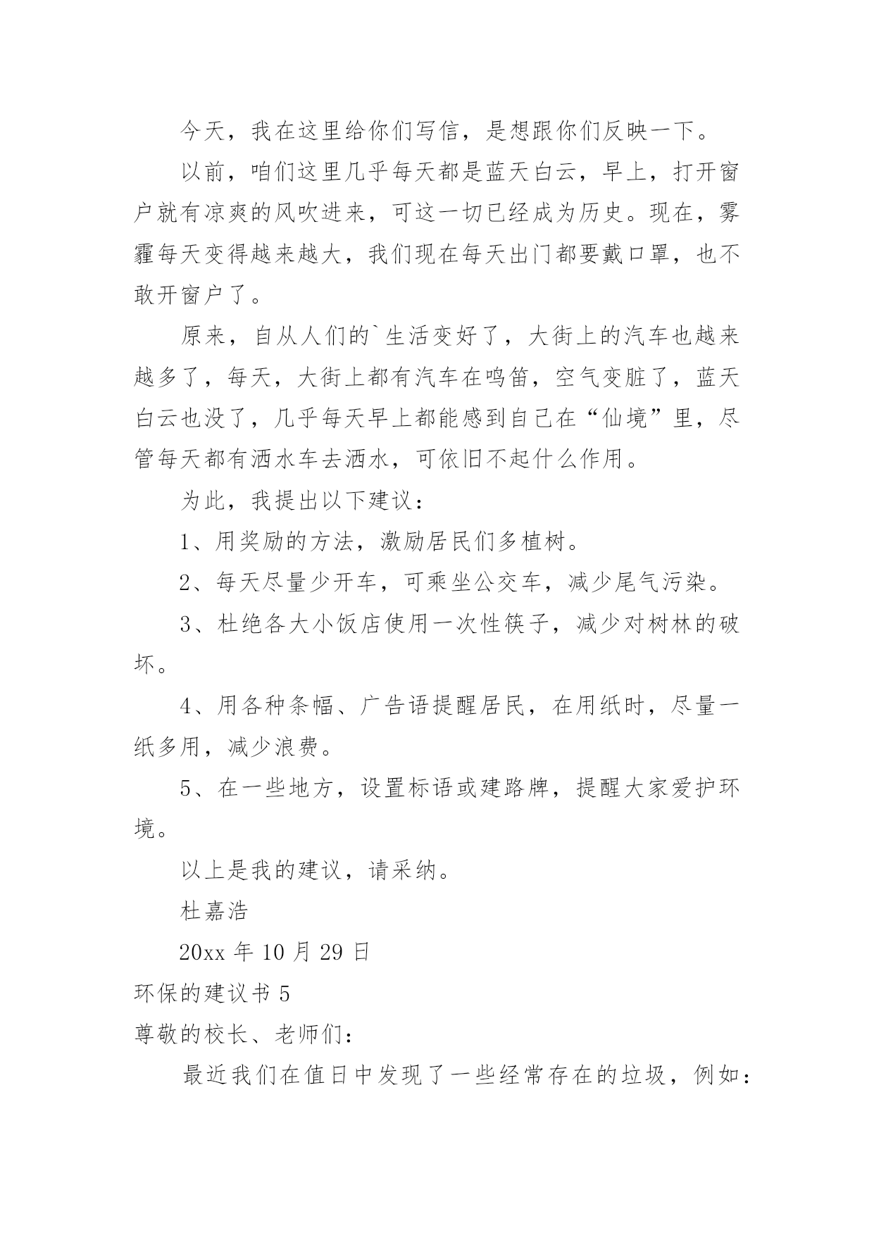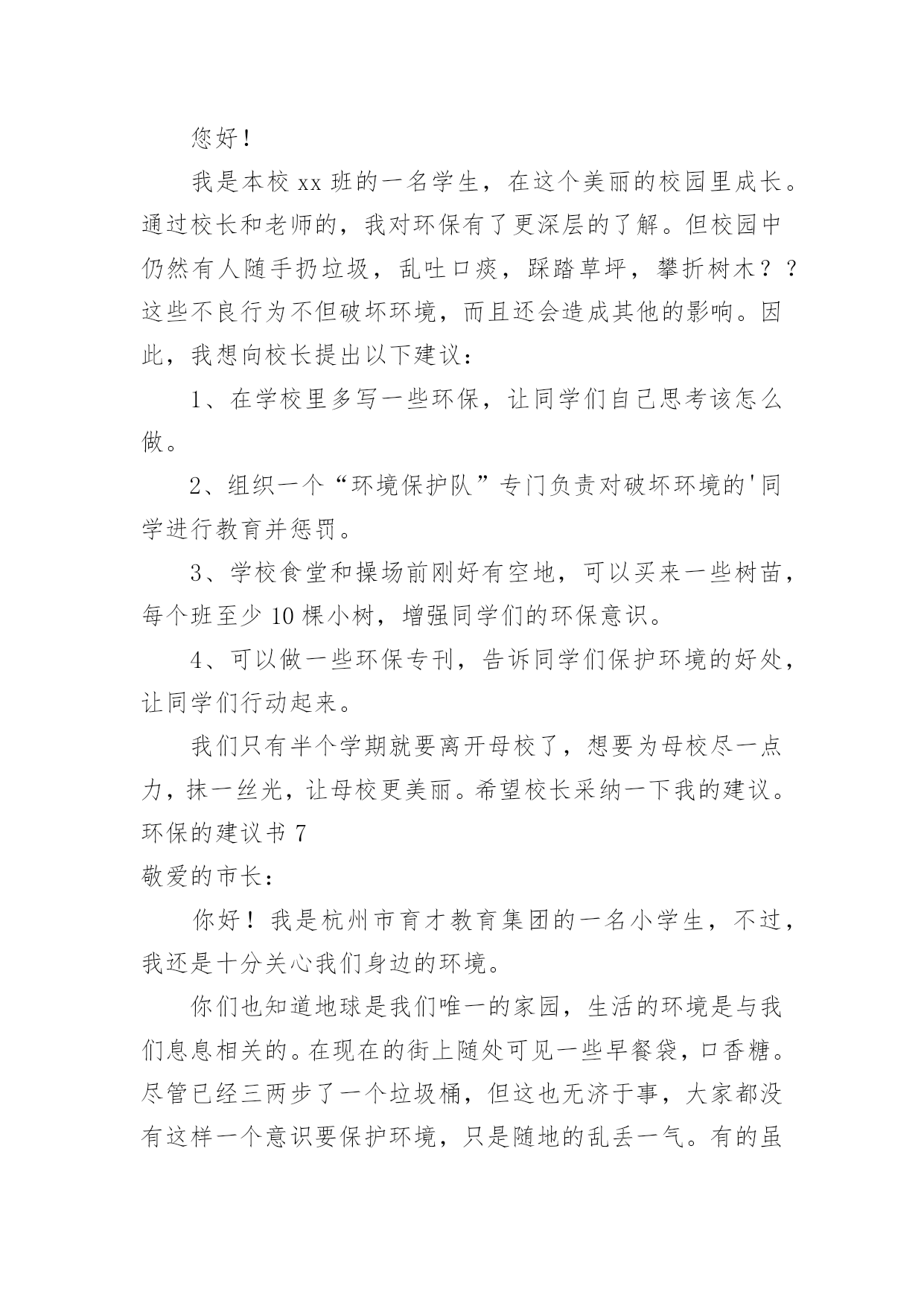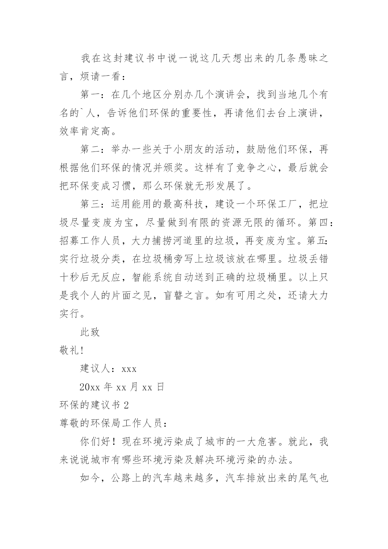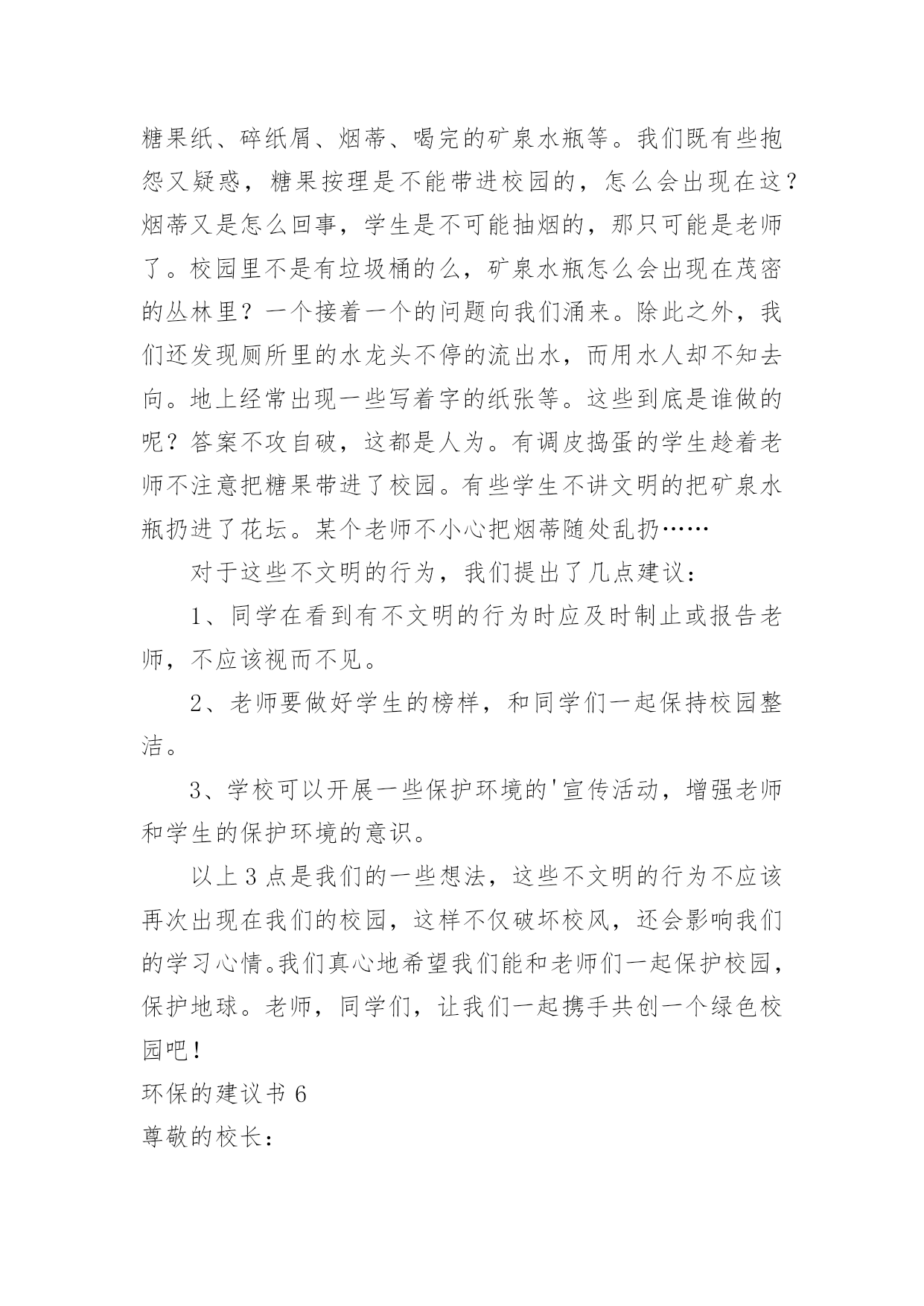 环保的建议书环保的建议书(15篇)随着社会不断地进步,很多地方都会使用到建议书,建议书是一连串的管理实践,往往有着至关重要的作用。那么,怎么去写建议书呢?下面是小编精心整理的环保的建议书,仅供参考,希望能够帮助到大家。环保的建议书1尊敬的环保局局长:您好!我是一名六年级的小学生。以前我们的李渡镇是一片鸟语花香,人们都有一个点好的工作环境,学习环境,但最近,人们开始随手乱扔垃圾,河水也被严重污染,这种情况肯定不止的李渡镇一个地方哟有,别的城市的情况也不会比这里好到哪里去。原因何在?在我看来,是因为现在人们的环保意识渐渐减弱了,认为环保和自己没关系,反正,不是自己家,脏就让它脏点。而小学生们都纷纷效仿大人,结果,一个镇有环保意识的人大大减少,导致之前的良好环境,之前这么多人共创出来的良好环境就毁在了这里。这就是“十人造树一人毁”的道理啊!难道您,环保局的一局之长,会不知道这个问题吗?我在这封建议书中说一说这几天想出来的几条愚昧之言,烦请一看:第一:在几个地区分别办几个演讲会,找到当地几个有名的`人,告诉他们环保的重要性,再请他们去台上演讲,效率肯定高。第二:举办一些关于小朋友的活动,鼓励他们环保,再根据他们环保的情况并颁奖。这样有了竞争之心,最后就会把环保变成习惯,那么环保就无形发展了。第三:运用能用的最高科技,建设一个环保工厂,把垃圾尽量变废为宝,尽量做到有限的资源无限的循环。第四:招募工作人员,大力捕捞河道里的垃圾,再变废为宝。第五:实行垃圾分类,在垃圾桶旁写上垃圾该放在哪里。垃圾丢错十秒后无反应,智能系统自动送到正确的垃圾桶里。以上只是我个人的片面之见,盲瞽之言。如有可用之处,还请大力实行。此致敬礼!建议人:xxx20xx年xx月xx日环保的建议书2尊敬的环保局工作人员:你们好!现在环境污染成了城市的一大危害。就此,我来说说城市有哪些环境污染及解决环境污染的办法。如今,公路上的汽车越来越多,汽车排放出来的尾气也越来越多。殊不知,汽车排出来的'尾气会危害人体健康。所以,我建议环保局的工作人员多在公路边植树或种植一些花花草草,因为树和花草能通过光合作用吸收二氧化碳,排放出氧气,并能对空气进行净化。夏天的时候,这些植物还能给人们带来凉爽。还有,有的人喜欢乱扔垃圾。我建议环保局的工作人员可以每隔十几米安置一个垃圾箱或是设置一个禁止乱扔垃圾的警示牌。为了达到好的效果,你们还可以挑选一些志愿者当文明倡导员,向过往行人宣传乱扔垃圾的害处并阻止人们乱扔垃圾。保护环境,人人有责!只要我们积极行动起来,环境污染就能得到有效治理。祝身体健康,万事如意!xxx20xx年11月26日环保的建议书3亲爱的同学们:你们好!当我们坐在宽敞明亮的教室时,当我们走在宽阔的大道时,你们是否发现发生在我们身边的问题?如果在干干净净的教室中发现有一堆纸屑,没有人会去把它捡起来;在过道上发现了垃圾,也不会随手捡起垃圾箱内。同学们这些垃圾不但让我们生活的环境不美观,还会破坏我们的空气。在洗手间里,洗完手后不会随手把水龙头给关好;走出教室不会随手关灯,关电器。同学们,这些能源是我们生活中不可缺少的'一部分,水对我们尤其重要。还有同学们,这就是我们身边许多的小问题。这些问题在我们身边随处可见,说不定你们已经见过,只是没有保护环境,珍惜资源的意识而已。同学们,为了我们生活家园更加美丽干净,我在这里给大家提几点建议:1、如果在过道或教室发现了纸屑,垃圾,请随手把它们扔入垃圾箱内。2、如果全班都离开了教室,请最后离开教室的那个同学把教室中的空调,电灯这些电器的电源都关闭掉。3、如果在洗水间内,发现水龙头没关或没关紧,请你随手将它关好。4、吃午餐和晚餐的时候请同学们尽量将它吃完,不要浪费。同学们,这个世界是我们的家园,我们应该尽自己最大的力量去保护它,而不是去破坏它。你们说,对吗?此致敬礼!建议人:XX20xx年2月5日环保的建议书4环保部门的工作人员:你们好!今天,我在这里给你们写信,是想跟你们反映一下。以前,咱们这里几乎每天都是蓝天白云,早上,打开窗户就有凉爽的风吹进来,可这一切已经成为历史。现在,雾霾每天变得越来越大,我们现在每天出门都要戴口罩,也不敢开窗户了。原来,自从人们的`生活变好了,大街上的汽车也越来越多了,每天,大街上都有汽车在鸣笛,空气变脏了,蓝天白云也没了,几乎每天早上都能感到自己在“仙境”里,尽管每天都有洒水车去洒水,可依旧不起什么作用。为此,我提出以下建议:1、用奖励的方法,激励居民们多植树。2、每天尽量少开车,可乘坐公交车,减少尾气污染。3、杜绝各大小饭店使用一次性筷子,减少对树林的破坏。4、用各种条幅、广告语提醒居民,在用纸时,尽量一纸多用,减少浪费。5、在一些地方,设置标语或建路牌,提醒大家爱护环境。以上是我的建议,请采纳。杜嘉浩20xx年10月2