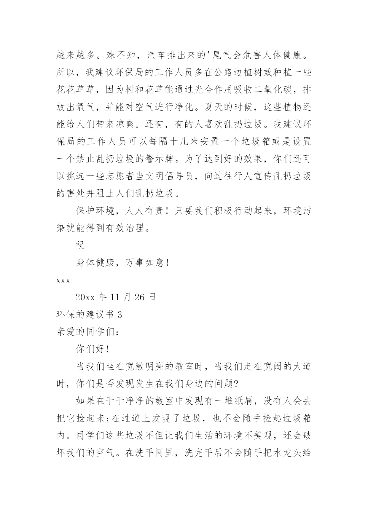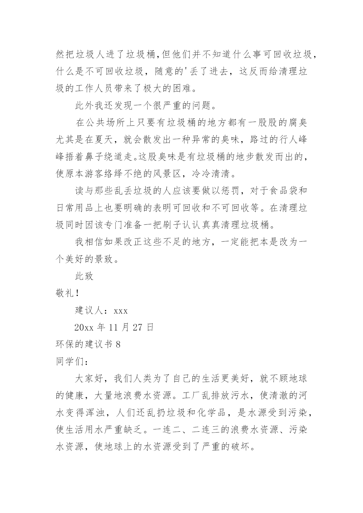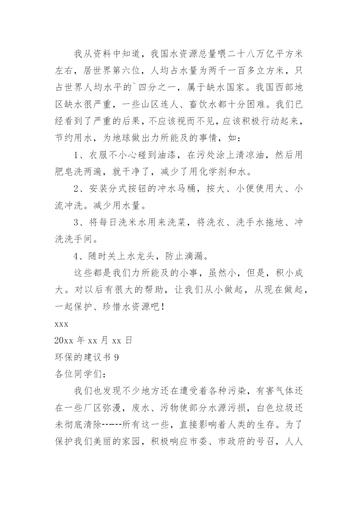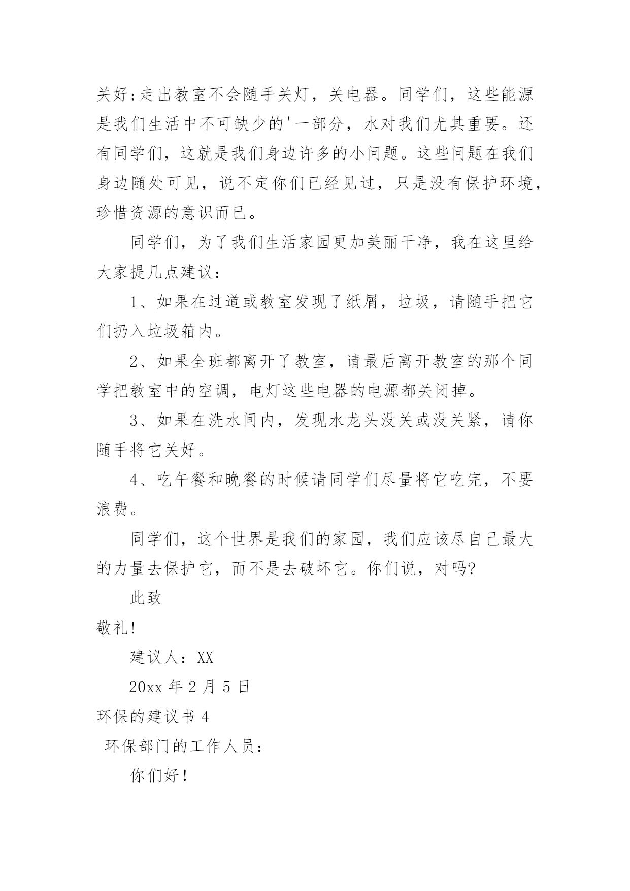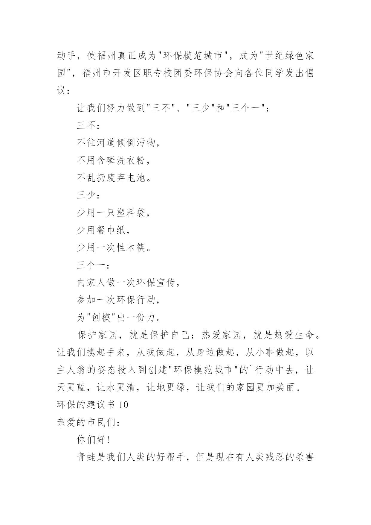 环保的建议书环保的建议书(15篇)随着社会不断地进步,很多地方都会使用到建议书,建议书是一连串的管理实践,往往有着至关重要的作用。那么,怎么去写建议书呢?下面是小编精心整理的环保的建议书,仅供参考,希望能够帮助到大家。环保的建议书1尊敬的环保局局长:您好!我是一名六年级的小学生。以前我们的李渡镇是一片鸟语花香,人们都有一个点好的工作环境,学习环境,但最近,人们开始随手乱扔垃圾,河水也被严重污染,这种情况肯定不止的李渡镇一个地方哟有,别的城市的情况也不会比这里好到哪里去。原因何在?在我看来,是因为现在人们的环保意识渐渐减弱了,认为环保和自己没关系,反正,不是自己家,脏就让它脏点。而小学生们都纷纷效仿大人,结果,一个镇有环保意识的人大大减少,导致之前的良好环境,之前这么多人共创出来的良好环境就毁在了这里。这就是“十人造树一人毁”的道理啊!难道您,环保局的一局之长,会不知道这个问题吗?我在这封建议书中说一说这几天想出来的几条愚昧之言,烦请一看:第一:在几个地区分别办几个演讲会,找到当地几个有名的`人,告诉他们环保的重要性,再请他们去台上演讲,效率肯定高。第二:举办一些关于小朋友的活动,鼓励他们环保,再根据他们环保的情况并颁奖。这样有了竞争之心,最后就会把环保变成习惯,那么环保就无形发展了。第三:运用能用的最高科技,建设一个环保工厂,把垃圾尽量变废为宝,尽量做到有限的资源无限的循环。第四:招募工作人员,大力捕捞河道里的垃圾,再变废为宝。第五:实行垃圾分类,在垃圾桶旁写上垃圾该放在哪里。垃圾丢错十秒后无反应,智能系统自动送到正确的垃圾桶里。以上只是我个人的片面之见,盲瞽之言。如有可用之处,还请大力实行。此致敬礼!建议人:xxx20xx年xx月xx日环保的建议书2尊敬的环保局工作人员:你们好!现在环境污染成了城市的一大危害。就此,我来说说城市有哪些环境污染及解决环境污染的办法。如今,公路上的汽车越来越多,汽车排放出来的尾气也越来越多。殊不知,汽车排出来的'尾气会危害人体健康。所以,我建议环保局的工作人员多在公路边植树或种植一些花花草草,因为树和花草能通过光合作用吸收二氧化碳,排放出氧气,并能对空气进行净化。夏天的时候,这些植物还能给人们带来凉爽。还有,有的人喜欢乱扔垃圾。我建议环保局的工作人员可以每隔十几米安置一个垃圾箱或是设置一个禁止乱扔垃圾的警示牌。为了达到好的效果,你们还可以挑选一些志愿者当文明倡导员,向过往行人宣传乱扔垃圾的害处并阻止人们乱扔垃圾。保护环境,人人有责!只要我们积极行动起来,环境污染就能得到有效治理。祝身体健康,万事如意!xxx20xx年11月26日环保的建议书3亲爱的同学们:你们好!当我们坐在宽敞明亮的教室时,当我们走在宽阔的大道时,你们是否发现发生在我们身边的问题?如果在干干净净的教室中发现有一堆纸屑,没有人会去把它捡起来;在过道上发现了垃圾,也不会随手捡起垃圾箱内。同学们这些垃圾不但让我们生活的环境不美观,还会破坏我们的空气。在洗手间里,洗完手后不会随手把水龙头给关好;走出教室不会随手关灯,关电器。同学们,这些能源是我们生活中不可缺少的'一部分,水对我们尤其重要。还有同学们,这就是我们身边许多的小问题。这些问题在我们身边随处可见,说不定你们已经见过,只是没有保护环境,珍惜资源的意识而已。同学们,为了我们生活家园更加美丽干净,我在这里给大家提几点建议:1、如果在过道或教室发现了纸屑,垃圾,请随手把它们扔入垃圾箱内。2、如果全班都离开了教室,请最后离开教室的那个同学把教室中的空调,电灯这些电器的电源都关闭掉。3、如果在洗水间内,发现水龙头没关或没关紧,请你随手将它关好。4、吃午餐和晚餐的时候请同学们尽量将它吃完,不要浪费。同学们,这个世界是我们的家园,我们应该尽自己最大的力量去保护它,而不是去破坏它。你们说,对吗?此致敬礼!建议人:XX20xx年2月5日环保的建议书4环保部门的工作人员:你们好!今天,我在这里给你们写信,是想跟你们反映一下。以前,咱们这里几乎每天都是蓝天白云,早上,打开窗户就有凉爽的风吹进来,可这一切已经成为历史。现在,雾霾每天变得越来越大,我们现在每天出门都要戴口罩,也不敢开窗户了。原来,自从人们的`生活变好了,大街上的汽车也越来越多了,每天,大街上都有汽车在鸣笛,空气变脏了,蓝天白云也没了,几乎每天早上都能感到自己在“仙境”里,尽管每天都有洒水车去洒水,可依旧不起什么作用。为此,我提出以下建议:1、用奖励的方法,激励居民们多植树。2、每天尽量少开车,可乘坐公交车,减少尾气污染。3、杜绝各大小饭店使用一次性筷子,减少对树林的破坏。4、用各种条幅、广告语提醒居民,在用纸时,尽量一纸多用,减少浪费。5、在一些地方,设置标语或建路牌,提醒大家爱护环境。以上是我的建议,请采纳。杜嘉浩20xx年10月2