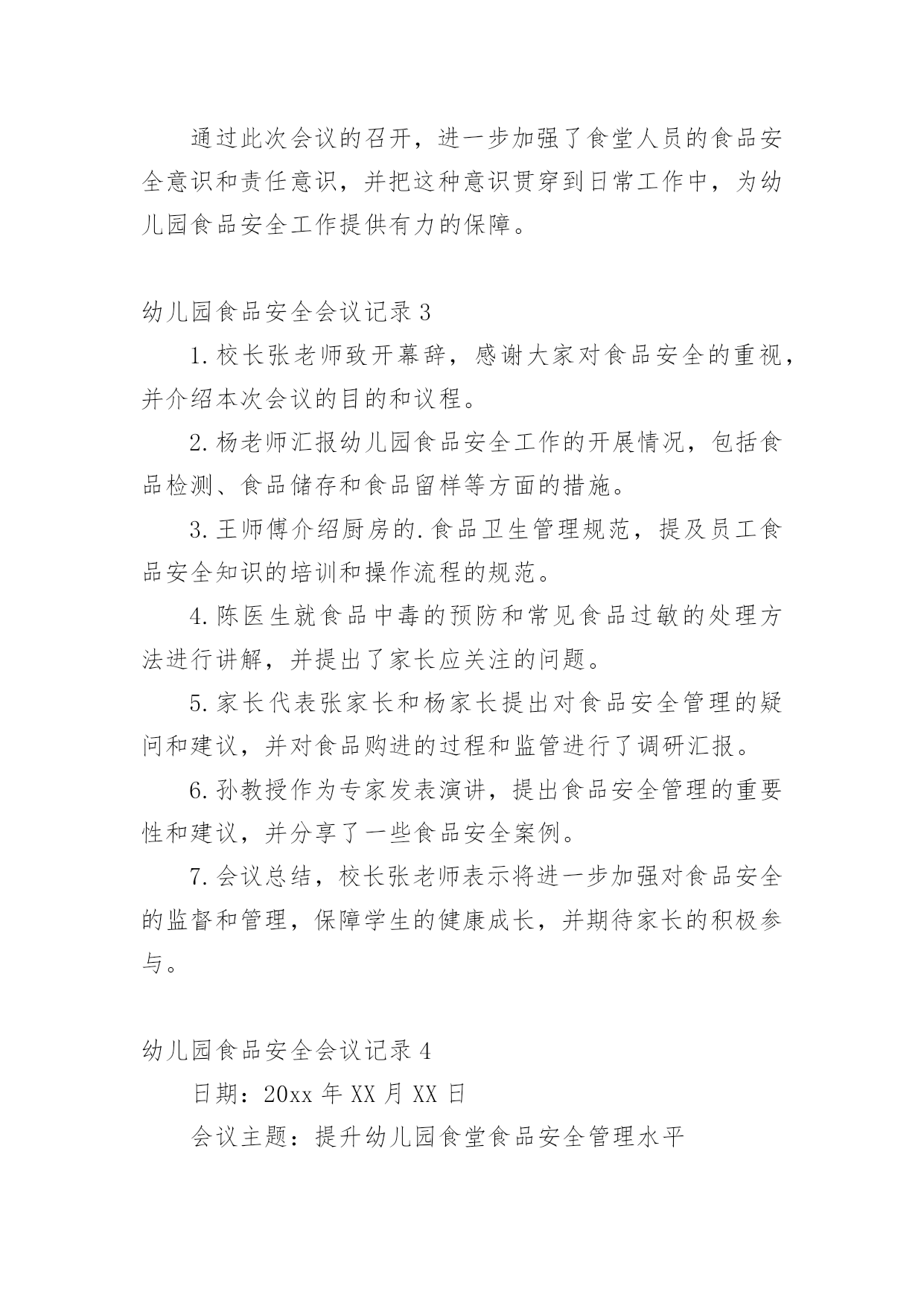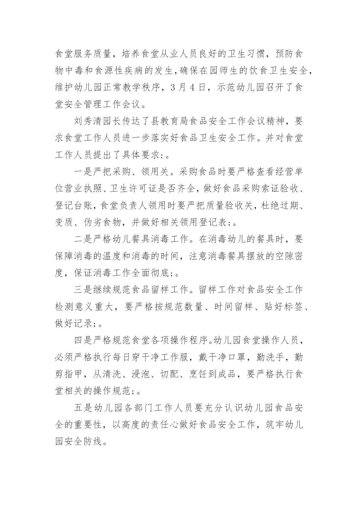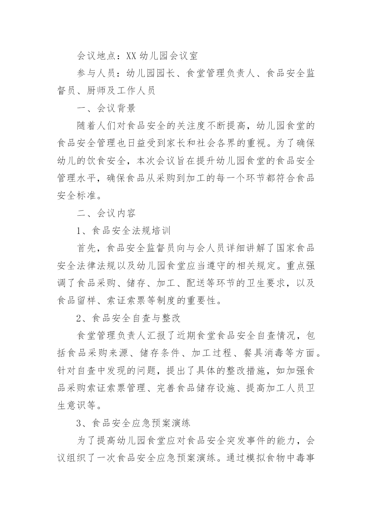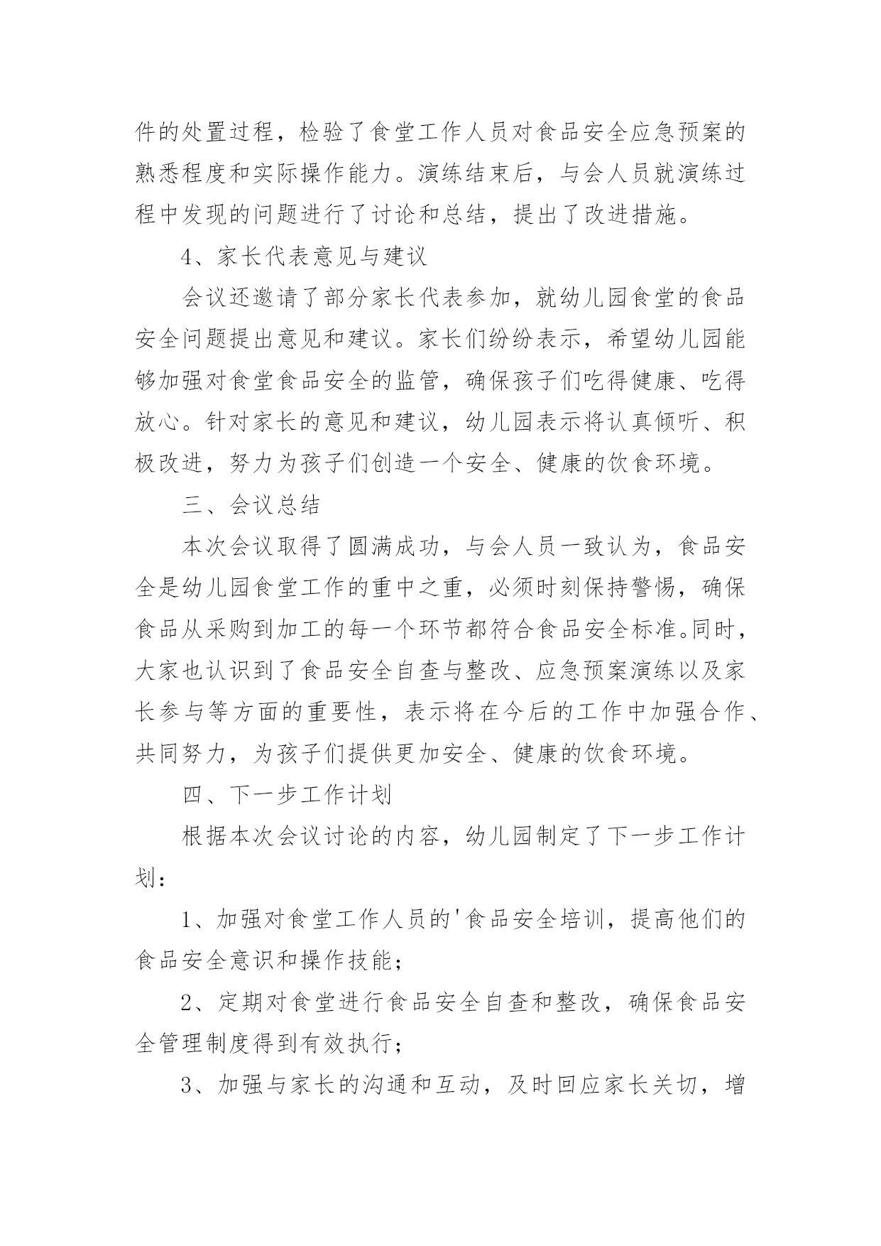 幼儿园食品安全会议记录幼儿园食品安全会议记录14篇(必备)幼儿园食品安全会议记录1日期:XX年XX月XX日地点:幼儿园会议室参与人员:幼儿园园长、食品安全管理员、食堂厨师、保育员及相关工作人员会议主题:加强幼儿园食品安全生产,确保幼儿饮食健康会议内容:1、园长致辞:园长首先感谢各位工作人员的辛勤付出,并强调食品安全对于幼儿园的重要性。她指出,食品安全直接关系到幼儿的身体健康和生命安全,因此我们必须高度重视,确保每一道食品都安全、卫生、营养。2、食品安全管理员报告:食品安全管理员对近期食品安全检查情况进行了总结。她提到,虽然整体上食品安全状况良好,但仍存在一些细节问题,如部分食材存放不够规范、厨房卫生需进一步加强等。她建议加强员工培训,提高食品安全意识。3、厨师发言:厨师表示,他们会严格按照食品安全标准操作,确保食材新鲜、烹饪卫生。同时,他们也会不断创新菜品,为孩子们提供营养均衡、口味多样的美食。4、保育员意见:保育员们纷纷表示,他们会密切关注孩子们的饮食情况,及时反馈给食堂,以便调整菜品和口味,满足孩子们的需求。同时,他们也会教育孩子们养成良好的饮食习惯,不挑食、不偏食。5、制定改进措施:针对存在的问题,会议制定了以下改进措施:一是加强食材采购管理,确保食材来源可靠、质量上乘;二是加强厨房卫生管理,定期清洁消毒,确保烹饪环境干净卫生;三是加强员工培训,提高食品安全意识和操作技能;四是加强与家长的沟通,定期公布食谱和食品安全检查结果,让家长放心。6、园长总结:园长最后强调,食品安全是幼儿园工作的.重中之重,我们必须时刻绷紧这根弦,确保万无一失。她要求全体员工要认真执行改进措施,共同为孩子们的健康成长保驾护航。会议结束:会议在热烈的掌声中圆满结束。幼儿园食品安全会议记录2加强幼儿园食堂饮食卫生管理,防止食源性疾病发生,是后勤工作的重中之重。为了规范食堂管理,确保伙食质量,进一步调动各方面的积极性,搞好学校饭堂工作,更好地为师生服务,保健老师主持召开食堂饮食卫生工作会议,希望相关食堂人员做好幼儿园食堂会议记录。参加会议的人员有园领导、保健医生、食堂事务长(兼采购员)、老师代表、保育员代表、家长代表、食堂仓库保管员等十多人。会议上,代表们对开学一个多月来的幼儿伙食情况进行了小结、交流,并积极地对一些好的建议与发现的问题进行幼儿园食堂会议记录。会议对食堂人员的工作提出了具体要求:1、食堂工作人员要加强食品安全卫生意识,保证食堂的食品安全卫生,保持食堂的良好卫生环境。2、在食品加工过程中要遵守食品卫生操作规范,符合食品卫生法的要求。3、加强卫生消毒工作,幼儿餐具做到“一用一消毒”并做好菜肴留样及各项记录工作。4、膳食委员会要协助后勤处做好食堂管理工作,要及时了解和反映学生对食堂提出的意见和建议,接受学生的投诉。5、定期检查食堂的卫生情况,及时反映可能发生的食品卫生、安全隐患。6、不定时检查学生食堂饭菜质量,促进食堂达到保质保量的要求。7、组织教师维护食堂进餐秩序,确保学生安全进餐,文明进餐。1、制定花样食谱。根据市场供应情况,食谱每两周调换1次,适当调整花样。对食谱要求:(1)、根据市场供应情况制定食谱。注意蛋白质的互补作用,充分利用豆制品。(4)、制定带量食谱是在花样食谱的基础上,把膳食计划中各类食物的每周用量全部反映在食谱中,定出每餐或每日每人的各种食物原料的用量。家长代表反映对幼儿园的伙食基本满意,肯定了幼儿园的饭菜的确受到孩子们的喜爱。尽量的把幼儿的伙食做到精致化、多样化,另外就是继续注意营养配比,并认真做好幼儿园食堂会议记录。1、保健老师分别对幼儿膳食的营养结构、菜谱编排、幼儿膳食规范烹饪制作过程进行了全方位地介绍。2、财务人员也对幼儿园伙食费的使用情况进行了公布与解析。3、参会代表表示:通过共同讨论幼儿膳食问题,深深地感受到我园非常重视孩子的膳食营养。在充分肯定了幼儿园膳食工作的同时也对如何更科学地改善幼儿伙食、合理地使用伙食经费提出自己宝贵的意见和建议。代表们对幼儿的伙食质量给予充分肯定:1、一致反映幼儿的.饭菜在咸甜、粗细、干稀、米面等方面搭配合理,营养丰富,健康科学。2、对菜肴提出了更高的要求,如根据幼儿不同年龄的咀嚼功能、幼儿对各类菜肴的喜好程度以及季节变化等,对菜肴的烹调方式提出了不同的要求。3、这些来自一线老师、幼儿家长的伙食反馈信息,为切实提高幼儿伙食质量提供了重要依据。4、代表们纷纷表示要家园合作,只有让幼儿吃饱、吃好,才能使幼儿健康成长。“没有最好,只有更好”,这是全园膳食工作的目标和追求。相信通过这次会议,全园的伙食质量、服务质量会锦上添花,更上一层楼。通过会议,增强了食堂工作人员的食品安全责任意识,提高了幼儿饮食质量,提高食堂人员自我管理能力,并确保了当下时节幼儿饮食安全。希望相关人员认真做好幼儿园食