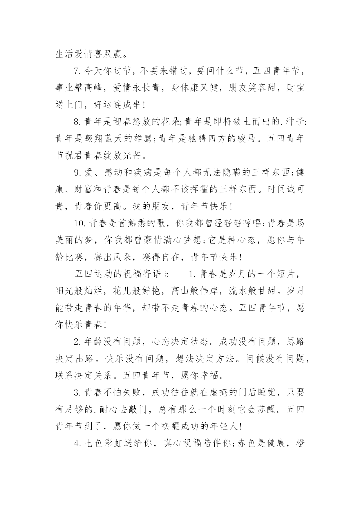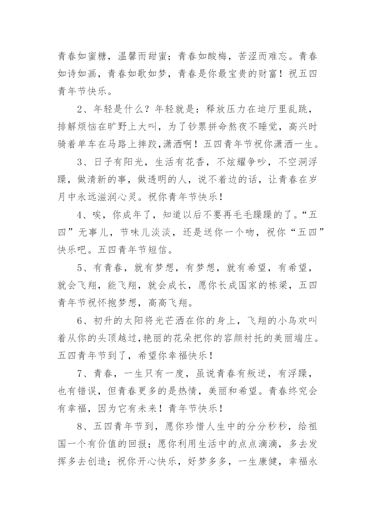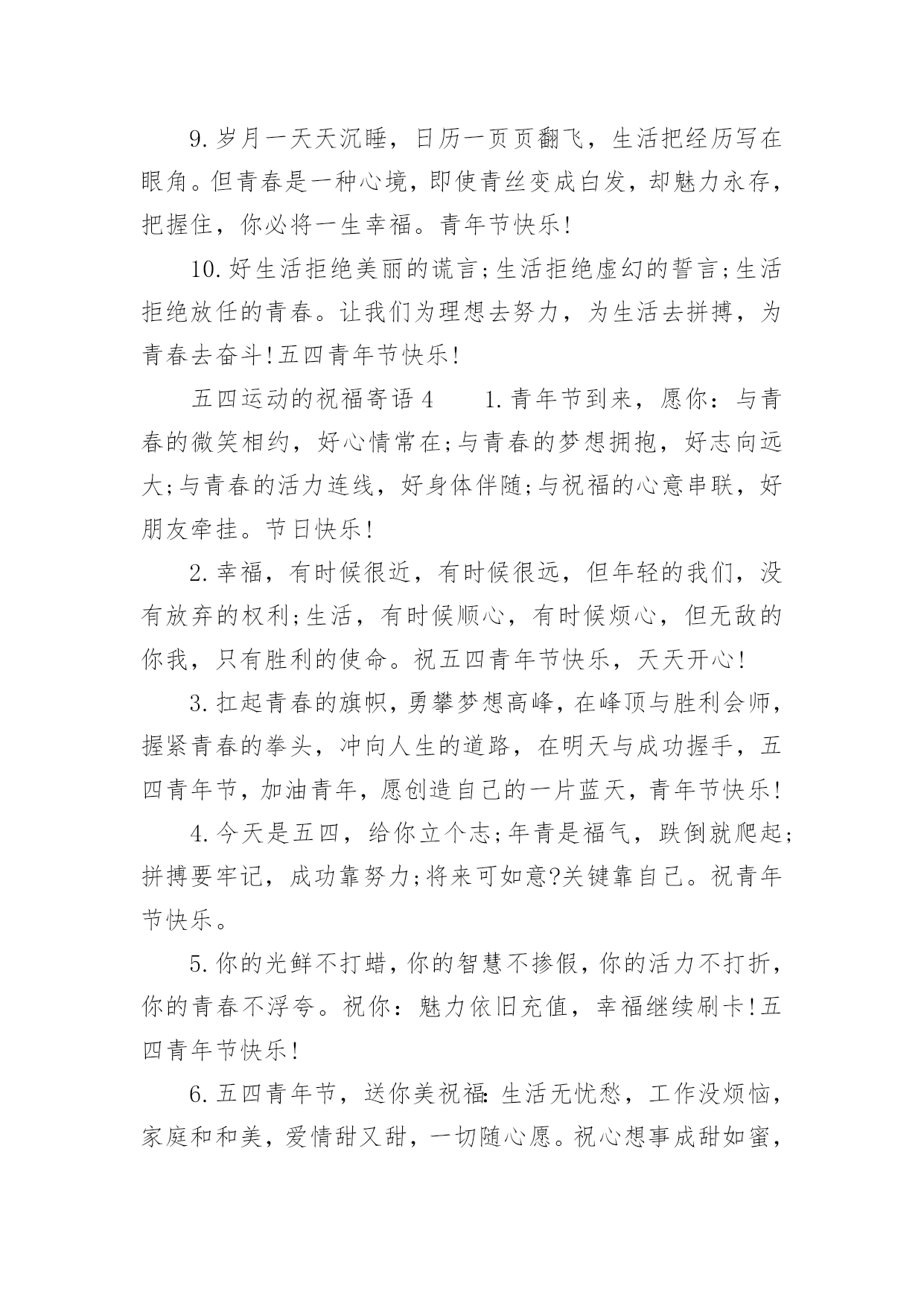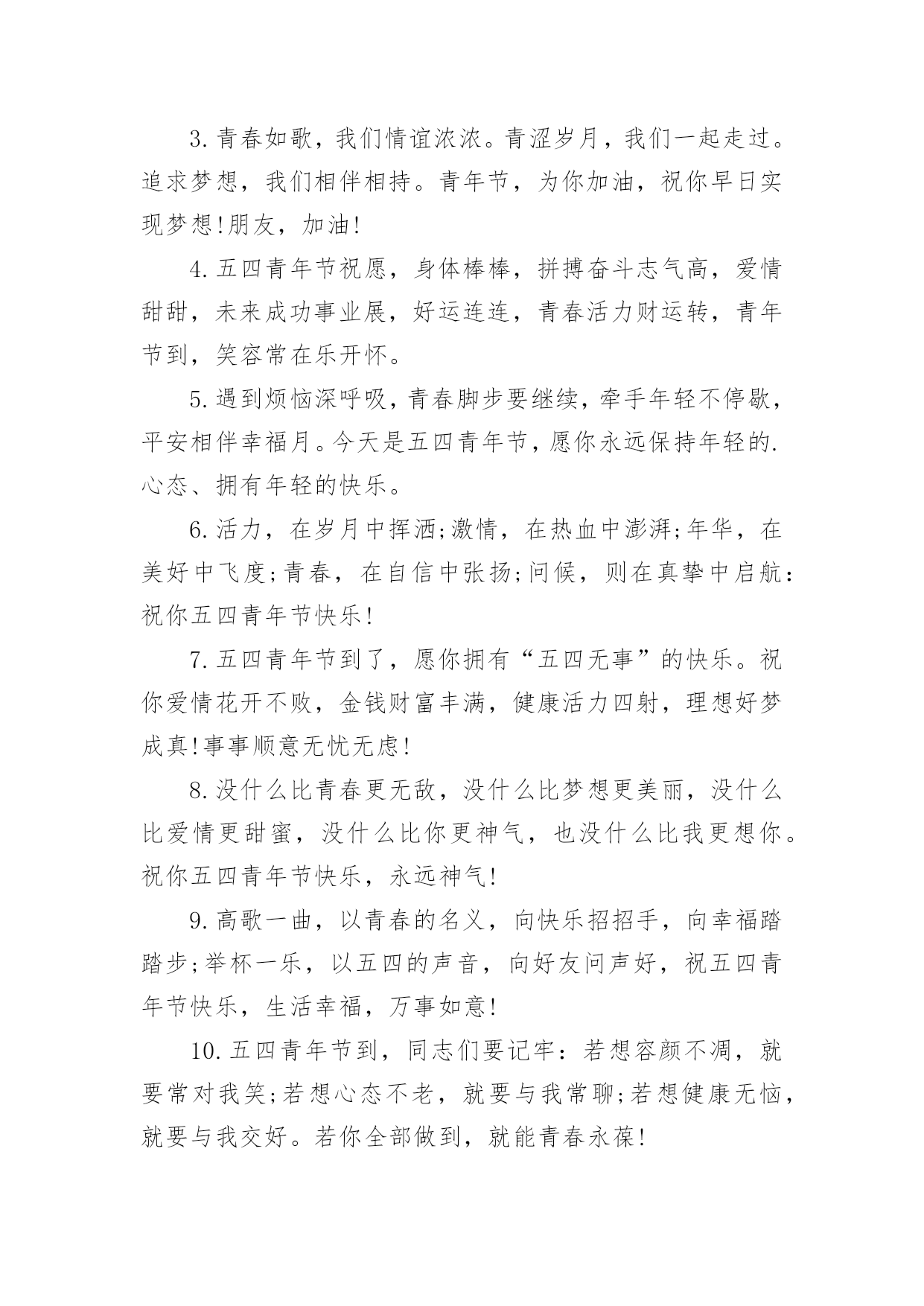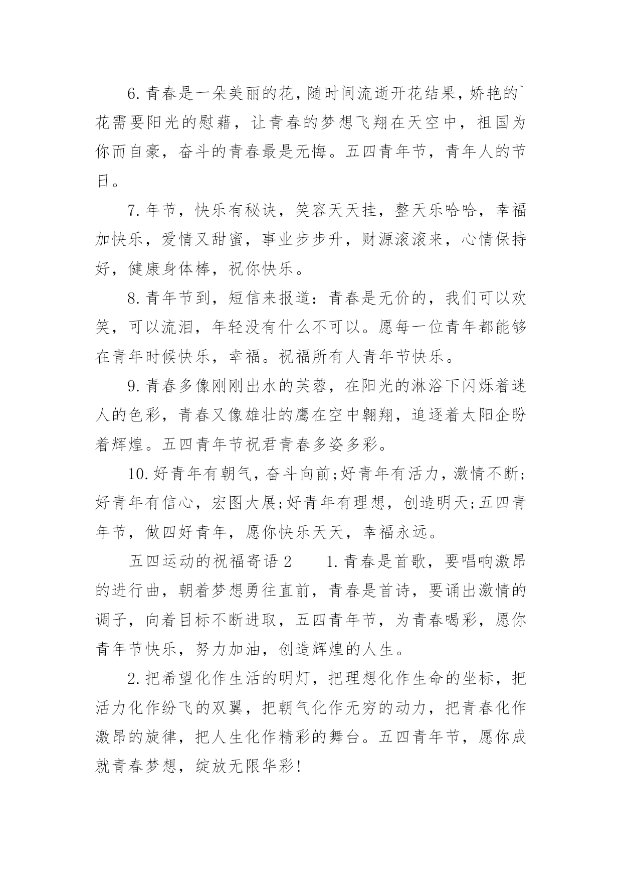 五四运动的祝福寄语五四运动的祝福寄语大全在平平淡淡的日常中,大家或多或少都会用到过寄语吧,寄语的种类很多,可分为名人寄语、圣诞寄语、新年寄语、班主任寄语、爱情寄语等。那么你有真正了解过寄语吗?下面是小编收集整理的五四运动的祝福寄语,仅供参考,欢迎大家阅读。五四运动的祝福寄语11.没有甜言蜜语,没有奢华礼物,有的只是此时响起的短信铃声,有的只是发自内心的真诚祝福,青年节到了,愿青春年少的你在这个属于你的节日里绽放光彩!2.五四青年节,温馨送祝福。五月风吹拂,送健康平安。四时光映照,降吉祥如意。青春梦笼罩,生激情万丈。年华似水流,愿珍惜珍重。3.青春,如一轮朝阳冉冉升起,充满希望,充满活力。五四青年节,送你一轮青春的朝阳,愿你在青春的舞台上尽情释放活力,尽情展示自我,尽情缔造精彩!4.青年协会认为:你已不能过五四青年节了,但鉴于你心态年轻风采依旧,具备年轻人应有的特征,所以协会决定给你颁发祝福一条,以资鼓励:祝你五四快乐,永远年轻!5.年轻是最大的财富,青春是最大的赌注,奋斗是最大的胜数。让梦想乘着年轻的翅膀飞翔;让短信载着温馨的祝福到达。祝你五四青年节快乐。6.青春是一朵美丽的花,随时间流逝开花结果,娇艳的`花需要阳光的慰藉,让青春的梦想飞翔在天空中,祖国为你而自豪,奋斗的青春最是无悔。五四青年节,青年人的节日。7.年节,快乐有秘诀,笑容天天挂,整天乐哈哈,幸福加快乐,爱情又甜蜜,事业步步升,财源滚滚来,心情保持好,健康身体棒,祝你快乐。8.青年节到,短信来报道:青春是无价的,我们可以欢笑,可以流泪,年轻没有什么不可以。愿每一位青年都能够在青年时候快乐,幸福。祝福所有人青年节快乐。9.青春多像刚刚出水的芙蓉,在阳光的淋浴下闪烁着迷人的色彩,青春又像雄壮的鹰在空中翱翔,追逐着太阳企盼着辉煌。五四青年节祝君青春多姿多彩。10.好青年有朝气,奋斗向前;好青年有活力,激情不断;好青年有信心,宏图大展;好青年有理想,创造明天;五四青年节,做四好青年,愿你快乐天天,幸福永远。五四运动的祝福寄语21.青春是首歌,要唱响激昂的进行曲,朝着梦想勇往直前,青春是首诗,要诵出激情的调子,向着目标不断进取,五四青年节,为青春喝彩,愿你青年节快乐,努力加油,创造辉煌的人生。2.把希望化作生活的明灯,把理想化作生命的坐标,把活力化作纷飞的双翼,把朝气化作无穷的动力,把青春化作激昂的旋律,把人生化作精彩的舞台。五四青年节,愿你成就青春梦想,绽放无限华彩!3.青春如歌,我们情谊浓浓。青涩岁月,我们一起走过。追求梦想,我们相伴相持。青年节,为你加油,祝你早日实现梦想!朋友,加油!4.五四青年节祝愿,身体棒棒,拼搏奋斗志气高,爱情甜甜,未来成功事业展,好运连连,青春活力财运转,青年节到,笑容常在乐开怀。5.遇到烦恼深呼吸,青春脚步要继续,牵手年轻不停歇,平安相伴幸福月。今天是五四青年节,愿你永远保持年轻的.心态、拥有年轻的快乐。6.活力,在岁月中挥洒;激情,在热血中澎湃;年华,在美好中飞度;青春,在自信中张扬;问候,则在真挚中启航:祝你五四青年节快乐!7.五四青年节到了,愿你拥有“五四无事”的快乐。祝你爱情花开不败,金钱财富丰满,健康活力四射,理想好梦成真!事事顺意无忧无虑!8.没什么比青春更无敌,没什么比梦想更美丽,没什么比爱情更甜蜜,没什么比你更神气,也没什么比我更想你。祝你五四青年节快乐,永远神气!9.高歌一曲,以青春的名义,向快乐招招手,向幸福踏踏步;举杯一乐,以五四的声音,向好友问声好,祝五四青年节快乐,生活幸福,万事如意!10.五四青年节到,同志们要记牢:若想容颜不凋,就要常对我笑;若想心态不老,就要与我常聊;若想健康无恼,就要与我交好。若你全部做到,就能青春永葆!五四运动的祝福寄语31.节日五四到来,同为青年一代,传递祝福青睐,历史承前启后,纪念活动仍在,欢乐文字承载,节日短信关怀。祝五四青年节欢快2.春天是自然界一年里的新生季节;人生中就只有一度的青春。让短信捎去我对你青年节的祝福与问候,青年节快乐!3.年轻活力四射,年轻青春飞扬,年轻风流潇洒,年轻前途无量。年轻真好,年轻是人生瑰宝,趁年轻人生路上当奔跑,莫把青春挥霍掉。祝青年节快乐!4.绽放花样的青春,激荡拼搏的纯真,打磨追求的灵魂,努力是成功之根本,汗水是浇灌事业之源泉,青年节,祝早日开启成功门。5.做为八九点钟的太阳,你要有轩昂的气宇,高超的技艺,非凡的能力,要经得起任何生活的磨难,从零做起,建功立业,做青年的'风范。青年节快乐!6.莫把悲伤延续,哭泣不能解决问题;莫把信心丢弃,坚持才能迎来奇迹;莫把希望放弃,失败并非就是绝望。五四青年节里,祝你永不言弃,勇往直前!7.是鲜花就要吐露芬芳,是雄鹰就要展翅翱翔,是猛虎就啸傲山林,是青年就做八九点的太阳,朝气蓬勃,奋发向上。祝你青年节快乐。8