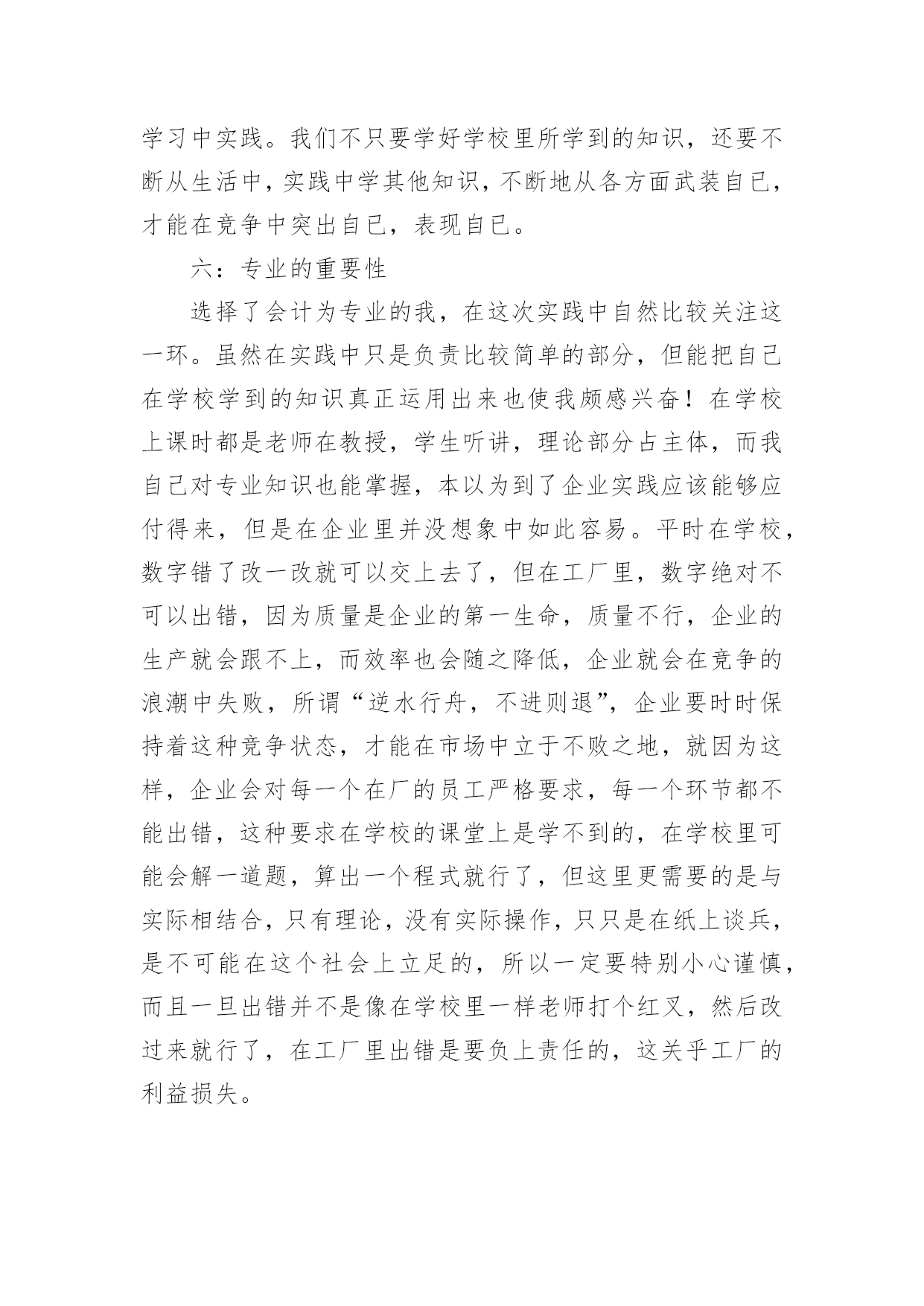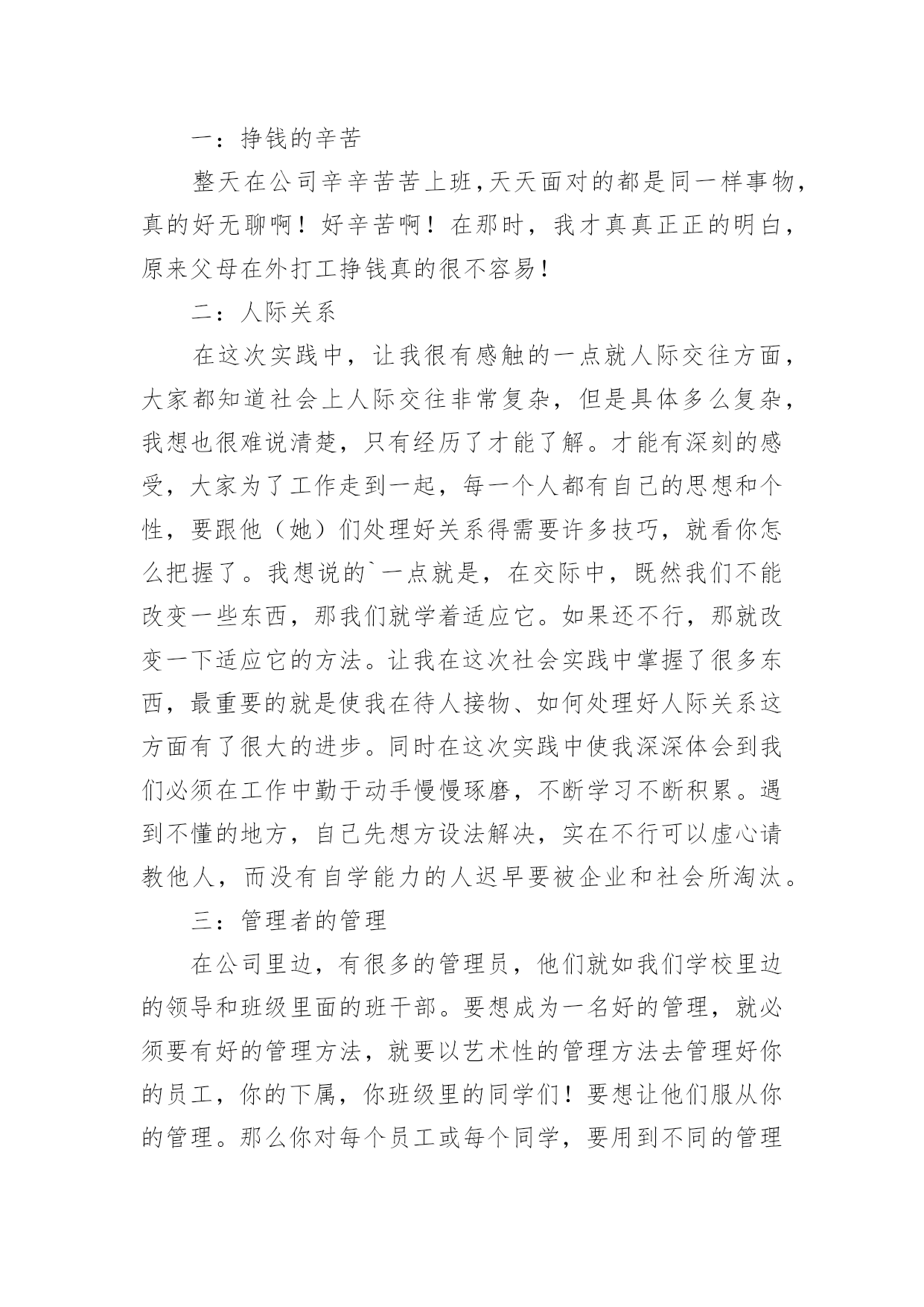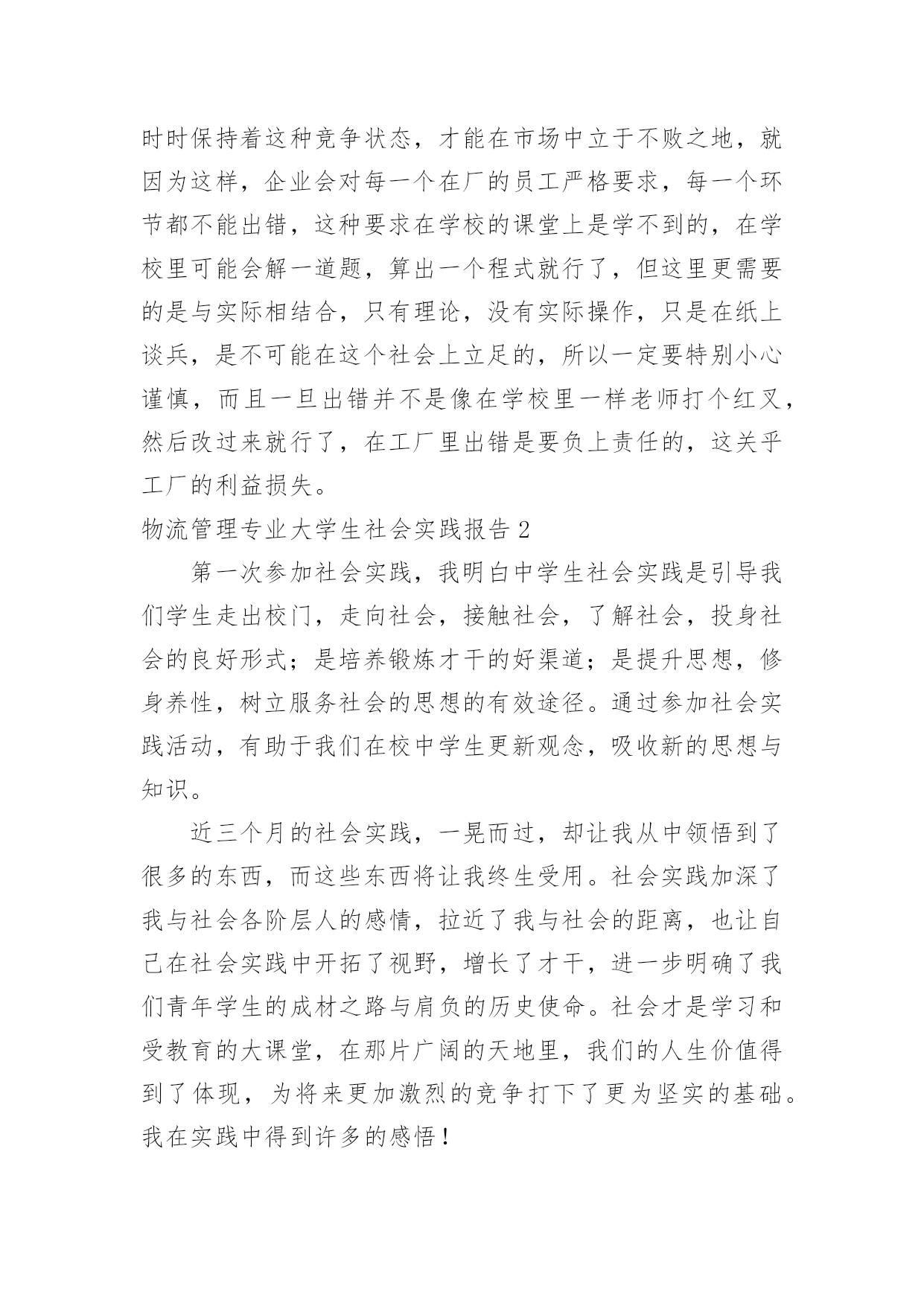 物流管理专业大学生社会实践报告物流管理专业大学生社会实践报告在经济发展迅速的今天,越来越多的事务都会使用到报告,其在写作上具有一定的窍门。其实写报告并没有想象中那么难,下面是小编为大家整理的物流管理专业大学生社会实践报告,欢迎阅读,希望大家能够喜欢。物流管理专业大学生社会实践报告1一:挣钱的辛苦整天在公司辛辛苦苦上班,天天面对的都是同一样事物,真的好无聊啊!好辛苦啊!在那时,我才真真正正的明白,原来父母在外打工挣钱真的很不容易!二:人际关系在这次实践中,让我很有感触的一点就人际交往方面,大家都知道社会上人际交往非常复杂,但是具体多么复杂,我想也很难说清楚,只有经历了才能了解.才能有深刻的感受,大家为了工作走到一起,每一个人都有自己的思想和个性,要跟他(她)们处理好关系得需要许多技巧,就看你怎么把握了.我想说的一点就是,在交际中,既然我们不能改变一些东西,那我们就学着适应它.如果还不行,那就改变一下适应它的方法。让我在这次社会实践中掌握了很多东西,最重要的就是使我在待人接物、如何处理好人际关系这方面有了很大的进步。同时在这次实践中使我深深体会到我们必须在工作中勤于动手慢慢琢磨,不断学习不断积累。遇到不懂的地方,自己先想方设法解决,实在不行可以虚心请教他人,而没有自学能力的人迟早要被企业和社会所淘汰。三:管理者的管理在公司里边,有很多的管理员,他们就如我们学校里边的领导和班级里面的班干部.要想成为一名好的管理,就必须要有好的管理方法,就要以艺术性的管理方法去管理好你的员工,你的下属,你班级里的同学们!要想让他们服从你的管理.那么你对每个员工或每个同学,要用到不同的管理方法,意思就是说:在管理时,要因人而异!四:自强自立俗话说:“在家千日好,出门半”招“难!”意思就是说:在家里的时候,有自已的父母照顾,关心,呵护!那肯定就是日子过得无忧无虑了,但是,只要你去到外面工作的时候,不管你遇到什么困难,挫折都是靠自已一个人去解决,在这二个多月里,让我学会了自强自立!凡事都要靠自已!现在,就算父母不在我的身边,我都能够自已独立!五:认识来源于实践一切认识都来源于实践。实践是认识的来源说明了亲身实践的必要性和重要性,但是并不排斥学习间接经验的必要性。实践的发展不断促进人类认识能力的发展。实践的不断发展,不断提出新的问题,促使人们去解决这些问题。而随着这些问题的不断解决,与此同步,人的认识能力也就不断地改善和提高!马克思主义哲学强调实践对认识的决定作用,认识对实践具有巨大的反作用。认识对实践的反作用主要表现在认识和理论对实践具有指导作用。认识在实践的基础上产生,但是认识一经产生就具有相对独立性,可以对实践进行指导。实践,就是把我们在学校所学的理论知识,运用到客观实际中去,使自己所学的理论知识有用武之地。只学不实践,那么所学的就等零。理论应该与实践相结合。另一方面,实践可为以后找工作打基础。通过这段时间的实习,学到一些在学校里学不到的东西。因为环境的不同,接触的人与事不同,从中所学的东西自然就不一样了。要学会从实践中学习,从学习中实践。我们不只要学好学校里所学到的知识,还要不断从生活中,实践中学其他知识,不断地从各方面武装自已,才能在竞争中突出自已,表现自已。六:专业的重要性选择了会计为专业的我,在这次实践中自然比较关注这一环。虽然在实践中只是负责比较简单的部分,但能把自己在学校学到的知识真正运用出来也使我颇感兴奋!在学校上课时都是老师在教授,学生听讲,理论部分占主体,而我自己对专业知识也能掌握,本以为到了企业实践应该能够应付得来,但是在企业里并没想象中如此容易。平时在学校,数字错了改一改就可以交上去了,但在工厂里,数字绝对不可以出错,因为质量是企业的第一生命,质量不行,企业的生产就会跟不上,而效率也会随之降低,企业就会在竞争的浪潮中失败,所谓“逆水行舟,不进则退”,企业要时时保持着这种竞争状态,才能在市场中立于不败之地,就因为这样,企业会对每一个在厂的员工严格要求,每一个环节都不能出错,这种要求在学校的课堂上是学不到的,在学校里可能会解一道题,算出一个程式就行了,但这里更需要的是与实际相结合,只有理论,没有实际操作,只是在纸上谈兵,是不可能在这个社会上立足的,所以一定要特别小心谨慎,而且一旦出错并不是像在学校里一样老师打个红叉,然后改过来就行了,在工厂里出错是要负上责任的,这关乎工厂的利益损失。物流管理专业大学生社会实践报告2第一次参加社会实践,我明白中学生社会实践是引导我们学生走出校门,走向社会,接触社会,了解社会,投身社会的良好形式;是培养锻炼才干的好渠道;是提升思想,修身养性,树立服务社会的思想的有效途径。通过参加社会实践活动,有助于我们在校中学生更新观念,吸收新的思想与知识。近三个月的社会实践,一晃而过,却让我从中领悟到了很多的东西,
