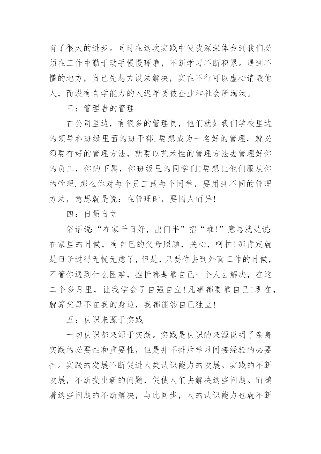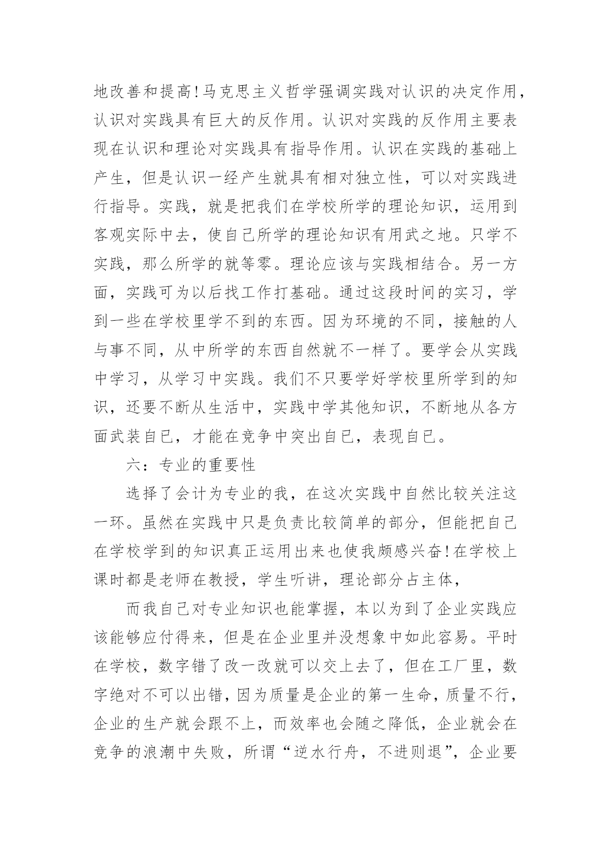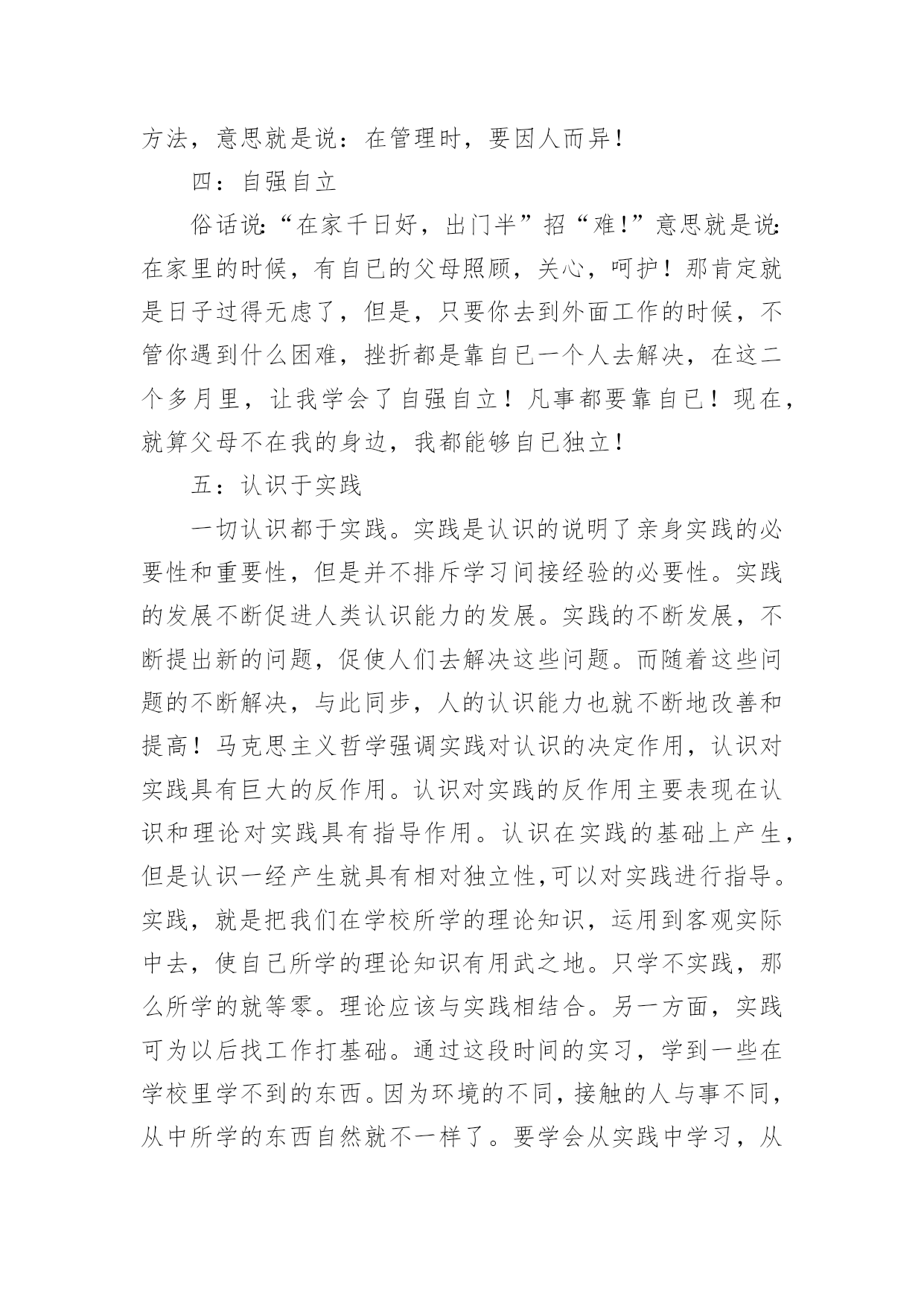 物流管理专业大学生社会实践报告物流管理专业大学生社会实践报告在经济发展迅速的今天,越来越多的事务都会使用到报告,其在写作上具有一定的窍门。其实写报告并没有想象中那么难,下面是小编为大家整理的物流管理专业大学生社会实践报告,欢迎阅读,希望大家能够喜欢。物流管理专业大学生社会实践报告1一:挣钱的辛苦整天在公司辛辛苦苦上班,天天面对的都是同一样事物,真的好无聊啊!好辛苦啊!在那时,我才真真正正的明白,原来父母在外打工挣钱真的很不容易!二:人际关系在这次实践中,让我很有感触的一点就人际交往方面,大家都知道社会上人际交往非常复杂,但是具体多么复杂,我想也很难说清楚,只有经历了才能了解.才能有深刻的感受,大家为了工作走到一起,每一个人都有自己的思想和个性,要跟他(她)们处理好关系得需要许多技巧,就看你怎么把握了.我想说的一点就是,在交际中,既然我们不能改变一些东西,那我们就学着适应它.如果还不行,那就改变一下适应它的方法。让我在这次社会实践中掌握了很多东西,最重要的就是使我在待人接物、如何处理好人际关系这方面有了很大的进步。同时在这次实践中使我深深体会到我们必须在工作中勤于动手慢慢琢磨,不断学习不断积累。遇到不懂的地方,自己先想方设法解决,实在不行可以虚心请教他人,而没有自学能力的人迟早要被企业和社会所淘汰。三:管理者的管理在公司里边,有很多的管理员,他们就如我们学校里边的领导和班级里面的班干部.要想成为一名好的管理,就必须要有好的管理方法,就要以艺术性的管理方法去管理好你的员工,你的下属,你班级里的同学们!要想让他们服从你的管理.那么你对每个员工或每个同学,要用到不同的管理方法,意思就是说:在管理时,要因人而异!四:自强自立俗话说:“在家千日好,出门半”招“难!”意思就是说:在家里的时候,有自已的父母照顾,关心,呵护!那肯定就是日子过得无忧无虑了,但是,只要你去到外面工作的时候,不管你遇到什么困难,挫折都是靠自已一个人去解决,在这二个多月里,让我学会了自强自立!凡事都要靠自已!现在,就算父母不在我的身边,我都能够自已独立!五:认识来源于实践一切认识都来源于实践。实践是认识的来源说明了亲身实践的必要性和重要性,但是并不排斥学习间接经验的必要性。实践的发展不断促进人类认识能力的发展。实践的不断发展,不断提出新的问题,促使人们去解决这些问题。而随着这些问题的不断解决,与此同步,人的认识能力也就不断地改善和提高!马克思主义哲学强调实践对认识的决定作用,认识对实践具有巨大的反作用。认识对实践的反作用主要表现在认识和理论对实践具有指导作用。认识在实践的基础上产生,但是认识一经产生就具有相对独立性,可以对实践进行指导。实践,就是把我们在学校所学的理论知识,运用到客观实际中去,使自己所学的理论知识有用武之地。只学不实践,那么所学的就等零。理论应该与实践相结合。另一方面,实践可为以后找工作打基础。通过这段时间的实习,学到一些在学校里学不到的东西。因为环境的不同,接触的人与事不同,从中所学的东西自然就不一样了。要学会从实践中学习,从学习中实践。我们不只要学好学校里所学到的知识,还要不断从生活中,实践中学其他知识,不断地从各方面武装自已,才能在竞争中突出自已,表现自已。六:专业的重要性选择了会计为专业的我,在这次实践中自然比较关注这一环。虽然在实践中只是负责比较简单的部分,但能把自己在学校学到的知识真正运用出来也使我颇感兴奋!在学校上课时都是老师在教授,学生听讲,理论部分占主体,而我自己对专业知识也能掌握,本以为到了企业实践应该能够应付得来,但是在企业里并没想象中如此容易。平时在学校,数字错了改一改就可以交上去了,但在工厂里,数字绝对不可以出错,因为质量是企业的第一生命,质量不行,企业的生产就会跟不上,而效率也会随之降低,企业就会在竞争的浪潮中失败,所谓“逆水行舟,不进则退”,企业要时时保持着这种竞争状态,才能在市场中立于不败之地,就因为这样,企业会对每一个在厂的员工严格要求,每一个环节都不能出错,这种要求在学校的课堂上是学不到的,在学校里可能会解一道题,算出一个程式就行了,但这里更需要的是与实际相结合,只有理论,没有实际操作,只是在纸上谈兵,是不可能在这个社会上立足的,所以一定要特别小心谨慎,而且一旦出错并不是像在学校里一样老师打个红叉,然后改过来就行了,在工厂里出错是要负上责任的,这关乎工厂的利益损失。物流管理专业大学生社会实践报告2第一次参加社会实践,我明白中学生社会实践是引导我们学生走出校门,走向社会,接触社会,了解社会,投身社会的良好形式;是培养锻炼才干的好渠道;是提升思想,修身养性,树立服务社会的思想的有效途径。通过参加社会实践活动,有助于我们在校中学生更新观念,吸收新的思想与知识。近三个月的社会实践,一晃而过,却让我从中领悟到了很多的东西,