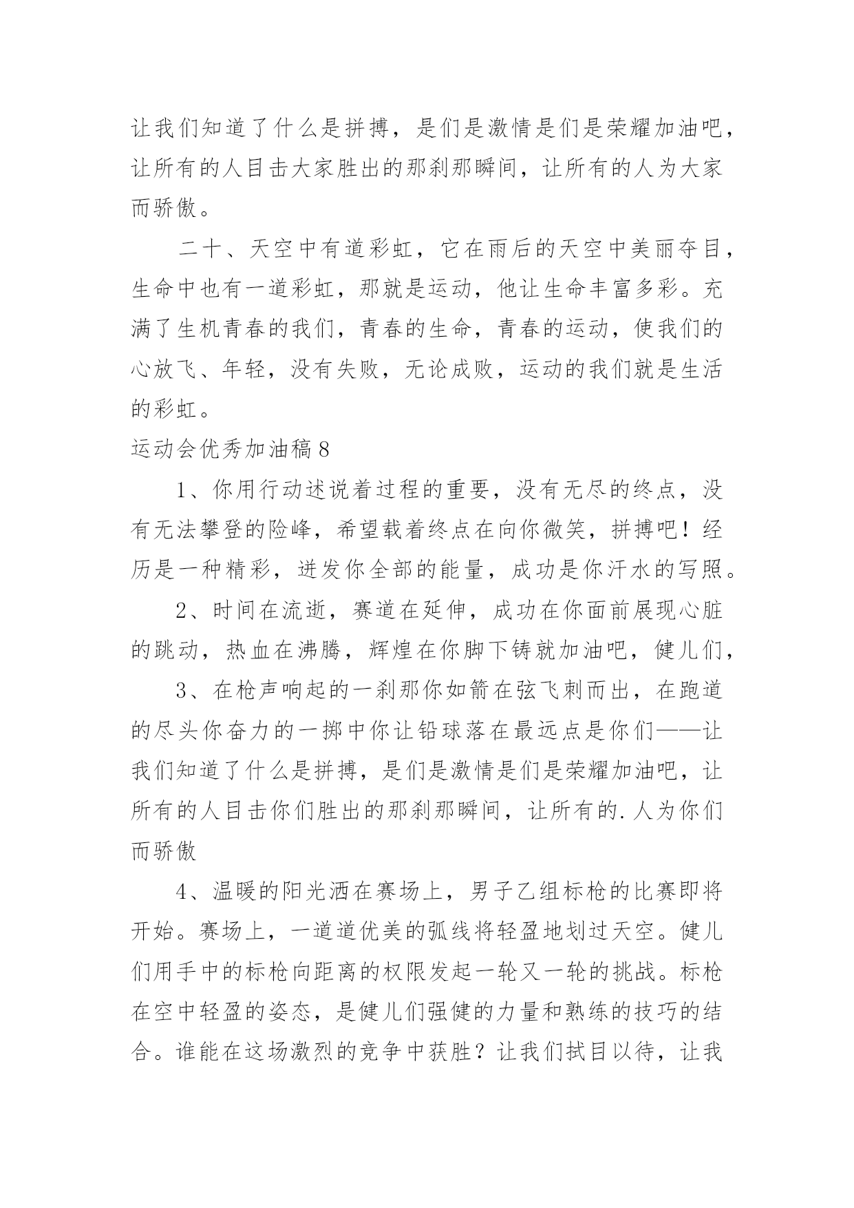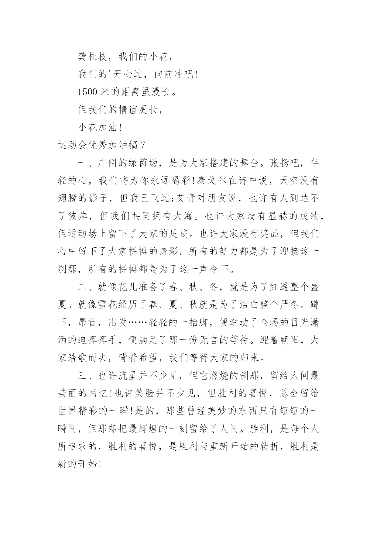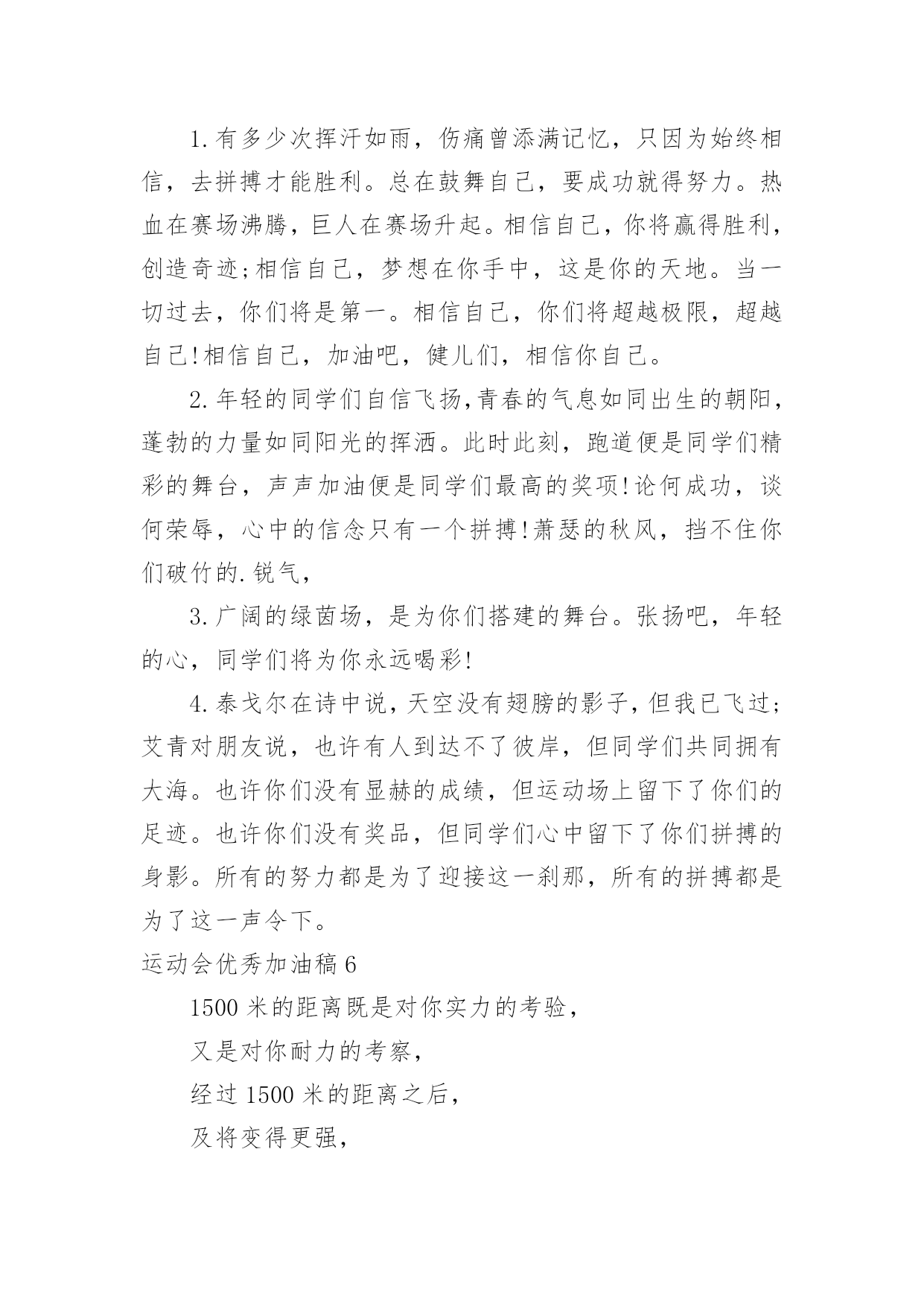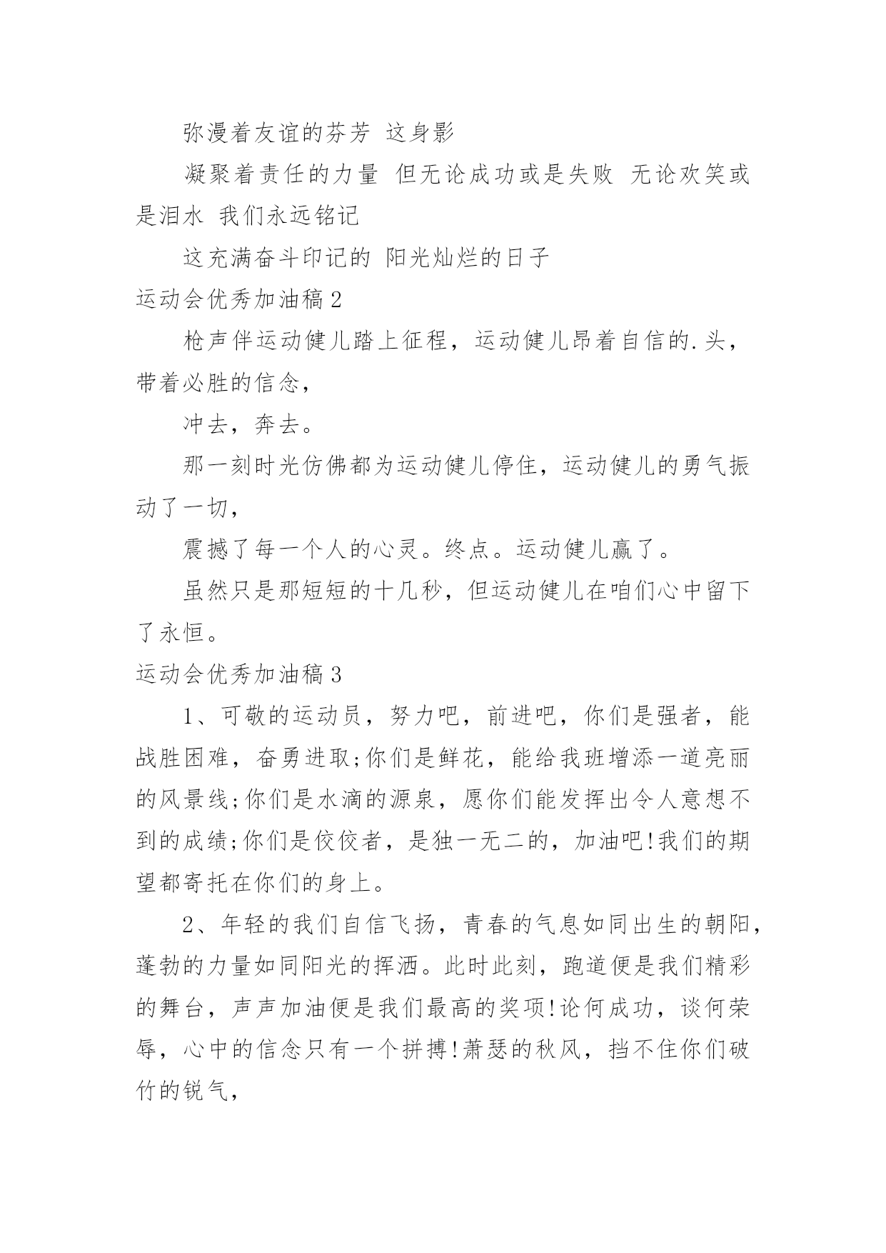 运动会优秀加油稿运动会优秀加油稿(汇编15篇)在我们平凡的日常里,能够利用到加油稿的场合越来越多,加油稿可以给予对方克服困难的勇气和信心。相信写加油稿是一个让许多人都头痛的问题,下面是小编帮大家整理的运动会优秀加油稿,供大家参考借鉴,希望可以帮助到有需要的朋友。运动会优秀加油稿1像雄鹰,像闪电,像利箭,来吧,来吧,冲吧,起跑线在脚下。来吧,终点站不远了!冲吧!来吧运动员们展开你们运动的翅膀,飞吧!搏吧!与闪电抗衡吧!来吧!来吧!搏吧同学们胜利就在脚下,comeon!comeon!阳光灿烂的'日子运动场上有着健儿们奋勇拼搏的身影观众席上响着拉拉队摇旗助威的呐喊这呐喊弥漫着友谊的芬芳这身影凝聚着责任的力量但无论成功或是失败无论欢笑或是泪水我们永远铭记这充满奋斗印记的阳光灿烂的日子运动会优秀加油稿2枪声伴运动健儿踏上征程,运动健儿昂着自信的.头,带着必胜的信念,冲去,奔去。那一刻时光仿佛都为运动健儿停住,运动健儿的勇气振动了一切,震撼了每一个人的心灵。终点。运动健儿赢了。虽然只是那短短的十几秒,但运动健儿在咱们心中留下了永恒。运动会优秀加油稿31、可敬的运动员,努力吧,前进吧,你们是强者,能战胜困难,奋勇进取;你们是鲜花,能给我班增添一道亮丽的风景线;你们是水滴的源泉,愿你们能发挥出令人意想不到的成绩;你们是佼佼者,是独一无二的,加油吧!我们的期望都寄托在你们的身上。2、年轻的我们自信飞扬,青春的气息如同出生的朝阳,蓬勃的力量如同阳光的挥洒。此时此刻,跑道便是我们精彩的舞台,声声加油便是我们最高的奖项!论何成功,谈何荣辱,心中的信念只有一个拼搏!萧瑟的秋风,挡不住你们破竹的锐气,3、在今天的赛场上,我只是个场边的看客。我用眼睛见证了赛场上的是非成败,用心灵感受了运动员的'喜怒哀乐。他坚持跑完全程,我学到了坚持的可贵,他摔倒了再站起来,我学会了不怕失败的勇气。场上每一个点滴,都如此的震撼我的心灵。在今天的赛场上,我只是个场边的看客,但我学到了很多4、你的汗水洒在跑道,浇灌着成功的花朵开放。你的欢笑飞扬在赛场,为班争光数你最棒。跑吧,追吧在这广阔的赛场上,你似骏马似离铉的箭。跑吧,追吧你比虎猛比豹强5、步子迈开,让我们飞驰在红色跑道上,用我们的泪水和热血,更改历史的记录,起立吧,歌唱吧!为我们的勇士加油!运动会优秀加油稿4红色,绿色交织着你我的梦,呐喊,助威,传递着我的祝福。我的.渴望,我的激情,那一时刻,那一瞬间,牵动着你我的心,超越是你的目标,第一是我们的期盼,你的胜利,就是我们的胜利,因为你牵动着每一个人的心。运动会优秀加油稿51.有多少次挥汗如雨,伤痛曾添满记忆,只因为始终相信,去拼搏才能胜利。总在鼓舞自己,要成功就得努力。热血在赛场沸腾,巨人在赛场升起。相信自己,你将赢得胜利,创造奇迹;相信自己,梦想在你手中,这是你的天地。当一切过去,你们将是第一。相信自己,你们将超越极限,超越自己!相信自己,加油吧,健儿们,相信你自己。2.年轻的同学们自信飞扬,青春的气息如同出生的朝阳,蓬勃的力量如同阳光的挥洒。此时此刻,跑道便是同学们精彩的舞台,声声加油便是同学们最高的奖项!论何成功,谈何荣辱,心中的信念只有一个拼搏!萧瑟的秋风,挡不住你们破竹的.锐气,3.广阔的绿茵场,是为你们搭建的舞台。张扬吧,年轻的心,同学们将为你永远喝彩!4.泰戈尔在诗中说,天空没有翅膀的影子,但我已飞过;艾青对朋友说,也许有人到达不了彼岸,但同学们共同拥有大海。也许你们没有显赫的成绩,但运动场上留下了你们的足迹。也许你们没有奖品,但同学们心中留下了你们拼搏的身影。所有的努力都是为了迎接这一刹那,所有的拼搏都是为了这一声令下。运动会优秀加油稿61500米的距离既是对你实力的考验,又是对你耐力的考察,经过1500米的距离之后,及将变得更强,龚桂枝,我们的小花,我们的'开心过,向前冲吧!1500米的距离虽漫长。但我们的情谊更长,小花加油!运动会优秀加油稿7一、广阔的绿茵场,是为大家搭建的舞台。张扬吧,年轻的心,我们将为你永远喝彩!泰戈尔在诗中说,天空没有翅膀的影子,但我已飞过;艾青对朋友说,也许有人到达不了彼岸,但我们共同拥有大海。也许大家没有显赫的成绩,但运动场上留下了大家的足迹。也许大家没有奖品,但我们心中留下了大家拼搏的身影。所有的努力都是为了迎接这一刹那,所有的拼搏都是为了这一声令下。二、就像花儿准备了春、秋、冬,就是为了红透整个盛夏。就像雪花经历了春、夏、秋就是为了洁白整个严冬。蹲下,昂首,出发……轻轻的一抬脚,便牵动了全场的目光潇洒的迫挥挥手,便满足了那一份无言的等待。迎着朝阳,大家踏歌而去,背着希望,我们等待大家的归来。三、也许流星并不少见,但它燃烧的刹那,留给人间最美丽的回忆!也许笑脸并不少见,但胜利的喜悦,总会留给世界精彩的一瞬!是的,那些曾经美