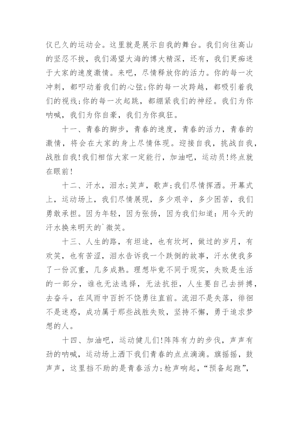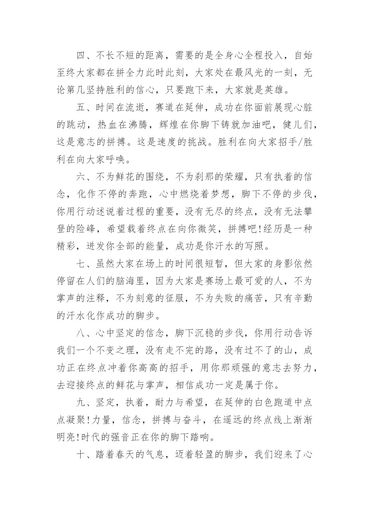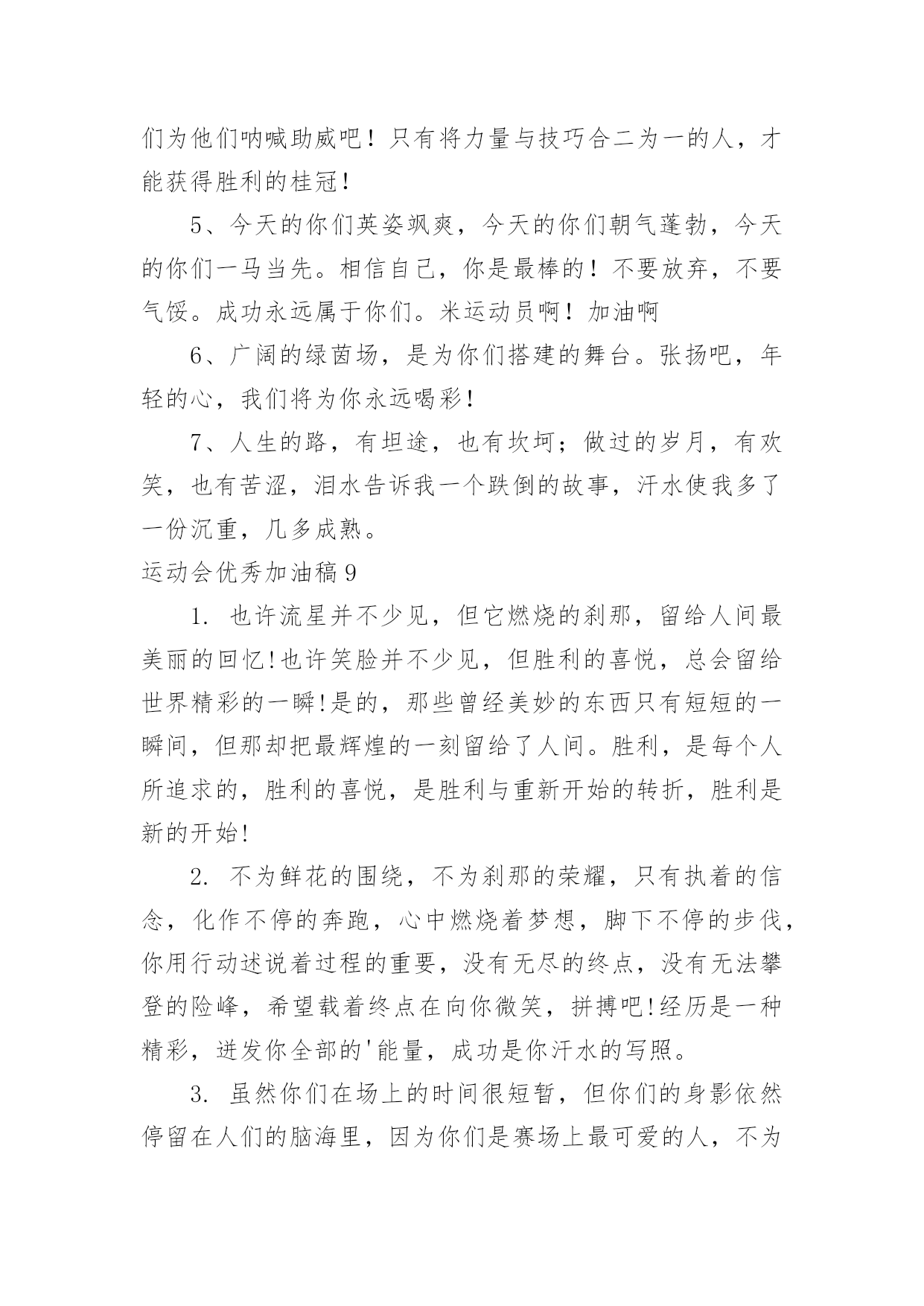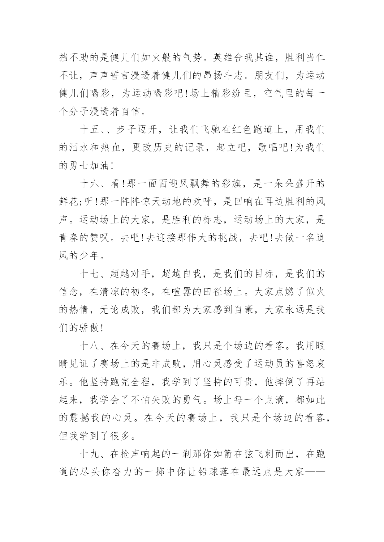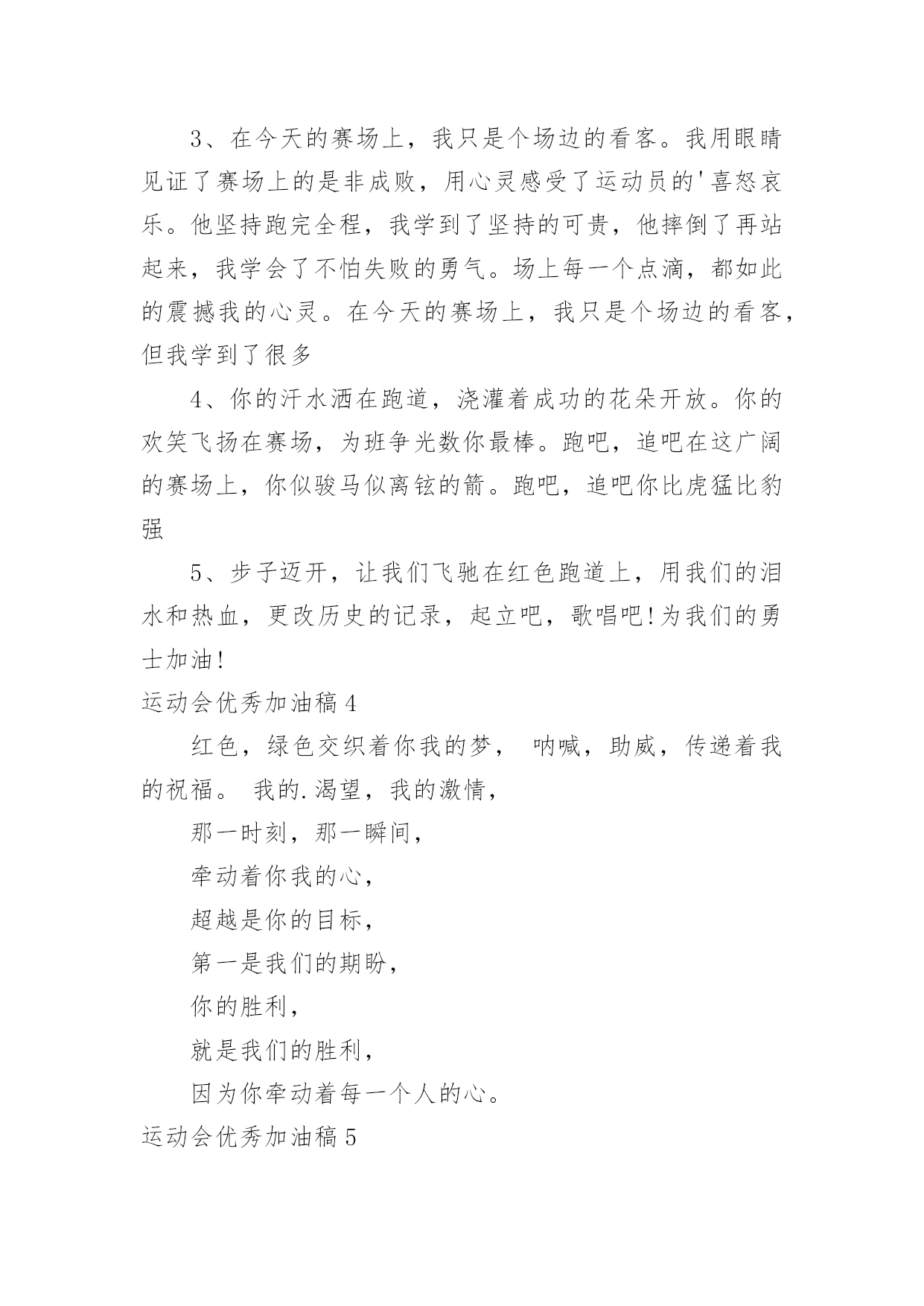 运动会优秀加油稿运动会优秀加油稿(汇编15篇)在我们平凡的日常里,能够利用到加油稿的场合越来越多,加油稿可以给予对方克服困难的勇气和信心。相信写加油稿是一个让许多人都头痛的问题,下面是小编帮大家整理的运动会优秀加油稿,供大家参考借鉴,希望可以帮助到有需要的朋友。运动会优秀加油稿1像雄鹰,像闪电,像利箭,来吧,来吧,冲吧,起跑线在脚下。来吧,终点站不远了!冲吧!来吧运动员们展开你们运动的翅膀,飞吧!搏吧!与闪电抗衡吧!来吧!来吧!搏吧同学们胜利就在脚下,comeon!comeon!阳光灿烂的'日子运动场上有着健儿们奋勇拼搏的身影观众席上响着拉拉队摇旗助威的呐喊这呐喊弥漫着友谊的芬芳这身影凝聚着责任的力量但无论成功或是失败无论欢笑或是泪水我们永远铭记这充满奋斗印记的阳光灿烂的日子运动会优秀加油稿2枪声伴运动健儿踏上征程,运动健儿昂着自信的.头,带着必胜的信念,冲去,奔去。那一刻时光仿佛都为运动健儿停住,运动健儿的勇气振动了一切,震撼了每一个人的心灵。终点。运动健儿赢了。虽然只是那短短的十几秒,但运动健儿在咱们心中留下了永恒。运动会优秀加油稿31、可敬的运动员,努力吧,前进吧,你们是强者,能战胜困难,奋勇进取;你们是鲜花,能给我班增添一道亮丽的风景线;你们是水滴的源泉,愿你们能发挥出令人意想不到的成绩;你们是佼佼者,是独一无二的,加油吧!我们的期望都寄托在你们的身上。2、年轻的我们自信飞扬,青春的气息如同出生的朝阳,蓬勃的力量如同阳光的挥洒。此时此刻,跑道便是我们精彩的舞台,声声加油便是我们最高的奖项!论何成功,谈何荣辱,心中的信念只有一个拼搏!萧瑟的秋风,挡不住你们破竹的锐气,3、在今天的赛场上,我只是个场边的看客。我用眼睛见证了赛场上的是非成败,用心灵感受了运动员的'喜怒哀乐。他坚持跑完全程,我学到了坚持的可贵,他摔倒了再站起来,我学会了不怕失败的勇气。场上每一个点滴,都如此的震撼我的心灵。在今天的赛场上,我只是个场边的看客,但我学到了很多4、你的汗水洒在跑道,浇灌着成功的花朵开放。你的欢笑飞扬在赛场,为班争光数你最棒。跑吧,追吧在这广阔的赛场上,你似骏马似离铉的箭。跑吧,追吧你比虎猛比豹强5、步子迈开,让我们飞驰在红色跑道上,用我们的泪水和热血,更改历史的记录,起立吧,歌唱吧!为我们的勇士加油!运动会优秀加油稿4红色,绿色交织着你我的梦,呐喊,助威,传递着我的祝福。我的.渴望,我的激情,那一时刻,那一瞬间,牵动着你我的心,超越是你的目标,第一是我们的期盼,你的胜利,就是我们的胜利,因为你牵动着每一个人的心。运动会优秀加油稿51.有多少次挥汗如雨,伤痛曾添满记忆,只因为始终相信,去拼搏才能胜利。总在鼓舞自己,要成功就得努力。热血在赛场沸腾,巨人在赛场升起。相信自己,你将赢得胜利,创造奇迹;相信自己,梦想在你手中,这是你的天地。当一切过去,你们将是第一。相信自己,你们将超越极限,超越自己!相信自己,加油吧,健儿们,相信你自己。2.年轻的同学们自信飞扬,青春的气息如同出生的朝阳,蓬勃的力量如同阳光的挥洒。此时此刻,跑道便是同学们精彩的舞台,声声加油便是同学们最高的奖项!论何成功,谈何荣辱,心中的信念只有一个拼搏!萧瑟的秋风,挡不住你们破竹的.锐气,3.广阔的绿茵场,是为你们搭建的舞台。张扬吧,年轻的心,同学们将为你永远喝彩!4.泰戈尔在诗中说,天空没有翅膀的影子,但我已飞过;艾青对朋友说,也许有人到达不了彼岸,但同学们共同拥有大海。也许你们没有显赫的成绩,但运动场上留下了你们的足迹。也许你们没有奖品,但同学们心中留下了你们拼搏的身影。所有的努力都是为了迎接这一刹那,所有的拼搏都是为了这一声令下。运动会优秀加油稿61500米的距离既是对你实力的考验,又是对你耐力的考察,经过1500米的距离之后,及将变得更强,龚桂枝,我们的小花,我们的'开心过,向前冲吧!1500米的距离虽漫长。但我们的情谊更长,小花加油!运动会优秀加油稿7一、广阔的绿茵场,是为大家搭建的舞台。张扬吧,年轻的心,我们将为你永远喝彩!泰戈尔在诗中说,天空没有翅膀的影子,但我已飞过;艾青对朋友说,也许有人到达不了彼岸,但我们共同拥有大海。也许大家没有显赫的成绩,但运动场上留下了大家的足迹。也许大家没有奖品,但我们心中留下了大家拼搏的身影。所有的努力都是为了迎接这一刹那,所有的拼搏都是为了这一声令下。二、就像花儿准备了春、秋、冬,就是为了红透整个盛夏。就像雪花经历了春、夏、秋就是为了洁白整个严冬。蹲下,昂首,出发……轻轻的一抬脚,便牵动了全场的目光潇洒的迫挥挥手,便满足了那一份无言的等待。迎着朝阳,大家踏歌而去,背着希望,我们等待大家的归来。三、也许流星并不少见,但它燃烧的刹那,留给人间最美丽的回忆!也许笑脸并不少见,但胜利的喜悦,总会留给世界精彩的一瞬!是的,那些曾经美