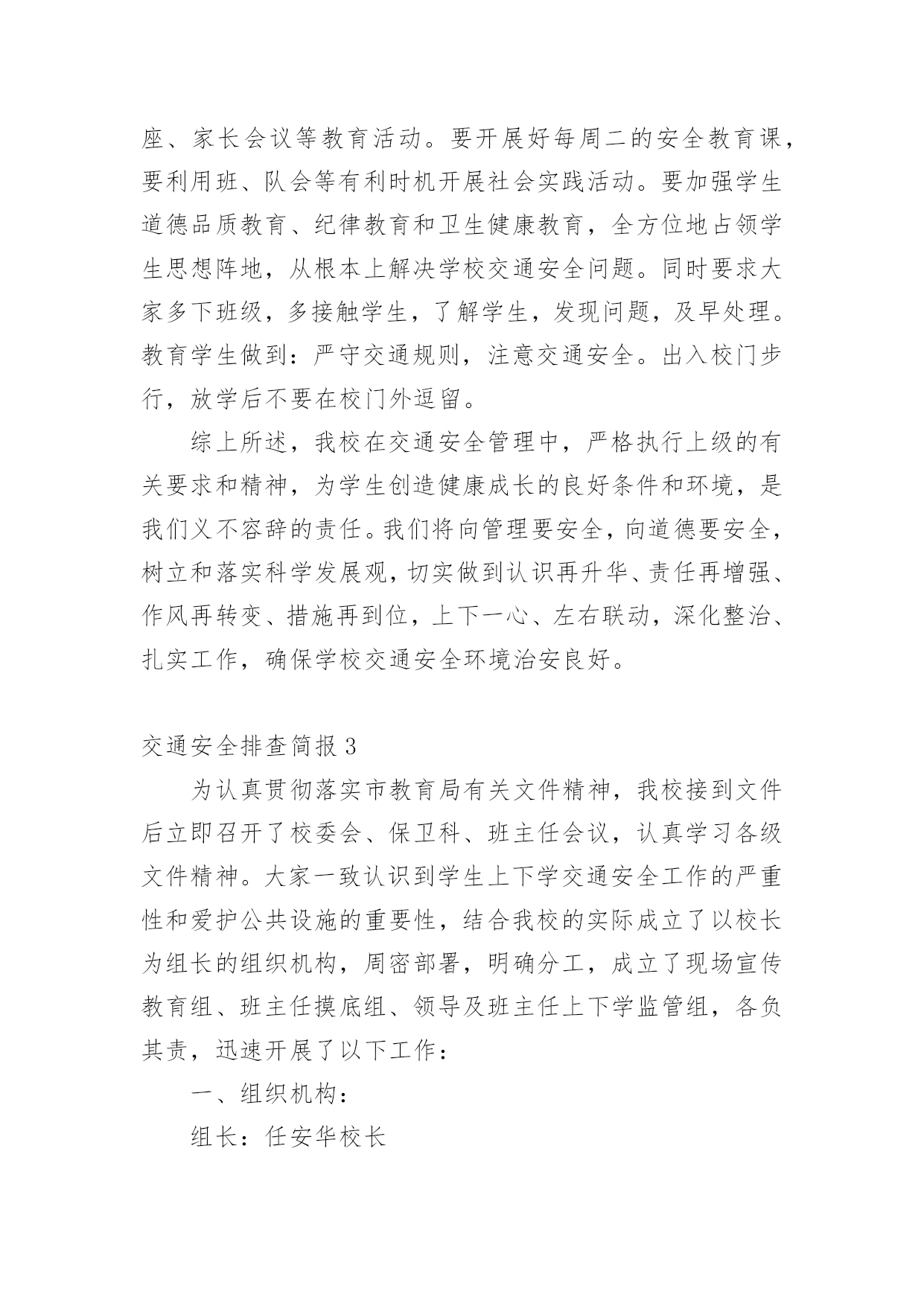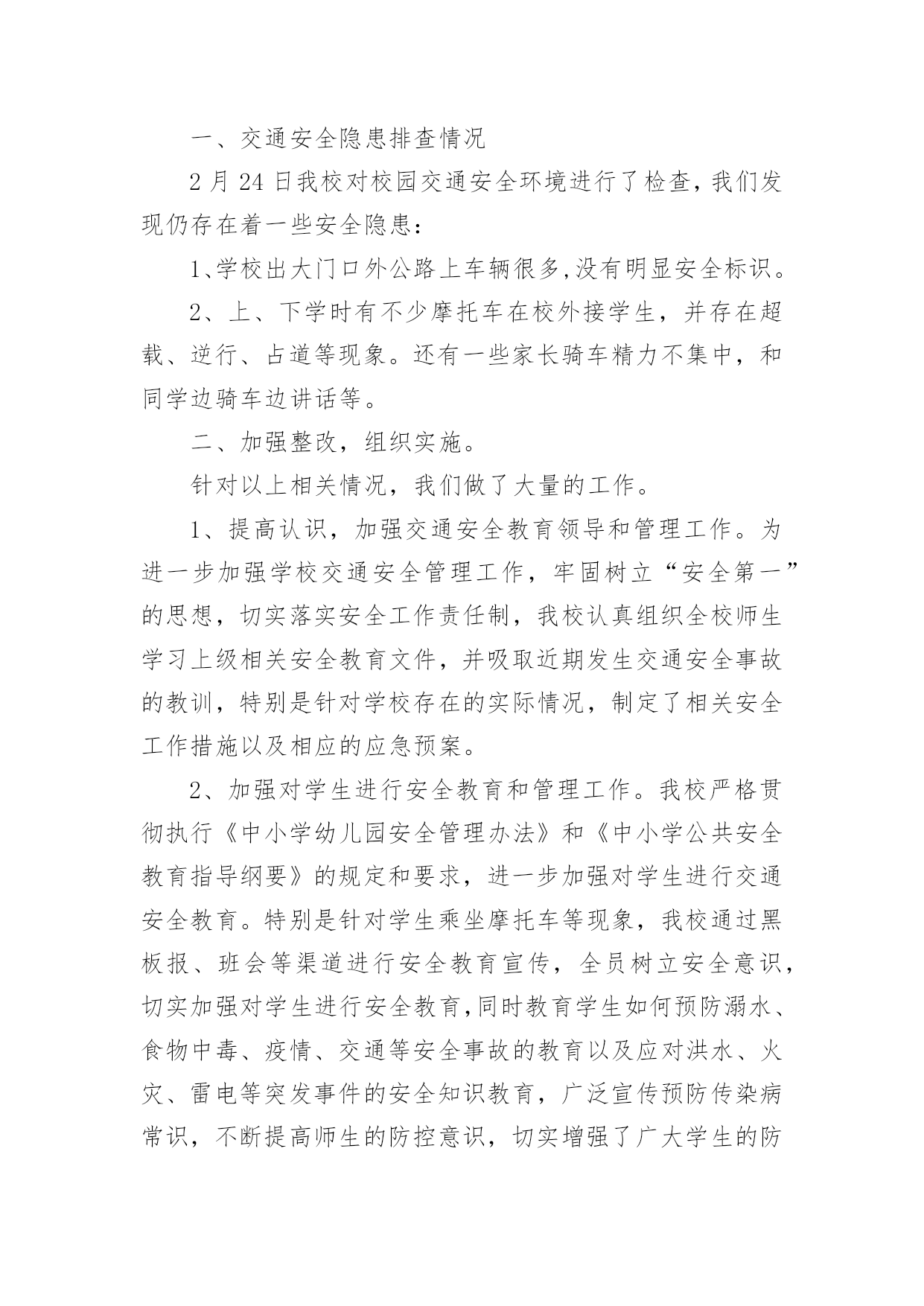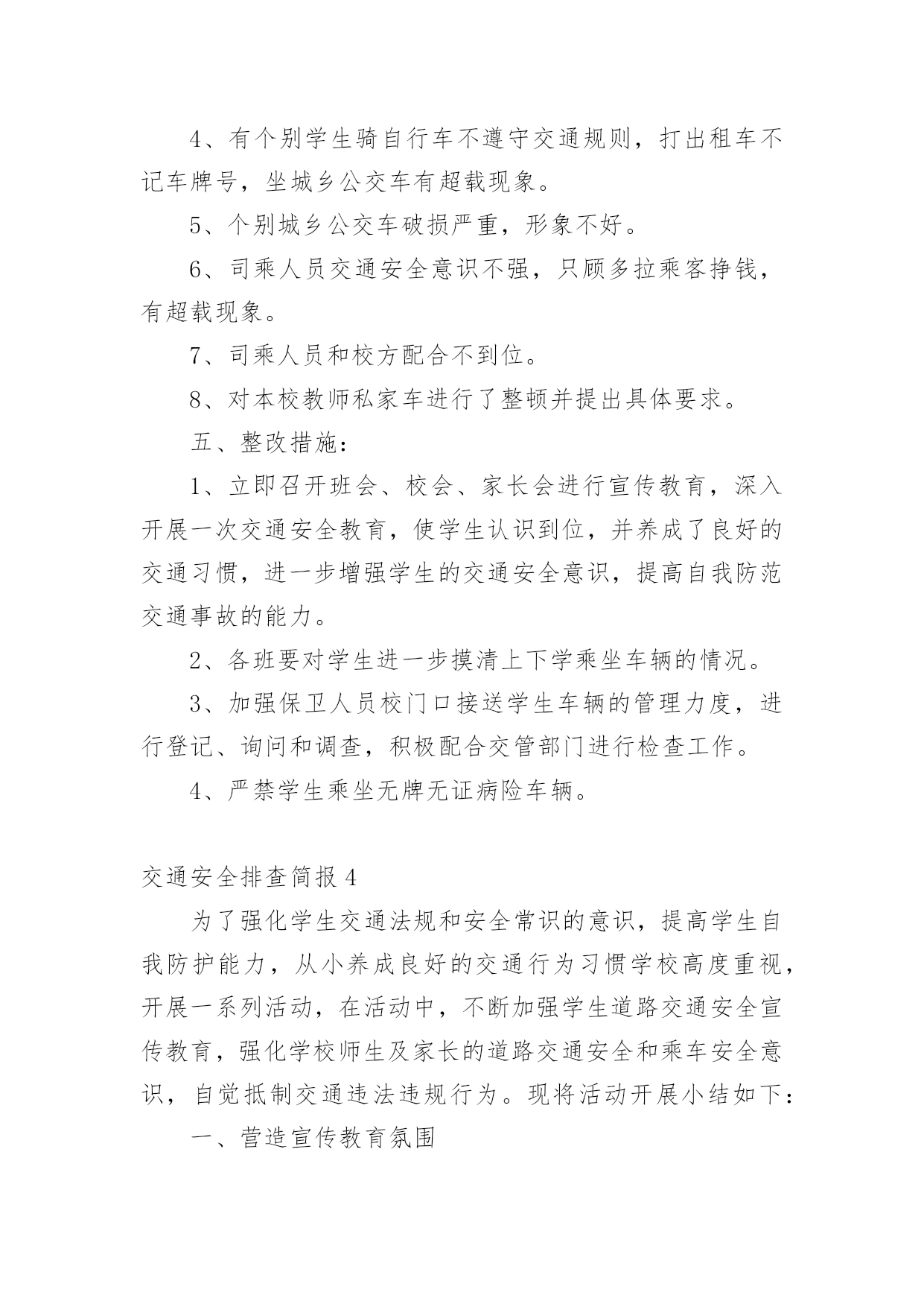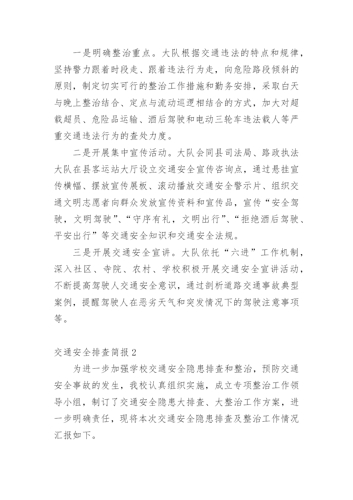 交通安全排查简报交通安全排查简报范文(精选8篇)在当今社会生活中,简报在生活中的使用越来越广泛,简报一般都有固定的报头,包括简报的名称、期号、编发单位、发行日期、保密等级和编号。拟起简报来就毫无头绪?下面是小编为大家整理的交通安全排查简报范文(精选8篇),仅供参考,大家一起来看看吧。交通安全排查简报1为切实提高道路交通事故预防工作的针对性、有效性,坚决遏制特大道路交通事故的高发势头,根据海南州交警支队统一部署,贵德县交警大队迅速部署,扎实推进,积极投入交通安全隐患排查整治工作,有力确保了道路交通安全形势保持可控状态,现将近期工作作如下总结。一、领导重视,精心组织。一是先期召开筹备会。大队召开全体民警会议,对此项工作进行了布置落实,明确各自分工和工作职责。二是专门成立工作小组。由大队长吉星林任组长,教导员仁青本、副队长杨仁千任副组长,其他正式干警为成员的道路交通安全隐患排查整治工作小组。三是定期召开推进会议。为了确保此项工作顺利推进,大队制定落实了定期例会制度,根据交通隐患排查整治工作的推进情况,定期由工作小组领导召集各成员参加,分析总结前阶段工作推进情况,拟定下阶段工作措施和计划。二、深入调研,排查隐患。一是实地踏勘情况。大队对涉及到的危险路口、路段逐一进行了实地踏勘,并在分析各项事故数据的基础上,拟定了初步上报意向。二是邀请专业部门论证。为确保大队排查的交通隐患路口切实可行,确保各项治理措施能取得实效,大队要求事故防范处专家对道路进行实地调研,逐一分析目前存在的交通安全隐患,探讨治理措施。三是综合分析上报。根据实地踏勘和专业部门论证情况,副大队长杨仁千2次召集各相关职能部门召开交通安全隐患排查工作推进会,通过会议分析讨论,确定了2条危险路段6个危险路口。并详细分析主要隐患,拟定治理措施和治理目标,明确责任单位。三、滚动排查,严格监管。一是结合捉漏找差排查隐患。大队结合“优信号、纠差错、促长效”交通设施捉漏找差专项行动,进一步优化交通信号配时,梳理排摸各类交通标志。对需要维护或完善的立即进行维护完善;对暂时无条件维护完善的,积极协调县发改局等相关单位完成。二是加强道路施工监管。大队组织相关人员定期开展施工工地交通安全检查,重点检查占用车道施工工地的交通安全设施和文明施工执行情况。四、强化整治,广泛宣传。一是明确整治重点。大队根据交通违法的特点和规律,坚持警力跟着时段走、跟着违法行为走,向危险路段倾斜的原则,制定切实可行的整治工作措施和勤务安排,采取白天与晚上整治结合、定点与流动巡逻相结合的方式,加大对超载超员、危险品运输、酒后驾驶和电动三轮车违法载人等严重交通违法行为的查处力度。二是开展集中宣传活动。大队会同县司法局、路政执法大队在县客运站大厅设立交通安全宣传咨询点,通过悬挂宣传横幅、摆放宣传展板、滚动播放交通安全警示片、组织交通文明志愿者向群众发放宣传资料和宣传品,宣传“安全驾驶,文明驾驶”、“守序有礼,文明出行”、“拒绝酒后驾驶、平安出行”等交通安全知识和交通安全法规。三是开展交通安全宣讲。大队依托“六进”工作机制,深入社区、寺院、农村、学校积极开展交通安全宣讲活动,不断提高驾驶人交通安全意识,通过剖析道路交通事故典型案例,提醒驾驶人在恶劣天气和突发情况下的驾驶注意事项等。交通安全排查简报2为进一步加强学校交通安全隐患排查和整治,预防交通安全事故的发生,我校认真组织实施,成立专项整治工作领导小组,制订了交通安全隐患大排查、大整治工作方案,进一步明确责任,现将本次交通安全隐患排查及整治工作情况汇报如下。一、交通安全隐患排查情况2月24日我校对校园交通安全环境进行了检查,我们发现仍存在着一些安全隐患:1、学校出大门口外公路上车辆很多,没有明显安全标识。2、上、下学时有不少摩托车在校外接学生,并存在超载、逆行、占道等现象。还有一些家长骑车精力不集中,和同学边骑车边讲话等。二、加强整改,组织实施。针对以上相关情况,我们做了大量的工作。1、提高认识,加强交通安全教育领导和管理工作。为进一步加强学校交通安全管理工作,牢固树立“安全第一”的思想,切实落实安全工作责任制,我校认真组织全校师生学习上级相关安全教育文件,并吸取近期发生交通安全事故的教训,特别是针对学校存在的实际情况,制定了相关安全工作措施以及相应的应急预案。2、加强对学生进行安全教育和管理工作。我校严格贯彻执行《中小学幼儿园安全管理办法》和《中小学公共安全教育指导纲要》的规定和要求,进一步加强对学生进行交通安全教育。特别是针对学生乘坐摩托车等现象,我校通过黑板报、班会等渠道进行安全教育宣传,全员树立安全意识,切实加强对学生进行安全教育,同时教育学生如何预防溺水、食物中毒、疫情、交通等安全事故的教育以及应对洪水、火灾、雷电等突发事件的安全知识教育,广泛宣传预防传染病常识,不