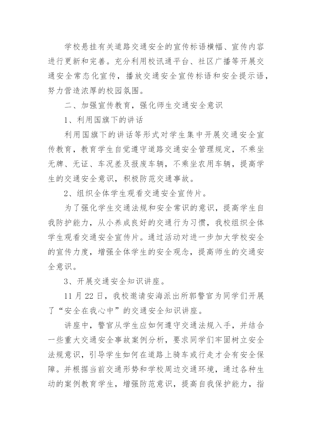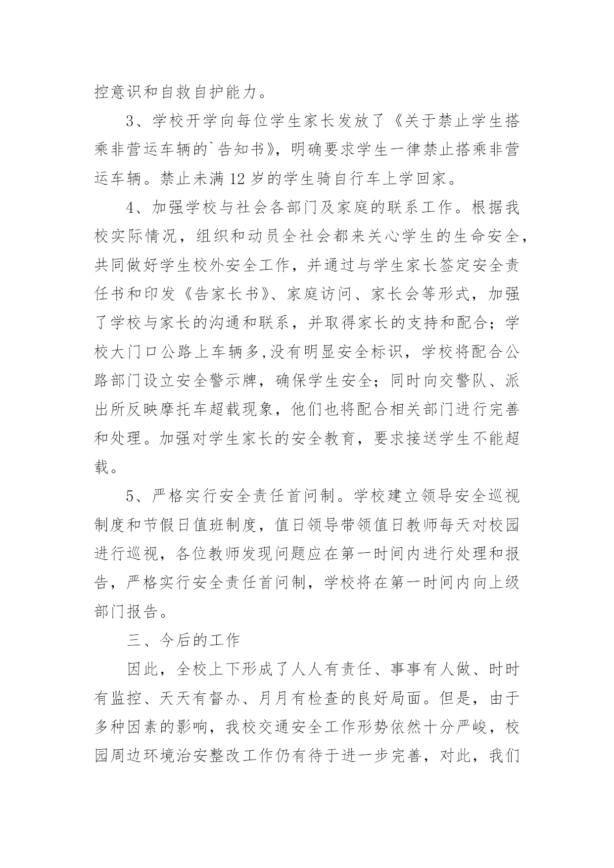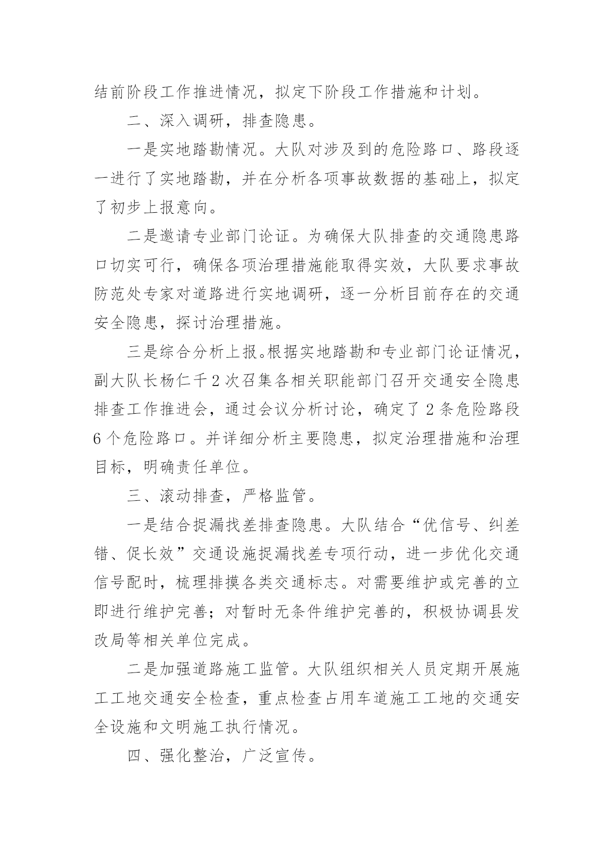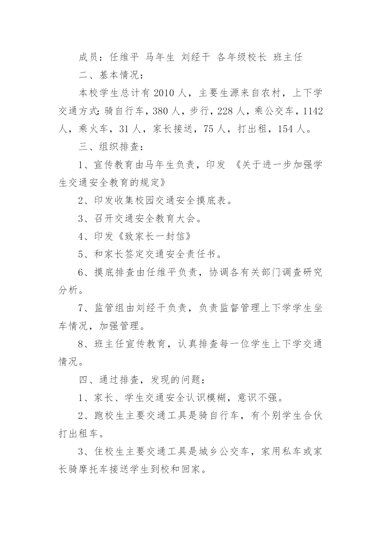 交通安全排查简报交通安全排查简报范文(精选8篇)在当今社会生活中,简报在生活中的使用越来越广泛,简报一般都有固定的报头,包括简报的名称、期号、编发单位、发行日期、保密等级和编号。拟起简报来就毫无头绪?下面是小编为大家整理的交通安全排查简报范文(精选8篇),仅供参考,大家一起来看看吧。交通安全排查简报1为切实提高道路交通事故预防工作的针对性、有效性,坚决遏制特大道路交通事故的高发势头,根据海南州交警支队统一部署,贵德县交警大队迅速部署,扎实推进,积极投入交通安全隐患排查整治工作,有力确保了道路交通安全形势保持可控状态,现将近期工作作如下总结。一、领导重视,精心组织。一是先期召开筹备会。大队召开全体民警会议,对此项工作进行了布置落实,明确各自分工和工作职责。二是专门成立工作小组。由大队长吉星林任组长,教导员仁青本、副队长杨仁千任副组长,其他正式干警为成员的道路交通安全隐患排查整治工作小组。三是定期召开推进会议。为了确保此项工作顺利推进,大队制定落实了定期例会制度,根据交通隐患排查整治工作的推进情况,定期由工作小组领导召集各成员参加,分析总结前阶段工作推进情况,拟定下阶段工作措施和计划。二、深入调研,排查隐患。一是实地踏勘情况。大队对涉及到的危险路口、路段逐一进行了实地踏勘,并在分析各项事故数据的基础上,拟定了初步上报意向。二是邀请专业部门论证。为确保大队排查的交通隐患路口切实可行,确保各项治理措施能取得实效,大队要求事故防范处专家对道路进行实地调研,逐一分析目前存在的交通安全隐患,探讨治理措施。三是综合分析上报。根据实地踏勘和专业部门论证情况,副大队长杨仁千2次召集各相关职能部门召开交通安全隐患排查工作推进会,通过会议分析讨论,确定了2条危险路段6个危险路口。并详细分析主要隐患,拟定治理措施和治理目标,明确责任单位。三、滚动排查,严格监管。一是结合捉漏找差排查隐患。大队结合“优信号、纠差错、促长效”交通设施捉漏找差专项行动,进一步优化交通信号配时,梳理排摸各类交通标志。对需要维护或完善的立即进行维护完善;对暂时无条件维护完善的,积极协调县发改局等相关单位完成。二是加强道路施工监管。大队组织相关人员定期开展施工工地交通安全检查,重点检查占用车道施工工地的交通安全设施和文明施工执行情况。四、强化整治,广泛宣传。一是明确整治重点。大队根据交通违法的特点和规律,坚持警力跟着时段走、跟着违法行为走,向危险路段倾斜的原则,制定切实可行的整治工作措施和勤务安排,采取白天与晚上整治结合、定点与流动巡逻相结合的方式,加大对超载超员、危险品运输、酒后驾驶和电动三轮车违法载人等严重交通违法行为的查处力度。二是开展集中宣传活动。大队会同县司法局、路政执法大队在县客运站大厅设立交通安全宣传咨询点,通过悬挂宣传横幅、摆放宣传展板、滚动播放交通安全警示片、组织交通文明志愿者向群众发放宣传资料和宣传品,宣传“安全驾驶,文明驾驶”、“守序有礼,文明出行”、“拒绝酒后驾驶、平安出行”等交通安全知识和交通安全法规。三是开展交通安全宣讲。大队依托“六进”工作机制,深入社区、寺院、农村、学校积极开展交通安全宣讲活动,不断提高驾驶人交通安全意识,通过剖析道路交通事故典型案例,提醒驾驶人在恶劣天气和突发情况下的驾驶注意事项等。交通安全排查简报2为进一步加强学校交通安全隐患排查和整治,预防交通安全事故的发生,我校认真组织实施,成立专项整治工作领导小组,制订了交通安全隐患大排查、大整治工作方案,进一步明确责任,现将本次交通安全隐患排查及整治工作情况汇报如下。一、交通安全隐患排查情况2月24日我校对校园交通安全环境进行了检查,我们发现仍存在着一些安全隐患:1、学校出大门口外公路上车辆很多,没有明显安全标识。2、上、下学时有不少摩托车在校外接学生,并存在超载、逆行、占道等现象。还有一些家长骑车精力不集中,和同学边骑车边讲话等。二、加强整改,组织实施。针对以上相关情况,我们做了大量的工作。1、提高认识,加强交通安全教育领导和管理工作。为进一步加强学校交通安全管理工作,牢固树立“安全第一”的思想,切实落实安全工作责任制,我校认真组织全校师生学习上级相关安全教育文件,并吸取近期发生交通安全事故的教训,特别是针对学校存在的实际情况,制定了相关安全工作措施以及相应的应急预案。2、加强对学生进行安全教育和管理工作。我校严格贯彻执行《中小学幼儿园安全管理办法》和《中小学公共安全教育指导纲要》的规定和要求,进一步加强对学生进行交通安全教育。特别是针对学生乘坐摩托车等现象,我校通过黑板报、班会等渠道进行安全教育宣传,全员树立安全意识,切实加强对学生进行安全教育,同时教育学生如何预防溺水、食物中毒、疫情、交通等安全事故的教育以及应对洪水、火灾、雷电等突发事件的安全知识教育,广泛宣传预防传染病常识,不