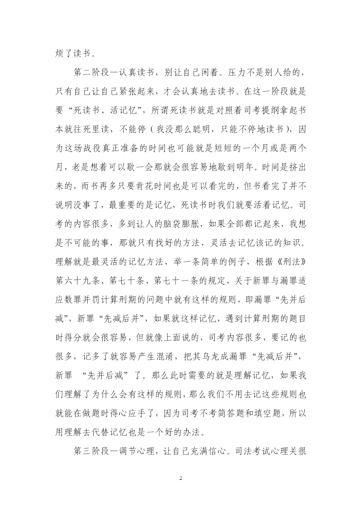 胜利的战役——浅谈我的司考经验秋风瑟瑟,硕果累累,在这秋高气爽的季节里,农民伯伯们收割着金灿灿的稻谷,而我也在人生的大战役中告捷,此时此刻的我也卸下了司考的重剑,迎接着新的挑战!炎热的夏天已成惯常,没有人会过多地抱怨它的突然到来,因为很多人都在此时紧张地备战着,无暇顾虑。将近2个月的日夜奋战,为的就是在两天内拿下360这个难啃的山头。当从司令部得知战火停息,对方无条件投降时,我惊呆了片刻高兴了许久。在此,我与大家分享获胜的喜悦,把个中经验一一道来,与共患难的战友们共勉!第一阶段—了解书本,把自己投身于战场。面对司考这场大战,我们绝不能乱了阵脚,在买到书本后的第一件事应该是让自己有要进行司考的心理准备,那就是要先带着投身司考的心态去读第一遍书,让自己头脑里有几分司考卷土而来的紧张氛围。面对着厚厚的十多本书,或许会让人感到厌烦,如果一头扎进去猛攻猛读,或许会让人烦上加烦。这时就要调整好读书心态,先粗略地把这些书本全部过一遍,不要求去记忆些什么,只要让自己知道司法考试要考的是什么就行了。司法考试考完之后会让人疲惫的身心得到解放,也正是这样,先前复习的东西不能等到下次复习时再用,就算是对其无比熟悉,在考完之后都会变得生疏,而对于没有参加过司考的考生就更生疏了。因此,第一阶段的作战就是把自己投身于司考,不让自己因为要记忆的东西太多而厌烦了读书。第二阶段—认真读书,别让自己闲着。压力不是别人给的,只有自己让自己紧张起来,才会认真地去读书。在这一阶段就是要“死读书、活记忆”,所谓死读书就是对照着司考提纲拿起书本就往死里读,不能停(我没那么聪明,只能不停地读书),因为这场战役真正准备的时间也可能就是短短的一个月或是两个月,老是想着可以歇一会那就会很容易地歇到明年。时间是挤出来的,而书再多只要肯花时间也是可以看完的,但书看完了并不说明没事了,最重要的是记忆,死读书时我们就要活着记忆。司考的内容很多,多到让人的脑袋膨胀,如果全部都记起来,我想是不可能的事,那就只有找好的方法,灵活去记忆该记的知识。理解就是最灵活的记忆方法,举一条简单的例子,根据《刑法》第六十九条、第七十条、第七十一条的规定,关于新罪与漏罪适应数罪并罚计算刑期的问题中就有这样的规则,即漏罪“先并后减”,新罪“先减后并”,如果就这样记忆,遇到计算刑期的题目时得分就会很容易,但就像上面说的,司考内容很多,要记的也很多,记多了就容易产生混淆,把其乌龙成漏罪“先减后并”,新罪“先并后减”了。那么此时需要的就是理解记忆,如果我们理解了为什么会有这样的规则,那么我们不用去记这些规则也就能在做题时得心应手了,因为司考不考简答题和填空题,所以用理解去代替记忆也是一个好的办法。第三阶段—调节心理,让自己充满信心。司法考试心理关很重要,是司考的关键环节,很多人在第二阶段做得很好,什么都读懂了,也都记得了,但一到上战场时就泄气了,心理调节不好,那就真实功亏一篑啊。其实心理调节不只是在考试时需要,在读书的后期也需要。最后冲刺阶段会让人感觉到不安,特别是在做题目时,如果做的题目错得多,就很可能会让人崩溃,想着放弃,这时就要调节好自己的心理状态,让自己想着,既然自己那么努力去读书了,考试时就一定能行,让自己内心充满自信,这样才能在最后冲刺阶段形成真正的冲刺,要不然在冲刺阶段心灰意冷了,那就真是关键时刻掉链子了。当然考试时的心理调节也很重要,有些人会用玩的方式来调节心理,我觉得这样不是很好,因为太过让自己放松会让自己忘记一些本来记忆就不是很清楚的东西,但也不能在考前认真地去读书,因为那时候的心态根本不适合长时间紧张地去读书。我是这样调节心理的,先是玩一下,让自己感到很轻松,心情舒畅,玩到一定时间了就读书,巩固自己记忆混淆或是记忆模糊的知识点,让自己稍微紧张起来,这样形成一个松紧适合,松弛有度的考试氛围,自己的信心也就油然而生了。通过自己的不懈努力,终于通过了司法考试,但饮水不忘挖井人,这次司考的成功少不了领导们的关心,他们的支持给我增添了不少压力,而这些压力也正是促使我认真读书的动力源泉。在这里,我要感谢所有关心、支持我的人。在与大家分享经验的同时,我也衷心祝愿昔日的战友能够早日顺利通过司考。
