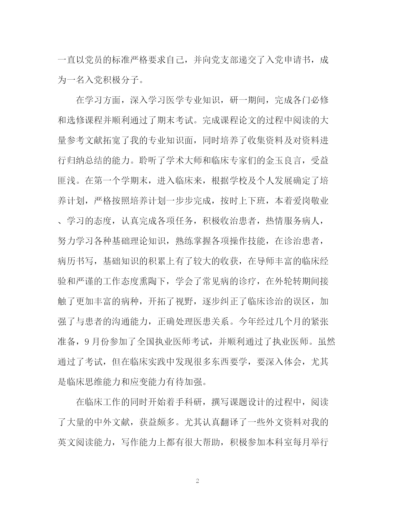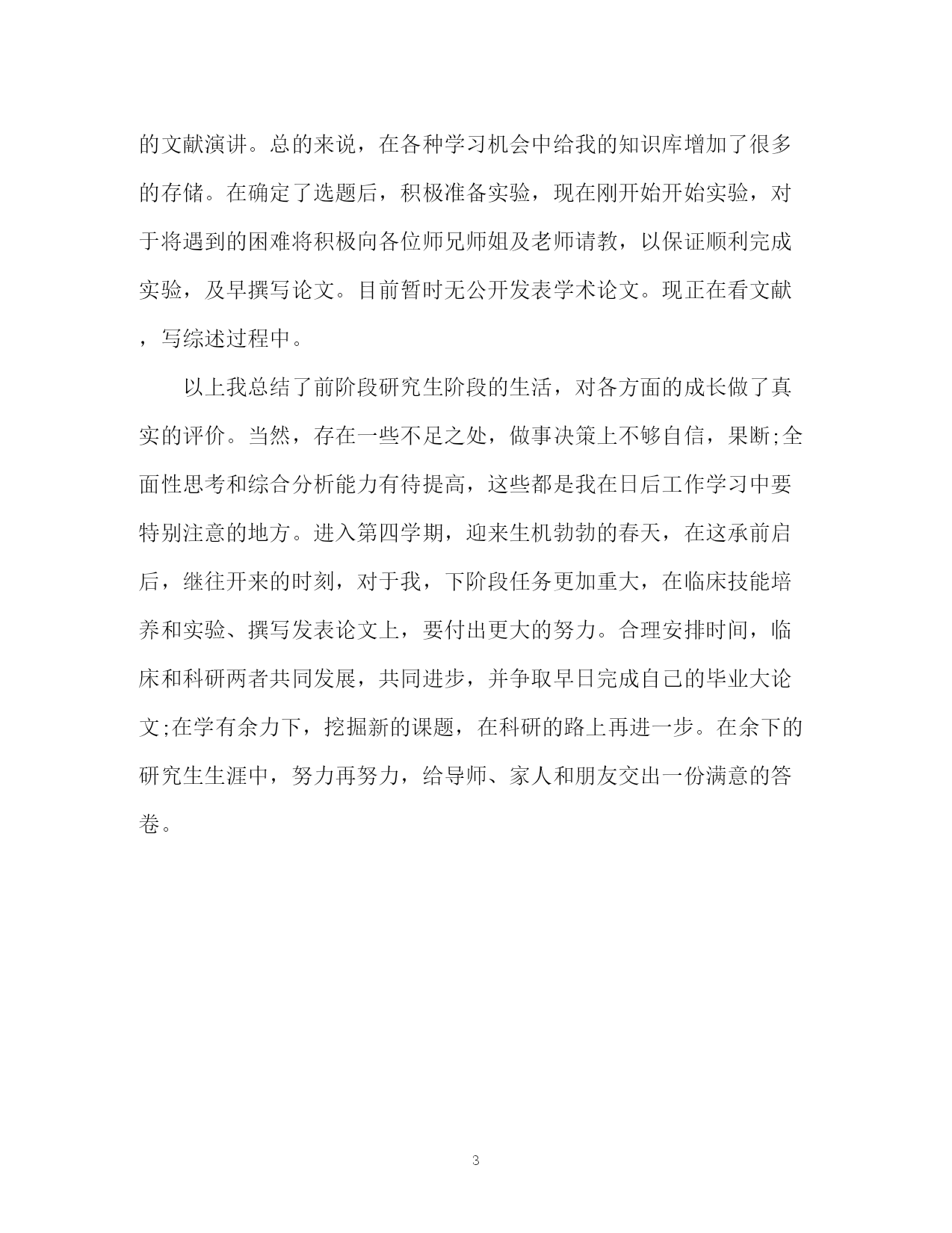 此资料由网络收集而来,如有侵权请告知上传者立即删除。资料共分享,我们负责传递知识。PAGEPAGE3研究生中期考核个人工作总结研究生中期考核个人工作总结时光流逝,一转眼研究生的生活已经过去了一半。回首过去的一年多的时间,我觉得过的还是比较有意义、比较充实的,有很多收获,但同样也有失落的时候。在研二进入下半年的时候,为了使自己的工作能够顺利有序的进展下去,我想对前面的工作、生活及学习的方面进行一个小的总结,目的就是总结经验,发现不足,以利于今后继续发扬优点,补足缺点,为将来适应社会做好充分的准备,把自己的人生道路走得更稳、更好。下面我准备从以下几个方面分别对自己的这一段时间的`经历进行总结。首先在思想上,进入研究生阶段,继续保持优良的传统,继续保持党的先进性。继续认真学习马列主义、毛泽东思想、xxx理论、三个代表”重要思想和科学发展观的精神,牢记“两个务必”,紧抓“八荣八耻”的社会主义荣辱观,贯彻“两次会议”的精神,不断加强自己的思想政治修养。在认真学习理论知识的同时,积极关注国家的大事,积极向周围的优秀的同学学习,积极的向周围优秀的党员学习,一直以党员的标准严格要求自己,并向党支部递交了入党申请书,成为一名入党积极分子。在学习方面,深入学习医学专业知识,研一期间,完成各门必修和选修课程并顺利通过了期末考试。完成课程论文的过程中阅读的大量参考文献拓宽了我的专业知识面,同时培养了收集资料及对资料进行归纳总结的能力。聆听了学术大师和临床专家们的金玉良言,受益匪浅。在第一个学期末,进入临床来,根据学校及个人发展确定了培养计划,严格按照培养计划一步步完成,按时上下班,本着爱岗敬业、学习的态度,认真完成各项任务,积极收治患者,热情服务病人,努力学习各种基础理论知识,熟练掌握各项操作技能,在诊治患者,病历书写,基础知识的积累上有了较大的收获,在导师丰富的临床经验和严谨的工作态度熏陶下,学会了常见病的诊疗,在外轮转期间接触了更加丰富的病种,开拓了视野,逐步纠正了临床诊治的误区,加强了与患者的沟通能力,正确处理医患关系。今年经过几个月的紧张准备,9月份参加了全国执业医师考试,并顺利通过了执业医师。虽然通过了考试,但在临床实践中发现很多东西要学,要深入体会,尤其是临床思维能力和应变能力有待加强。在临床工作的同时开始着手科研,撰写课题设计的过程中,阅读了大量的中外文献,获益颇多。尤其认真翻译了一些外文资料对我的英文阅读能力,写作能力上都有很大帮助,积极参加本科室每月举行的文献演讲。总的来说,在各种学习机会中给我的知识库增加了很多的存储。在确定了选题后,积极准备实验,现在刚开始开始实验,对于将遇到的困难将积极向各位师兄师姐及老师请教,以保证顺利完成实验,及早撰写论文。目前暂时无公开发表学术论文。现正在看文献,写综述过程中。以上我总结了前阶段研究生阶段的生活,对各方面的成长做了真实的评价。当然,存在一些不足之处,做事决策上不够自信,果断;全面性思考和综合分析能力有待提高,这些都是我在日后工作学习中要特别注意的地方。进入第四学期,迎来生机勃勃的春天,在这承前启后,继往开来的时刻,对于我,下阶段任务更加重大,在临床技能培养和实验、撰写发表论文上,要付出更大的努力。合理安排时间,临床和科研两者共同发展,共同进步,并争取早日完成自己的毕业大论文;在学有余力下,挖掘新的课题,在科研的路上再进一步。在余下的研究生生涯中,努力再努力,给导师、家人和朋友交出一份满意的答卷。