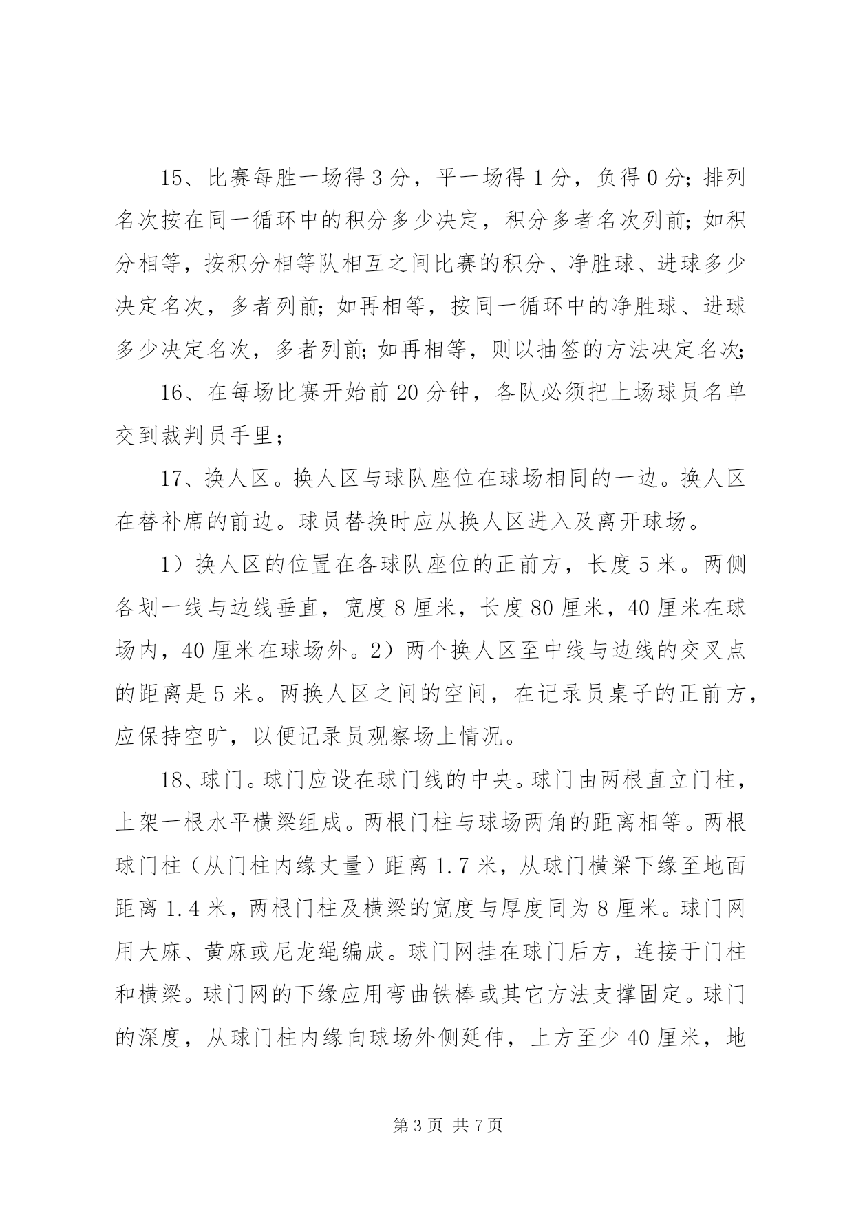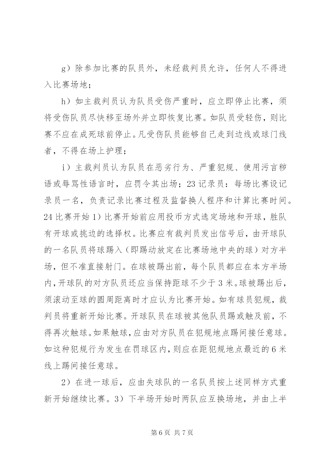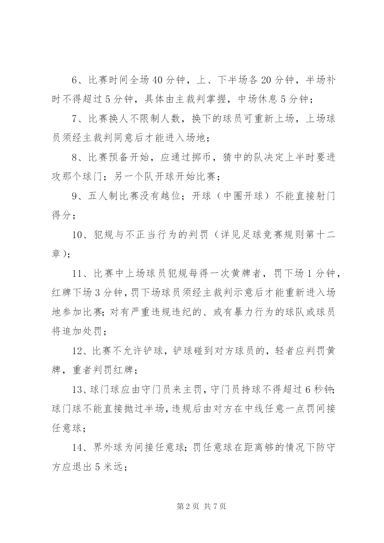 第PAGE\*Arabic\*MERGEFORMAT7页共NUMPAGES\*MERGEFORMAT7页学校机电部足球赛方案及规则五人制足球赛规则1、球场应是长方形的,由二条平行的底线和二条平行的边线组成;球场边线长32米-42米,底线宽16米-22米;2、球门高2米,宽3米,球门柱及横梁必须用木材、金属或被批准的其他材料制成;球场应在二条平行的边线中点画一条中线,中圈是一个5米直径的圆;禁区是以底线的中点为圆心,6米为半径画个半圆组成;点球点应距球门线5米,罚点球时罚球者不能助跑;3、比赛双方不得佩戴护腿板,不得佩戴危及双方的危险物品;比赛双方只能穿平底足球鞋或平底运动鞋;鞋面和鞋底要偏软,具体由当值主裁判决定;4、上场队员:一场比赛应由二队参加,每队上场队员不得多于5名,其中必须有1名为守门员比赛中任何一队因队员被罚出场或其他原因场上队员少于2名时,比赛视为结束,并判对方5:0获胜(如比分已超过5:0的,则以当时比分计).5、每队必须有二套深浅不同的比赛服装,球员比赛服装上的号码(上衣后面的高25厘米,胸前小号码高10厘米,短裤右腿前面高10厘米)必须与报名号码相符,无号、重号均不得上场;6、比赛时间全场40分钟,上、下半场各20分钟,半场补时不得超过5分钟,具体由主裁判掌握,中场休息5分钟;7、比赛换人不限制人数,换下的球员可重新上场,上场球员须经主裁判同意后才能进入场地;8、比赛预备开始,应通过掷币,猜中的队决定上半时要进攻那个球门;另一个队开球开始比赛;9、五人制比赛没有越位;开球(中圈开球)不能直接射门得分;10、犯规与不正当行为的判罚(详见足球竞赛规则第十二章);11、比赛中上场球员犯规每得一次黄牌者,罚下场1分钟,红牌下场3分钟,罚下场球员须经主裁判示意后才能重新进入场地参加比赛;对有严重违规违纪的、或有暴力行为的球队或球员将追加处罚;12、比赛不允许铲球,铲球碰到对方球员的,轻者应判罚黄牌,重者判罚红牌;13、球门球应由守门员来主罚,守门员持球不得超过6秒钟;球门球不能直接抛过半场,违规后由对方在中线任意一点罚间接任意球;14、界外球为间接任意球;罚任意球在距离够的情况下防守方应退出5米远;15、比赛每胜一场得3分,平一场得1分,负得0分;排列名次按在同一循环中的积分多少决定,积分多者名次列前;如积分相等,按积分相等队相互之间比赛的积分、净胜球、进球多少决定名次,多者列前;如再相等,按同一循环中的净胜球、进球多少决定名次,多者列前;如再相等,则以抽签的方法决定名次;16、在每场比赛开始前20分钟,各队必须把上场球员名单交到裁判员手里;17、换人区。换人区与球队座位在球场相同的一边。换人区在替补席的前边。球员替换时应从换人区进入及离开球场。1)换人区的位置在各球队座位的正前方,长度5米。两侧各划一线与边线垂直,宽度8厘米,长度80厘米,40厘米在球场内,40厘米在球场外。2)两个换人区至中线与边线的交叉点的距离是5米。两换人区之间的空间,在记录员桌子的正前方,应保持空旷,以便记录员观察场上情况。18、球门。球门应设在球门线的中央。球门由两根直立门柱,上架一根水平横梁组成。两根门柱与球场两角的距离相等。两根球门柱(从门柱内缘丈量)距离1.7米,从球门横梁下缘至地面距离1.4米,两根门柱及横梁的宽度与厚度同为8厘米。球门网用大麻、黄麻或尼龙绳编成。球门网挂在球门后方,连接于门柱和横梁。球门网的下缘应用弯曲铁棒或其它方法支撑固定。球门的深度,从球门柱内缘向球场外侧延伸,上方至少40厘米,地面至少60厘米。19、球。各组使用5号球。20、比赛时间。1)每场比赛时间40分钟,上下半场各20分钟,中场休息不得超过5分钟。2)比赛时间应由记录员掌握,随时示意裁判员,裁判最终把握比赛延时时间。3)在每半场比赛中,如执行罚点球,则应延长至罚完为止。4)如全场比赛打成平局,则以互踢点球决出胜负(见本规则34条之规定)。21、球员装备:1)队员不得穿戴任何危及其他队员的装备。2)球员装备。球员不能佩带护腿板,球鞋只能是用帆布或软皮革制成的足球鞋,鞋底应用橡胶或其他类似的材料制成,不可有硬质鞋钉。3)队员上场比赛时必须外套组委会提供的分队背心以示区别。21替补程序。1)当要进行替补程序时,替换者必须向裁判示意,并且站在中场场外替换区内准备入场,当被替换者离场后(必须由场内替换区出场),并在记录员示意下,替换者才可入场(必须由场外替换区内进场)参加比赛,当替换球员进场后,替换即告完成,被换出之球员可同一场比赛中再以候补球员的身份替换其他球员,候补球员无论是否在场上比赛,都属裁判员管辖范围之内。2)处罚。在替换球员时,若替换球员在被替换球员离开球场前进场,或不经中场外替换区进场,裁判员须停止比赛同时应判给对方一间