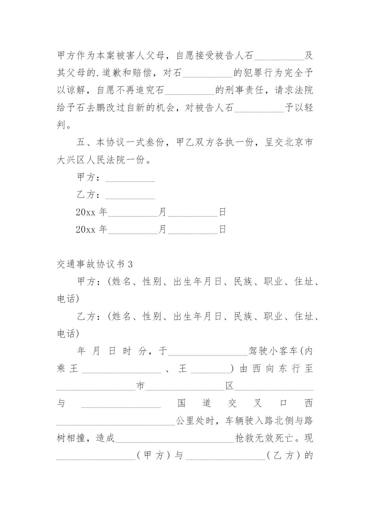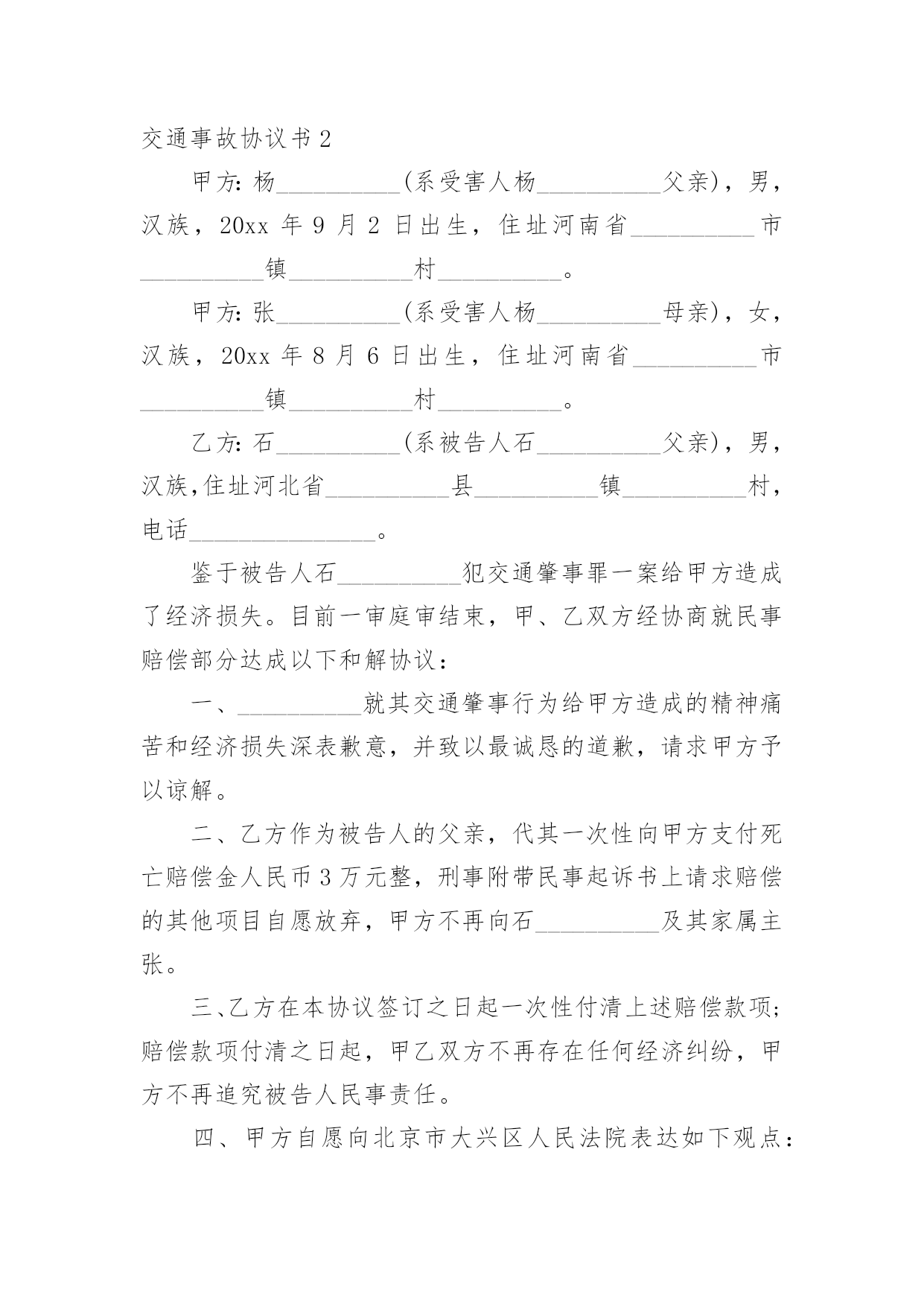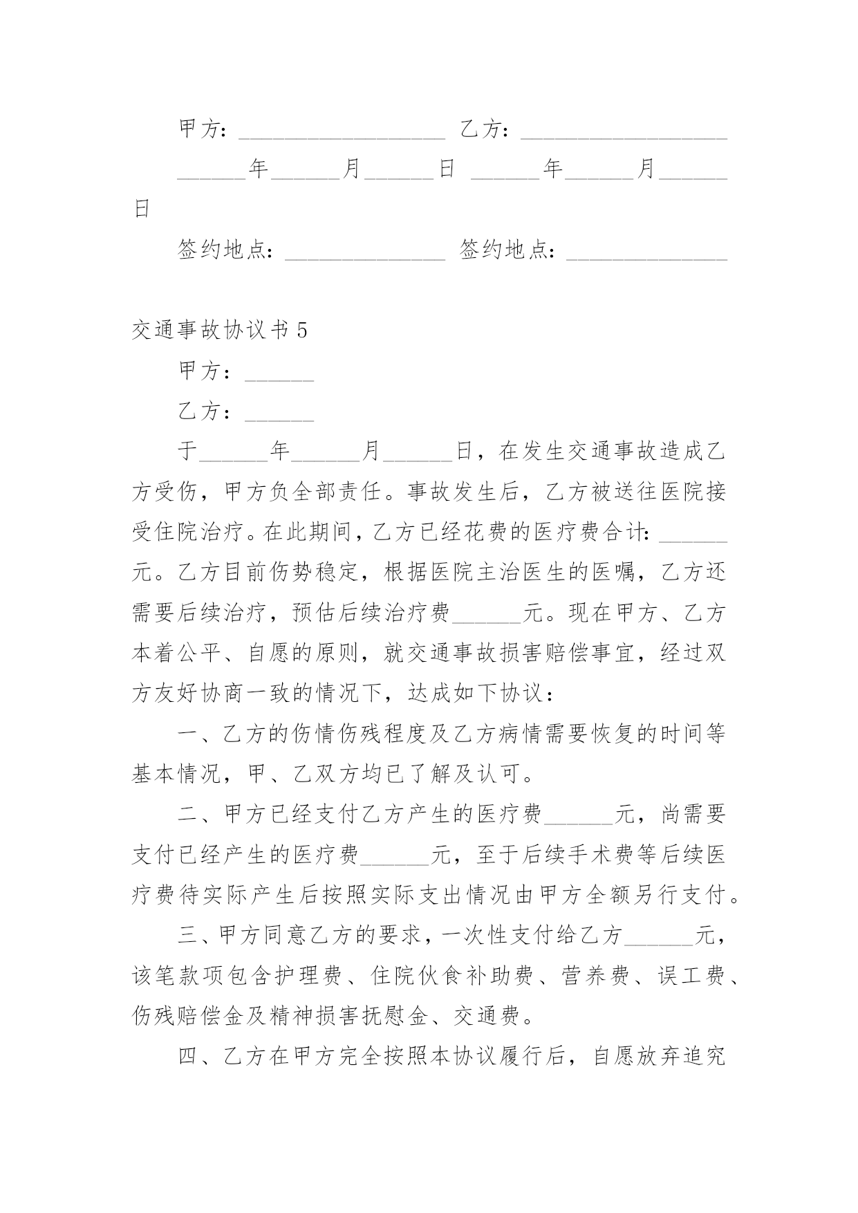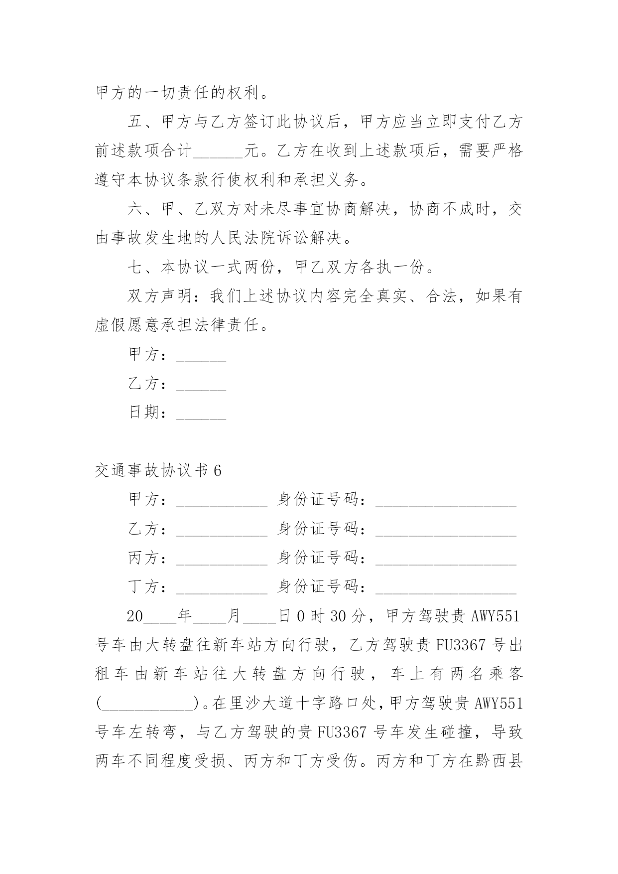 交通事故协议书交通事故协议书(精选15篇)在日常生活和工作中,协议在生活中的使用越来越广泛,签订协议可解决或预防不必要的纠纷。想必许多人都在为如何写好协议而烦恼吧,以下是小编为大家收集的交通事故协议书,希望对大家有所帮助。交通事故协议书1甲方:________________乙方:________________甲、乙双方,本着公平公正、合理合法、以人为本的原则,就_____年___月___日在国道312线1839km+700m处发生的道路交通事故,双方当事人损害赔偿事宜,达成以下协议:一、甲方负责赔偿乙方车辆修理费、拖车费,以保险公司定损为准,其他费用乙方自理。二、甲方车辆损失自理。乙方不承担任何责任。三、本协议签字生效,各方不得反悔、不得上诉。谁反悔,由谁承担由此引发的责任。甲方:________________乙方:________________________年____月____日________年____月____日交通事故协议书2甲方:杨__________(系受害人杨__________父亲),男,汉族,20xx年9月2日出生,住址河南省__________市__________镇__________村__________。甲方:张__________(系受害人杨__________母亲),女,汉族,20xx年8月6日出生,住址河南省__________市__________镇__________村__________。乙方:石__________(系被告人石__________父亲),男,汉族,住址河北省__________县__________镇__________村,电话_______________。鉴于被告人石__________犯交通肇事罪一案给甲方造成了经济损失。目前一审庭审结束,甲、乙双方经协商就民事赔偿部分达成以下和解协议:一、__________就其交通肇事行为给甲方造成的精神痛苦和经济损失深表歉意,并致以最诚恳的道歉,请求甲方予以谅解。二、乙方作为被告人的父亲,代其一次性向甲方支付死亡赔偿金人民币3万元整,刑事附带民事起诉书上请求赔偿的其他项目自愿放弃,甲方不再向石__________及其家属主张。三、乙方在本协议签订之日起一次性付清上述赔偿款项;赔偿款项付清之日起,甲乙双方不再存在任何经济纠纷,甲方不再追究被告人民事责任。四、甲方自愿向北京市大兴区人民法院表达如下观点:甲方作为本案被害人父母,自愿接受被告人石__________及其父母的.道歉和赔偿,对石__________的犯罪行为完全予以谅解,自愿不再追究石__________的刑事责任,请求法院给予石去鹏改过自新的机会,对被告人石__________予以轻判。五、本协议一式叁份,甲乙双方各执一份,呈交北京市大兴区人民法院一份。甲方:__________乙方:__________20xx年__________月__________日20xx年__________月__________日交通事故协议书3甲方:(姓名、性别、出生年月日、民族、职业、住址、电话)乙方:(姓名、性别、出生年月日、民族、职业、住址、电话)年月日时分,于________________驾驶小客车(内乘王________________、王________)由西向东行至________________市________________区________________与________________国道交叉口西________________________公里处时,车辆驶入路北侧与路树相撞,造成________________________抢救无效死亡。现________________(甲方)与________________(乙方)的________________________名近亲属(乙方)就________________死亡赔偿事宜,本着平等、自愿、公平原则,经友好协商,达成如下协议:一、甲方一次性支付给乙方六人死亡赔偿金、被扶养人生活费等共计________________万元(未包括丧葬费,丧葬费壹万五仟元已经在本协议签定前由甲方________________支付给了乙方________________的哥哥________________)。二、甲方将上述________________万元于本协议签订后日内汇入乙方六人共同指定的银行帐号。帐号为:三、上述费用支付给乙方六人后,由乙方六人内部自行分配、处理,其分配、处理的方式、后果与甲方无关。四、甲方履行汇款义务后,乙方任何一人就此事保证不以任何形式、任何理由就________________死亡一事向甲方要求其他任何费用。五、甲方履行汇款义务后,就此事处理即告终结,甲乙双方之间不再
