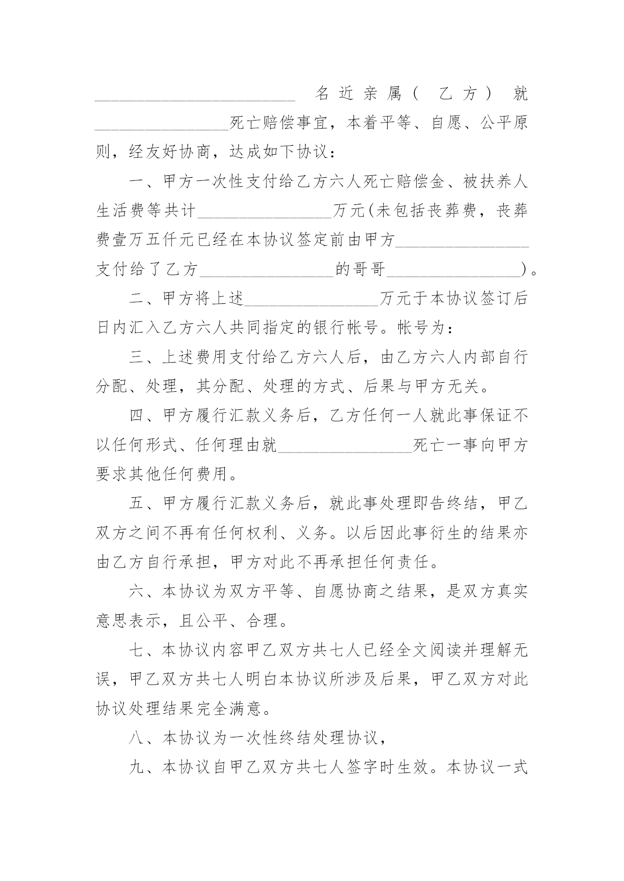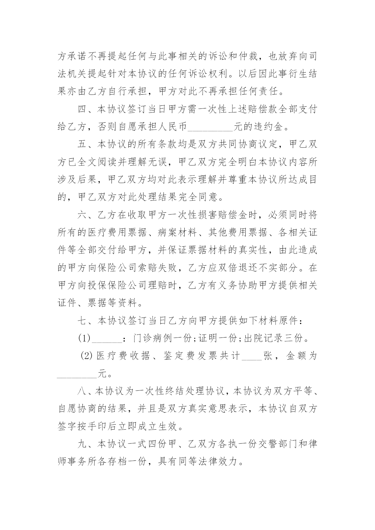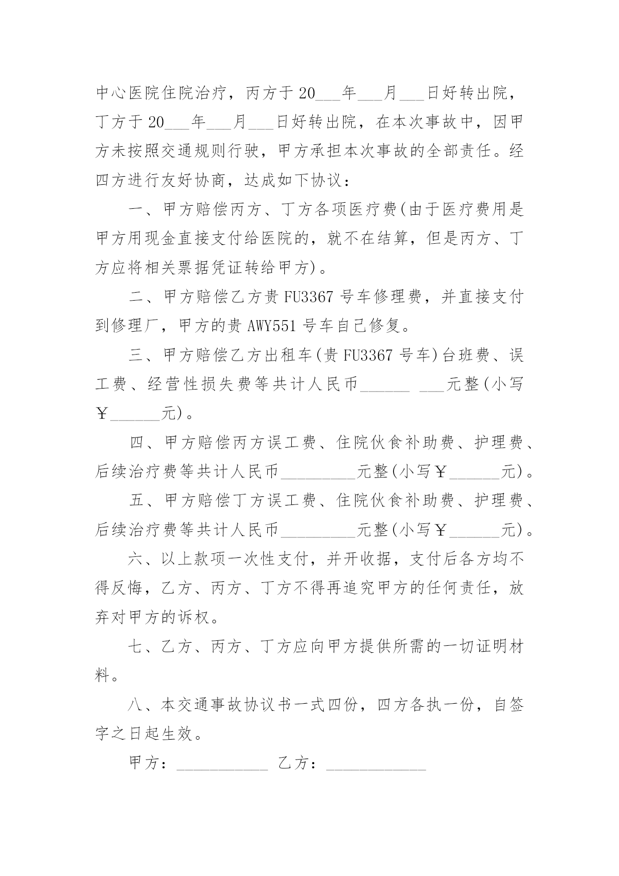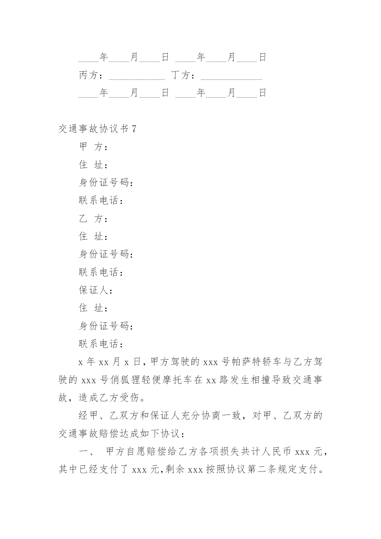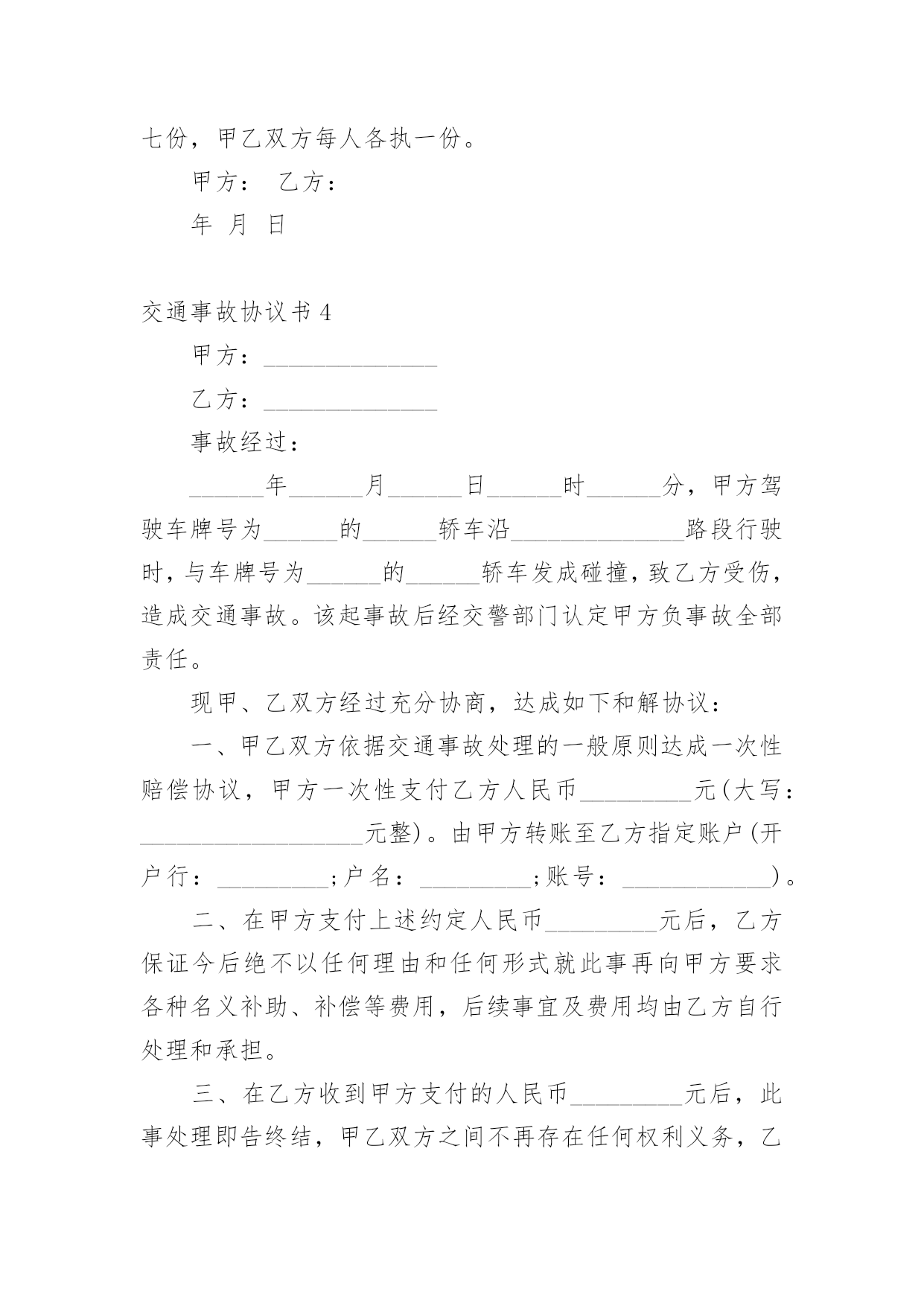 交通事故协议书交通事故协议书(精选15篇)在日常生活和工作中,协议在生活中的使用越来越广泛,签订协议可解决或预防不必要的纠纷。想必许多人都在为如何写好协议而烦恼吧,以下是小编为大家收集的交通事故协议书,希望对大家有所帮助。交通事故协议书1甲方:________________乙方:________________甲、乙双方,本着公平公正、合理合法、以人为本的原则,就_____年___月___日在国道312线1839km+700m处发生的道路交通事故,双方当事人损害赔偿事宜,达成以下协议:一、甲方负责赔偿乙方车辆修理费、拖车费,以保险公司定损为准,其他费用乙方自理。二、甲方车辆损失自理。乙方不承担任何责任。三、本协议签字生效,各方不得反悔、不得上诉。谁反悔,由谁承担由此引发的责任。甲方:________________乙方:________________________年____月____日________年____月____日交通事故协议书2甲方:杨__________(系受害人杨__________父亲),男,汉族,20xx年9月2日出生,住址河南省__________市__________镇__________村__________。甲方:张__________(系受害人杨__________母亲),女,汉族,20xx年8月6日出生,住址河南省__________市__________镇__________村__________。乙方:石__________(系被告人石__________父亲),男,汉族,住址河北省__________县__________镇__________村,电话_______________。鉴于被告人石__________犯交通肇事罪一案给甲方造成了经济损失。目前一审庭审结束,甲、乙双方经协商就民事赔偿部分达成以下和解协议:一、__________就其交通肇事行为给甲方造成的精神痛苦和经济损失深表歉意,并致以最诚恳的道歉,请求甲方予以谅解。二、乙方作为被告人的父亲,代其一次性向甲方支付死亡赔偿金人民币3万元整,刑事附带民事起诉书上请求赔偿的其他项目自愿放弃,甲方不再向石__________及其家属主张。三、乙方在本协议签订之日起一次性付清上述赔偿款项;赔偿款项付清之日起,甲乙双方不再存在任何经济纠纷,甲方不再追究被告人民事责任。四、甲方自愿向北京市大兴区人民法院表达如下观点:甲方作为本案被害人父母,自愿接受被告人石__________及其父母的.道歉和赔偿,对石__________的犯罪行为完全予以谅解,自愿不再追究石__________的刑事责任,请求法院给予石去鹏改过自新的机会,对被告人石__________予以轻判。五、本协议一式叁份,甲乙双方各执一份,呈交北京市大兴区人民法院一份。甲方:__________乙方:__________20xx年__________月__________日20xx年__________月__________日交通事故协议书3甲方:(姓名、性别、出生年月日、民族、职业、住址、电话)乙方:(姓名、性别、出生年月日、民族、职业、住址、电话)年月日时分,于________________驾驶小客车(内乘王________________、王________)由西向东行至________________市________________区________________与________________国道交叉口西________________________公里处时,车辆驶入路北侧与路树相撞,造成________________________抢救无效死亡。现________________(甲方)与________________(乙方)的________________________名近亲属(乙方)就________________死亡赔偿事宜,本着平等、自愿、公平原则,经友好协商,达成如下协议:一、甲方一次性支付给乙方六人死亡赔偿金、被扶养人生活费等共计________________万元(未包括丧葬费,丧葬费壹万五仟元已经在本协议签定前由甲方________________支付给了乙方________________的哥哥________________)。二、甲方将上述________________万元于本协议签订后日内汇入乙方六人共同指定的银行帐号。帐号为:三、上述费用支付给乙方六人后,由乙方六人内部自行分配、处理,其分配、处理的方式、后果与甲方无关。四、甲方履行汇款义务后,乙方任何一人就此事保证不以任何形式、任何理由就________________死亡一事向甲方要求其他任何费用。五、甲方履行汇款义务后,就此事处理即告终结,甲乙双方之间不再