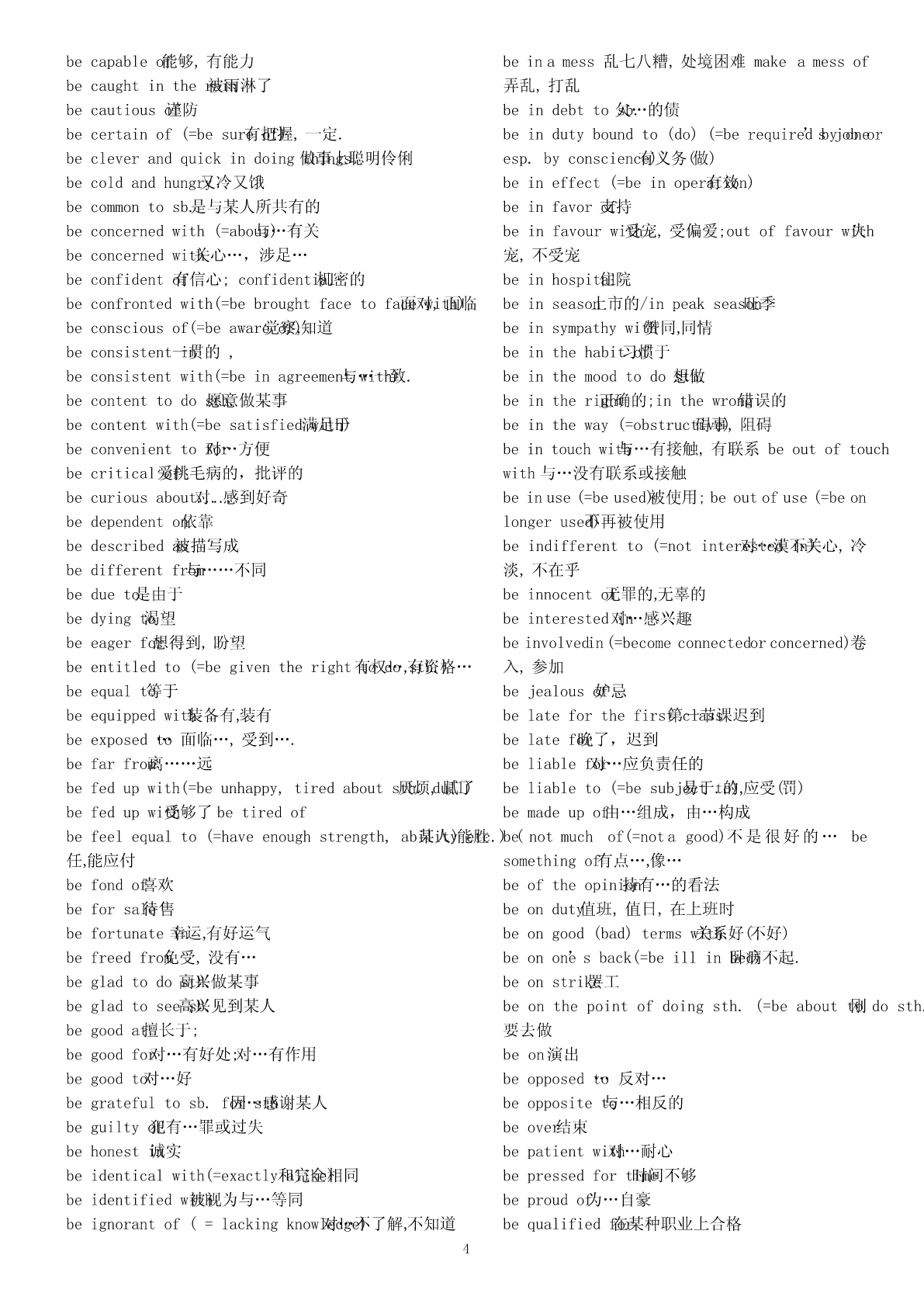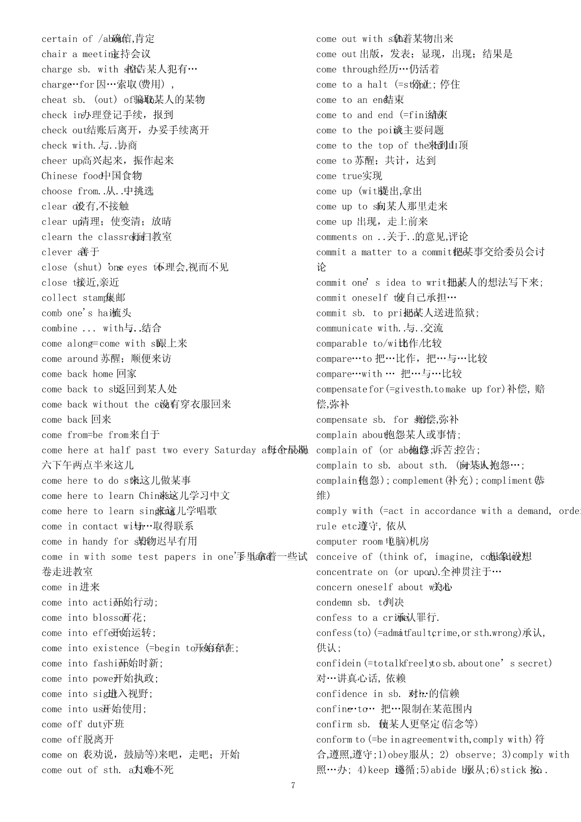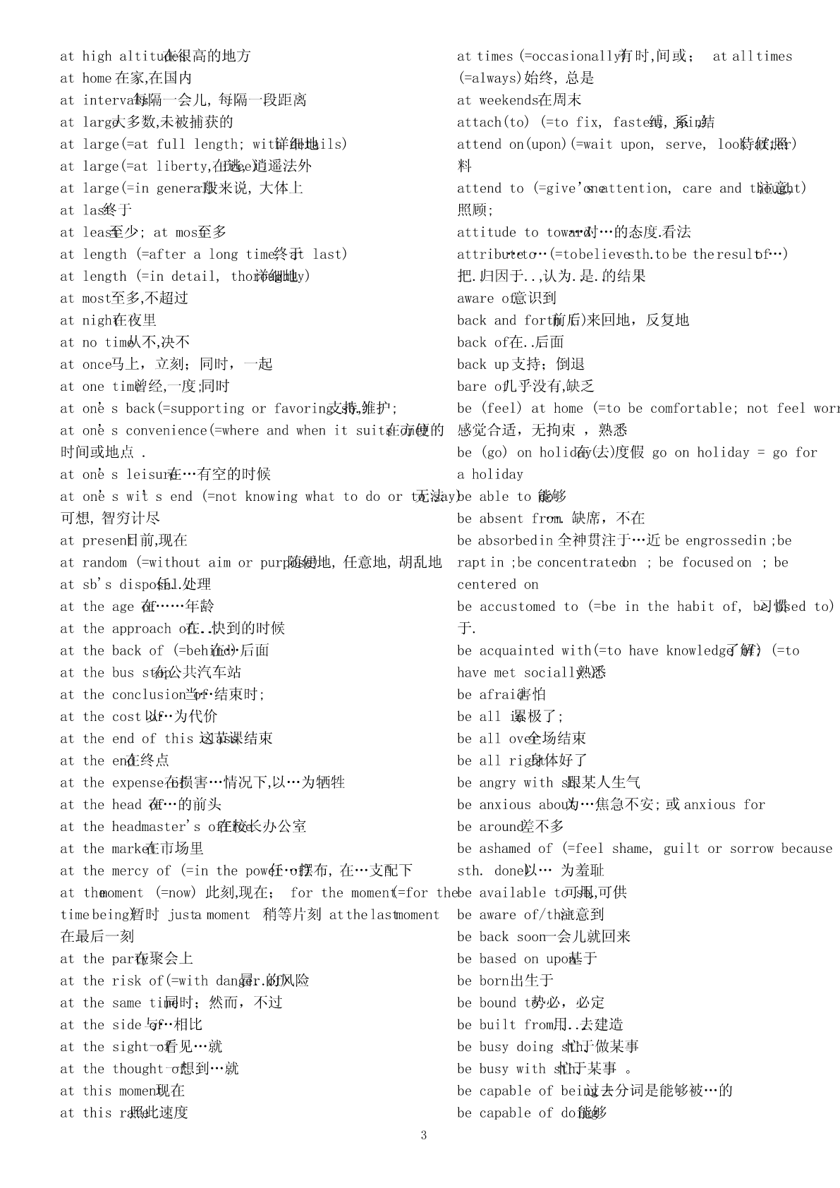 abigheadache令人头痛的事情absentfrom不在,缺席abighouse一间大的房子abundantin富于abitcheaper便宜一点儿access(to)不可数名词()能接近,进入,了解aboyinadirtyT-shirt一个穿着脏T恤衫的男孩accordingto根据adangerto对…的危险;beindanger(of)处于…危险中;beoutaccountfor(=giveanexplanationorreason解释,for)ofdanger脱离危险说明.adepartmentstore百货商店accusesb.of控告sth.afamousplay著名戏剧accuse…of…(=charge…with;blamesb.forsth.;afew表示肯定()有些,几个blamesth.onsb.;complainabout)指控,控告afraction一部分ofactas扮演;agooddealof接不可数名词()许多,大量actfor代理agoodidea好主意acton奉行,按照…行动;agoodlakeforskating适合滑冰的湖actuponeachother相互作用agoodplace一个好地方adaptoneselfto(=adjustoneself使自to)己适应于agoodplayer一名好远动员adaptto适应agoodrest好好休息adapt…(for)(=makesth.Suitableforanew改need)agreatquantity接可数或不可数of()大量编,改写(以适应新的需要)alackof...缺少...addto增加(addupto)alargeamountof接不可数名词()大量addupto合计达alittle表示肯定()一些,一点点addup合计alittlebetter好一点儿add…to…把…加入alotof接可数、不可数名词()大量的,许多addressoneself向to…讲话;与…通信amapofBeijing(China,theworld)一张北京地图adhereto(=abideby,conformto,complywith,clingto,amapofChina一张中国地图insiston,peresistin,observe,opinion,粘附;belief)amatterofconcern焦点坚持,遵循amatterofcourse理所当然的事adjacent(=nextto,close毗邻to)的,临近的anewstudent一名新生adjust..(to)(=changeslightly)调节;适应;aniceschool一所好的学校admitof(=becapableof,leaveroom…的可for)能,anumberof接可数名词()若干,许多留有…的余地.apairofshoes一双鞋adoptapositiveapproach采取一种正确的方法apieceofbread一片而包afterall毕竟,终究apieceofcake一块蛋糕afterthefashion依照(of)…apostoffice邮局againandagain一次又一次aquarterpast十点一刻tenagainstone’swill违心地,违背意愿地atwill随心asequenceof一系列的所欲;withawill有决心地aseriesof一系列,一连串agreetosth.同意ateamfromacountryschool一支来自农村的球队(运动员)agreewithsb.赞同(某人意见)atelephonebooth电话亭agreementon...关于...达成的协议atelephonenumber电话号码aheadofschedule提前;aticketforShanghai一张飞往上海的机票aheadoftime/schedule提前awarningagainst告诫…不要awarningof警告…存在…aheadof在…之前,超过…awordinone’sear私房话,秘密话aimtodo指望做某事a)passionfor对…的热爱,热情allatonce(=suddenly,立即now),马上;突然abideby(=befaithfulto;忠obey)于;遵守。allbut几乎,差一点;除了…都aboutschoollifeinEngland关于英国学校生活allinall大体上说;aboveall(=especially,mostimportant首先of,all)首要,尤其allkinds各种各样of是,最重要的.al