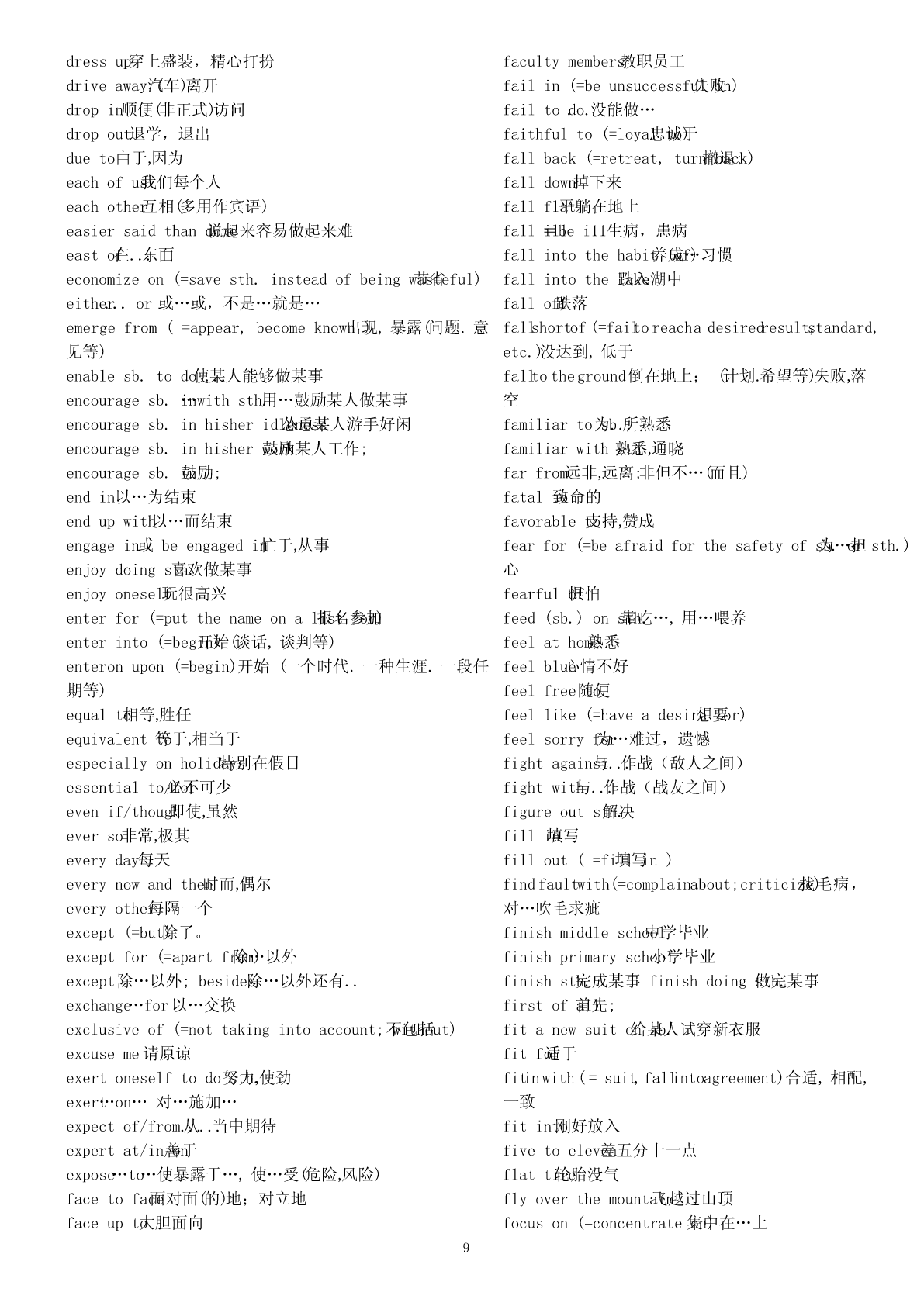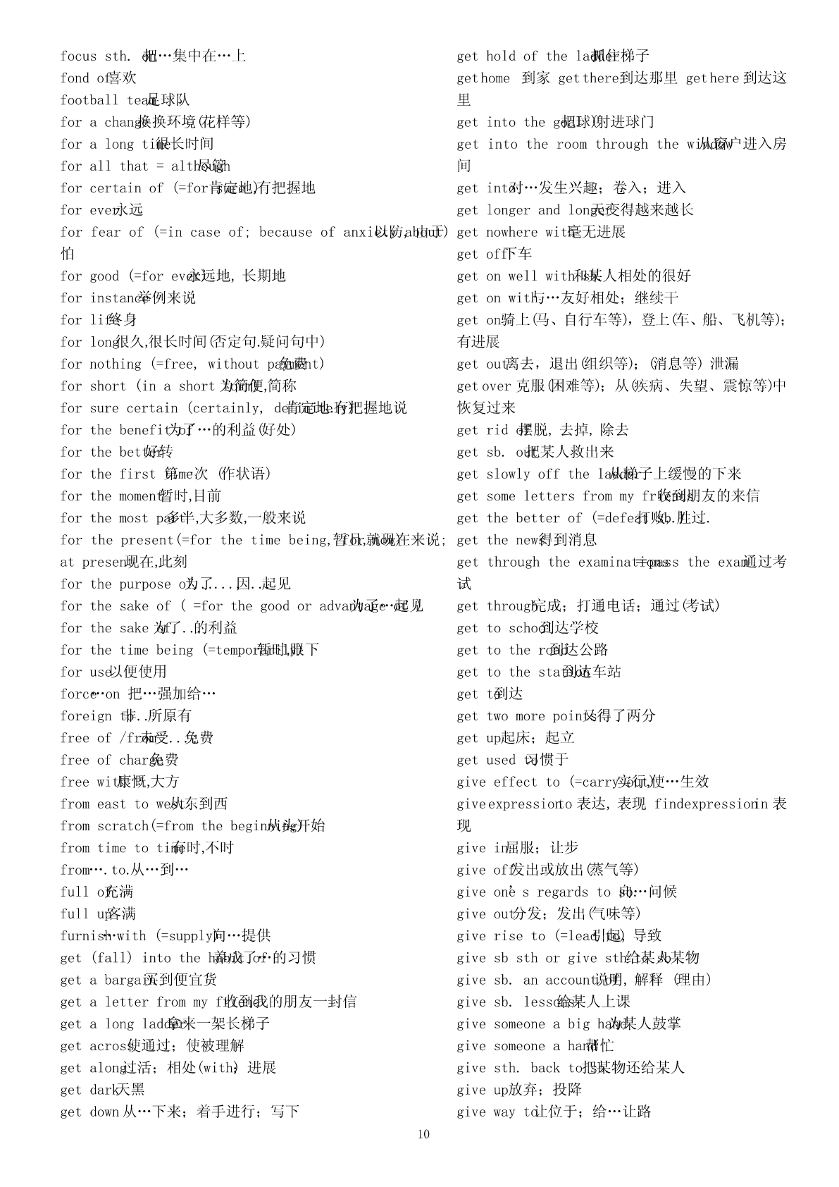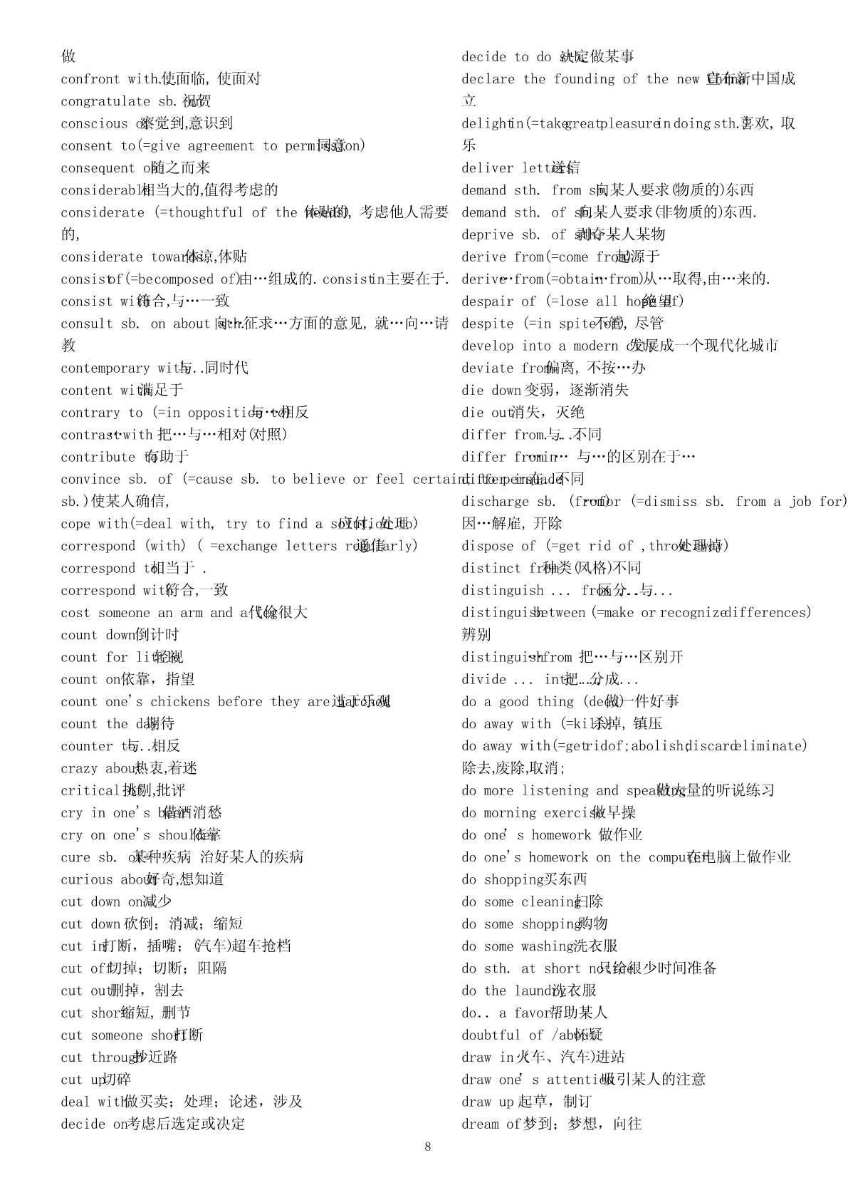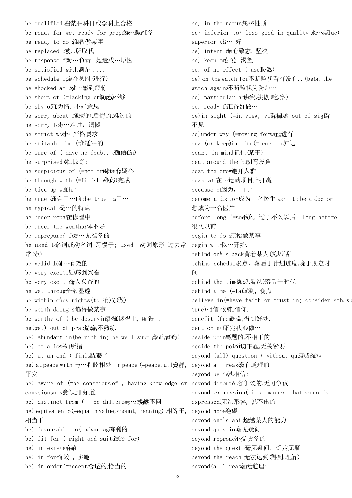 abigheadache令人头痛的事情absentfrom不在,缺席abighouse一间大的房子abundantin富于abitcheaper便宜一点儿access(to)不可数名词()能接近,进入,了解aboyinadirtyT-shirt一个穿着脏T恤衫的男孩accordingto根据adangerto对…的危险;beindanger(of)处于…危险中;beoutaccountfor(=giveanexplanationorreason解释,for)ofdanger脱离危险说明.adepartmentstore百货商店accusesb.of控告sth.afamousplay著名戏剧accuse…of…(=charge…with;blamesb.forsth.;afew表示肯定()有些,几个blamesth.onsb.;complainabout)指控,控告afraction一部分ofactas扮演;agooddealof接不可数名词()许多,大量actfor代理agoodidea好主意acton奉行,按照…行动;agoodlakeforskating适合滑冰的湖actuponeachother相互作用agoodplace一个好地方adaptoneselfto(=adjustoneself使自to)己适应于agoodplayer一名好远动员adaptto适应agoodrest好好休息adapt…(for)(=makesth.Suitableforanew改need)agreatquantity接可数或不可数of()大量编,改写(以适应新的需要)alackof...缺少...addto增加(addupto)alargeamountof接不可数名词()大量addupto合计达alittle表示肯定()一些,一点点addup合计alittlebetter好一点儿add…to…把…加入alotof接可数、不可数名词()大量的,许多addressoneself向to…讲话;与…通信amapofBeijing(China,theworld)一张北京地图adhereto(=abideby,conformto,complywith,clingto,amapofChina一张中国地图insiston,peresistin,observe,opinion,粘附;belief)amatterofconcern焦点坚持,遵循amatterofcourse理所当然的事adjacent(=nextto,close毗邻to)的,临近的anewstudent一名新生adjust..(to)(=changeslightly)调节;适应;aniceschool一所好的学校admitof(=becapableof,leaveroom…的可for)能,anumberof接可数名词()若干,许多留有…的余地.apairofshoes一双鞋adoptapositiveapproach采取一种正确的方法apieceofbread一片而包afterall毕竟,终究apieceofcake一块蛋糕afterthefashion依照(of)…apostoffice邮局againandagain一次又一次aquarterpast十点一刻tenagainstone’swill违心地,违背意愿地atwill随心asequenceof一系列的所欲;withawill有决心地aseriesof一系列,一连串agreetosth.同意ateamfromacountryschool一支来自农村的球队(运动员)agreewithsb.赞同(某人意见)atelephonebooth电话亭agreementon...关于...达成的协议atelephonenumber电话号码aheadofschedule提前;aticketforShanghai一张飞往上海的机票aheadoftime/schedule提前awarningagainst告诫…不要awarningof警告…存在…aheadof在…之前,超过…awordinone’sear私房话,秘密话aimtodo指望做某事a)passionfor对…的热爱,热情allatonce(=suddenly,立即now),马上;突然abideby(=befaithfulto;忠obey)于;遵守。allbut几乎,差一点;除了…都aboutschoollifeinEngland关于英国学校生活allinall大体上说;aboveall(=especially,mostimportant首先of,all)首要,尤其allkinds各种各样of是,最重要的.al