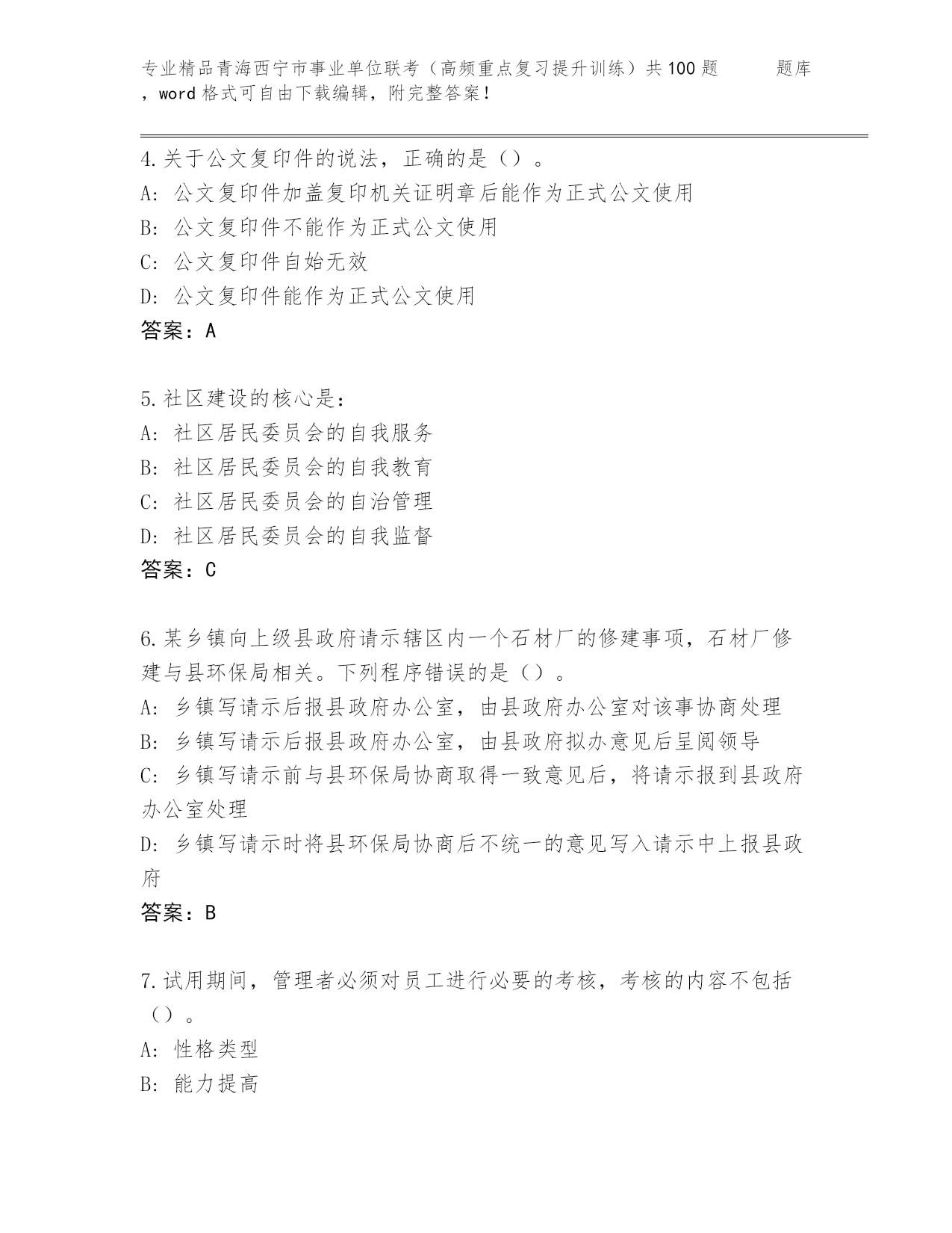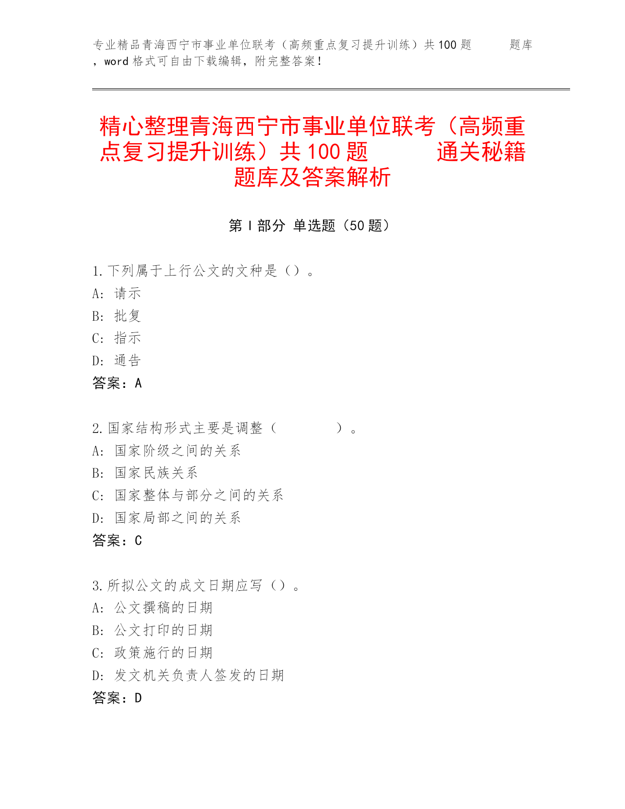 优选青海西宁市事业单位联考(高频重点复习提升训练)共100题 通关秘籍题库精品(B卷)