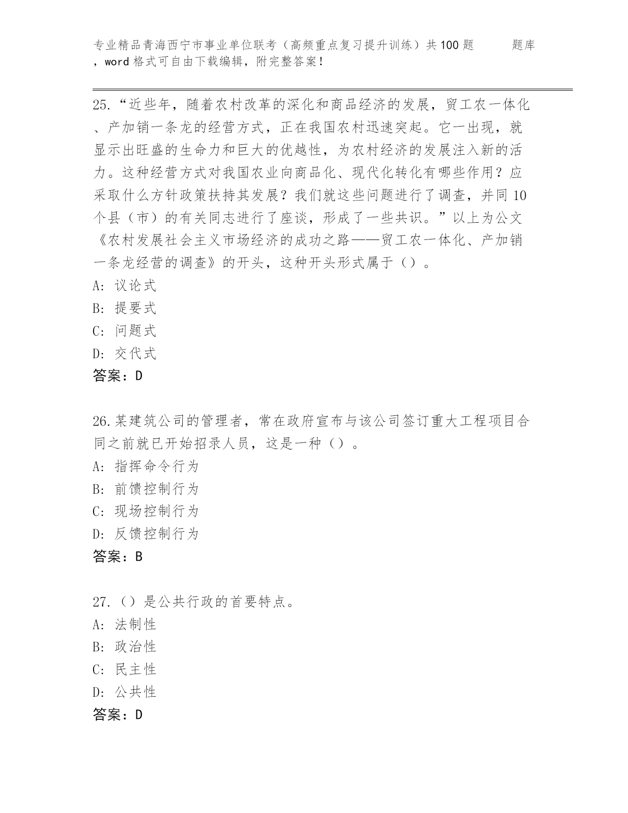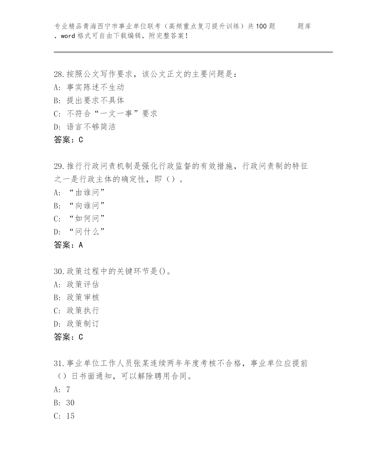 精心整理青海西宁市事业单位联考(高频重点复习提升训练)共100题 题库(综合题)