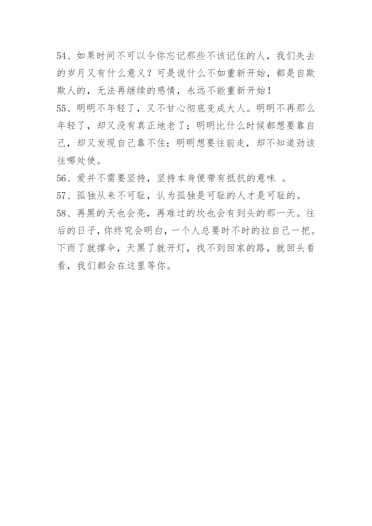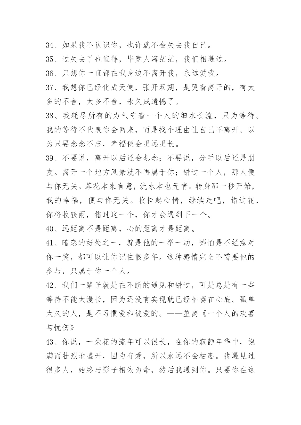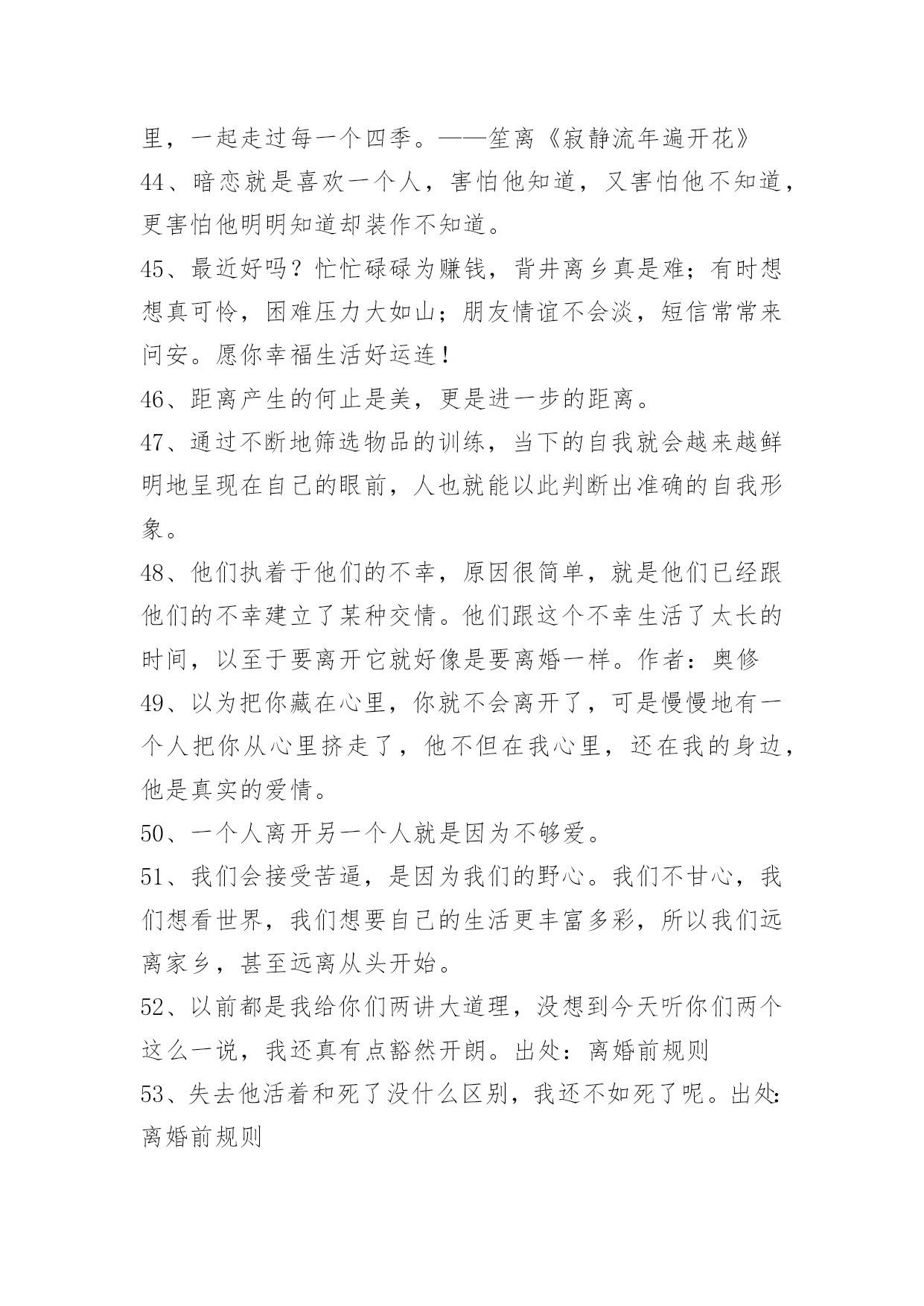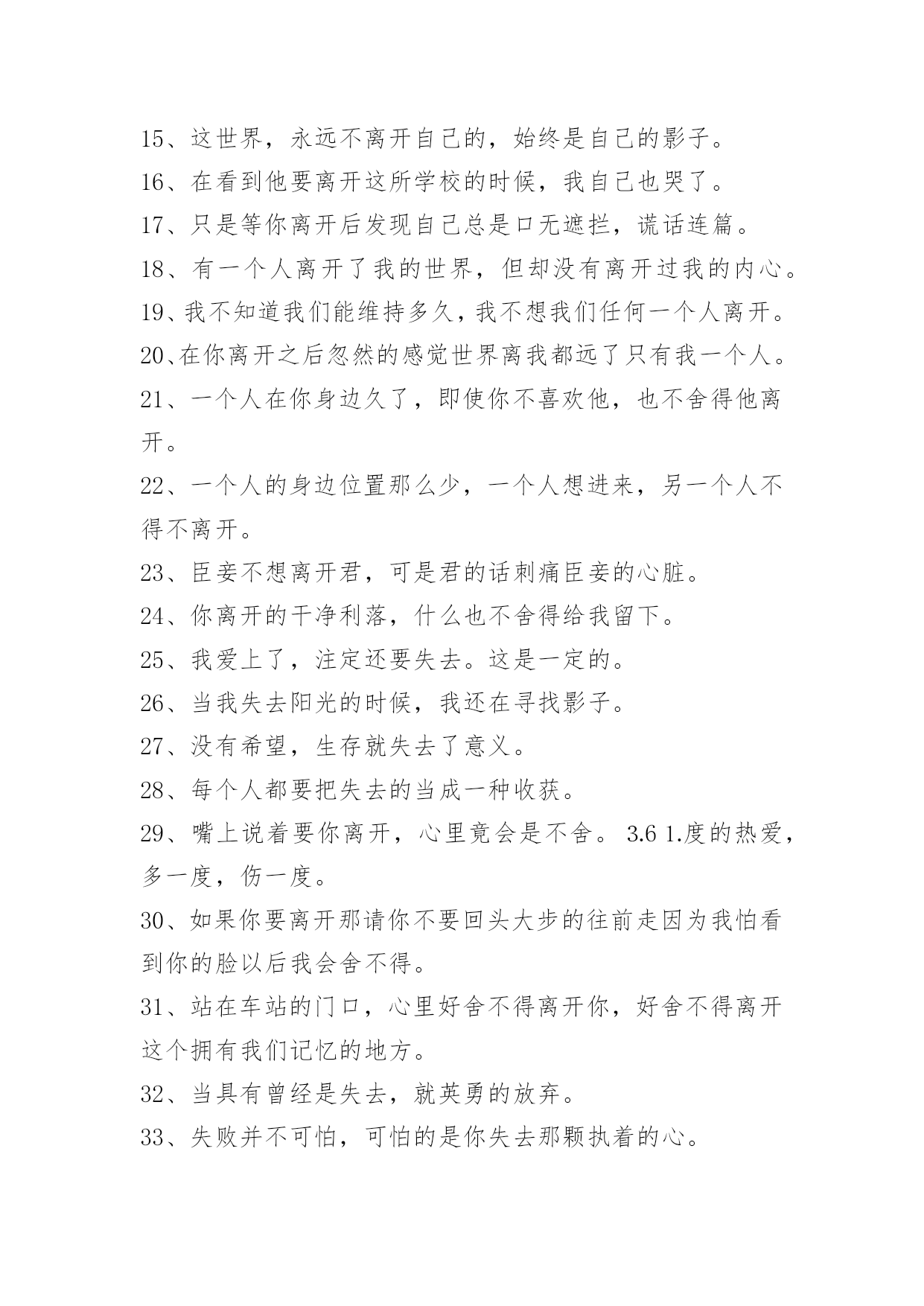 离开的语录58条2024年通用离开的语录汇总58条如果有一天会离开我,那现在就别靠近我。下面是小编为大家收集的离开的语录58条,欢迎大家阅读。1、曾经的种种也只不过是年少时的一种错觉,任目光停留再也不愿离开。2、可是享受孤独,还是会孤单,只好把自己变得越来越强,可是再强的人,还是会孤独。3、大概等我离开了你,我就会想到你的好了。4、当你离开的那天,我相信这世界没有誓言。5、我从未拥有过你,却感觉失去你千万次。6、我的世界失去了色彩,我的心结等你来解开。7、真的爱了。但这要是你想要的结局我离开。8、为你唱首离歌,你却真的离开了我。9、如果有一天你爱的人不爱你了,你一定要转身离开。10、舍才有得当某天你发现自己失去或放弃某一些东西或人后其实你在渐渐得到更好的。11、我失去了很多也得到过很多,但终究渐行渐远然后消失在我的生活,时光无情却不得不一直走下去。12、一无所有并不可怕,可怕的是得到后再失去。13、如果你亲口说不爱我了,我会自己离开的。14、爱情永远是两个人的事,离开是一个人的事。15、这世界,永远不离开自己的,始终是自己的影子。16、在看到他要离开这所学校的时候,我自己也哭了。17、只是等你离开后发现自己总是口无遮拦,谎话连篇。18、有一个人离开了我的世界,但却没有离开过我的内心。19、我不知道我们能维持多久,我不想我们任何一个人离开。20、在你离开之后忽然的感觉世界离我都远了只有我一个人。21、一个人在你身边久了,即使你不喜欢他,也不舍得他离开。22、一个人的身边位置那么少,一个人想进来,另一个人不得不离开。23、臣妾不想离开君,可是君的话刺痛臣妾的心脏。24、你离开的干净利落,什么也不舍得给我留下。25、我爱上了,注定还要失去。这是一定的。26、当我失去阳光的时候,我还在寻找影子。27、没有希望,生存就失去了意义。28、每个人都要把失去的当成一种收获。29、嘴上说着要你离开,心里竟会是不舍。⒊6⒈度的热爱,多一度,伤一度。30、如果你要离开那请你不要回头大步的往前走因为我怕看到你的脸以后我会舍不得。31、站在车站的门口,心里好舍不得离开你,好舍不得离开这个拥有我们记忆的地方。32、当具有曾经是失去,就英勇的放弃。33、失败并不可怕,可怕的是你失去那颗执着的心。34、如果我不认识你,也许就不会失去我自己。35、过失去了也值得,毕竟人海茫茫,我们相遇过。36、只想你一直都在我身边不离开我,永远爱我。37、我想你已经化成天使,张开双翅,是哭着离开的,有太多的不舍,太多不舍,永久成遗憾了。38、我耗尽所有的力气守着一个人的细水长流,只为等待。我的等待不代表你会回来,而是找个理由让自己不离开。以为只要念念不忘,幸福便会更远更长。39、不要说,离开以后还会想念;不要说,分手以后还是朋友。离开一个地方风景就不再属于你;错过一个人,那人便与你无关。落花本来有意,流水本也无情。转身那一秒开始,我的幸福,便与你无关。收拾起心情,继续走吧,错过花,你将收获雨,错过这一个,你才会遇到下一个。40、远距离不是距离,心的距离才是距离。41、暗恋的好处之一,就是他的一举一动,哪怕是不经意对你一笑,都可以让你记住很多年。这种感情完全不需要他的参与,只属于你一个人。42、我们一辈子就是在不断的遇见和错过,可是总是有一些等待不能太漫长,因为还没有实现就已经枯萎在心底。孤单太久的人,是不习惯爱和被爱的。——笙离《一个人的欢喜与忧伤》43、你说,一朵花的流年可以很长,在你的寂静年华中,饱满而壮烈地盛开,因为有爱,所以永远不会枯萎。我遇见过很多人,始终与影子相依为命,然后我遇到你。只要你在这里,一起走过每一个四季。——笙离《寂静流年遍开花》44、暗恋就是喜欢一个人,害怕他知道,又害怕他不知道,更害怕他明明知道却装作不知道。45、最近好吗?忙忙碌碌为赚钱,背井离乡真是难;有时想想真可怜,困难压力大如山;朋友情谊不会淡,短信常常来问安。愿你幸福生活好运连!46、距离产生的何止是美,更是进一步的距离。47、通过不断地筛选物品的训练,当下的自我就会越来越鲜明地呈现在自己的眼前,人也就能以此判断出准确的自我形象。48、他们执着于他们的不幸,原因很简单,就是他们已经跟他们的不幸建立了某种交情。他们跟这个不幸生活了太长的时间,以至于要离开它就好像是要离婚一样。作者:奥修49、以为把你藏在心里,你就不会离开了,可是慢慢地有一个人把你从心里挤走了,他不但在我心里,还在我的身边,他是真实的爱情。50、一个人离开另一个人就是因为不够爱。51、我们会接受苦逼,是因为我们的野心。我们不甘心,我们想看世界,我们想要自己的生活更丰富多彩,所以我们远离家乡,甚至远离从头开始。52、以前都是我给你们两讲大道理,没想到今天听你们两个这么一说,我还真有点豁然开朗。出处:离婚前规则53、失去他活着