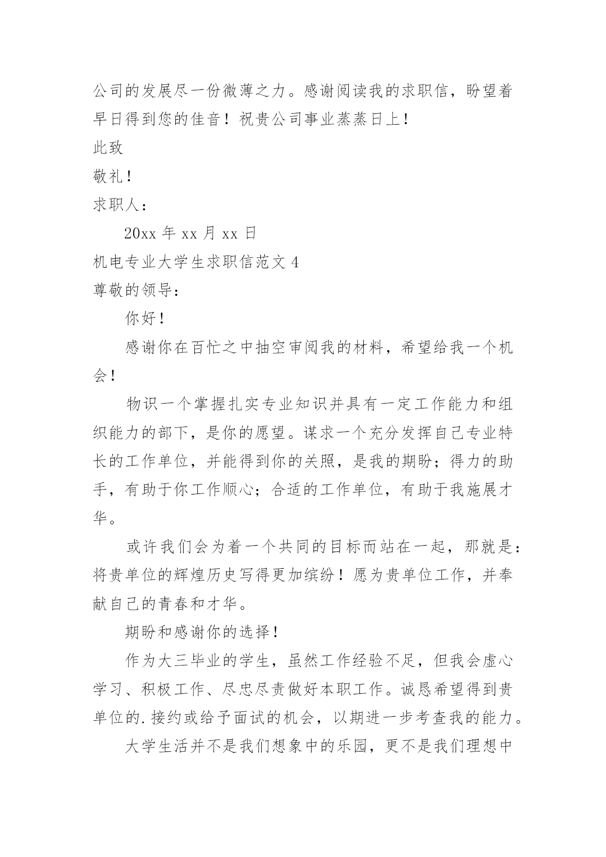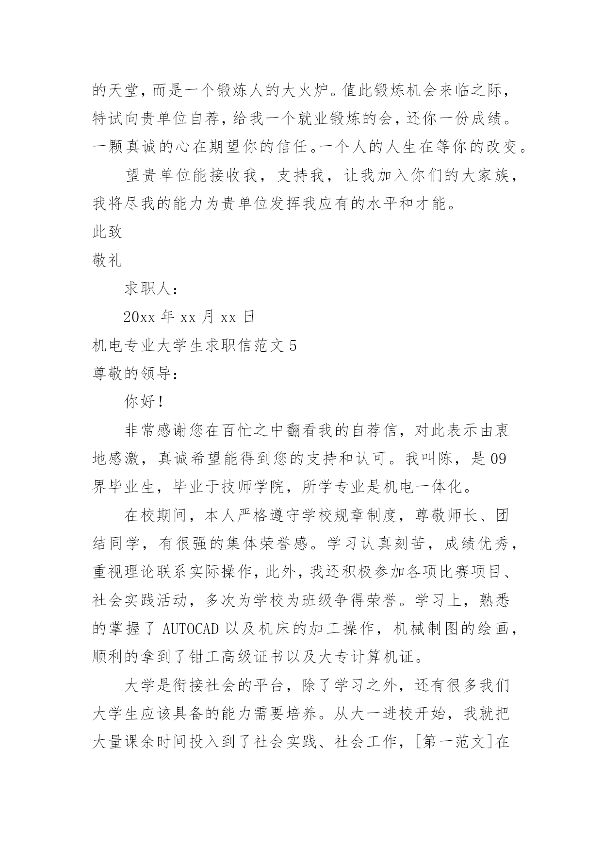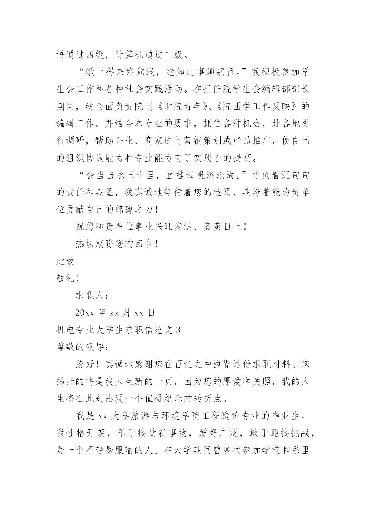 机电专业大学生求职信机电专业大学生求职信范文日子如同白驹过隙,不经意间,眼见着,找工作的时间马上到来,求职信也应跟上时间的脚步了哦。那么怎样写好求职信呢?下面是小编帮大家整理的机电专业大学生求职信范文,仅供参考,希望能够帮助到大家。机电专业大学生求职信范文1敬爱的领导:您好!打扰了,我是,很荣幸学的专业符合您单位的需要,我希望在精力之际,找到一份适合自己的工作,充分的展现自己的才华,实现自己的人身价值。我的专业是财务会计,作为一个财务会计人员必须具备良好的品质和专业的知识理论。在校期间,我系统的掌握了统计学、应用文等会计学理论。自入学以来,我一直竭尽全力做好应该做的事情。我告诉自己,哪怕是1%的希望,我也要投入100%的努力。在闲余之际,我广泛的.涉及了大量的书籍,不仅能充实自己,同时,也培养了我诚实、稳重、积极的进取态度。我知道,作为一个会计人员,计算机和网络是将来的工具,在学好专业的前提之下,我熟练的掌握了计算机技术,并能很好的运用。现在,我对做好会计工作非常自信,我不满足与现有的知识水平,期望在实践中得到锻炼和提高,因此我希望能够加入你们的单位。我会踏踏实实的做好属于自份工作,竭尽全力的在工作中取得好的成绩。我相信经过自己的勤奋和努力,一定会做出应有的贡献。感谢您在百忙之中所给与我的关注,我希望能成为您单位的一员,努力工作,用自己的实际行动证明,您的选择是正确的。愿贵公司兴旺发达。此致敬礼!求职人:20xx年xx月xx日机电专业大学生求职信范文2尊敬的领导:您好!我是一名市场营销专业的应届毕业生,很感谢您在百忙之中来审阅我的材料!作为一名渴求有所作为的'年轻人,贵单位良好的公众形象和发展前景深深吸引了我。大学四年,我系统地学习并掌握了营销管理、营销策划、营销战略、广告学等相关专业知识。并不断地通过自学来拓宽自己的知识层面,广泛涉猎金融、会计、法律、计算机等领域的知识。一份耕耘、一份收获,我先后获得三次“系三好”、一次“院三好”和“优秀学生干部”等荣誉称号,英语通过四级,计算机通过二级。“纸上得来终觉浅,绝知此事须躬行。”我积极参加学生会工作和各种社会实践活动。在担任院学生会编辑部部长期间,我全面负责院刊《财院青年》、《院团学工作反映》的编辑工作。并结合本专业的要求,抓住各种机会,赴各地进行调研,帮助企业、商家进行营销策划或产品推广,使自己的组织协调能力和专业能力有了实质性的提高。“会当击水三千里,直挂云帆济沧海。”背负着沉甸甸的责任和期望,我真诚地等待着您的检阅,期盼着能为贵单位贡献自己的绵薄之力!祝您和贵单位事业兴旺发达、蒸蒸日上!热切期盼您的回音!此致敬礼!求职人:20xx年xx月xx日机电专业大学生求职信范文3尊敬的领导:您好!真诚地感谢您在百忙之中浏览这份求职材料。您揭开的将是我人生新的一页,因为您的厚爱和关照,我的人生将在此刻出现一个值得纪念的转折点。我是xx大学旅游与环境学院工程造价专业的毕业生。我性格开朗,乐于接受新事物,爱好广泛,敢于迎接挑战,是一个不轻易服输的人。在大学期间曾多次参加学校和系里组织的文体活动,并获奖。大学的深造使我树立了正确的人生观,价值观,形成了热情,上进,不屈不挠的性格和诚实,守信,有责任心,有爱心的信条。大学生活,让我有了独特的思维方式,不仅学到了课本上的知识,而且还有了社会实践的机会,这不仅是对所学知识的巩固和加强,更提高了自己的动手能力。我选择贵公司就是想领导能给我一个展示的平台。带着十分的真诚,怀着执着的希望来参加贵单位的招聘,希望我的到来能带给您惊喜,带给我希望。希望您给予我磨练自己的机会。古人云:十年磨一剑,十多年的求学生涯正如一个磨剑的过程。今天终于将它呈现在您的面前,请您鉴别它的锋利,我相信它将不会使您失望。修身立志,一日三省,自信品格日益完善;勇于任事,务实革新,自信工作有所成就。因此,我今天冒昧的向您毛遂自荐,希望能得到一个检验自己的机会,也希望能为贵公司的发展贡献微薄之力。同时,我也深知,现在的我仅仅是求学的开始,贵公司是我真正的求学平台。我今天的求职,也正是希望能得到一个更好的学习环境,从而能以更好的工作成绩来报答您的`厚爱。当然,作为一名应届大学生,的弱点莫过于缺乏经验。但是我会一切从实践出发,相信从小养成的吃苦耐劳的精神会帮助我尽快融入到工作中,在工作中虚心向老员工请教,学习,改正自己的缺点,弥补自己的不足,尽的能力来为贵公司的发展尽一份微薄之力。感谢阅读我的求职信,盼望着早日得到您的佳音!祝贵公司事业蒸蒸日上!此致敬礼!求职人:20xx年xx月xx日机电专业大学生求职信范文4尊敬的领导:你好!感谢你在百忙之中抽空审阅我的材料,希望给我一个机会!物识一个掌握扎实专业知识并具有一定工作能力和组织能力的部下,是你的愿望。谋求一个充分发挥自己专业特长的工作单