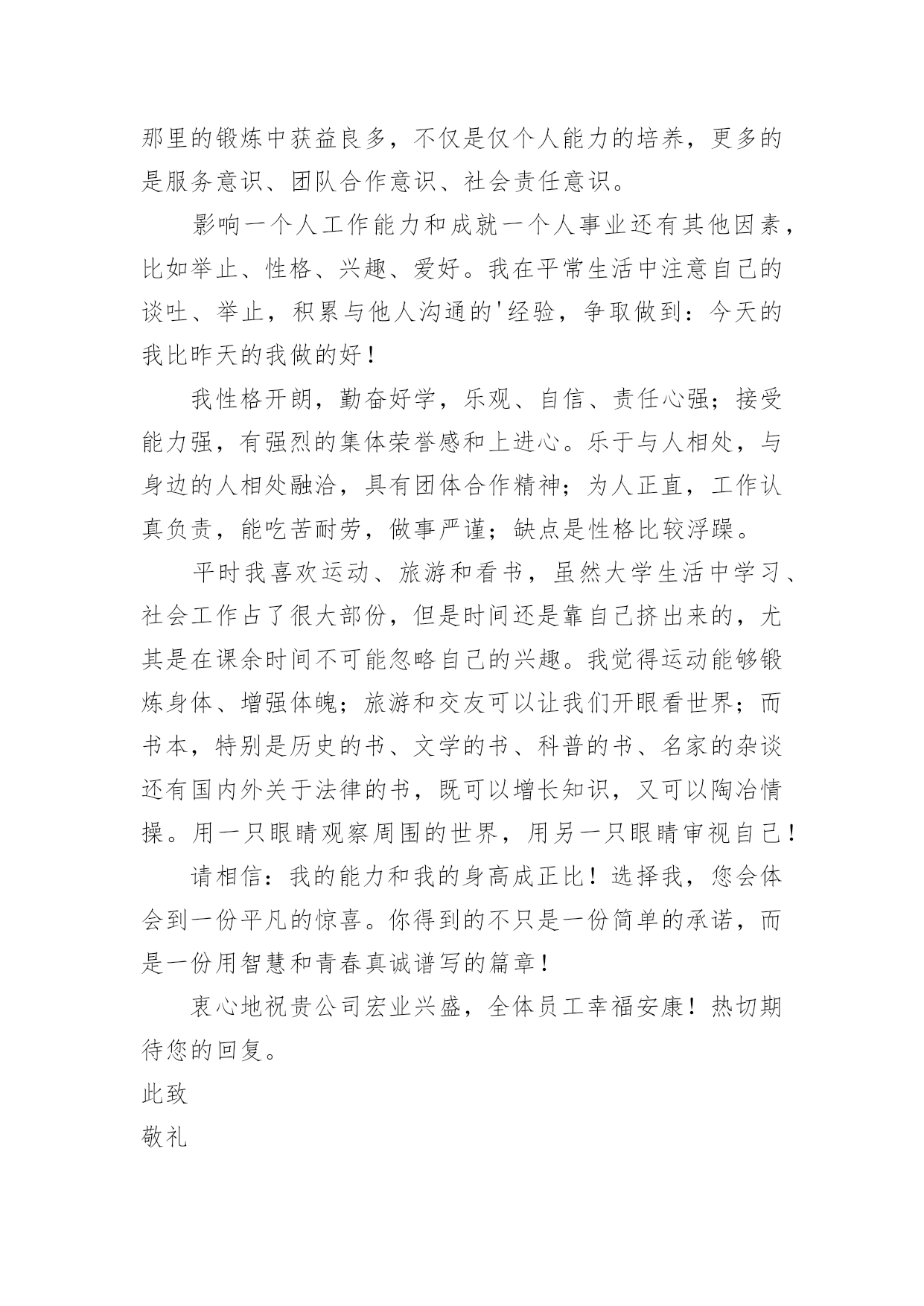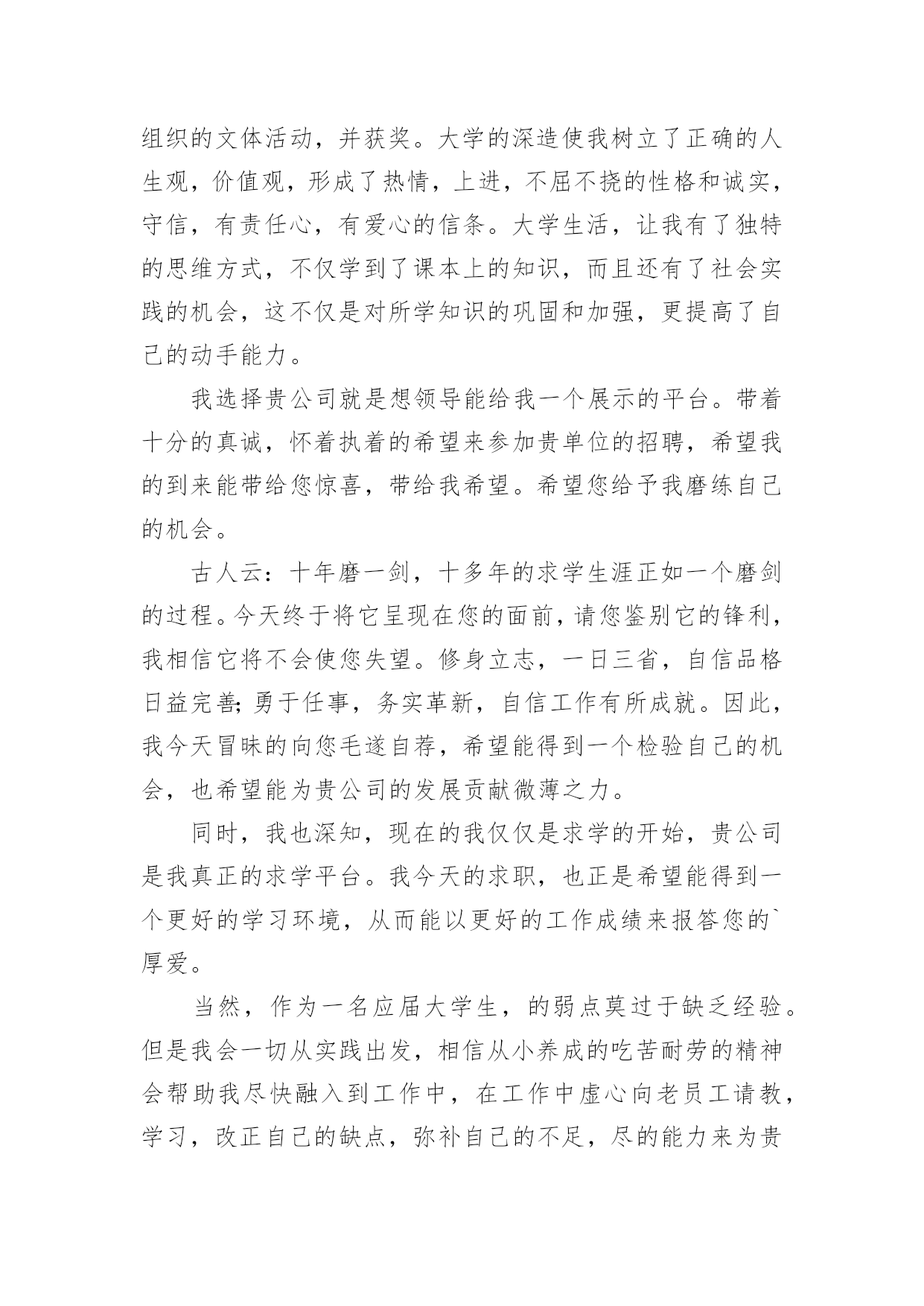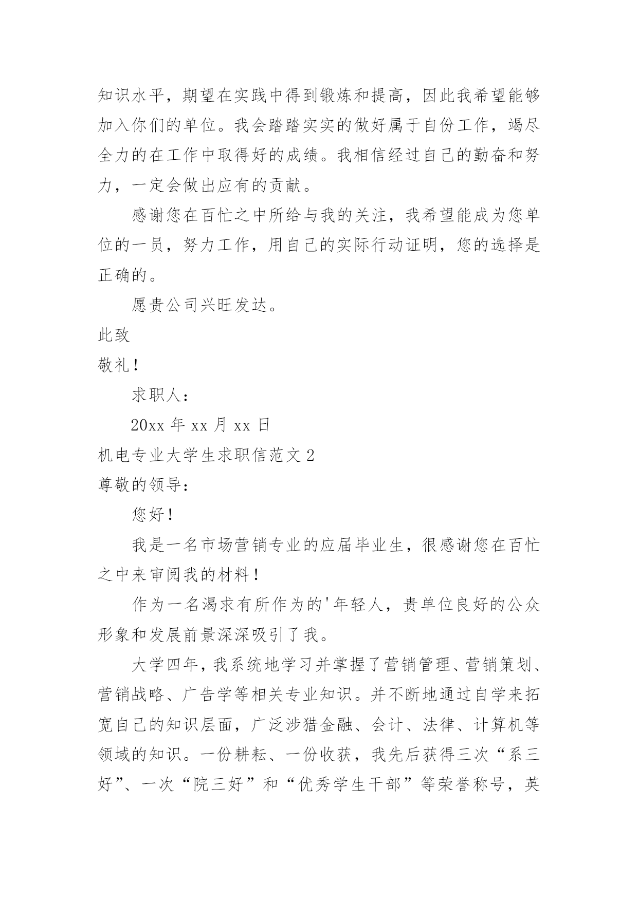 机电专业大学生求职信机电专业大学生求职信范文日子如同白驹过隙,不经意间,眼见着,找工作的时间马上到来,求职信也应跟上时间的脚步了哦。那么怎样写好求职信呢?下面是小编帮大家整理的机电专业大学生求职信范文,仅供参考,希望能够帮助到大家。机电专业大学生求职信范文1敬爱的领导:您好!打扰了,我是,很荣幸学的专业符合您单位的需要,我希望在精力之际,找到一份适合自己的工作,充分的展现自己的才华,实现自己的人身价值。我的专业是财务会计,作为一个财务会计人员必须具备良好的品质和专业的知识理论。在校期间,我系统的掌握了统计学、应用文等会计学理论。自入学以来,我一直竭尽全力做好应该做的事情。我告诉自己,哪怕是1%的希望,我也要投入100%的努力。在闲余之际,我广泛的.涉及了大量的书籍,不仅能充实自己,同时,也培养了我诚实、稳重、积极的进取态度。我知道,作为一个会计人员,计算机和网络是将来的工具,在学好专业的前提之下,我熟练的掌握了计算机技术,并能很好的运用。现在,我对做好会计工作非常自信,我不满足与现有的知识水平,期望在实践中得到锻炼和提高,因此我希望能够加入你们的单位。我会踏踏实实的做好属于自份工作,竭尽全力的在工作中取得好的成绩。我相信经过自己的勤奋和努力,一定会做出应有的贡献。感谢您在百忙之中所给与我的关注,我希望能成为您单位的一员,努力工作,用自己的实际行动证明,您的选择是正确的。愿贵公司兴旺发达。此致敬礼!求职人:20xx年xx月xx日机电专业大学生求职信范文2尊敬的领导:您好!我是一名市场营销专业的应届毕业生,很感谢您在百忙之中来审阅我的材料!作为一名渴求有所作为的'年轻人,贵单位良好的公众形象和发展前景深深吸引了我。大学四年,我系统地学习并掌握了营销管理、营销策划、营销战略、广告学等相关专业知识。并不断地通过自学来拓宽自己的知识层面,广泛涉猎金融、会计、法律、计算机等领域的知识。一份耕耘、一份收获,我先后获得三次“系三好”、一次“院三好”和“优秀学生干部”等荣誉称号,英语通过四级,计算机通过二级。“纸上得来终觉浅,绝知此事须躬行。”我积极参加学生会工作和各种社会实践活动。在担任院学生会编辑部部长期间,我全面负责院刊《财院青年》、《院团学工作反映》的编辑工作。并结合本专业的要求,抓住各种机会,赴各地进行调研,帮助企业、商家进行营销策划或产品推广,使自己的组织协调能力和专业能力有了实质性的提高。“会当击水三千里,直挂云帆济沧海。”背负着沉甸甸的责任和期望,我真诚地等待着您的检阅,期盼着能为贵单位贡献自己的绵薄之力!祝您和贵单位事业兴旺发达、蒸蒸日上!热切期盼您的回音!此致敬礼!求职人:20xx年xx月xx日机电专业大学生求职信范文3尊敬的领导:您好!真诚地感谢您在百忙之中浏览这份求职材料。您揭开的将是我人生新的一页,因为您的厚爱和关照,我的人生将在此刻出现一个值得纪念的转折点。我是xx大学旅游与环境学院工程造价专业的毕业生。我性格开朗,乐于接受新事物,爱好广泛,敢于迎接挑战,是一个不轻易服输的人。在大学期间曾多次参加学校和系里组织的文体活动,并获奖。大学的深造使我树立了正确的人生观,价值观,形成了热情,上进,不屈不挠的性格和诚实,守信,有责任心,有爱心的信条。大学生活,让我有了独特的思维方式,不仅学到了课本上的知识,而且还有了社会实践的机会,这不仅是对所学知识的巩固和加强,更提高了自己的动手能力。我选择贵公司就是想领导能给我一个展示的平台。带着十分的真诚,怀着执着的希望来参加贵单位的招聘,希望我的到来能带给您惊喜,带给我希望。希望您给予我磨练自己的机会。古人云:十年磨一剑,十多年的求学生涯正如一个磨剑的过程。今天终于将它呈现在您的面前,请您鉴别它的锋利,我相信它将不会使您失望。修身立志,一日三省,自信品格日益完善;勇于任事,务实革新,自信工作有所成就。因此,我今天冒昧的向您毛遂自荐,希望能得到一个检验自己的机会,也希望能为贵公司的发展贡献微薄之力。同时,我也深知,现在的我仅仅是求学的开始,贵公司是我真正的求学平台。我今天的求职,也正是希望能得到一个更好的学习环境,从而能以更好的工作成绩来报答您的`厚爱。当然,作为一名应届大学生,的弱点莫过于缺乏经验。但是我会一切从实践出发,相信从小养成的吃苦耐劳的精神会帮助我尽快融入到工作中,在工作中虚心向老员工请教,学习,改正自己的缺点,弥补自己的不足,尽的能力来为贵公司的发展尽一份微薄之力。感谢阅读我的求职信,盼望着早日得到您的佳音!祝贵公司事业蒸蒸日上!此致敬礼!求职人:20xx年xx月xx日机电专业大学生求职信范文4尊敬的领导:你好!感谢你在百忙之中抽空审阅我的材料,希望给我一个机会!物识一个掌握扎实专业知识并具有一定工作能力和组织能力的部下,是你的愿望。谋求一个充分发挥自己专业特长的工作单