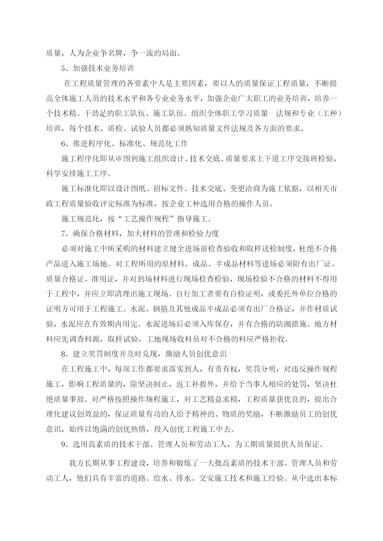 施工方案与技术措施一、交通信号控制系统1、基坑,开挖(1)按业主提供的施工及市政建设图纸,包括地下管网(水、电、气、通信网)到现场进行踏勘,避开水、电、气、通信管网,量好施工图。按图纸进行基坑开挖。控好后,要务实、整平,要对基坑的尺寸进行检查,检验合格后,才能安装钢筋支架。(2)螺栓及钢筋的制作螺栓及钢筋根据灯杆底座法兰盘的尺寸、间距、空径设计和制作。并保证完全吻合、配对,要选用热孔结构钢筋,并符合业主要求。(3)螺栓安装位置调整应保证信号灯的横梁与车行道路或人行道路垂直,确保车辆司机和行人观察信号灯时的最大视野。(4)埋好钢管和PVC管PVC管的直径应比钢管直径小5~15mm。(5)混泥土浇灌在上述检查无误后,才能浇灌混泥土,浇灌时建筑工程师应到现场进行检查和指导。检查水泥的标号、水泥、砂石和水的混合比例,保证混泥土的强度不小于25Mpa。(6)浇灌后,应作好标记和围栏,保护基础免地面受人为破坏;基础凝固后,应及时恢复路面,可以用彩砖或水泥装饰美化。2、管道、窨井、设备箱及其接地体的施工方案(1)地面(车道或人行道或绿化带)开挖。在人行道或绿化带开挖前,应查询地下管网(水、电、气和通信管网)分布情况,避开这些管网施工。管道、窨井和设备箱的基坑尺寸,均按设计要求施工。窨井盖和井圈应平整无缝。(2)设备箱基坑接地体施工(3)回填务实坑基及管道,砌砖。清除余土、废渣恢复路面和绿化带。用大理石装饰设备箱基座外表,路面恢复原有彩砖。3、电缆施工方案(1)按设计要求,选好电缆,包括型号和长度,在电缆的两端作好清晰的特片标注和编号。保存好电缆的铬牌和质保书,便于检测。(2)电缆长度留有余量,电缆弯曲半径须大于15倍电缆外径。(3)控制电缆线和电源线应分管铺设,避免相互干扰。(4)线缆敷设时不能紧绷。线缆在井敷时,必须固定在电缆托架上。4、信号灯杆施工方案(1)支架钢材选择信号灯支架钢管外径在152mm以下的,可采用普通碳素钢管;管径在152mm以上的,应采用热轧结构无缝钢管。信号灯杆采用高强连接螺栓和高强地脚螺栓。信号灯支架及其横臂、螺栓、螺杆、螺母,必须采用热浸锌处理。(2)安装前应检测信号灯架及其横臂的尺寸,特别是其底座和横梁砝量盘的孔径、孔距是否按图加工,是否与基础地螺栓的螺距和螺柱的直径大小相配,穿管导引铁丝是否安放到位,吊装件是否组装完好,外观有无严重破损,否则需及时更换。(3)安装前,建筑工程师(或其他委派工程师)应到现场检查施工现场的建筑施工,检查空中的供电、通信线网是否会影响施工或是否被挂断,否则需与供电、电信或建筑设施主管部门协调,采取措施,保障信号灯及支架及横臂吊装时的安全和顺利施工。(4)安装前,在路口布置好施工安全标志、标牌和路锥,引导车辆行人绕行;(5)安装时,应配备吊车,组织好吊装施工队伍,指定吊装现场指挥长,在被吊件上适当位置拴好吊装绳索,以便牵引;吊装时,由现场指挥长统一指挥;(6)吊装落孔时,严禁安装人员及其他人员(包括行人)在吊车及被吊件下走动,严禁施工人员的手放在吊装件与地螺栓之间,确保施工人员的安全。(7)吊装时,在基础及立杆、横杆管道内安装好穿管导引铁丝。(8)吊装到位后,即时进行固定,放好垫圈、拧紧螺母。5、信号灯的安装施工方案(1)信号灯安装之前,应加电检查,检查信号灯防水密封性能及技术性能,保证其工作正常。(2)信号灯安装之前,应将电源线、数据控制线穿管待连接;应准备好所有安装辅件和紧固件。(3)安装前,在安装路口布置好施工安全标志、标牌和路锥,引导车辆行人绕行。(4)安装时,用升降斗车将安装人员升至信号灯横梁对应的安装位置,进行连线和紧固件安装。(5)安装时信号灯的LED发光屏应与车道或人行道垂直。(6)安装时,应擦净信号灯罩外的油污、脏物,排除遮挡物,确保信号灯的亮度。安装完成时后,即将供电线和数据控制线分别与路口设备箱中的电源、光端机、防雷器和交通信号控制机相连,进行通电检查,如有故障,及时排除,直到信号灯正常工作为止。6、路口设备的安装、取电和接地(1)设备箱的制作(2)设备箱安装(3)设备箱接地(4)设备箱的取电设备箱通过路灯配电箱搭接取电,在设备箱接电点测量电压、电流及接地电阻后,才能给箱内设备供电。(5)路口设备安装信号机装入设备箱,并与设备箱的接地铜排相连;信号机通过线缆(电缆线、控制线、馈线)与信号灯、防雷器相连。在信号机内安装相相位驱动板。(6)系统联调和设置参数的优化针对线路上相互关联的上下游节点,对路口交通状况进行观察、统计和综合,调整相关参数设置,达到路口交通状况和整个系统运行的最佳化。交通信号控制系统工艺流程施工前准备测量放样定位