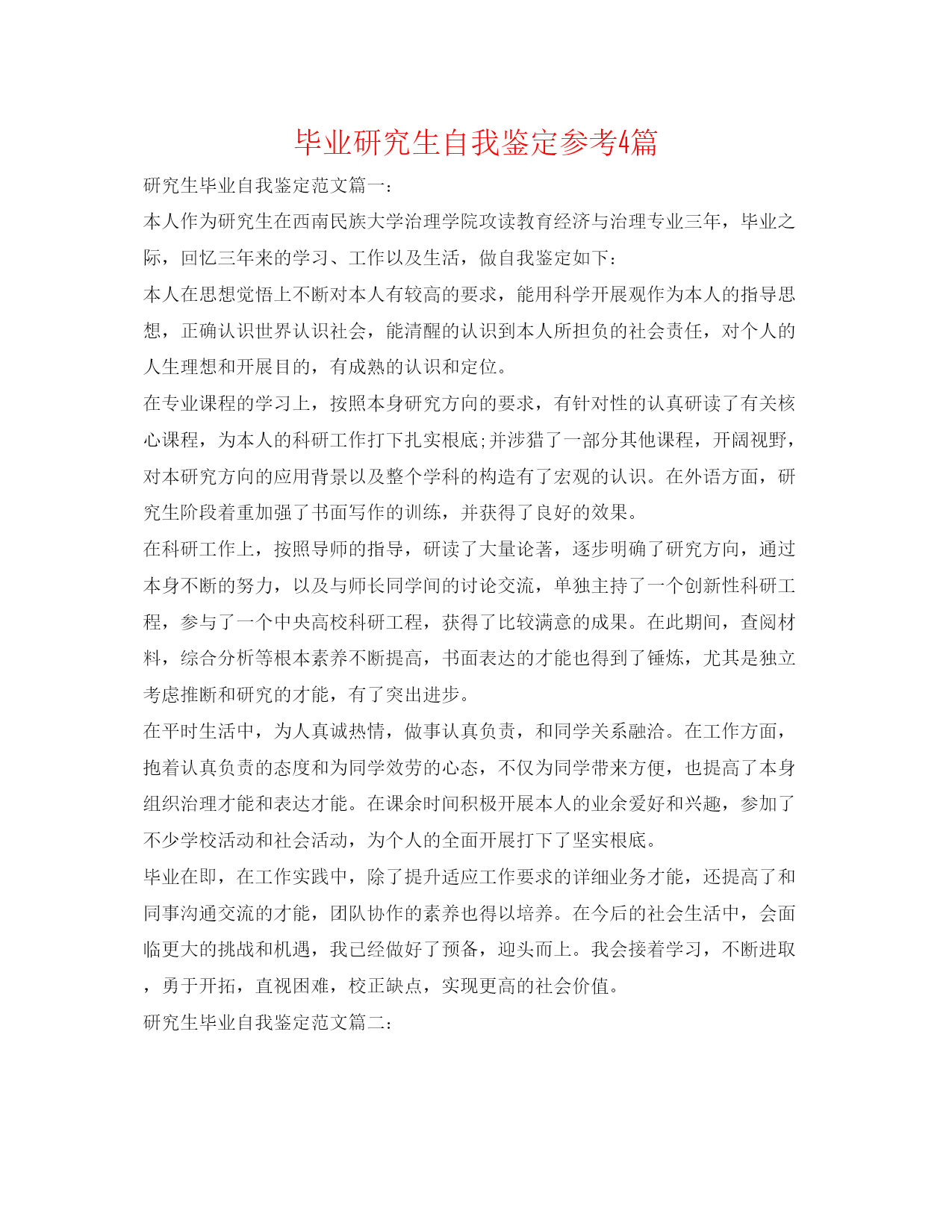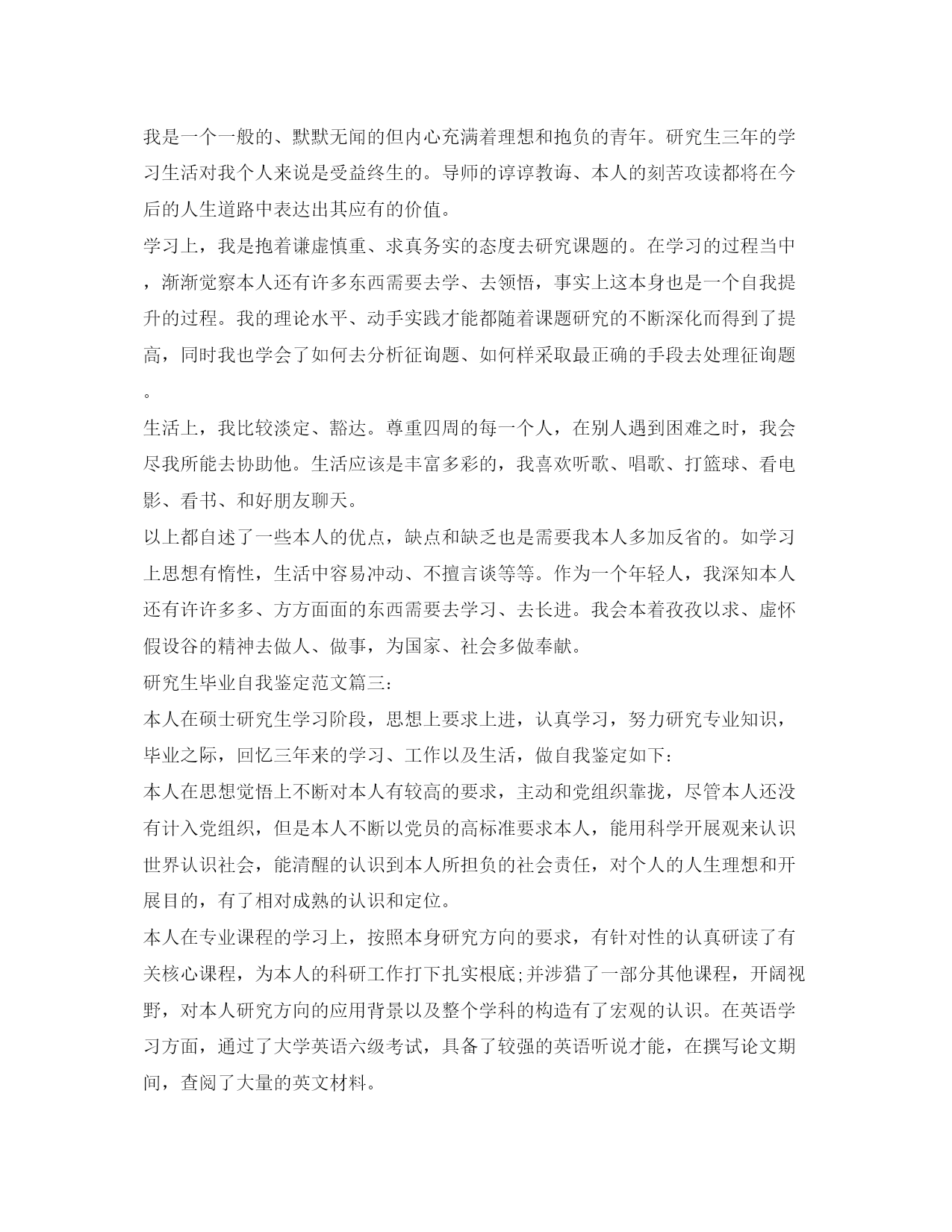 毕业研究生自我鉴定参考4篇研究生毕业自我鉴定范文篇一:本人作为研究生在西南民族大学治理学院攻读教育经济与治理专业三年,毕业之际,回忆三年来的学习、工作以及生活,做自我鉴定如下:本人在思想觉悟上不断对本人有较高的要求,能用科学开展观作为本人的指导思想,正确认识世界认识社会,能清醒的认识到本人所担负的社会责任,对个人的人生理想和开展目的,有成熟的认识和定位。在专业课程的学习上,按照本身研究方向的要求,有针对性的认真研读了有关核心课程,为本人的科研工作打下扎实根底;并涉猎了一部分其他课程,开阔视野,对本研究方向的应用背景以及整个学科的构造有了宏观的认识。在外语方面,研究生阶段着重加强了书面写作的训练,并获得了良好的效果。在科研工作上,按照导师的指导,研读了大量论著,逐步明确了研究方向,通过本身不断的努力,以及与师长同学间的讨论交流,单独主持了一个创新性科研工程,参与了一个中央高校科研工程,获得了比较满意的成果。在此期间,查阅材料,综合分析等根本素养不断提高,书面表达的才能也得到了锤炼,尤其是独立考虑推断和研究的才能,有了突出进步。在平时生活中,为人真诚热情,做事认真负责,和同学关系融洽。在工作方面,抱着认真负责的态度和为同学效劳的心态,不仅为同学带来方便,也提高了本身组织治理才能和表达才能。在课余时间积极开展本人的业余爱好和兴趣,参加了不少学校活动和社会活动,为个人的全面开展打下了坚实根底。毕业在即,在工作实践中,除了提升适应工作要求的详细业务才能,还提高了和同事沟通交流的才能,团队协作的素养也得以培养。在今后的社会生活中,会面临更大的挑战和机遇,我已经做好了预备,迎头而上。我会接着学习,不断进取,勇于开拓,直视困难,校正缺点,实现更高的社会价值。研究生毕业自我鉴定范文篇二:我是一个一般的、默默无闻的但内心充满着理想和抱负的青年。研究生三年的学习生活对我个人来说是受益终生的。导师的谆谆教诲、本人的刻苦攻读都将在今后的人生道路中表达出其应有的价值。学习上,我是抱着谦虚慎重、求真务实的态度去研究课题的。在学习的过程当中,渐渐觉察本人还有许多东西需要去学、去领悟,事实上这本身也是一个自我提升的过程。我的理论水平、动手实践才能都随着课题研究的不断深化而得到了提高,同时我也学会了如何去分析征询题、如何样采取最正确的手段去处理征询题。生活上,我比较淡定、豁达。尊重四周的每一个人,在别人遇到困难之时,我会尽我所能去协助他。生活应该是丰富多彩的,我喜欢听歌、唱歌、打篮球、看电影、看书、和好朋友聊天。以上都自述了一些本人的优点,缺点和缺乏也是需要我本人多加反省的。如学习上思想有惰性,生活中容易冲动、不擅言谈等等。作为一个年轻人,我深知本人还有许许多多、方方面面的东西需要去学习、去长进。我会本着孜孜以求、虚怀假设谷的精神去做人、做事,为国家、社会多做奉献。研究生毕业自我鉴定范文篇三:本人在硕士研究生学习阶段,思想上要求上进,认真学习,努力研究专业知识,毕业之际,回忆三年来的学习、工作以及生活,做自我鉴定如下:本人在思想觉悟上不断对本人有较高的要求,主动和党组织靠拢,尽管本人还没有计入党组织,但是本人不断以党员的高标准要求本人,能用科学开展观来认识世界认识社会,能清醒的认识到本人所担负的社会责任,对个人的人生理想和开展目的,有了相对成熟的认识和定位。本人在专业课程的学习上,按照本身研究方向的要求,有针对性的认真研读了有关核心课程,为本人的科研工作打下扎实根底;并涉猎了一部分其他课程,开阔视野,对本人研究方向的应用背景以及整个学科的构造有了宏观的认识。在英语学习方面,通过了大学英语六级考试,具备了较强的英语听说才能,在撰写论文期间,查阅了大量的英文材料。本人在导师的指导下,积极参与各项教学科研活动,在教学实践的过程中,认真阅读教材、查阅学术材料和参考书籍,在课堂上在欢乐中吸收各个知识点。同时本人具有较强的实践动手才能,参与了导师多项课题的研究,使本人的理论知识与实践水平得到了进一步的加强和提高,同时顺利完成了硕士毕业论文。本人在平时生活中,为人处世和气热情,和同学关系融洽,并积极参与各项集体活动,在担任支委期间,热情为同学们效劳。本人在研究生阶段所获颇丰,从学业、科研工作,到个人素养,都得到了充分的培养和锻炼,是充实且有意义的三年。相信这些经历和积累都将成为本人人生道路上的宝贵财富。在以后的工作和学习中,本人将接着保持并发扬严谨治学的作风,兢兢业业,争取获得更大的成绩.研究生毕业自我鉴定范文篇四:本人性格热情爽朗,待人友好,为人老实谦虚。工作勤奋,认真负责,能吃苦耐劳,尽职尽责,有耐心。具有亲和力,平易近人,擅长与人沟通。学习刻苦认真,成绩优秀,名列前茅。品学兼优,连续三年获得学院奖学金。曾担任系学生会外联部干部、