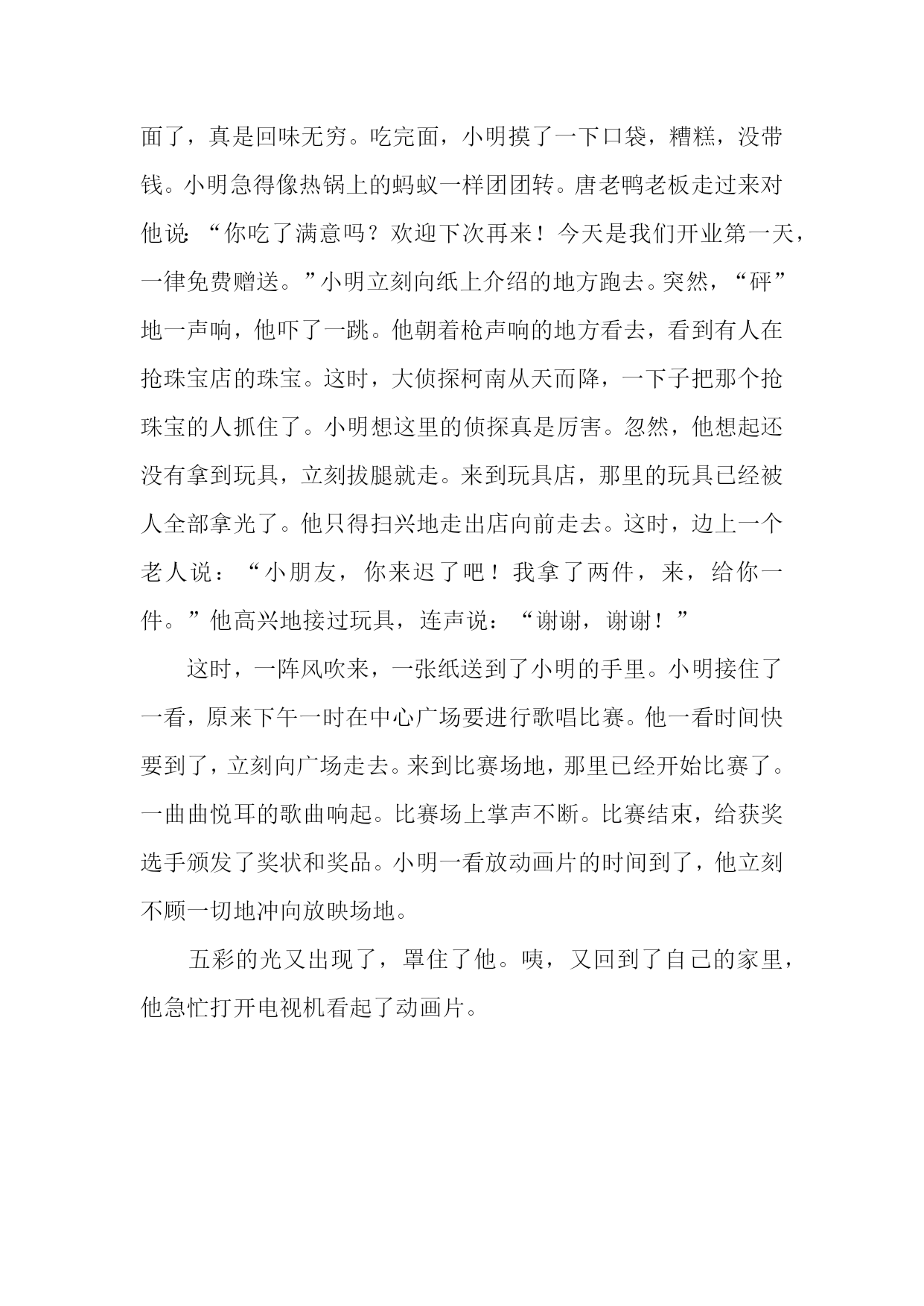 动画国旅游记动画国旅游记小明是一个动画迷。每当放动画片时,他不管在做什么事情,都会放下手中的事情去看动画片。有一天,小明到新华书店去看书。路上,一位白发苍苍的老人走到他面前,说:“小朋友,你想不想到动画王国去玩?”小明听了,高兴地直点头。这时一道五彩的光从天空中出现了。小明被罩在了光圈中。咦,怎么会飞了。啊,随着光线来到了动画王国。走到城门前,两位机器人士兵拦住了小明,说:“请说出20部动画片的名称才能够让你进城。”小明想这非常简单,不要说20部,就是200部也是小菜一碟。他一口气就说出了50多部动画片的名称。他还想再说下去,那两个士兵急忙拦住他说够了,他才停下来不说了。一位士兵对他说:“现在,你可以进去了。”小明走进城去,看到两边都是商店。商店的屋顶上闪着五彩的光,真是美丽极了。走到一家餐饮店门口,小明感到肚子有点饿了,他想:到中午了,应该吃午饭了。小明决定进去吃一餐。小明走进店里,唐老鸭老板热情地招呼他坐下,递上菜单请他挑菜。小明点了一碗牛肉面。不一会儿面来了。那碗面还没有端到跟前,香气就已经抢先到了。他吃着面觉得这是天底下最好吃的面了,真是回味无穷。吃完面,小明摸了一下口袋,糟糕,没带钱。小明急得像热锅上的蚂蚁一样团团转。唐老鸭老板走过来对他说:“你吃了满意吗?欢迎下次再来!今天是我们开业第一天,一律免费赠送。”小明立刻向纸上介绍的地方跑去。突然,“砰”地一声响,他吓了一跳。他朝着枪声响的地方看去,看到有人在抢珠宝店的珠宝。这时,大侦探柯南从天而降,一下子把那个抢珠宝的人抓住了。小明想这里的侦探真是厉害。忽然,他想起还没有拿到玩具,立刻拔腿就走。来到玩具店,那里的玩具已经被人全部拿光了。他只得扫兴地走出店向前走去。这时,边上一个老人说:“小朋友,你来迟了吧!我拿了两件,来,给你一件。”他高兴地接过玩具,连声说:“谢谢,谢谢!”这时,一阵风吹来,一张纸送到了小明的手里。小明接住了一看,原来下午一时在中心广场要进行歌唱比赛。他一看时间快要到了,立刻向广场走去。来到比赛场地,那里已经开始比赛了。一曲曲悦耳的歌曲响起。比赛场上掌声不断。比赛结束,给获奖选手颁发了奖状和奖品。小明一看放动画片的时间到了,他立刻不顾一切地冲向放映场地。五彩的光又出现了,罩住了他。咦,又回到了自己的家里,他急忙打开电视机看起了动画片。