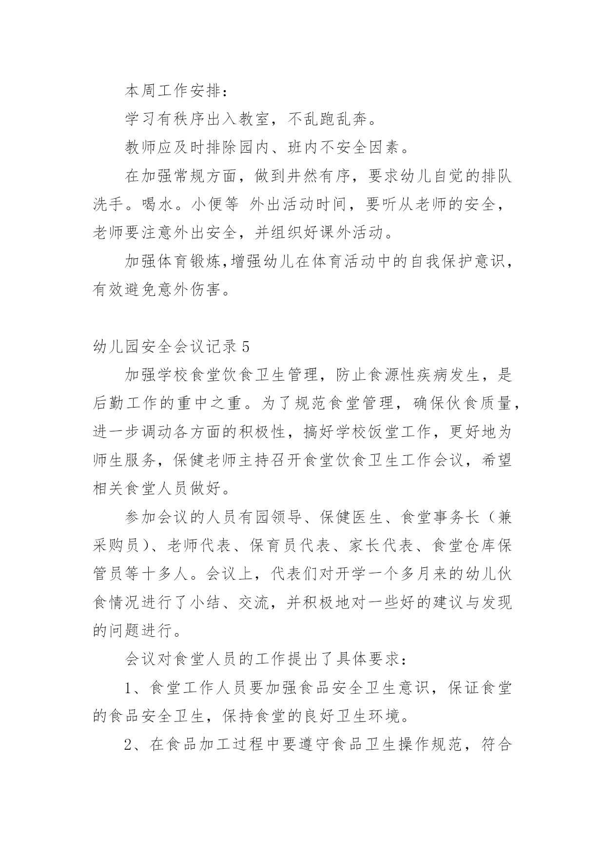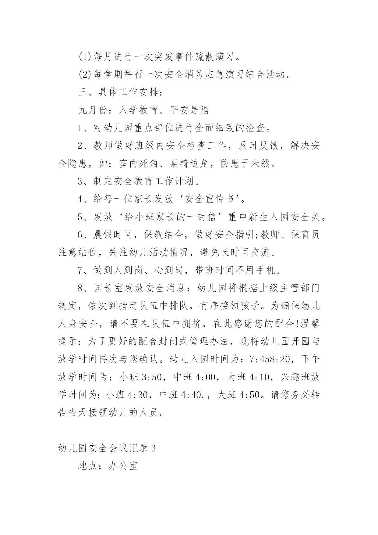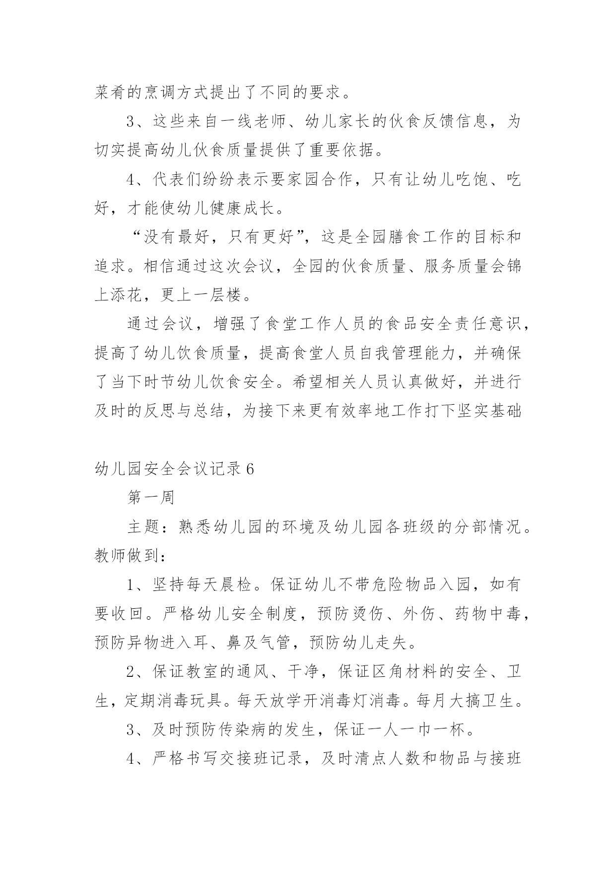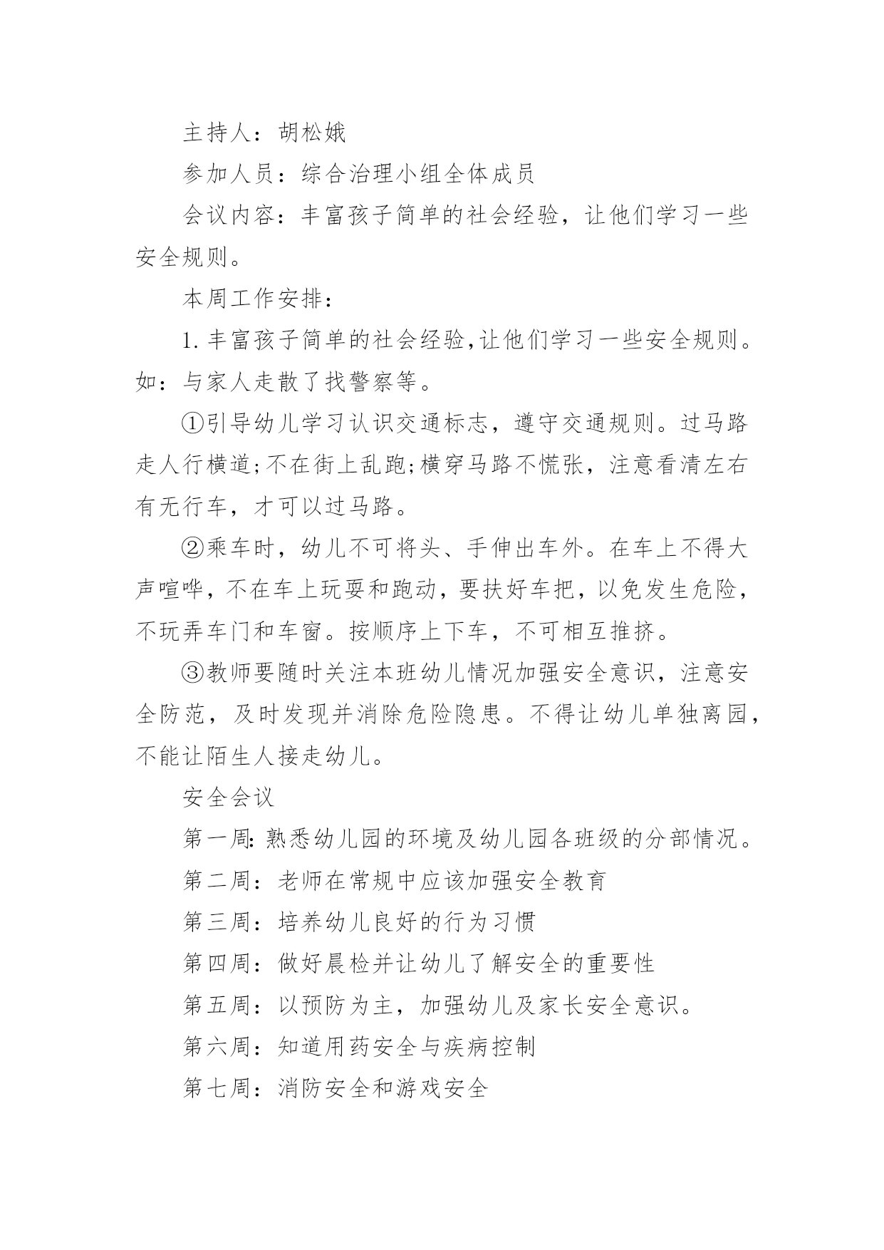 幼儿园安全会议记录幼儿园安全会议记录1时间:年月日地点:小班教室主持人:会议主题:知道用药安全与疾病控制总结上周工作:严格要求老师做好工作本周工作安排:1.知道用药安全,不随便或乱吃药2.不认识的物品或者家中一些像食物的物品,不能用嘴尝试。3.不吞食异物。4.增强家园联系,请家长一定要把药品交给医生,并说明食用剂量,特别是车接接送的,一定要求家长向本班老师或跟车老师说明。5.医生在给幼儿喂药时,一定要严格要求,并检查幼儿有无带错大人的药品。注意有无过期,变质药品。6.教育幼儿有不舒服的情况及时向老师说明7.保健医生做到安全教育和保卫工作,控制流行病、传染病的发生和蔓延,并做好记录。监督各班级搞好消毒工作。8.按照《中华人民共和国食品卫生法》要求做好食品、饮用水卫生的监督、管理工作。特别是饮食操作间操作规程、食堂食品留样等。9.按照《中华人民共和国传染病防治法》要求做好疾病防治工作,重点是预防和控制传染病的发生和流行。幼儿园安全会议记录2时间:主持人:出席对象:全体教师会议内容一、安全工作目标:以杜绝安全责任事故为重点,强化安全工作责任制和责任追究制,努力提高对各类事故的预防和控制能力,切实加强四个到位。1、安全宣传教育到位;2、安全防范技能到位;3、安全工作责任落实到位;4、安全工作的各项管理制度、具体措施落实到位,努力营造安全温馨的校园环境。使幼儿掌握园内各类大型玩具的玩法,了解上街行走的交通规则,认识水、电、煤气和火使用不当的危险性,初步掌握几种应急、脱险、逃生的办法。二、安全宣传深入化:1、安全宣传一月一主题,每月对全园师幼进行一次重要的安全宣传教育。2、安全演练形成常态化:(1)每月进行一次突发事件疏散演习。(2)每学期举行一次安全消防应急演习综合活动。三、具体工作安排:九月份:入学教育、平安是福1、对幼儿园重点部位进行全面细致的检查。2、教师做好班级内安全检查工作,及时反馈,解决安全隐患,如:室内死角、桌椅边角,防患于未然。3、制定安全教育工作计划。4、给每一位家长发放‘安全宣传书’。5、发放‘给小班家长的一封信’重申新生入园安全关。6、晨锻时间,保教结合,做好安全指引;教师、保育员注意站位,关注幼儿活动情况,避免长时间交流。7、做到人到岗、心到岗,带班时间不用手机。8、园长室发放安全消息:幼儿园将根据上级主管部门规定,依次到指定队伍中排队,有序接领孩子。为确保幼儿人身安全,请不要在队伍中拥挤,在此感谢您的配合!温馨提示:为了更好的配合封闭式管理办法,现将幼儿园开园与放学时间再次与您确认。幼儿入园时间为:7:458:20,下午放学时间为:小班3:50,中班4:00,大班4:10,兴趣班放学时间为:小班4:30,中班4:40.,大班4:50。请您务必转告当天接领幼儿的人员。幼儿园安全会议记录3地点:办公室主持人:胡松娥参加人员:综合治理小组全体成员会议内容:丰富孩子简单的社会经验,让他们学习一些安全规则。本周工作安排:1.丰富孩子简单的社会经验,让他们学习一些安全规则。如:与家人走散了找警察等。①引导幼儿学习认识交通标志,遵守交通规则。过马路走人行横道;不在街上乱跑;横穿马路不慌张,注意看清左右有无行车,才可以过马路。②乘车时,幼儿不可将头、手伸出车外。在车上不得大声喧哗,不在车上玩耍和跑动,要扶好车把,以免发生危险,不玩弄车门和车窗。按顺序上下车,不可相互推挤。③教师要随时关注本班幼儿情况加强安全意识,注意安全防范,及时发现并消除危险隐患。不得让幼儿单独离园,不能让陌生人接走幼儿。安全会议第一周:熟悉幼儿园的环境及幼儿园各班级的分部情况。第二周:老师在常规中应该加强安全教育第三周:培养幼儿良好的行为习惯第四周:做好晨检并让幼儿了解安全的重要性第五周:以预防为主,加强幼儿及家长安全意识。第六周:知道用药安全与疾病控制第七周:消防安全和游戏安全第八周:活动安全第九周:午餐时的安全教育第十周:午睡时的安全教育第十一周:继续实行报告制度第十二周:做自己力所能及的事,学习在劳动中进行自我保护第十三周:“五一”假前安全教育第十四周:有秩序的进行了活动第十五周:卫生常识及健康第十六周:大型活动安全及加强家园配合第十七周:学习一些自救方法使孩子掌握基本的应变能力第十八周:做好全园检查第十九周:丰富孩子简单的社会经验,让他们学习一些安全规则第二十周:强调安全无小事,要做有心人第二十一周:在七月份做好暑假安全教育工作。幼儿园安全会议记录4时间:20xx年x月x日地点:启航幼儿园小二班教室参会人:主持人:会议内容:有秩序的进行活动本周工作安排:学习有秩序出入教室,不乱跑乱奔。教师应及时排除园内、班内不安全因素。在加强常规方面,做到井然有序,要求幼儿自觉的排队洗手。喝水。小便等外出活动时间,要听从老师的安全,老师要注意外出安全,并组织好