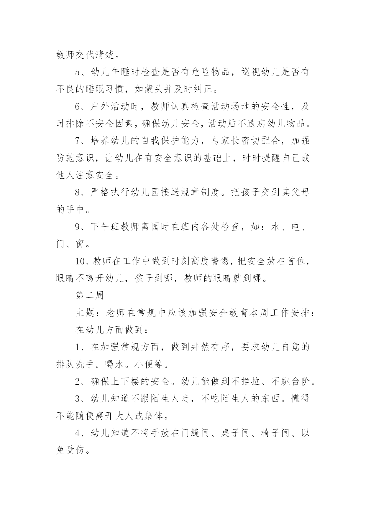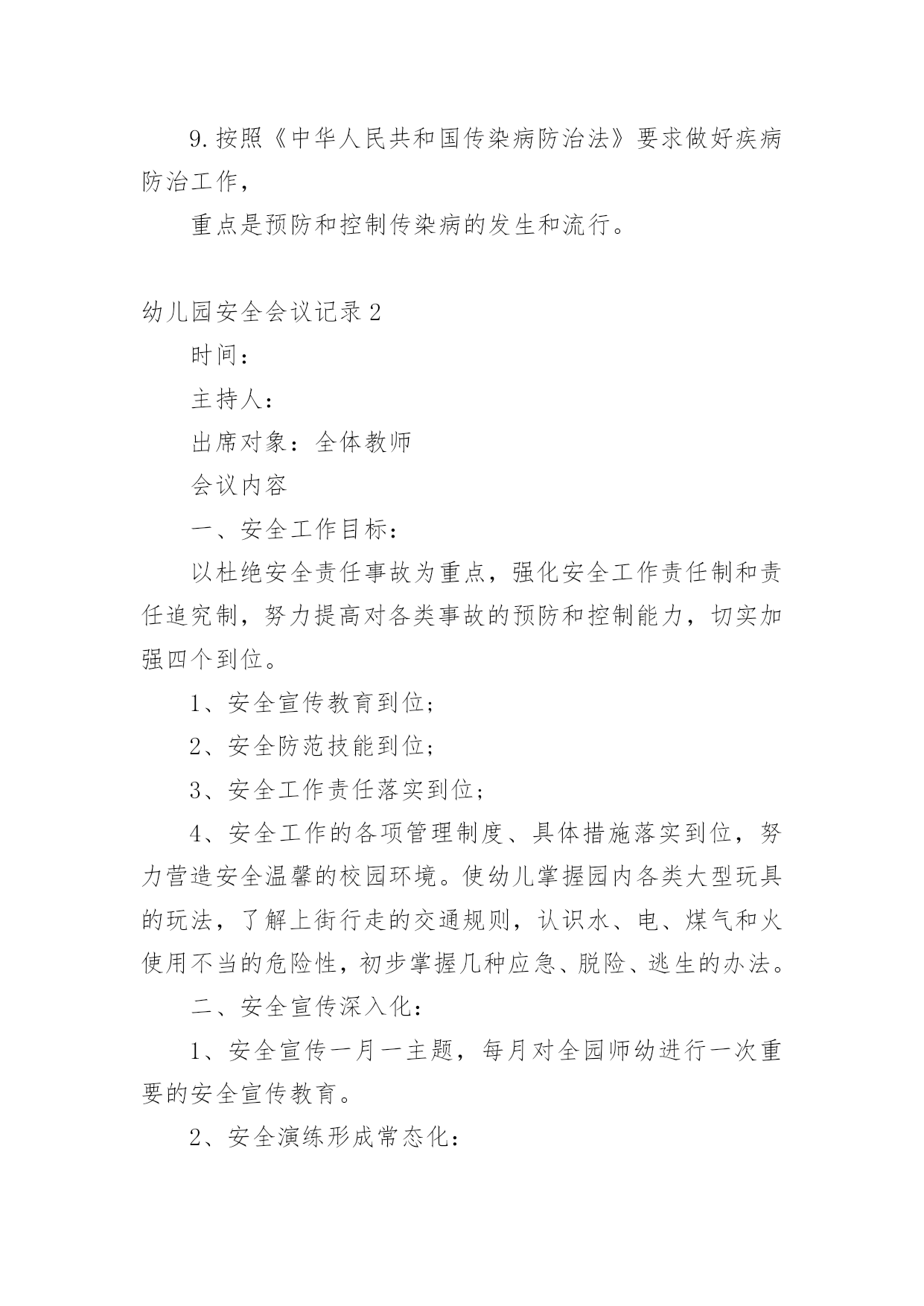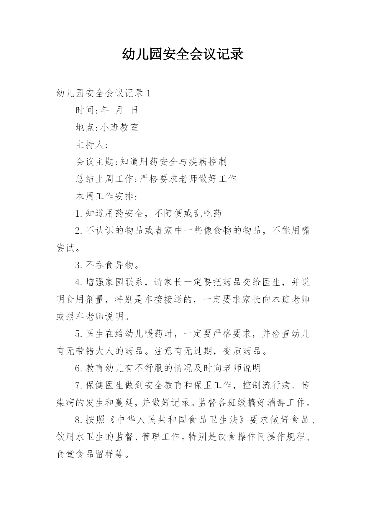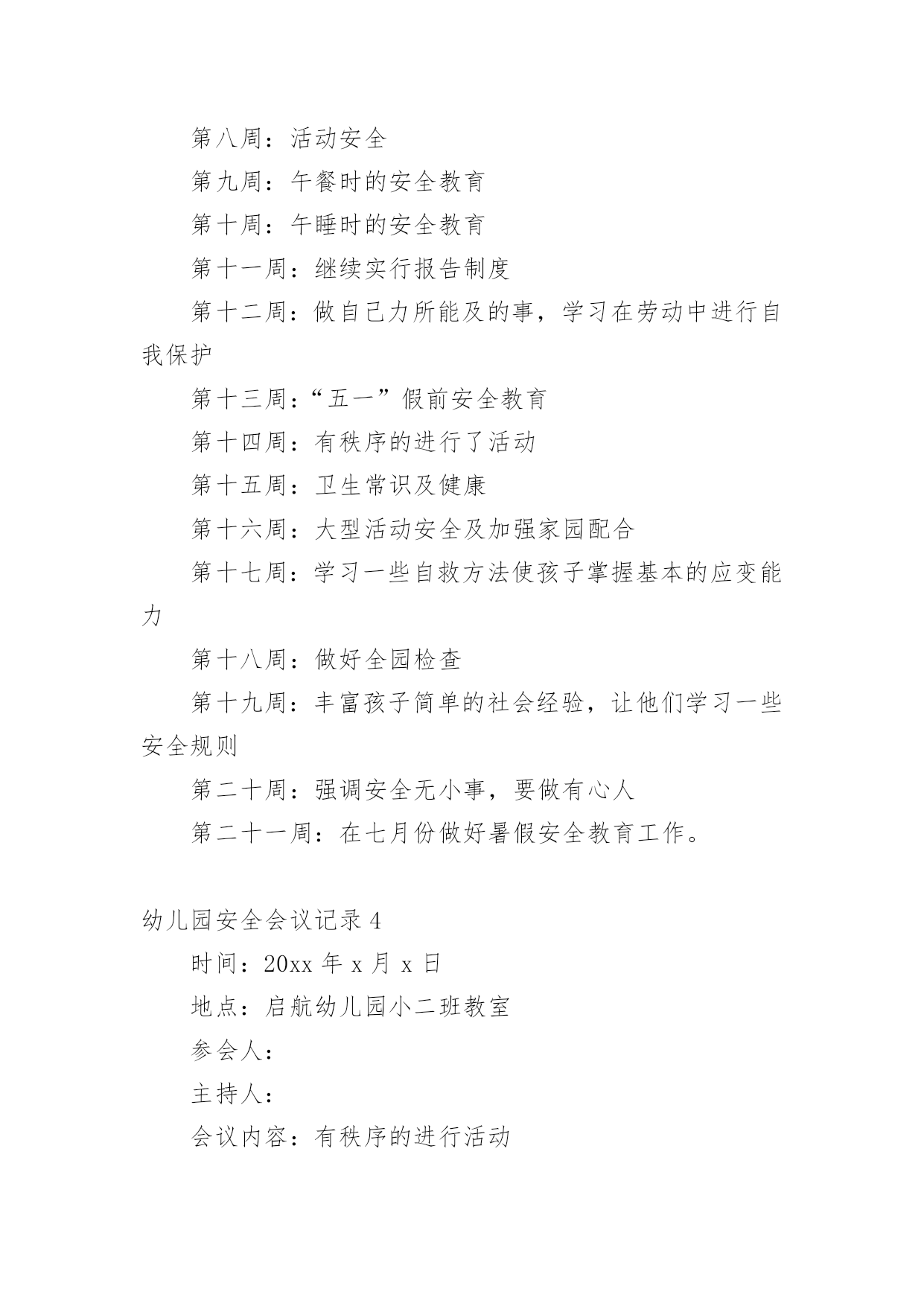 幼儿园安全会议记录幼儿园安全会议记录1时间:年月日地点:小班教室主持人:会议主题:知道用药安全与疾病控制总结上周工作:严格要求老师做好工作本周工作安排:1.知道用药安全,不随便或乱吃药2.不认识的物品或者家中一些像食物的物品,不能用嘴尝试。3.不吞食异物。4.增强家园联系,请家长一定要把药品交给医生,并说明食用剂量,特别是车接接送的,一定要求家长向本班老师或跟车老师说明。5.医生在给幼儿喂药时,一定要严格要求,并检查幼儿有无带错大人的药品。注意有无过期,变质药品。6.教育幼儿有不舒服的情况及时向老师说明7.保健医生做到安全教育和保卫工作,控制流行病、传染病的发生和蔓延,并做好记录。监督各班级搞好消毒工作。8.按照《中华人民共和国食品卫生法》要求做好食品、饮用水卫生的监督、管理工作。特别是饮食操作间操作规程、食堂食品留样等。9.按照《中华人民共和国传染病防治法》要求做好疾病防治工作,重点是预防和控制传染病的发生和流行。幼儿园安全会议记录2时间:主持人:出席对象:全体教师会议内容一、安全工作目标:以杜绝安全责任事故为重点,强化安全工作责任制和责任追究制,努力提高对各类事故的预防和控制能力,切实加强四个到位。1、安全宣传教育到位;2、安全防范技能到位;3、安全工作责任落实到位;4、安全工作的各项管理制度、具体措施落实到位,努力营造安全温馨的校园环境。使幼儿掌握园内各类大型玩具的玩法,了解上街行走的交通规则,认识水、电、煤气和火使用不当的危险性,初步掌握几种应急、脱险、逃生的办法。二、安全宣传深入化:1、安全宣传一月一主题,每月对全园师幼进行一次重要的安全宣传教育。2、安全演练形成常态化:(1)每月进行一次突发事件疏散演习。(2)每学期举行一次安全消防应急演习综合活动。三、具体工作安排:九月份:入学教育、平安是福1、对幼儿园重点部位进行全面细致的检查。2、教师做好班级内安全检查工作,及时反馈,解决安全隐患,如:室内死角、桌椅边角,防患于未然。3、制定安全教育工作计划。4、给每一位家长发放‘安全宣传书’。5、发放‘给小班家长的一封信’重申新生入园安全关。6、晨锻时间,保教结合,做好安全指引;教师、保育员注意站位,关注幼儿活动情况,避免长时间交流。7、做到人到岗、心到岗,带班时间不用手机。8、园长室发放安全消息:幼儿园将根据上级主管部门规定,依次到指定队伍中排队,有序接领孩子。为确保幼儿人身安全,请不要在队伍中拥挤,在此感谢您的配合!温馨提示:为了更好的配合封闭式管理办法,现将幼儿园开园与放学时间再次与您确认。幼儿入园时间为:7:458:20,下午放学时间为:小班3:50,中班4:00,大班4:10,兴趣班放学时间为:小班4:30,中班4:40.,大班4:50。请您务必转告当天接领幼儿的人员。幼儿园安全会议记录3地点:办公室主持人:胡松娥参加人员:综合治理小组全体成员会议内容:丰富孩子简单的社会经验,让他们学习一些安全规则。本周工作安排:1.丰富孩子简单的社会经验,让他们学习一些安全规则。如:与家人走散了找警察等。①引导幼儿学习认识交通标志,遵守交通规则。过马路走人行横道;不在街上乱跑;横穿马路不慌张,注意看清左右有无行车,才可以过马路。②乘车时,幼儿不可将头、手伸出车外。在车上不得大声喧哗,不在车上玩耍和跑动,要扶好车把,以免发生危险,不玩弄车门和车窗。按顺序上下车,不可相互推挤。③教师要随时关注本班幼儿情况加强安全意识,注意安全防范,及时发现并消除危险隐患。不得让幼儿单独离园,不能让陌生人接走幼儿。安全会议第一周:熟悉幼儿园的环境及幼儿园各班级的分部情况。第二周:老师在常规中应该加强安全教育第三周:培养幼儿良好的行为习惯第四周:做好晨检并让幼儿了解安全的重要性第五周:以预防为主,加强幼儿及家长安全意识。第六周:知道用药安全与疾病控制第七周:消防安全和游戏安全第八周:活动安全第九周:午餐时的安全教育第十周:午睡时的安全教育第十一周:继续实行报告制度第十二周:做自己力所能及的事,学习在劳动中进行自我保护第十三周:“五一”假前安全教育第十四周:有秩序的进行了活动第十五周:卫生常识及健康第十六周:大型活动安全及加强家园配合第十七周:学习一些自救方法使孩子掌握基本的应变能力第十八周:做好全园检查第十九周:丰富孩子简单的社会经验,让他们学习一些安全规则第二十周:强调安全无小事,要做有心人第二十一周:在七月份做好暑假安全教育工作。幼儿园安全会议记录4时间:20xx年x月x日地点:启航幼儿园小二班教室参会人:主持人:会议内容:有秩序的进行活动本周工作安排:学习有秩序出入教室,不乱跑乱奔。教师应及时排除园内、班内不安全因素。在加强常规方面,做到井然有序,要求幼儿自觉的排队洗手。喝水。小便等外出活动时间,要听从老师的安全,老师要注意外出安全,并组织好